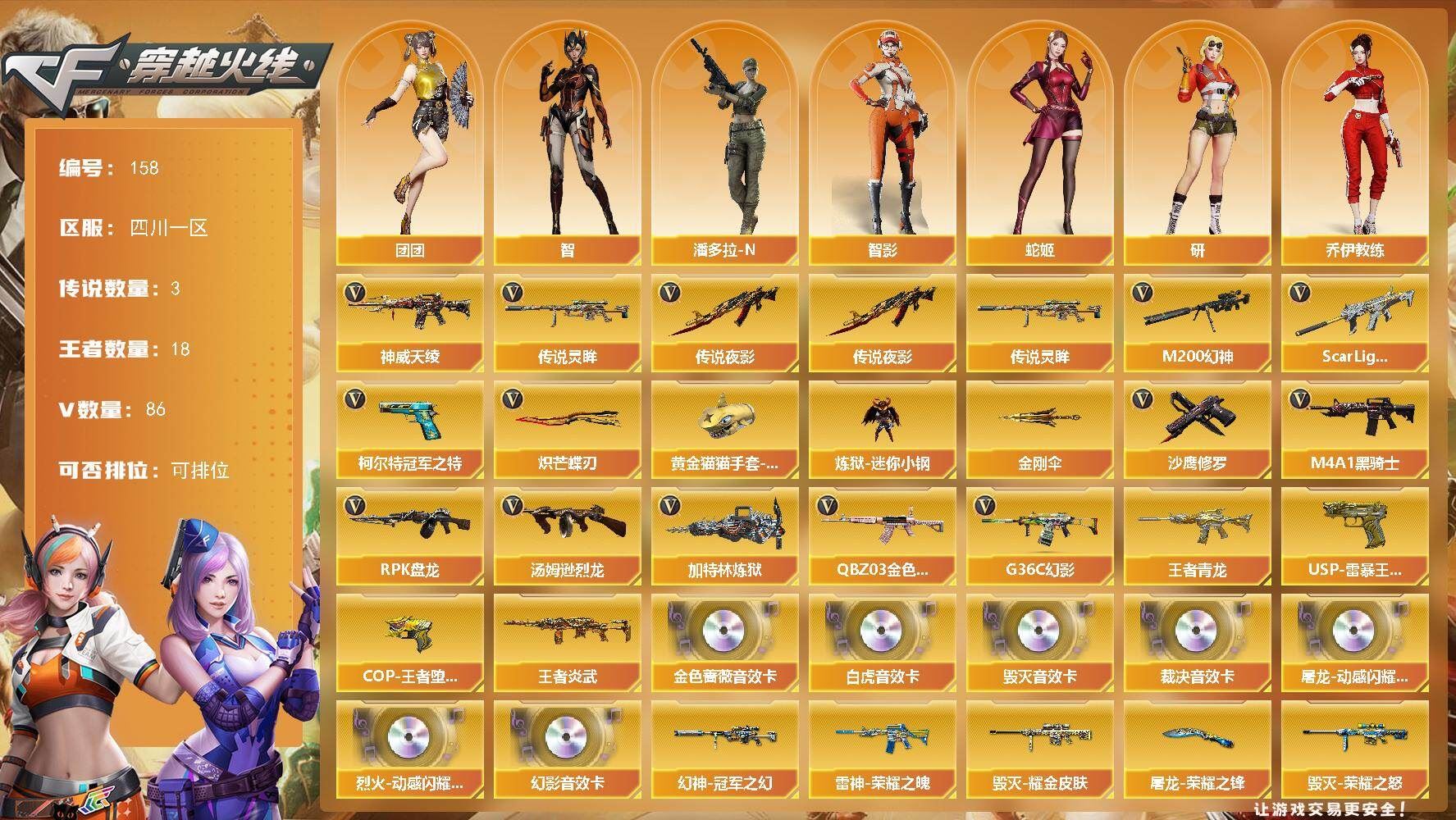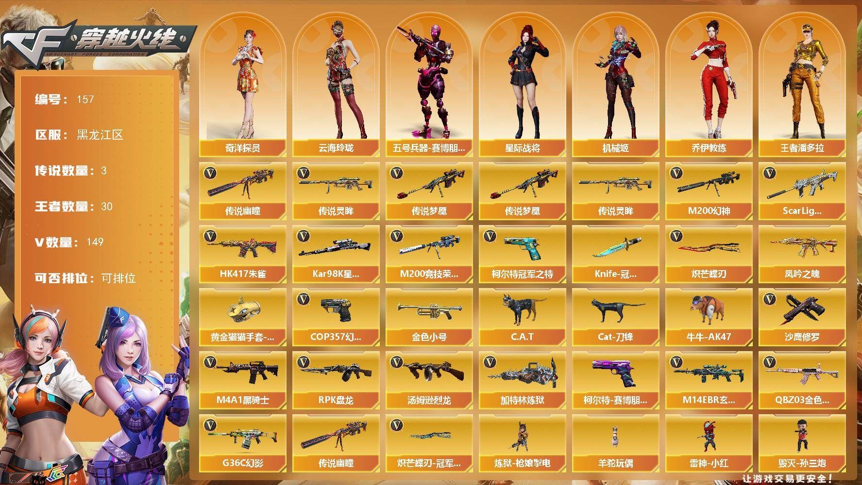 【英雄级武器】:M4A1-黑龙,M4A1-雷神*2,AK12-天启,黑武士-锦绣游龙,超新星-热带奇洋,QBZ03-金色蔷薇,黑骑士-海王,HK417-朱雀-电竞之星,机械迷城-穹宇,AWM-天龙,Barrett-毁灭,AWM-裁决,M200-幻神,炼狱-百战金芒,沙鹰-修罗*2,柯尔特-无冕之王,王者之魂-觉醒版,屠龙*2,龙啸-热带奇洋,麒麟刺-百战金芒,王者之刺-觉醒版,丛林匕首-玄豹,屠龙-电竞之星,手雷-热带奇洋,高爆手雷-玄豹,高爆手雷-雷霆王者-觉醒版,闪光弹-玄豹*2,闪光弹-雷霆王者-觉醒版,烟雾弹-玄豹,烟雾弹-雷霆王者-觉醒版*2,AK47-竞魂无影,AN94-竞魂超新星,Barrett-碧霄极光