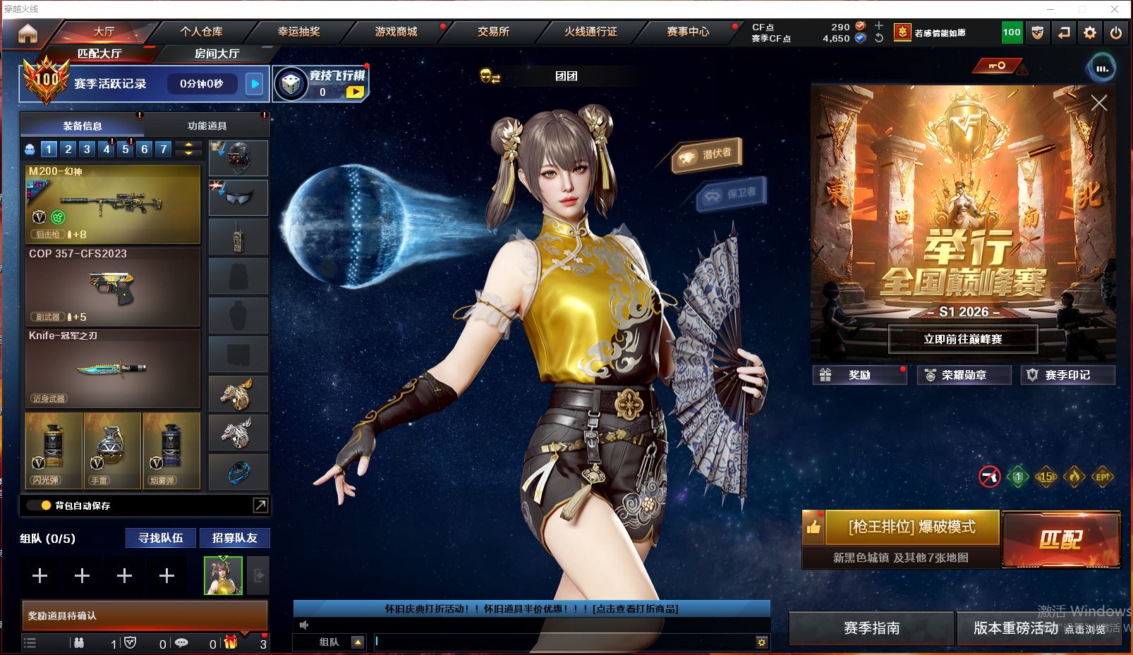 【热门武器】:QBZ03-金色蔷薇,M200-竞技荣光,死亡之眼,白虎-电玩蓝兔,Kar98K-星神,M4A1-黑骑士,汤姆逊-烈龙,加特林-炼狱,USP-雷暴,沙鹰-修罗*2