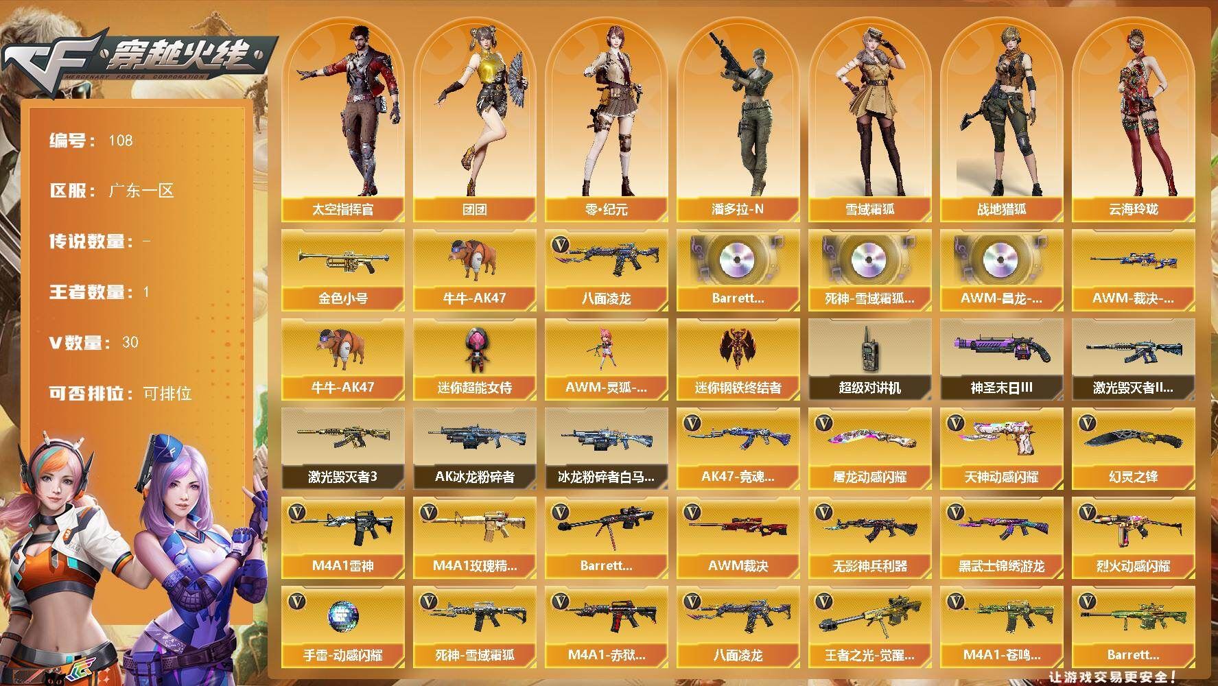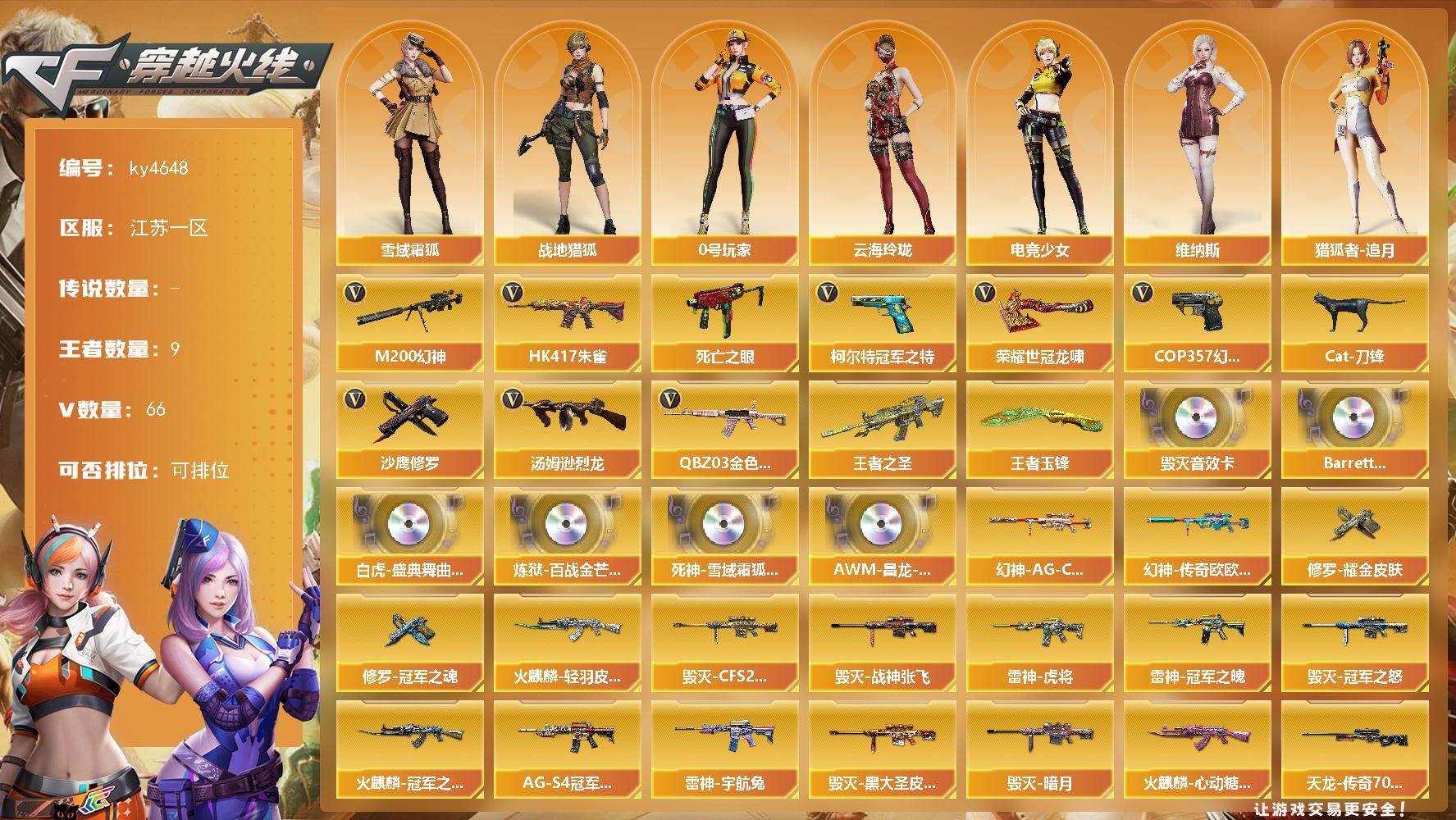 【英雄级武器】:AK47-火麒麟*2,M4A1-黑龙,M4A1-雷神,M4A1-黑骑士,M4A1-死神,AK12-天启,黑武士-锦绣游龙,M4A1-玫瑰精灵,QBZ03-金色蔷薇,白虎-电玩蓝兔,Barrett-毁灭,Barrett-极光,Kar98K-星神,M200-竞技荣光,Barrett-金色蔷薇*2,王者之怒-觉醒版,加特林-炼狱,炼狱-百战金芒,汤姆逊-烈龙,沙鹰-修罗*2,USP-雷暴,柯尔特-竞技荣光,屠龙*2,擎天,麒麟刺,擎天-竞技荣光,麒麟刺-百战金芒,雷霆王者之锋-觉醒版,高爆手雷-竞技荣光*8,闪光弹-竞技荣光*8,烟雾弹-竞技荣光*7,M4A1-赤狱骑士,Barrett-碧霄极光