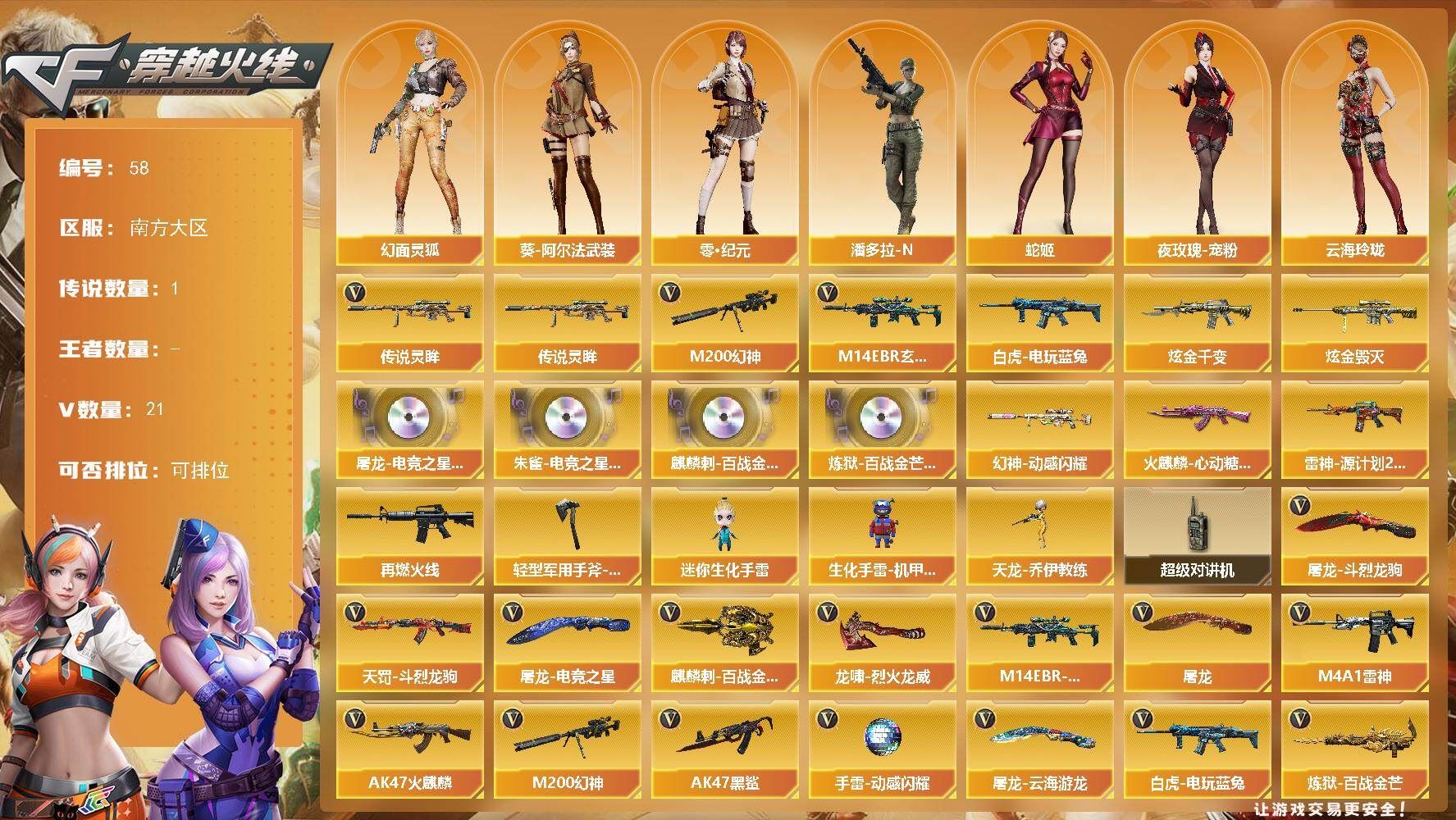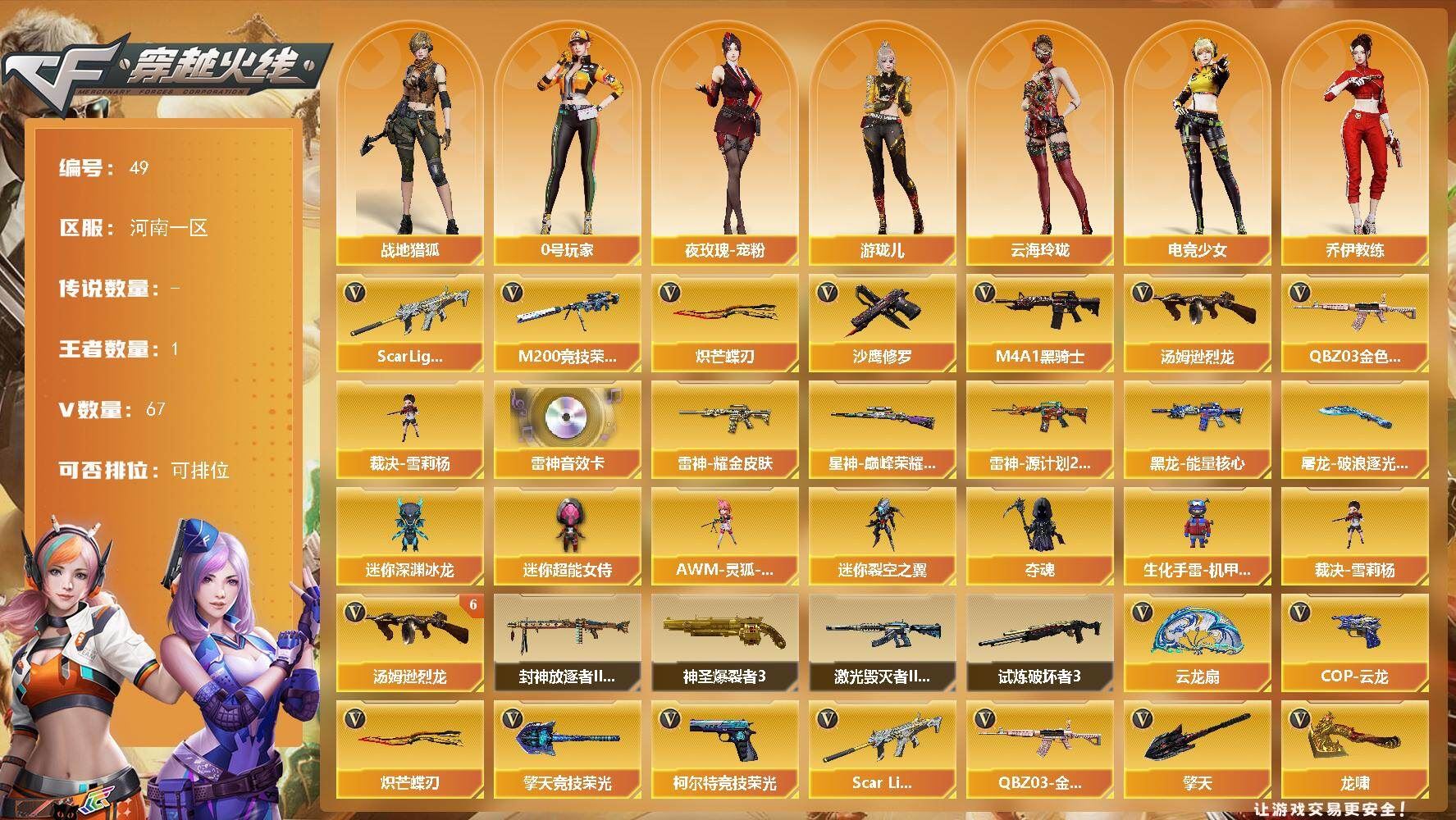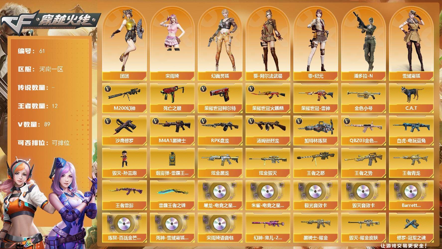 【送无畏端游 详情看图】【段位:未定级 】可二次可排位河南一区-89V-12王者武器数-2炫金武器数【热门武器】:QBZ03-金色蔷薇,M200-幻神,死亡之眼,荣耀世冠-火麒麟,荣耀世冠-雷神,白虎-电玩蓝兔,荣耀世冠-柯尔特,金色小号,C.A.T,M4A1-黑骑士*3,汤姆逊-烈龙*5,RPK-盘龙*3,加特林-炼狱*2,毁灭-孙三炮,沙鹰-修罗*5【王者炫金武器】:王者之势,王者青龙,王者雷影,王者之怒,雷霆王者之锋,烟雾弹-雷霆王者,炫金黑龙,炫金毁灭【音效卡】:屠龙-电竞之星-竞星跃动音效卡,Barrett-毁灭音效卡,Barrett-极光音效卡,宋雨琦语音包,HK417-朱雀-电竞之星-竞星跃动音效卡,Barrett-碧霄极光音效卡*4,炼狱-百战金芒-庆典舞曲音效卡,死神-雪域霜狐-怀旧音效卡【皮肤】:幻神-宠儿-2021MVP,裁决-运输船 皮肤,雷神-暗月,雷神-能量核心,雷神-宠儿-2019MVP,M4A1-再燃火线,AK47-火麒麟-传奇EVEN,毁灭-暗月,毁灭耀金皮肤,毁灭-风暴,毁灭-英雄计划 皮肤,M4A1-千变-孔明皮肤,黑龙-能量核心,黑龙-暗月,黑骑士耀金皮肤,天启-高能霹雳 皮肤,战神-流金岁月皮肤,天龙-秘银,AWM-天龙-传奇70KG,AWM-天龙-传奇白鲨,极光-能量核心,修罗-冠军之魂,屠龙-荣耀世冠AG,轻型军用手斧-再燃火线,擎天-虎牙平台皮肤,麒麟刺-月皮肤【角色】:零,樱,魅影,零·纪元,战地猎狐,王者葵-惊若翩鸿,王者之瞳,王者-魅影,狐影,雪域霜狐,乔伊教练,修道士,云海玲珑,葵-阿尔法武装,幻面灵狐,宋雨琦,暗夜-X,北极狐-X,初恋灵狐,芳心审判者,风暴女,娟娟,兰-海滩派对,兰妹妹,零-水下丽影,灵狐者-X,灵狐者-黄金海岸,龙儿-小淘气,曼陀罗-X,潘多拉-X,潘多拉-甜心教官,潜龙队-X,蛇姬,斯沃特-X,甜心偶像,蜀雪,铁骑荣耀,兔囡囡,王者-零-传说之路,新娜塔莎,樱-青春偶像,影武者-X,智影,潘多拉-N,团团【人偶武器】:毁灭-孙三炮,迷你钢铁终结者*2,迷你地狱终结者,AWM-灵狐-15周年嘉年华*2,COP-旗袍,C.A.T,迷你深渊冰龙【暴走生化】:死亡之眼【挑战大师】:冰龙粉碎者-白马银枪,激光毁灭者III-白马银枪,KAC-圣炎切割者III,神圣爆裂者-末日III,阐释者III【英雄级武器】:M4A1-千变,AK47-火麒麟*2,M4A1-黑龙,M4A1-雷神*2,M4A1-黑骑士*3,M4A1-死神*2,AK47-黑武士,AN94-超新星,M4A1-雷霆,QBZ03-金色蔷薇,王者之心-觉醒版,AK-47-猩红传说*2,王者冰魄-觉醒版,王者之烈-觉醒版,白虎-电玩蓝兔,荣耀世冠-火麒麟,荣耀世冠-雷神,HK417-朱雀-电竞之星,机械迷城-穹宇,天罚-斗烈龙驹,AWM-天龙,Barrett-毁灭,Barrett-极光*2,AWM-裁决,M200-幻神,Barrett-金色蔷薇,王者之光-觉醒版,RPK-盘龙*3,加特林-炼狱*2,炼狱-百战金芒,炼狱-风暴,汤姆逊-烈龙*5,烈龙-悦心-觉醒版,沙鹰-修罗*5,沙鹰-天神,荣耀世冠-柯尔特,柯尔特-电竞之星,Anaconda-玄豹,屠龙*3,龙啸,擎天*2,麒麟刺,尼泊尔-雷霆,麒麟刺-百战金芒,王者之锋-觉醒版,屠龙-电竞之星,屠龙-斗烈龙驹,高爆手雷-雷霆,高爆手雷-玄豹*2,闪光弹-雷霆,闪光弹-玄豹,烟雾弹-雷霆,烟雾弹-玄豹*3,M4A1-赤狱骑士,M4A1-苍鸣雷神,AK47-竞魂无影,AN94-竞魂超新星,AWM-昌龙,Barrett-碧霄极光【其他武器】:魂·M4A1-雷神-化蛇,魂·雷神-神秘按键,源·黑骑士,M4A1-青龙-掌上穿越火线,金色蔷薇-狼王,Barrett-极光-掌火,魂·裁决-神秘按键,魂·毁灭-航天科技,魂·Barrett-朱雀-锦鲤,加特林-炼狱-掌火,魂·修罗-迷彩,魂·天神-宇航兔兔,魂·屠龙-惊鸿【道具】:宋雨琦炫彩背包,BS战队炫彩背包,CFS限定背包,WE炫彩背包,云山科技背包,亚洲杯纪念炫彩背包,冰冰企鹅背包-猛男专用,炫彩背包-诺拉,炫彩背包,牛魔王背包-至尊黄金,百战金芒炫彩背包,背包-洛丽塔,虎牙炫彩背包,超级背包*2,雪域霜狐炫彩背包,圣拳猎手-炽雪,终极猎手-荒漠刀客,女皇终结者-魔龙之吻,救世主-黑桃战神,黄金生化钩,绿色巨人,灵魂忍者,变异宝贝,妖姬,迷雾幽灵,夺命之镰,防化服*3,流光-鎏金之域,流光-再燃火线,各种道具详情看截图、低价出售找回包 赔、截图展示段位不代 表实际段位,如赛季更新等不可抗拒因素发生变化、时限道具不保证所剩时间、标题未写送点劵默认不送【卖号买号首选亿梦】