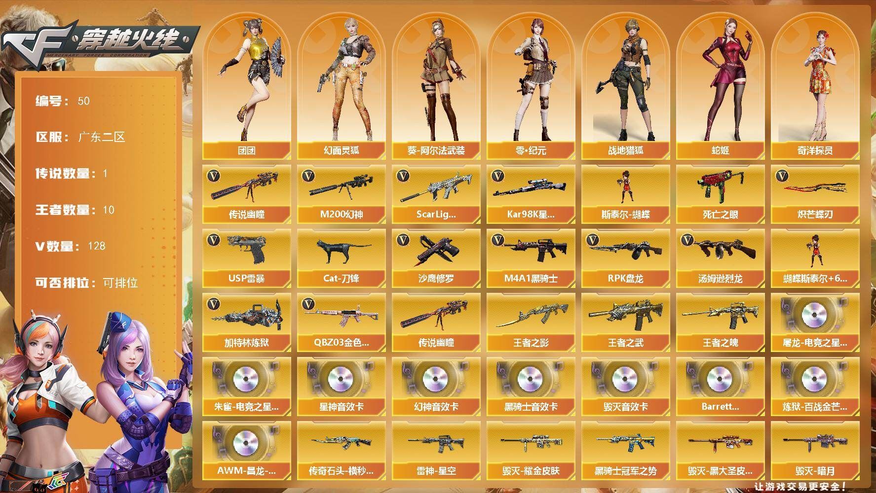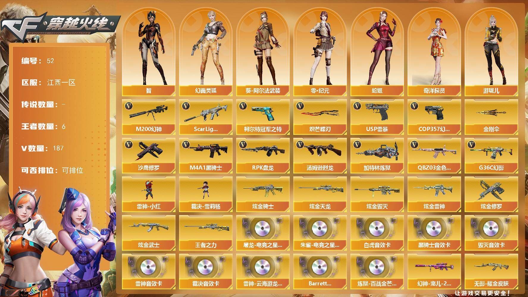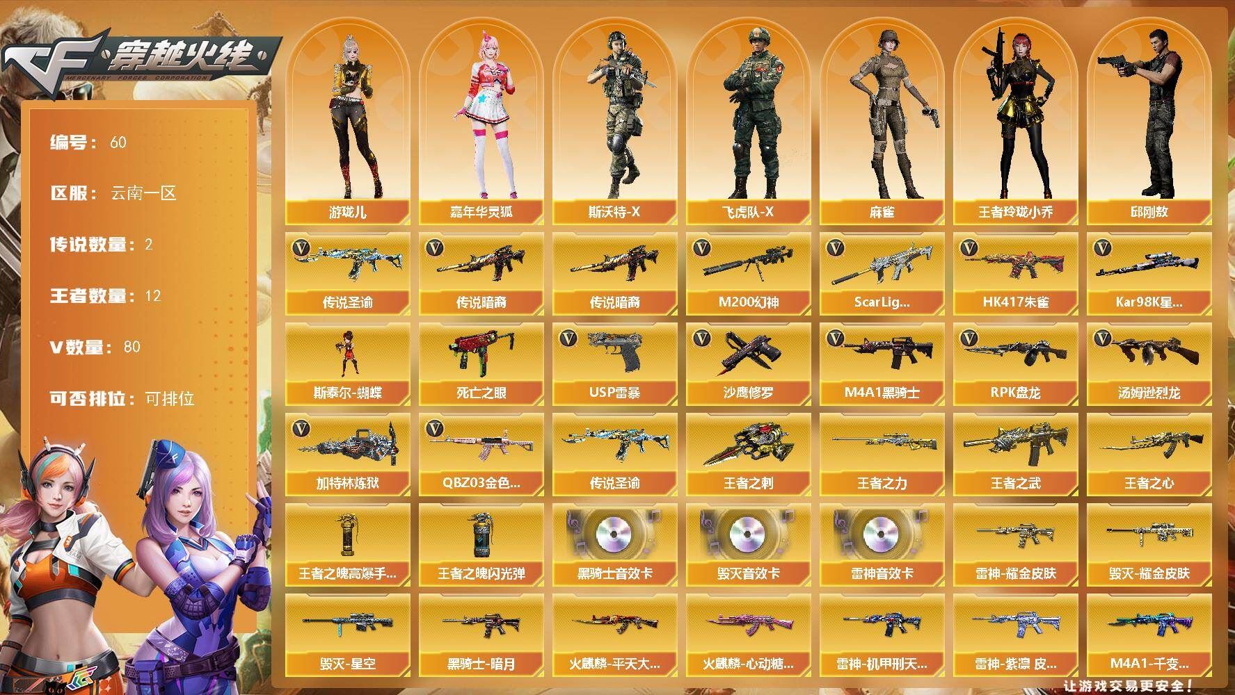 【送无畏端游 详情看图】【段位:未定级 】可二次可排位河南一区-89V-12王者武器数-2炫金武器数【热门武器】:QBZ03-金色蔷薇,M200-幻神,死亡之眼,荣耀世冠-火麒麟,荣耀世冠-雷神,白虎-电玩蓝兔,荣耀世冠-柯尔特,金色小号,C.A.T,M4A1-黑骑士*3,汤姆逊-烈龙*5,RPK-盘龙*3,加特林-炼狱*2,毁灭-孙三炮,沙鹰-修罗*5【王者炫金武器】:王者之势,王者青龙,王者雷影,王者之怒,雷霆王者之锋,烟雾弹-雷霆王者,炫金黑龙,炫金毁灭【音效卡】:屠龙-电竞之星-竞星跃动音效卡,Barrett-毁灭音效卡,Barrett-极光音效卡,宋雨琦语音包,HK417-朱雀-电竞之星-竞星跃动音效卡,Barrett-碧霄极光音效卡*4,炼狱-百战金芒-庆典舞曲音效卡,死神-雪域霜狐-怀旧音效卡【皮肤】:幻神-宠儿-2021MVP,裁决-运输船 皮肤,雷神-暗月,雷神-能量核心,雷神-宠儿-2019MVP,M4A1-再燃火线,AK47-火麒麟-传奇EVEN,毁灭-暗月,毁灭耀金皮肤,毁灭-风暴,毁灭-英雄计划 皮肤,M4A1-千变-孔明皮肤,黑龙-能量核心,黑龙-暗月,黑骑士耀金皮肤,天启-高能霹雳 皮肤,战神-流金岁月皮肤,天龙-秘银,AWM-天龙-传奇70KG,AWM-天龙-传奇白鲨,极光-能量核心,修罗-冠军之魂,屠龙-荣耀世冠AG,轻型军用手斧-再燃火线,擎天-虎牙平台皮肤,麒麟刺-月皮肤【角色】:零,樱,魅影,零·纪元,战地猎狐,王者葵-惊若翩鸿,王者之瞳,王者-魅影,狐影,雪域霜狐,乔伊教练,修道士,云海玲珑,葵-阿尔法武装,幻面灵狐,宋雨琦,暗夜-X,北极狐-X,初恋灵狐,芳心审判者,风暴女,娟娟,兰-海滩派对,兰妹妹,零-水下丽影,灵狐者-X,灵狐者-黄金海岸,龙儿-小淘气,曼陀罗-X,潘多拉-X,潘多拉-甜心教官,潜龙队-X,蛇姬,斯沃特-X,甜心偶像,蜀雪,铁骑荣耀,兔囡囡,王者-零-传说之路,新娜塔莎,樱-青春偶像,影武者-X,智影,潘多拉-N,团团【人偶武器】:毁灭-孙三炮,迷你钢铁终结者*2,迷你地狱终结者,AWM-灵狐-15周年嘉年华*2,COP-旗袍,C.A.T,迷你深渊冰龙【暴走生化】:死亡之眼【挑战大师】:冰龙粉碎者-白马银枪,激光毁灭者III-白马银枪,KAC-圣炎切割者III,神圣爆裂者-末日III,阐释者III【英雄级武器】:M4A1-千变,AK47-火麒麟*2,M4A1-黑龙,M4A1-雷神*2,M4A1-黑骑士*3,M4A1-死神*2,AK47-黑武士,AN94-超新星,M4A1-雷霆,QBZ03-金色蔷薇,王者之心-觉醒版,AK-47-猩红传说*2,王者冰魄-觉醒版,王者之烈-觉醒版,白虎-电玩蓝兔,荣耀世冠-火麒麟,荣耀世冠-雷神,HK417-朱雀-电竞之星,机械迷城-穹宇,天罚-斗烈龙驹,AWM-天龙,Barrett-毁灭,Barrett-极光*2,AWM-裁决,M200-幻神,Barrett-金色蔷薇,王者之光-觉醒版,RPK-盘龙*3,加特林-炼狱*2,炼狱-百战金芒,炼狱-风暴,汤姆逊-烈龙*5,烈龙-悦心-觉醒版,沙鹰-修罗*5,沙鹰-天神,荣耀世冠-柯尔特,柯尔特-电竞之星,Anaconda-玄豹,屠龙*3,龙啸,擎天*2,麒麟刺,尼泊尔-雷霆,麒麟刺-百战金芒,王者之锋-觉醒版,屠龙-电竞之星,屠龙-斗烈龙驹,高爆手雷-雷霆,高爆手雷-玄豹*2,闪光弹-雷霆,闪光弹-玄豹,烟雾弹-雷霆,烟雾弹-玄豹*3,M4A1-赤狱骑士,M4A1-苍鸣雷神,AK47-竞魂无影,AN94-竞魂超新星,AWM-昌龙,Barrett-碧霄极光【其他武器】:魂·M4A1-雷神-化蛇,魂·雷神-神秘按键,源·黑骑士,M4A1-青龙-掌上穿越火线,金色蔷薇-狼王,Barrett-极光-掌火,魂·裁决-神秘按键,魂·毁灭-航天科技,魂·Barrett-朱雀-锦鲤,加特林-炼狱-掌火,魂·修罗-迷彩,魂·天神-宇航兔兔,魂·屠龙-惊鸿【道具】:宋雨琦炫彩背包,BS战队炫彩背包,CFS限定背包,WE炫彩背包,云山科技背包,亚洲杯纪念炫彩背包,冰冰企鹅背包-猛男专用,炫彩背包-诺拉,炫彩背包,牛魔王背包-至尊黄金,百战金芒炫彩背包,背包-洛丽塔,虎牙炫彩背包,超级背包*2,雪域霜狐炫彩背包,圣拳猎手-炽雪,终极猎手-荒漠刀客,女皇终结者-魔龙之吻,救世主-黑桃战神,黄金生化钩,绿色巨人,灵魂忍者,变异宝贝,妖姬,迷雾幽灵,夺命之镰,防化服*3,流光-鎏金之域,流光-再燃火线,各种道具详情看截图、低价出售找回包 赔、截图展示段位不代 表实际段位,如赛季更新等不可抗拒因素发生变化、时限道具不保证所剩时间、标题未写送点劵默认不送【卖号买号首选亿梦】