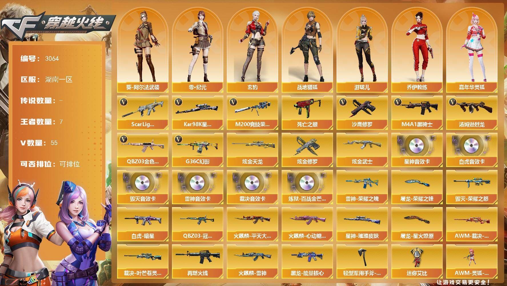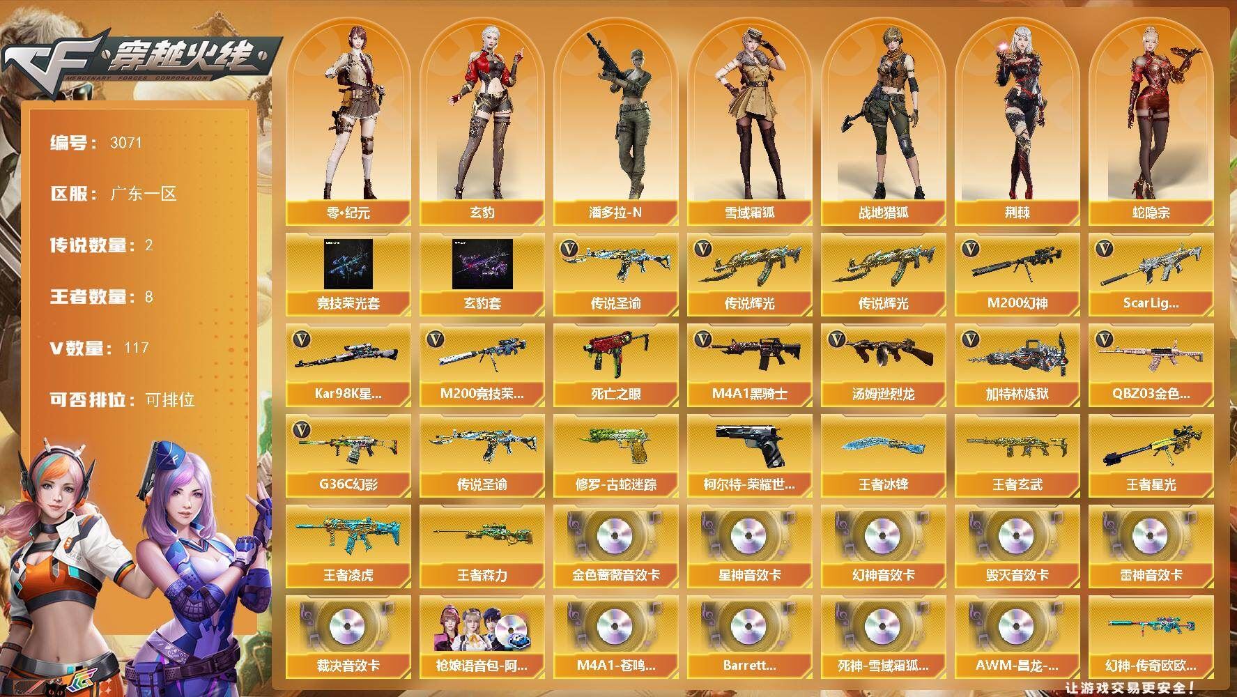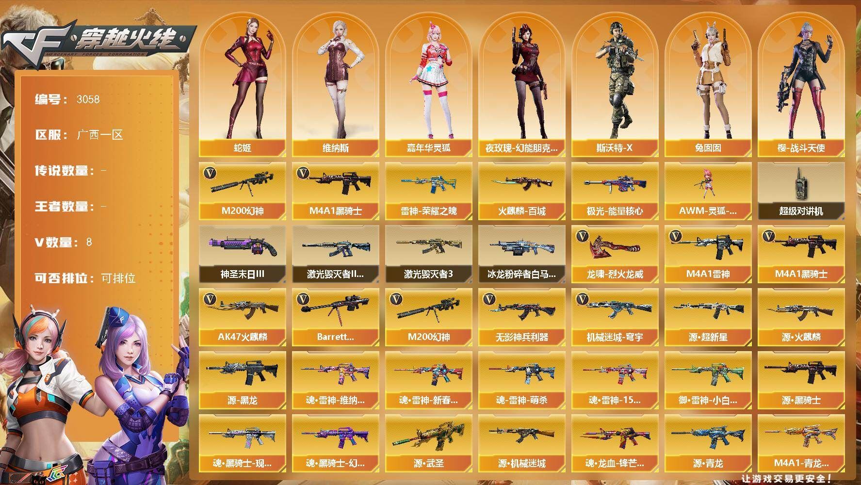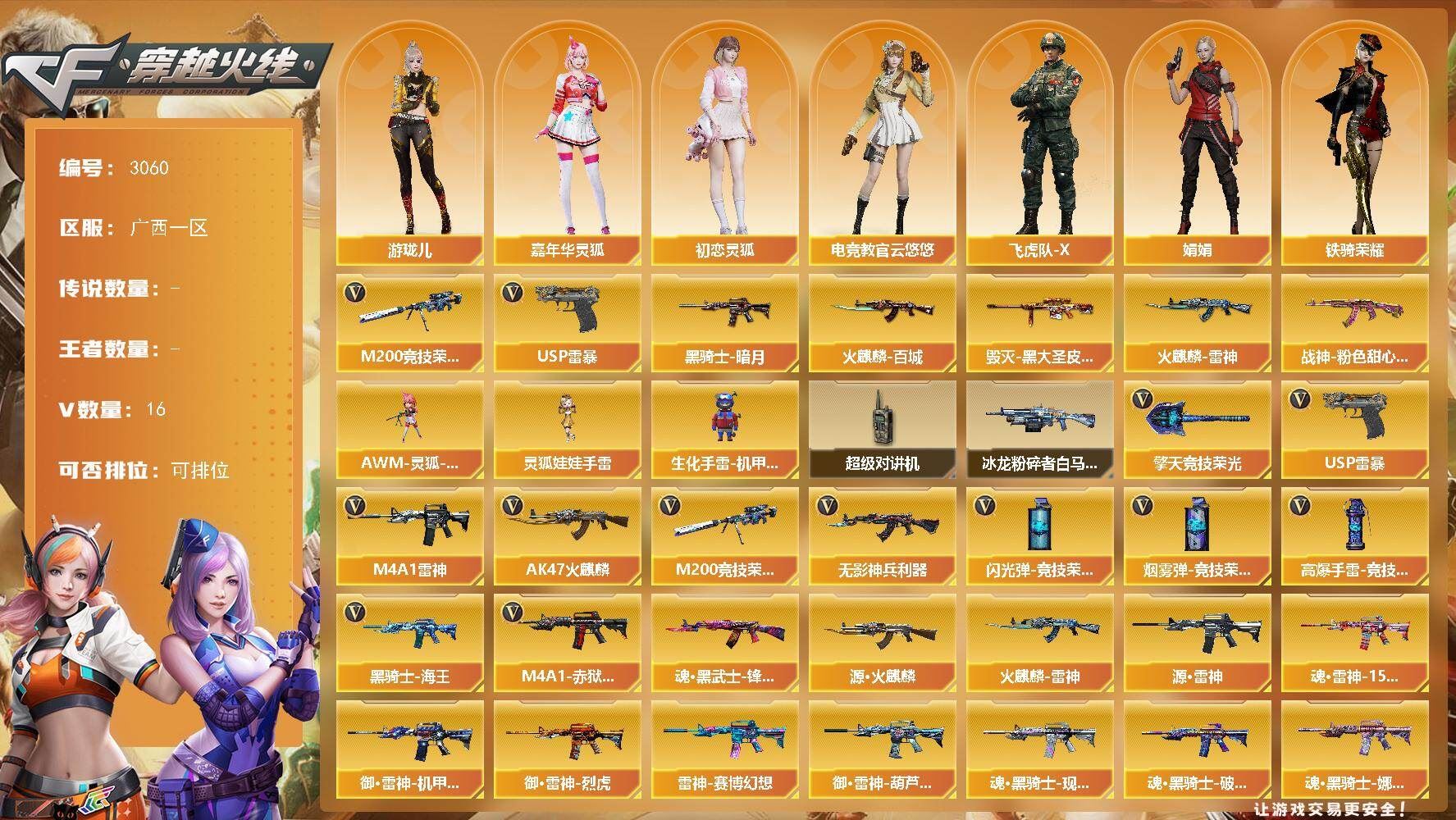 《北部精品爆破号 传说艾莉莎+竞技套+毁灭三件套+白虎+QBZ金色蔷薇+usp雷暴+2usp冥王+炽芒蝶刃+四防云悠悠》【北方大区/59V/vip1/1传说】【传说艾莉莎】【竞技荣光套】【幻神-星耀 皮肤】【M200-竞技荣光】【炽芒蝶刃】【柯尔特-竞技荣光/USP-雷暴】【Scar Light-白虎】【QBZ03-金色蔷薇】【M4A1-雷神】【Barrett-毁灭/Barrett-毁灭音效卡】【AK47-火麒麟*2/AK47-火麒麟音效卡/火麒麟-CFSTAR/火麒麟-心动糖果】【M4A1-黑骑士/M4A1-黑骑士音效卡/黑骑士-海王/黑骑士-电玩青兔皮肤】【M4A1-黑龙】【无影-神兵利器/无影-能量核心】【黑武士-CF网剧冠军/黑武士-锦绣游龙】【Barrett-极光/极光-能量核心】【汤姆逊-烈龙*2】【沙鹰-修罗/修罗-CFSTAR】【沙鹰-天神/天神-CF网剧冠军】【麒麟刺】【擎天-竞技荣光/擎天-CF网剧冠军】【屠龙】【龙啸-烈火龙威】【电竞教官-云悠悠/木兰/奇洋探员/云海玲珑/乔伊教练/兔囡囡/青霞仙子/灵狐者-黄金海岸/娟娟/潘多拉-X/斯沃特-X/救世主-X/影武者-X/堕天使/复仇者】【M4A1-龙血】【Scar Light-像素/AK47-B-战士/AK-47-猩红传说】【Colt 1911-大黄蜂*2/新USP-枪王排位奖励*8】【迷你深渊冰龙*3】【神圣爆裂者-末日III/激光毁灭者III/冰龙粉碎者-白马银枪】【轻型军用手斧-镜】【天龙-曼陀罗/夺魂】【王者之锋】【高爆手雷-竞技荣光/闪光弹-竞技荣光*5/烟雾弹-竞技荣光*2】【手雷-云海游龙】【炫金超新星*2/炫金天龙*2】【烟雾保护头盔/闪光护目镜*2/超级对讲机/超级背包/防弹头盔*6/防弹衣*5/C4工具钳*5/手雷包*4/防化服*2】