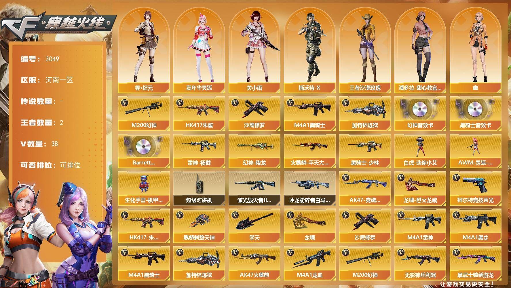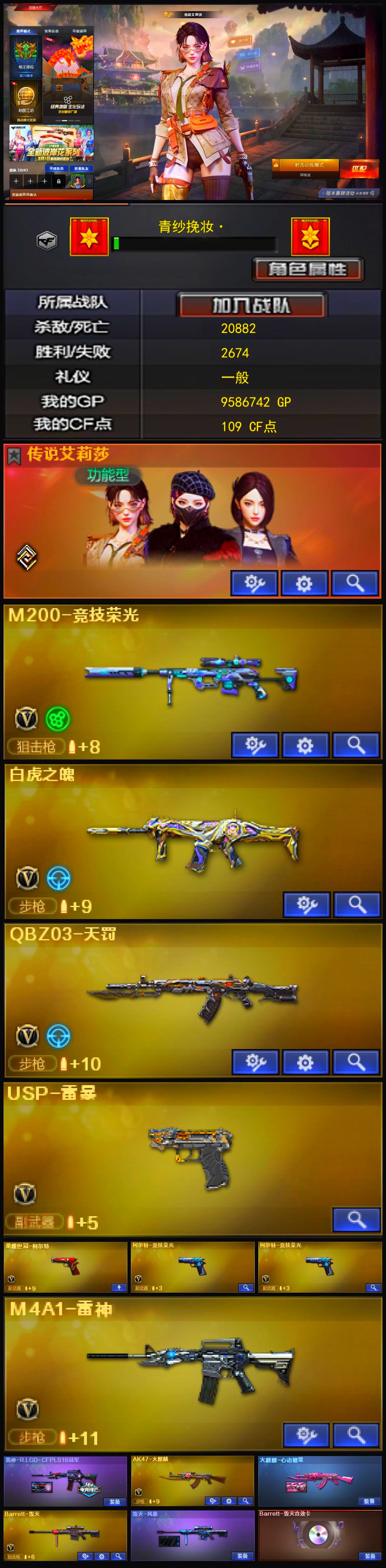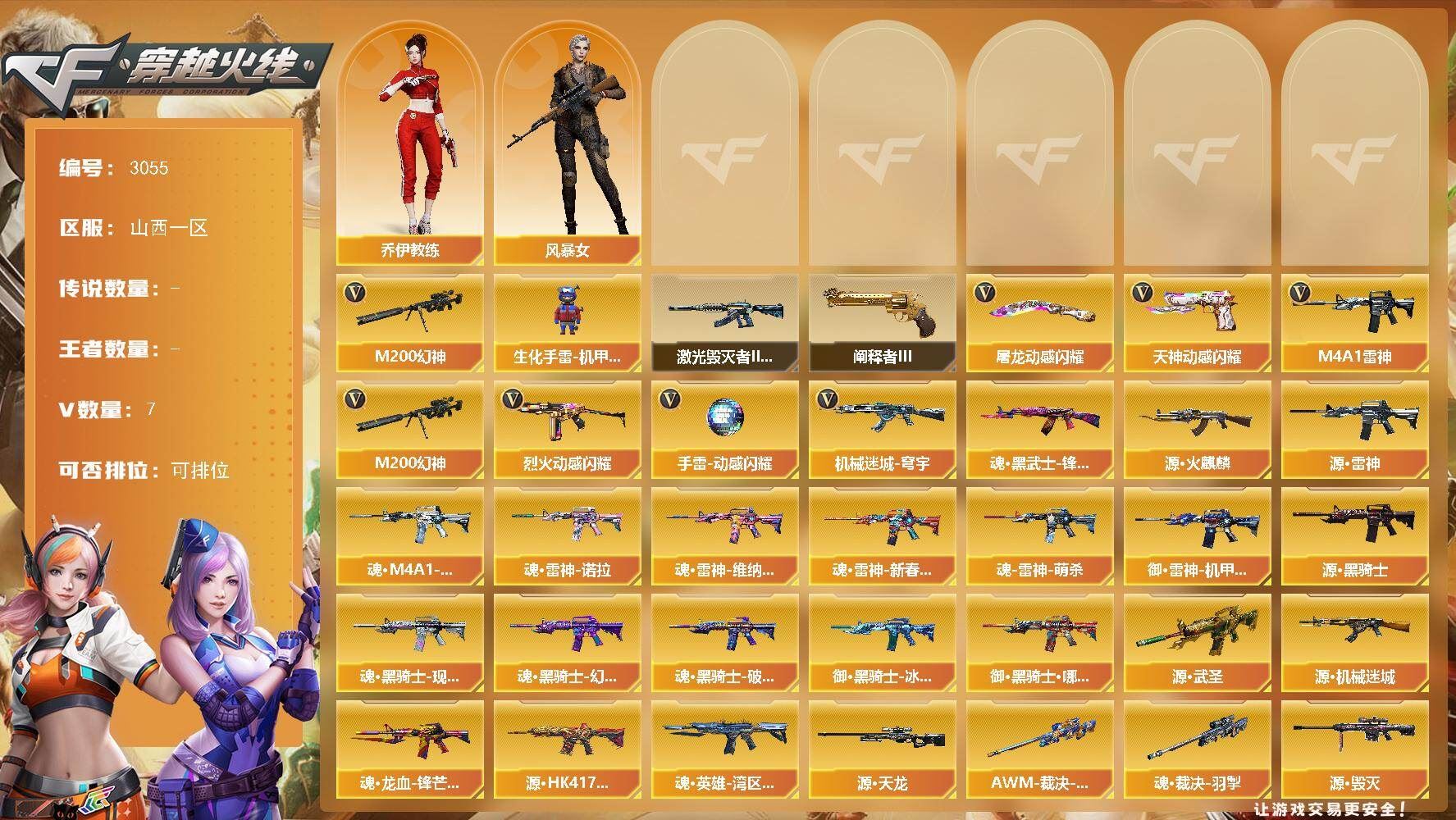 传说艾莉莎+竞技荣光套+白虎之魄觉醒版+天罚+USP雷暴+柯尔特荣耀世冠+2柯尔特竞技+风暴毁灭音效卡+精品基础v+云悠悠+4防王者葵 【可否排位】可排位 【账号状态】无封号 【区服】安徽一区 【VIP】 【游戏段位】枪王4 【游戏等级】Lv.100 大元帅 【段位排名】107292 【CF点】109 【VVIP数量】40 【重要套装】竞技荣光套装 【重要角色】传说艾莉莎/电竞教官-云悠悠/王者葵-惊若翩鸿/樱-青春偶像/暗黑审判 【传说武器】 【英雄武器】M200-竞技荣光/Barrett-毁灭/M4A1-雷神/白虎之魄-觉醒版/AK47-火麒麟/QBZ03-天罚/沙鹰-修罗(3)/荣耀世冠-柯尔特/柯尔特-竞技荣光(2)/USP-雷暴/擎天-竞技荣光/高爆手雷-竞技荣光(7)/烟雾弹-竞技荣光(8)/闪光弹-竞技荣光(8)/黑武士-锦绣游龙 【王者武器】 【小人枪】M82A1-水枪-不败狙神/AWM-灵狐-15周年嘉年华/海滩汪汪-巴雷特/魔能飞环-曼陀罗 【其他重要武器】激光毁灭者III/激光毁灭者I(3)/AK47-丹龙/AK47-QT/AK47-狂欢-CFS/QBZ03-锋芒破茧/AK47-轮回/雷神-赛博幻想/M4A1-电音/AWM-恶棍/AWM-Red/AWM-万圣节刀锋/AWM-十周年/AWM-A-彩虹/M200-青帝/末日裁决者/EVO III-赤血龙魂/EVOIII-机甲核心/沙漠之鹰-盛典-CFS 2022/愤怒公牛左轮-枪王排位(2)/沙鹰-枪王排位(2)/新USP-枪王排位奖励(2)/柯尔特-百城/COP 357-平天大圣(2)/MAC-10-涂鸦/丛林匕首-枪王排位/招财猫-枪王排位/蝴蝶刀-枪王排位/斩神刀-青帝/烟雾弹-Orange-虎牙娘/闪光弹-枪王排位(2) 【重要武器皮肤】毁灭-风暴/火麒麟-心动糖果/雷神-R.LGD-CFPLS18冠军 【重要光效】Barrett-毁灭红绿色光效 【重要音效卡】Barrett-毁灭音效卡 【重要戒指】15周年限定戒指/22赛季纪念戒指-耀银(拇指)/23赛季纪念戒指-耀铜(食指)/24赛季纪念戒指-耀银(拇指)/25赛季纪念戒指-耀铜(食指)/25赛季纪念戒指-耀铜(拇指) 【拥有重要玩偶】