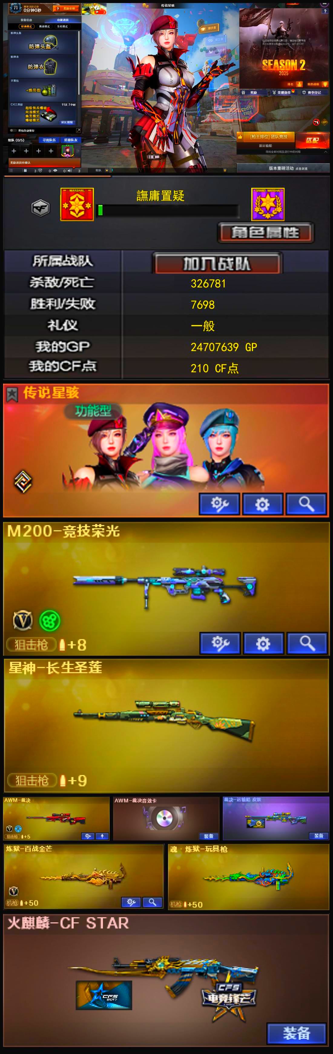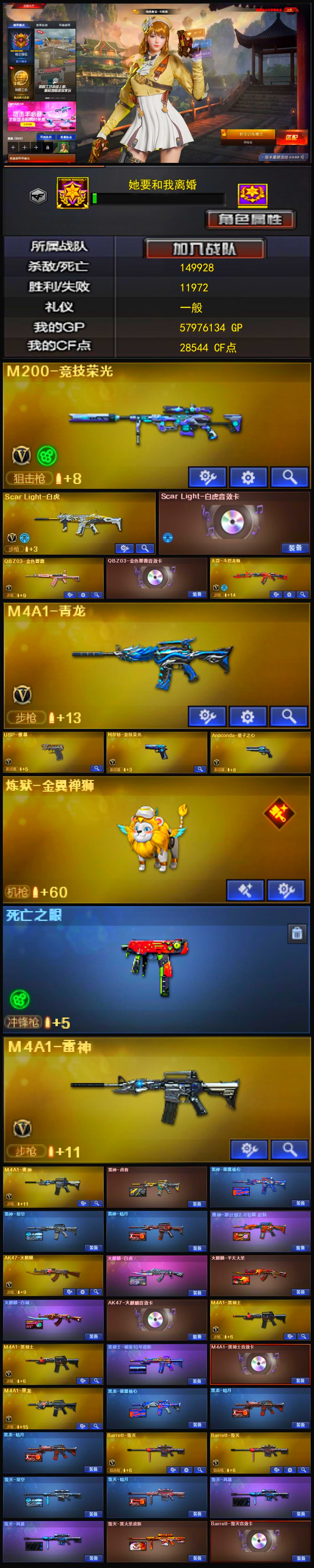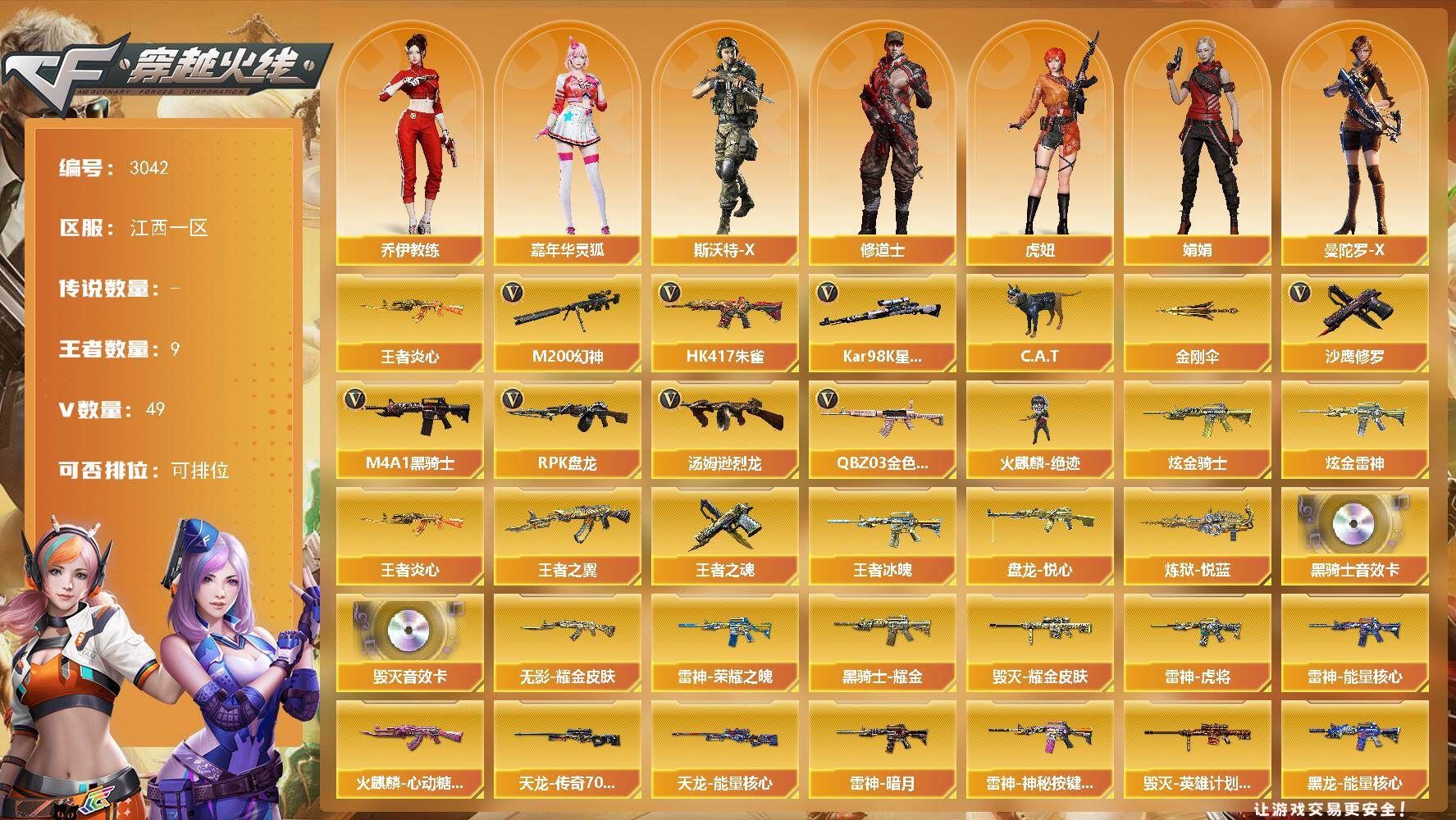 传说艾莉莎+竞技荣光套+白虎之魄觉醒版+天罚+USP雷暴+柯尔特荣耀世冠+2柯尔特竞技+风暴毁灭音效卡+精品基础v+云悠悠+4防王者葵 【可否排位】可排位 【账号状态】无封号 【区服】安徽一区 【VIP】 【游戏段位】枪王4 【游戏等级】Lv.100 大元帅 【段位排名】107292 【CF点】109 【VVIP数量】40 【重要套装】竞技荣光套装 【重要角色】传说艾莉莎/电竞教官-云悠悠/王者葵-惊若翩鸿/樱-青春偶像/暗黑审判 【传说武器】 【英雄武器】M200-竞技荣光/Barrett-毁灭/M4A1-雷神/白虎之魄-觉醒版/AK47-火麒麟/QBZ03-天罚/沙鹰-修罗(3)/荣耀世冠-柯尔特/柯尔特-竞技荣光(2)/USP-雷暴/擎天-竞技荣光/高爆手雷-竞技荣光(7)/烟雾弹-竞技荣光(8)/闪光弹-竞技荣光(8)/黑武士-锦绣游龙 【王者武器】 【小人枪】M82A1-水枪-不败狙神/AWM-灵狐-15周年嘉年华/海滩汪汪-巴雷特/魔能飞环-曼陀罗 【其他重要武器】激光毁灭者III/激光毁灭者I(3)/AK47-丹龙/AK47-QT/AK47-狂欢-CFS/QBZ03-锋芒破茧/AK47-轮回/雷神-赛博幻想/M4A1-电音/AWM-恶棍/AWM-Red/AWM-万圣节刀锋/AWM-十周年/AWM-A-彩虹/M200-青帝/末日裁决者/EVO III-赤血龙魂/EVOIII-机甲核心/沙漠之鹰-盛典-CFS 2022/愤怒公牛左轮-枪王排位(2)/沙鹰-枪王排位(2)/新USP-枪王排位奖励(2)/柯尔特-百城/COP 357-平天大圣(2)/MAC-10-涂鸦/丛林匕首-枪王排位/招财猫-枪王排位/蝴蝶刀-枪王排位/斩神刀-青帝/烟雾弹-Orange-虎牙娘/闪光弹-枪王排位(2) 【重要武器皮肤】毁灭-风暴/火麒麟-心动糖果/雷神-R.LGD-CFPLS18冠军 【重要光效】Barrett-毁灭红绿色光效 【重要音效卡】Barrett-毁灭音效卡 【重要戒指】15周年限定戒指/22赛季纪念戒指-耀银(拇指)/23赛季纪念戒指-耀铜(食指)/24赛季纪念戒指-耀银(拇指)/25赛季纪念戒指-耀铜(食指)/25赛季纪念戒指-耀铜(拇指) 【拥有重要玩偶】