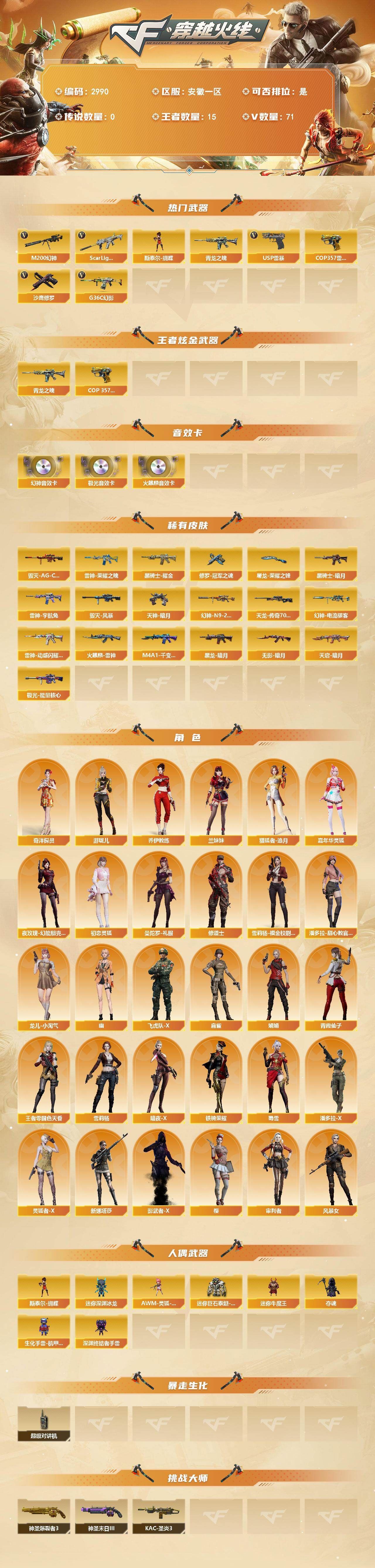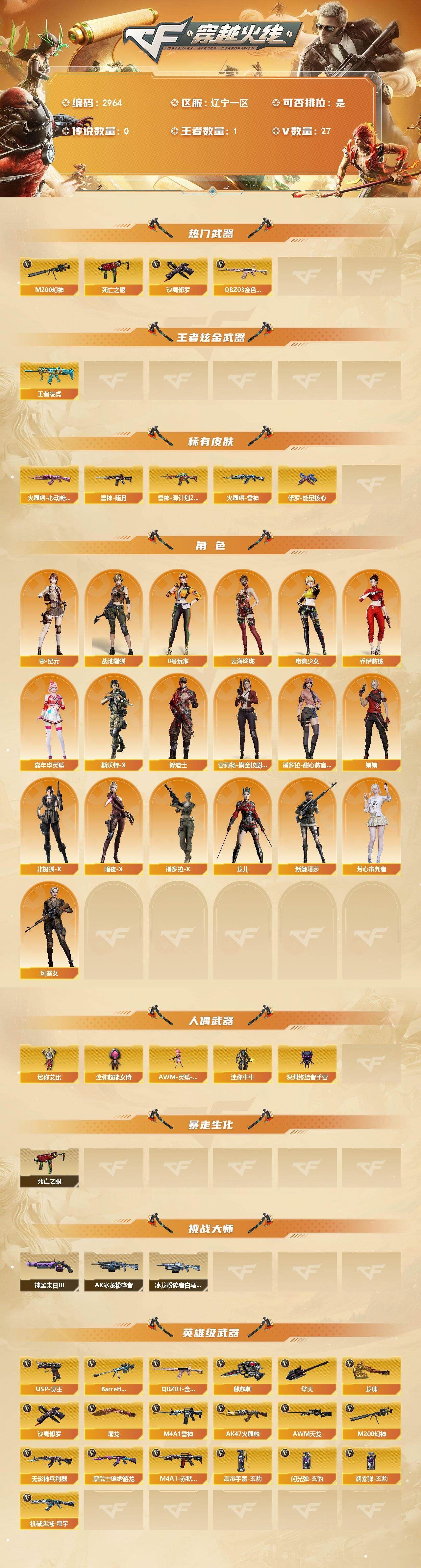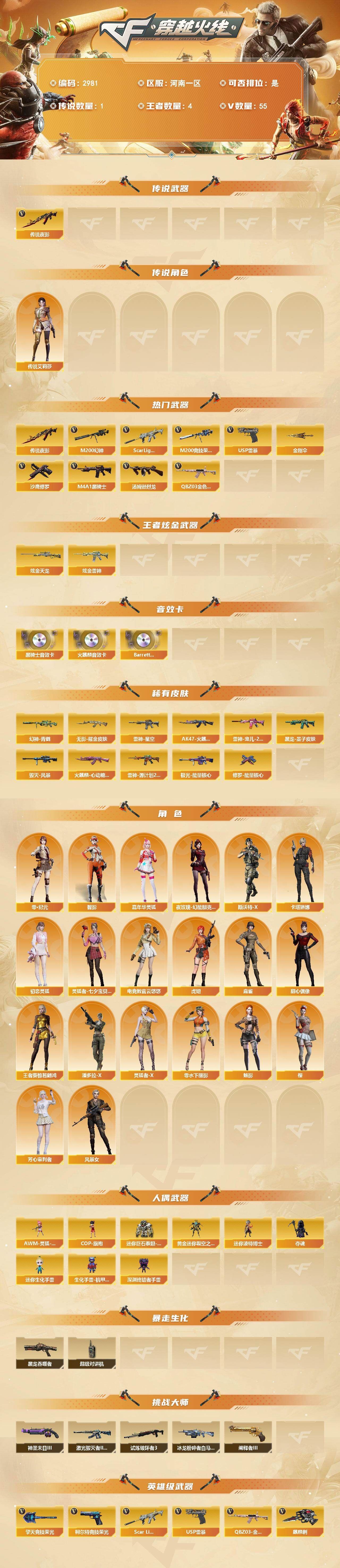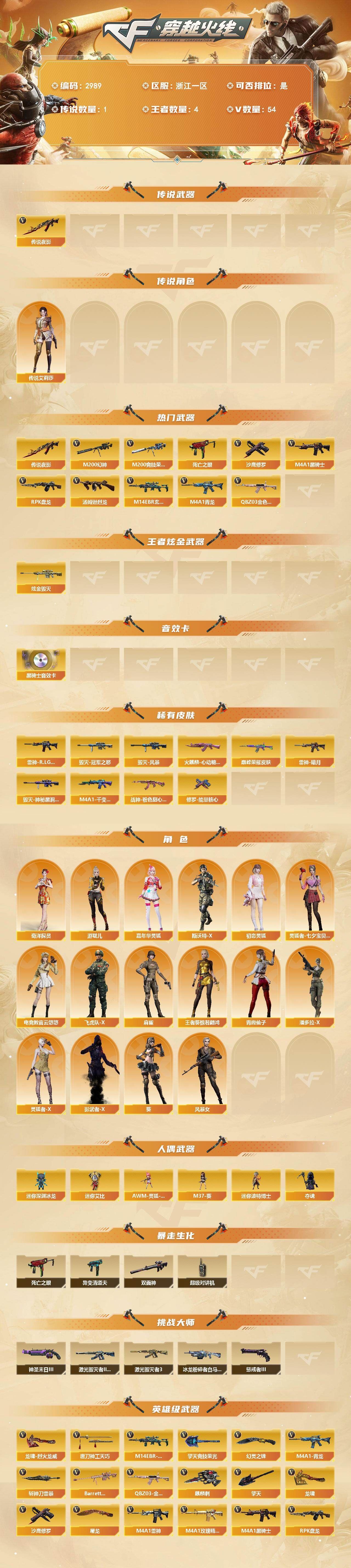 【可否排位】可排位 【账号状态】无封号 【区服】浙江一区 【VIP】 【游戏段位】大师5 【游戏等级】Lv.100 大元帅 【段位排名】331538 【CF点】1078 【VVIP数量】55 【亮点解析: 55V,1王者,4炫金,传说灵眸(2)/幻神冠军之幻/毁灭荣耀之怒/毁灭黑大圣/天龙CFSTAR/天龙秘银/裁决流光秘银/火麒麟平天大圣/传奇石头横秒之巅/无影能量核心/雷神巅峰荣耀/_零/魅影/隼/M200-幻神/Barrett-毁灭/Barrett-极光(2)/王者之光-觉醒版/Kar98K-星神/Barrett-毁灭音效卡/AWM-裁决音效卡】 【重要角色】_零/魅影/隼/王者潘多拉/零-水下丽影 【传说武器】传说灵眸(2) 【英雄武器】_M200-幻神/Barrett-毁灭/Barrett-极光(2)/王者之光-觉醒版/Kar98K-星神/AWM-天龙/AWM-裁决/M4A1-雷神/M4A1-死神/M4A1-黑龙/M4A1-黑骑士(2)/M4A1-猎神/M14EBR-玄武/AK47-火麒麟/AN94-超新星(2)/QBZ03-金色蔷薇/加特林-炼狱/COP 357-幻灵/沙鹰-天神(3)/沙鹰-修罗(4)/麒麟刺(6)/龙啸/擎天/屠龙(2)/幻灵之锋/高爆手雷-幻灵(3)/烟雾弹-幻灵(3)/闪光弹-幻灵(3)/王者芳薇-觉醒版/王者风神-觉醒版 【王者武器】 【小人枪】COP-旗袍/魔能飞环-曼陀罗/小飞碟-宇航兔兔 【其他重要武器】炫金雷神/炫金天龙/炫金毁灭(2)/激光毁灭者III/M4A1-秘银赤龙(2)/AK47-破空冰刃/M4A1-S-能量核心/QBZ03-锋芒破茧/M4A1-圣诞2021/百城AK47/AN94-青花瓷/AK103-神秘黑洞/AK47-B-十周年/黄金AK-47/AWM-CFS 2020/M200-万圣节2018/雷蛇AWM/M200-涂鸦/KAC-情人节2021/SPAS-12-雷电核心/新USP-枪王排位奖励(2)/COP 357-平天大圣/COP 357-青龙/柯尔特-百城(2)/COP-金蝉子-枪王排位/Anaconda-炽焰核心/沙鹰-枪王排位/沙鹰-万圣节2018/招财猫-枪王排位/虹光丛林匕首-枪王排位(2)/Knife-冠军之刃/鹰爪-枪王排位/丛林匕首-枪王排位/胜利奖杯闪光弹-枪王排位(3)/胜利奖杯烟雾弹-枪王排位(2)/胜利奖杯手雷-枪王排位(2)/闪光弹-枪王排位(5)/惨叫鸡手雷-惨叫迹/惨叫鸡高爆手雷(2)/红色诅咒娃娃手雷/掌火手雷 【重要武器皮肤】幻神-冠军之幻/毁灭-荣耀之怒/毁灭-黑大圣皮肤/天龙-CFSTAR/天龙-秘银/裁决-流光秘银/火麒麟-平天大圣/传奇石头-横秒之巅/无影-能量核心/M4A1-雷神-巅峰荣耀皮肤/雷神-R.LGD-CFPLS18冠军/雷神-能量核心/黑骑士-AG-S4冠军典藏/黑骑士耀金皮肤/黑龙-暗月/QBZ03-巅峰荣耀皮肤/龙啸-冠军之啸 【重要光效】M200-幻神紫橙光效/王者之影金色光效/王者之锋金色光效/白虎-蓝粉色光效/AK47-火麒麟蓝色光效/巴雷特-毁灭蓝色光效/AWM-天龙蓝色光效/沙鹰-天神绿色光效 【重要音效卡】Barrett-毁灭音效卡/AWM-裁决音效卡 【重要戒指】龙眼(死神)/龙眼(鹰)/20赛季纪念戒指-耀金/21赛季纪念戒指-耀银(拇指)/21赛季纪念戒指-耀银(食指)/22赛季纪念戒指-耀铜(食指)/22赛季纪念戒指-耀银(拇指)/23赛季纪念戒指-耀银(拇指)/23赛季纪念戒指-耀银(食指)/24赛季纪念戒指-耀银(拇指)/25赛季纪念戒指-耀铜(食指)