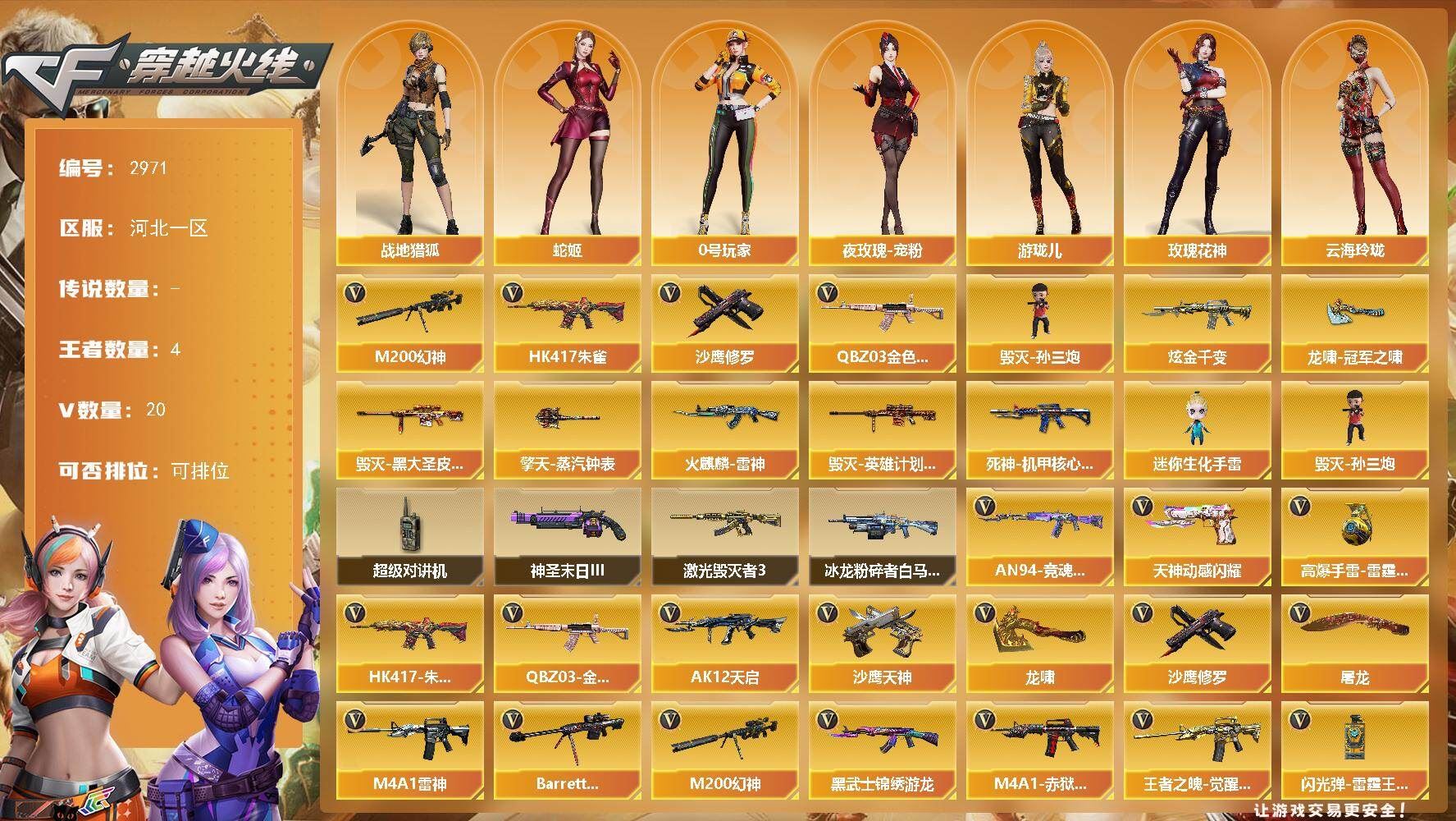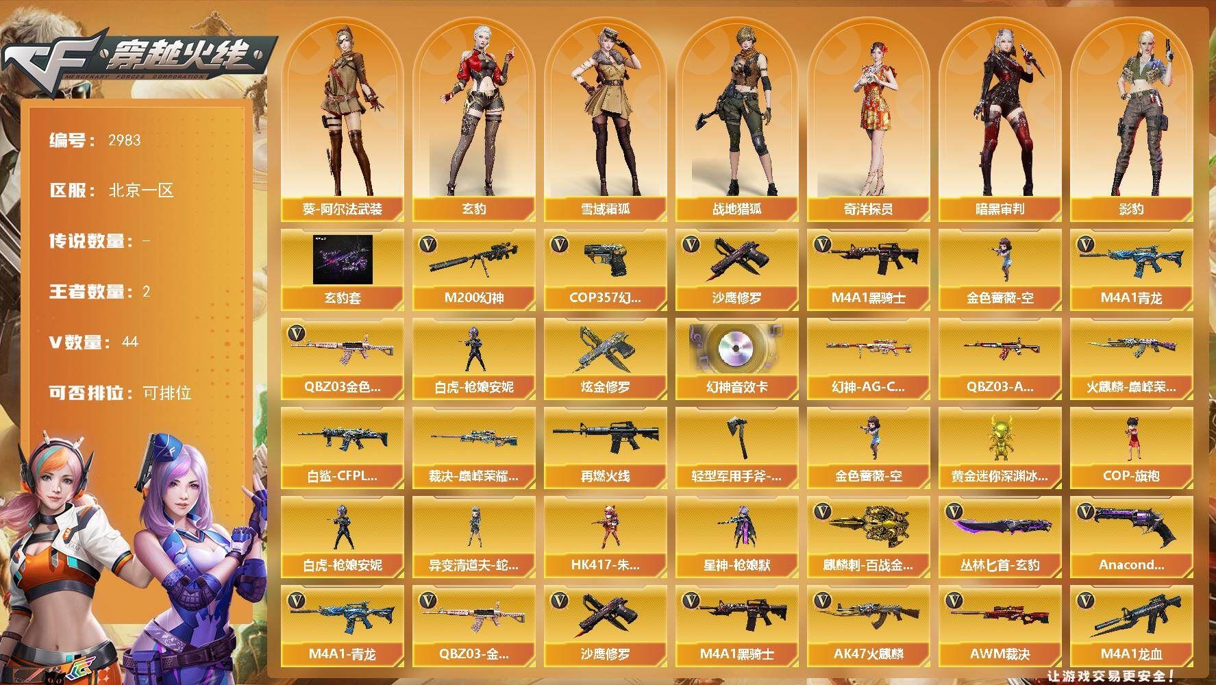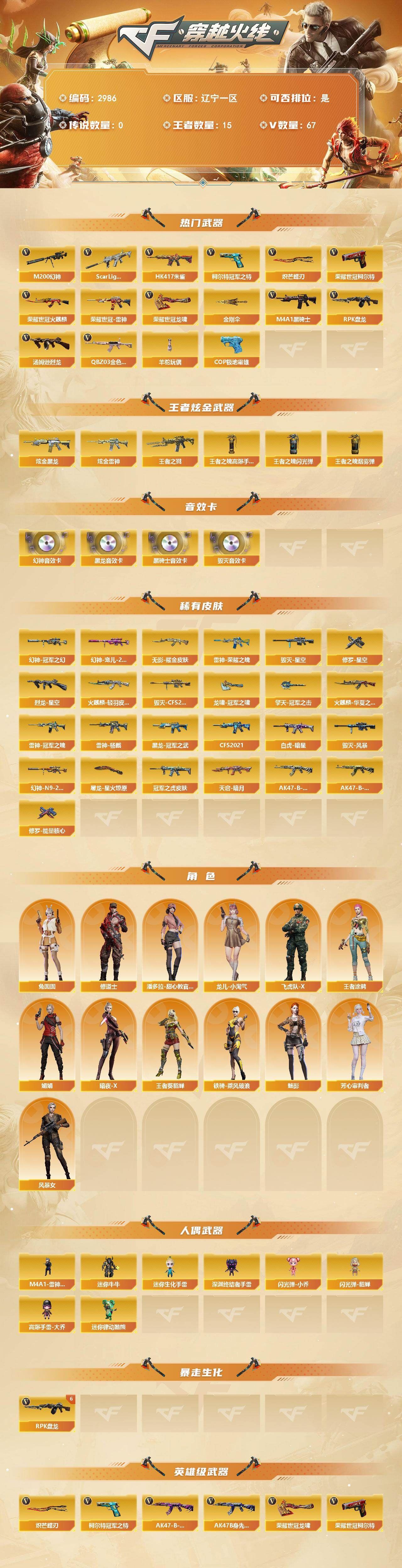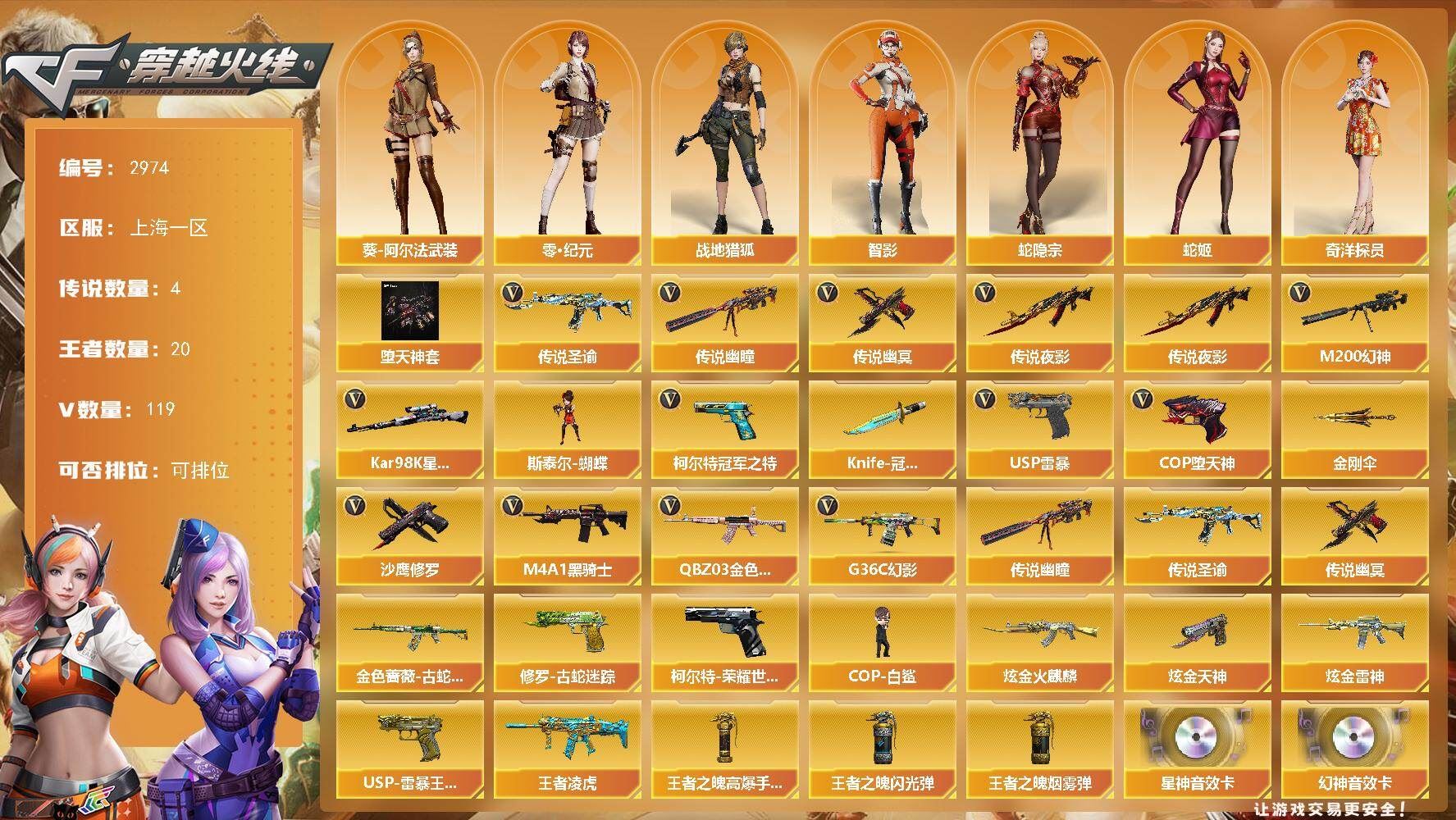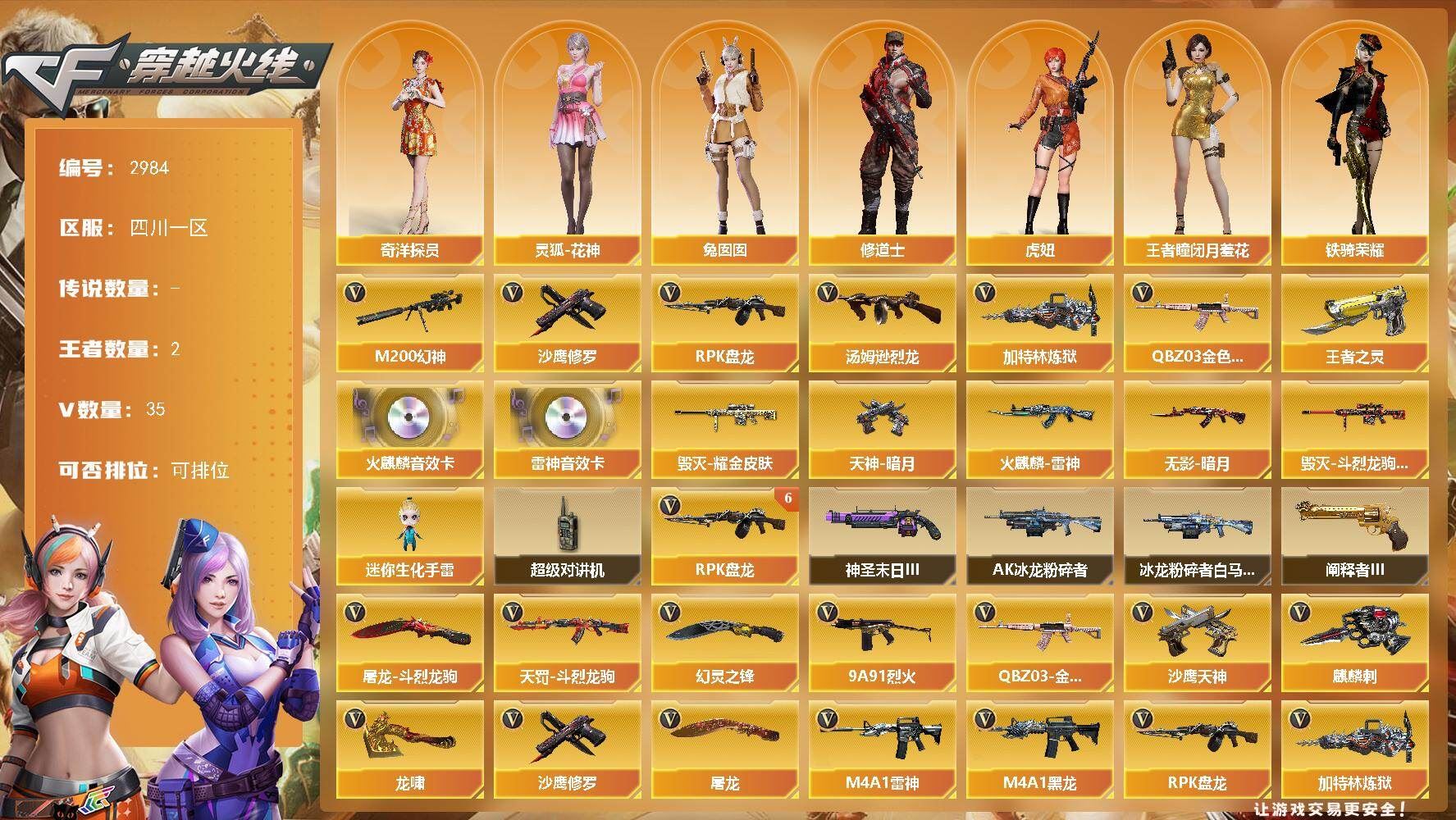 【可否排位】可排位 【账号状态】无封号 【区服】浙江一区 【VIP】 【游戏段位】大师5 【游戏等级】Lv.100 大元帅 【段位排名】331538 【CF点】1078 【VVIP数量】55 【亮点解析: 55V,1王者,4炫金,传说灵眸(2)/幻神冠军之幻/毁灭荣耀之怒/毁灭黑大圣/天龙CFSTAR/天龙秘银/裁决流光秘银/火麒麟平天大圣/传奇石头横秒之巅/无影能量核心/雷神巅峰荣耀/_零/魅影/隼/M200-幻神/Barrett-毁灭/Barrett-极光(2)/王者之光-觉醒版/Kar98K-星神/Barrett-毁灭音效卡/AWM-裁决音效卡】 【重要角色】_零/魅影/隼/王者潘多拉/零-水下丽影 【传说武器】传说灵眸(2) 【英雄武器】_M200-幻神/Barrett-毁灭/Barrett-极光(2)/王者之光-觉醒版/Kar98K-星神/AWM-天龙/AWM-裁决/M4A1-雷神/M4A1-死神/M4A1-黑龙/M4A1-黑骑士(2)/M4A1-猎神/M14EBR-玄武/AK47-火麒麟/AN94-超新星(2)/QBZ03-金色蔷薇/加特林-炼狱/COP 357-幻灵/沙鹰-天神(3)/沙鹰-修罗(4)/麒麟刺(6)/龙啸/擎天/屠龙(2)/幻灵之锋/高爆手雷-幻灵(3)/烟雾弹-幻灵(3)/闪光弹-幻灵(3)/王者芳薇-觉醒版/王者风神-觉醒版 【王者武器】 【小人枪】COP-旗袍/魔能飞环-曼陀罗/小飞碟-宇航兔兔 【其他重要武器】炫金雷神/炫金天龙/炫金毁灭(2)/激光毁灭者III/M4A1-秘银赤龙(2)/AK47-破空冰刃/M4A1-S-能量核心/QBZ03-锋芒破茧/M4A1-圣诞2021/百城AK47/AN94-青花瓷/AK103-神秘黑洞/AK47-B-十周年/黄金AK-47/AWM-CFS 2020/M200-万圣节2018/雷蛇AWM/M200-涂鸦/KAC-情人节2021/SPAS-12-雷电核心/新USP-枪王排位奖励(2)/COP 357-平天大圣/COP 357-青龙/柯尔特-百城(2)/COP-金蝉子-枪王排位/Anaconda-炽焰核心/沙鹰-枪王排位/沙鹰-万圣节2018/招财猫-枪王排位/虹光丛林匕首-枪王排位(2)/Knife-冠军之刃/鹰爪-枪王排位/丛林匕首-枪王排位/胜利奖杯闪光弹-枪王排位(3)/胜利奖杯烟雾弹-枪王排位(2)/胜利奖杯手雷-枪王排位(2)/闪光弹-枪王排位(5)/惨叫鸡手雷-惨叫迹/惨叫鸡高爆手雷(2)/红色诅咒娃娃手雷/掌火手雷 【重要武器皮肤】幻神-冠军之幻/毁灭-荣耀之怒/毁灭-黑大圣皮肤/天龙-CFSTAR/天龙-秘银/裁决-流光秘银/火麒麟-平天大圣/传奇石头-横秒之巅/无影-能量核心/M4A1-雷神-巅峰荣耀皮肤/雷神-R.LGD-CFPLS18冠军/雷神-能量核心/黑骑士-AG-S4冠军典藏/黑骑士耀金皮肤/黑龙-暗月/QBZ03-巅峰荣耀皮肤/龙啸-冠军之啸 【重要光效】M200-幻神紫橙光效/王者之影金色光效/王者之锋金色光效/白虎-蓝粉色光效/AK47-火麒麟蓝色光效/巴雷特-毁灭蓝色光效/AWM-天龙蓝色光效/沙鹰-天神绿色光效 【重要音效卡】Barrett-毁灭音效卡/AWM-裁决音效卡 【重要戒指】龙眼(死神)/龙眼(鹰)/20赛季纪念戒指-耀金/21赛季纪念戒指-耀银(拇指)/21赛季纪念戒指-耀银(食指)/22赛季纪念戒指-耀铜(食指)/22赛季纪念戒指-耀银(拇指)/23赛季纪念戒指-耀银(拇指)/23赛季纪念戒指-耀银(食指)/24赛季纪念戒指-耀银(拇指)/25赛季纪念戒指-耀铜(食指)