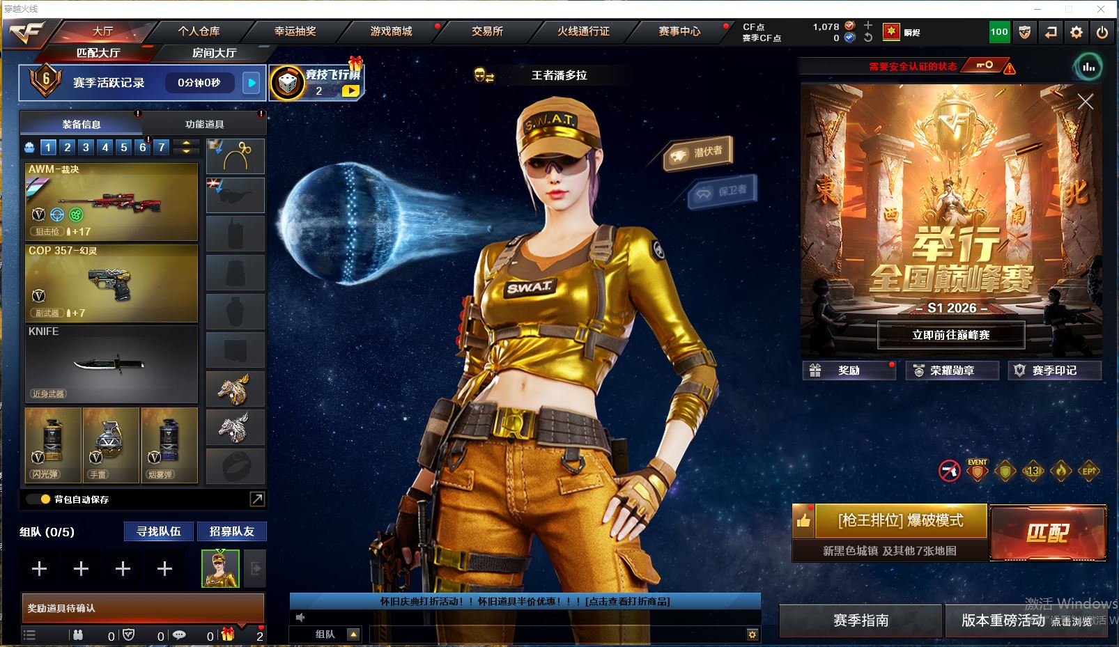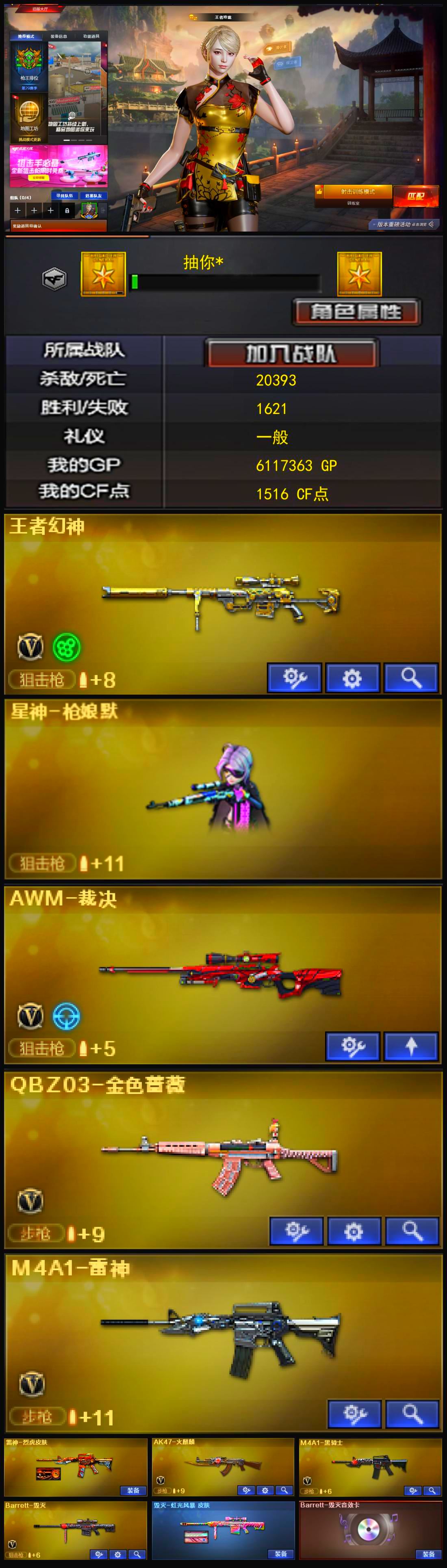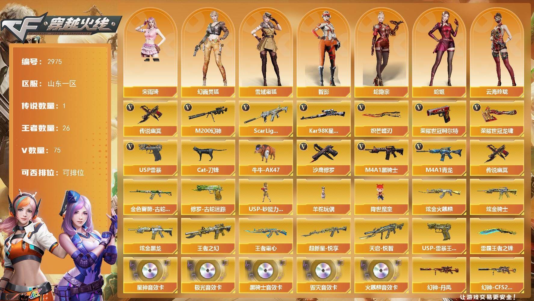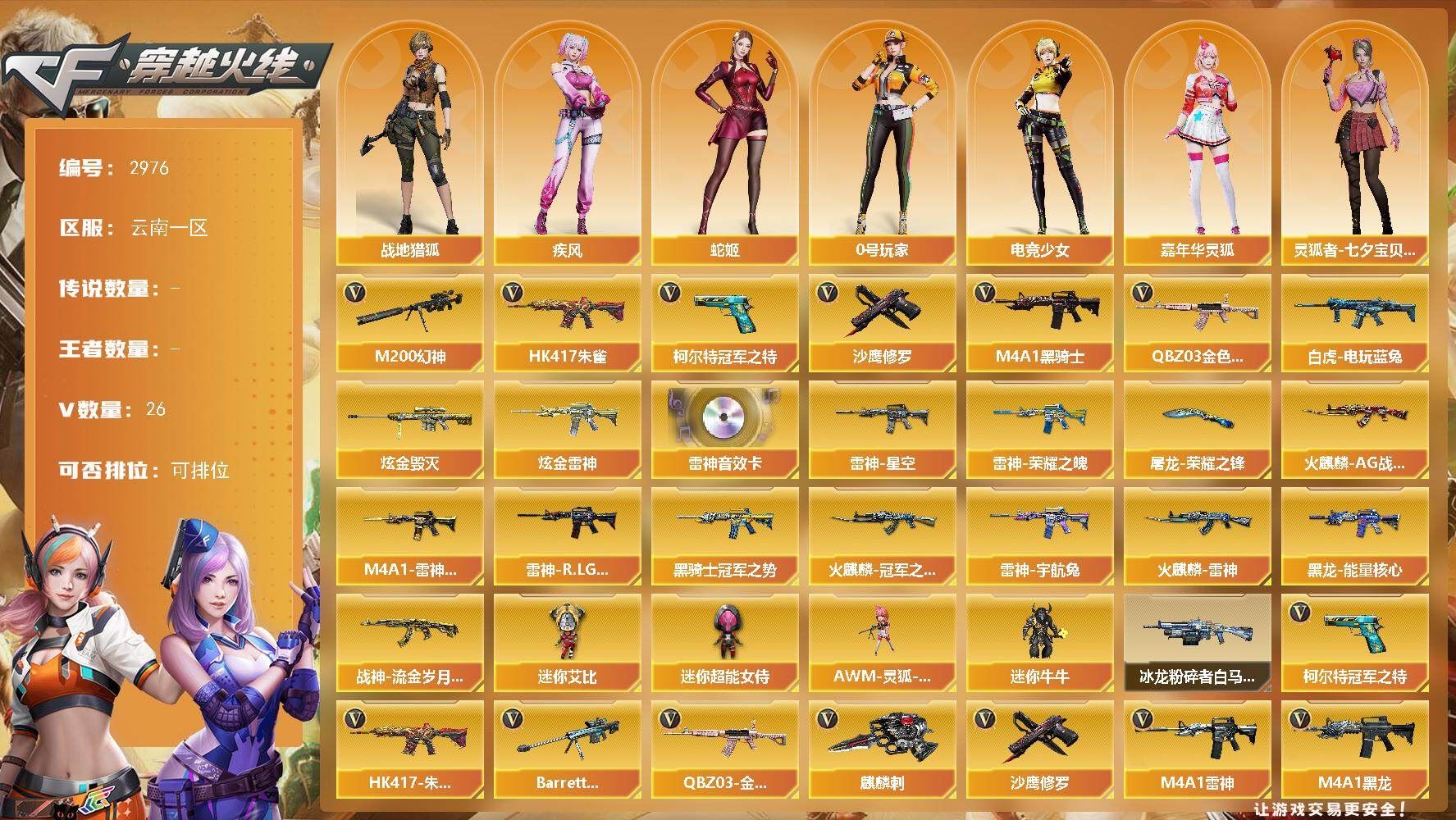 【可否排位】可排位 【账号状态】无封号 【区服】浙江一区 【VIP】 【游戏段位】大师5 【游戏等级】Lv.100 大元帅 【段位排名】331538 【CF点】1078 【VVIP数量】55 【亮点解析: 55V,1王者,4炫金,传说灵眸(2)/幻神冠军之幻/毁灭荣耀之怒/毁灭黑大圣/天龙CFSTAR/天龙秘银/裁决流光秘银/火麒麟平天大圣/传奇石头横秒之巅/无影能量核心/雷神巅峰荣耀/_零/魅影/隼/M200-幻神/Barrett-毁灭/Barrett-极光(2)/王者之光-觉醒版/Kar98K-星神/Barrett-毁灭音效卡/AWM-裁决音效卡】 【重要角色】_零/魅影/隼/王者潘多拉/零-水下丽影 【传说武器】传说灵眸(2) 【英雄武器】_M200-幻神/Barrett-毁灭/Barrett-极光(2)/王者之光-觉醒版/Kar98K-星神/AWM-天龙/AWM-裁决/M4A1-雷神/M4A1-死神/M4A1-黑龙/M4A1-黑骑士(2)/M4A1-猎神/M14EBR-玄武/AK47-火麒麟/AN94-超新星(2)/QBZ03-金色蔷薇/加特林-炼狱/COP 357-幻灵/沙鹰-天神(3)/沙鹰-修罗(4)/麒麟刺(6)/龙啸/擎天/屠龙(2)/幻灵之锋/高爆手雷-幻灵(3)/烟雾弹-幻灵(3)/闪光弹-幻灵(3)/王者芳薇-觉醒版/王者风神-觉醒版 【王者武器】 【小人枪】COP-旗袍/魔能飞环-曼陀罗/小飞碟-宇航兔兔 【其他重要武器】炫金雷神/炫金天龙/炫金毁灭(2)/激光毁灭者III/M4A1-秘银赤龙(2)/AK47-破空冰刃/M4A1-S-能量核心/QBZ03-锋芒破茧/M4A1-圣诞2021/百城AK47/AN94-青花瓷/AK103-神秘黑洞/AK47-B-十周年/黄金AK-47/AWM-CFS 2020/M200-万圣节2018/雷蛇AWM/M200-涂鸦/KAC-情人节2021/SPAS-12-雷电核心/新USP-枪王排位奖励(2)/COP 357-平天大圣/COP 357-青龙/柯尔特-百城(2)/COP-金蝉子-枪王排位/Anaconda-炽焰核心/沙鹰-枪王排位/沙鹰-万圣节2018/招财猫-枪王排位/虹光丛林匕首-枪王排位(2)/Knife-冠军之刃/鹰爪-枪王排位/丛林匕首-枪王排位/胜利奖杯闪光弹-枪王排位(3)/胜利奖杯烟雾弹-枪王排位(2)/胜利奖杯手雷-枪王排位(2)/闪光弹-枪王排位(5)/惨叫鸡手雷-惨叫迹/惨叫鸡高爆手雷(2)/红色诅咒娃娃手雷/掌火手雷 【重要武器皮肤】幻神-冠军之幻/毁灭-荣耀之怒/毁灭-黑大圣皮肤/天龙-CFSTAR/天龙-秘银/裁决-流光秘银/火麒麟-平天大圣/传奇石头-横秒之巅/无影-能量核心/M4A1-雷神-巅峰荣耀皮肤/雷神-R.LGD-CFPLS18冠军/雷神-能量核心/黑骑士-AG-S4冠军典藏/黑骑士耀金皮肤/黑龙-暗月/QBZ03-巅峰荣耀皮肤/龙啸-冠军之啸 【重要光效】M200-幻神紫橙光效/王者之影金色光效/王者之锋金色光效/白虎-蓝粉色光效/AK47-火麒麟蓝色光效/巴雷特-毁灭蓝色光效/AWM-天龙蓝色光效/沙鹰-天神绿色光效 【重要音效卡】Barrett-毁灭音效卡/AWM-裁决音效卡 【重要戒指】龙眼(死神)/龙眼(鹰)/20赛季纪念戒指-耀金/21赛季纪念戒指-耀银(拇指)/21赛季纪念戒指-耀银(食指)/22赛季纪念戒指-耀铜(食指)/22赛季纪念戒指-耀银(拇指)/23赛季纪念戒指-耀银(拇指)/23赛季纪念戒指-耀银(食指)/24赛季纪念戒指-耀银(拇指)/25赛季纪念戒指-耀铜(食指)