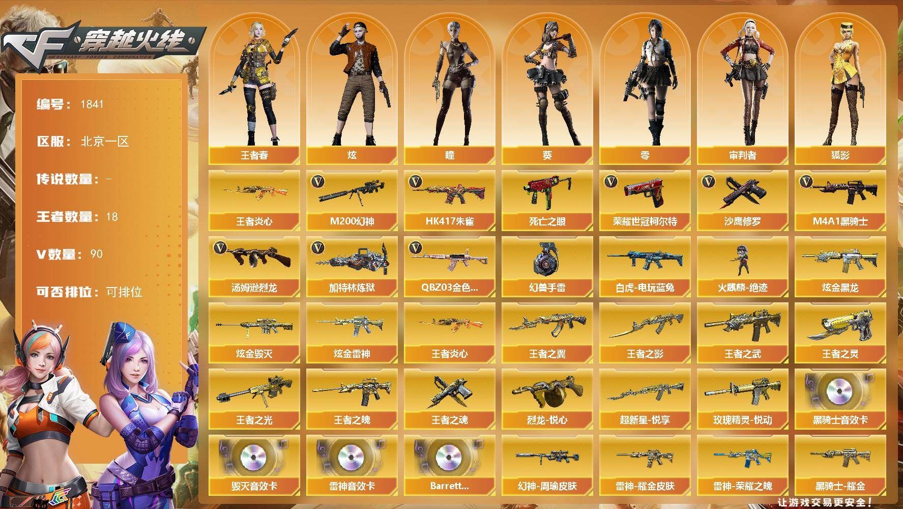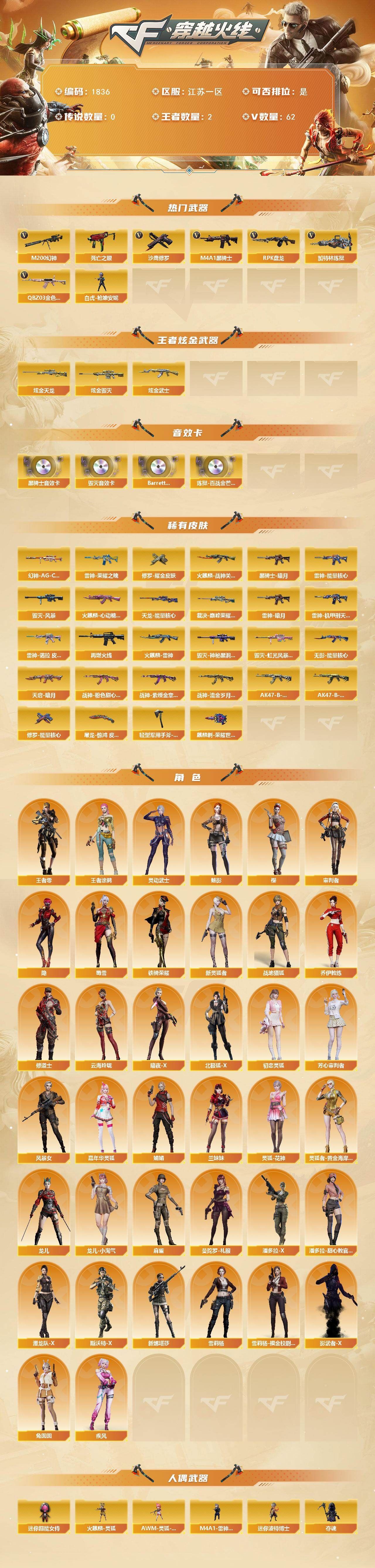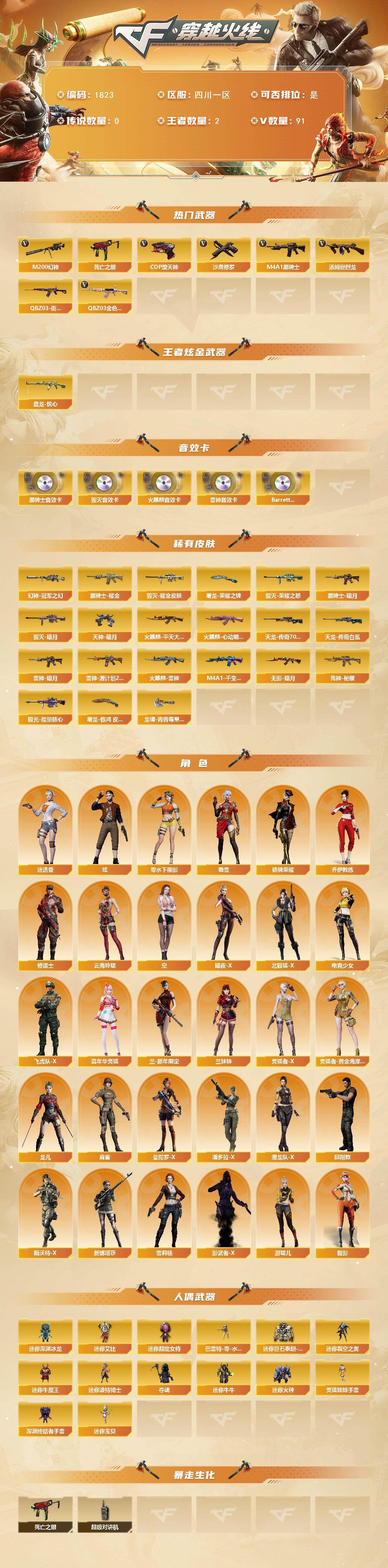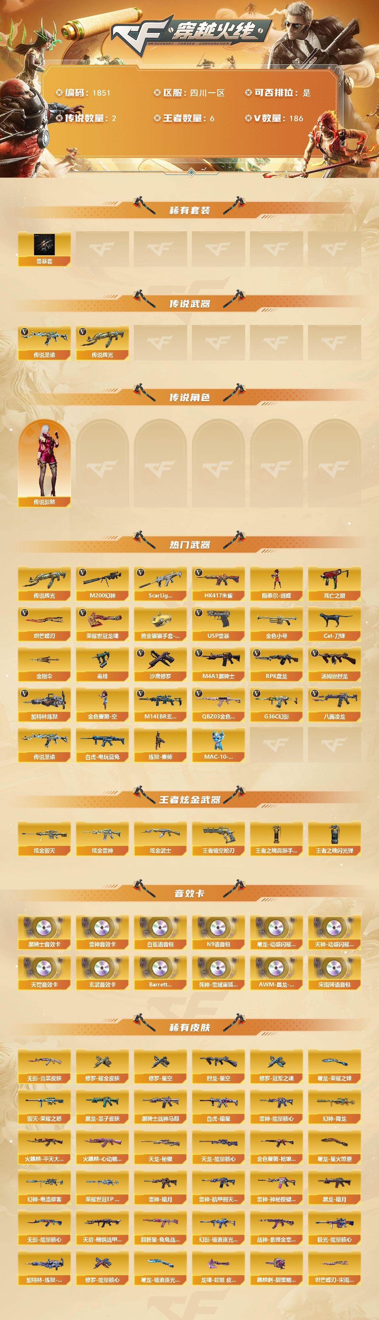 可二次可排位四川一区-186V【传说武器】:传说辉光,传说圣谕【传说角色】:传说影煞四防【热门武器】:传说辉光,传说圣谕,G36C-幻影,QBZ03-金色蔷薇,M14EBR-玄武,Scar Light-白虎,HK417-朱雀,M200-幻神,八面凌龙,死亡之眼,白虎-电玩蓝兔,金色小号,Cat-刀锋,毒蜂,M4A1-黑骑士,汤姆逊-烈龙*5,RPK-盘龙*5,加特林-炼狱,金色蔷薇-空,斯泰尔-蝴蝶*2,炼狱-秦师,MAC-10-龙宝,USP-雷暴,沙鹰-修罗*9,炽芒蝶刃*3,荣耀世冠-龙啸,黄金猫猫手套-白鲨,金刚伞【王者炫金武器】:王者破空枪刃,炫金雷神,炫金武士,炫金毁灭,王者之魄高爆手雷,王者之魄闪光弹【音效卡】:屠龙-动感闪耀 音效卡,天神-动感闪耀 音效卡,M4A1-雷神音效卡,M4A1-黑骑士音效卡,白鲨语音包,N9语音包,宋雨琦语音包,QBZ03-天罚音效卡*2,M14EBR-玄武音效卡,Barrett-碧霄极光音效卡,死神-雪域霜狐-怀旧音效卡,AWM-昌龙-怀旧音效卡【皮肤】:幻神-降龙,幻神-电流骇客 皮肤,幻神-荣耀世冠EP 皮肤,Scar Light-白虎-暗星,金色蔷薇-枪娘阿敏 皮肤,烈龙-星空,雷神-暗月,雷神-能量核心,雷神-机甲刑天皮肤,雷神-神秘按键 皮肤,雷神-宋雨琦 皮肤,火麒麟-平天大圣,火麒麟-心动糖果,毁灭-荣耀之怒,黑龙-暗月,黑龙-墨子皮肤,黑骑士-战神马超,无影-能量核心*2,无影-霓裳皮肤,幻影-破浪逐光 皮肤,炽芒蝶刃-宋雨琦 皮肤*2【角色】:樱,炫,沙漠玫瑰,妮妮,战地猎狐,雪域霜狐,奇洋探员,乔伊教练,修道士,云海玲珑,宋雨琦,暗夜-X,初恋灵狐,飞虎队-X,嘉年华灵狐,葵-赛博朋克,职业选手【人偶武器】:炼狱-秦师,金色蔷薇-空,金蚀-机械姬,MAC-10-龙宝,斯泰尔-蝴蝶*2,萌兔-斯泰尔,Scar Light-马枪,MAC-10-千针棘鲨*2,跳跳鲨,AWM-灵狐-15周年嘉年华*2,M37-葵,COP-旗袍,Cat-刀锋,迷你深渊冰龙,黄金迷你裂空之翼,迷你波特博士,迷你牛牛,迷你生化手雷*8,生化手雷-机甲核心,深渊终结者手雷,迷你艾比,迷你超能女侍,迷你巨石泰坦-魔花研究所,灵狐娃娃手雷,烟雾弹-迷雾幽灵【暴走生化】:毒蜂,异变清道夫,KAC-狂怒咆哮,黑龙吞噬者,双面神,死亡之眼,超级对讲机【挑战大师】:VEPR-12-金魔,KAC-圣炎切割者III【英雄级武器】:M4A1-千变,AK47-火麒麟,M4A1-黑龙,M4A1-雷神,M4A1-黑骑士,AK47-无影,M4A1-死神,AK47-黑武士,AK12-天启,AN94-超新星,M4A1-武圣,AK47-机械迷城,AK47-黑鲨,M4A1-龙血,M4A1-雷霆*2,AK47-雷暴,HK417-朱雀,Scar Light-白虎,M4A1-幻灵,M14EBR-玄武,QBZ03-天罚,无影-神兵利器,G36C-幻影,黑武士-锦绣游龙,八面凌龙,死神-雪域霜狐,SCAR Light-玄豹,QBZ03-金色蔷薇,M4A1-猎神,烈火-动感闪耀,王者之戮-觉醒版,AK-47-猩红传说*2,白虎-电玩蓝兔,王者猎神-觉醒版,加利尔ACE-天袭,AWM-天龙,Barrett-毁灭,Barrett-极光,AWM-裁决,M200-幻神,Barrett-电竞装甲,VSK-94-金蚀,Barrett-金色蔷薇,RPK-盘龙*5,加特林-炼狱,汤姆逊-烈龙*5,烈龙-云海游龙,AA-12-雷霆,沙鹰-修罗*9,沙鹰-天神*7,USP-雷暴,COP-雷霆,柯尔特-电竞装甲*2,柯尔特-竞技荣光,Anaconda-玄豹,USP-神工天巧,USP-冥王*2,王者破空枪刃-觉醒版,Glock18-武圣,天神-动感闪耀,屠龙*5,龙啸,麒麟刺-堕天神,马来剑-夜魔,擎天*2,麒麟刺*2,幻灵之锋,擎天-竞技荣光,炽芒蝶刃*3,屠龙-动感闪耀,擎天-云海游龙,龙啸-热带奇洋,荣耀世冠-龙啸,尼泊尔-电竞装甲,斩神刀-雷暴,丛林匕首-玄豹*2,【道具】:哔哩哔哩名片,圣拳猎手-炽雪,女皇终结者-魔龙之吻,救世主-黑桃战神,黄金生化钩*2,绿色巨人,灵魂忍者*3,变异宝贝,迷雾幽灵*3,生化弹匣,夺命之镰*2,防化服*3,新白银C4,防弹头盔*6,防弹衣*6,C4工具钳*6,手雷包*4【特殊枪械】:蝴蝶斯泰尔+5烈龙,1白虎,1黑骑士,5烈龙,5盘龙,1炼狱,2蝴蝶斯泰尔【稀有套装】:雷暴套,各种道具详情看截图、低价出售找回包 赔、截图展示段位不代 表实际段位,如赛季更新等不可抗拒因素发生变化、时限道具不保证所剩时间、标题未写送点劵默认不送【卖号买号首选亿梦】