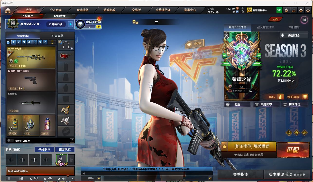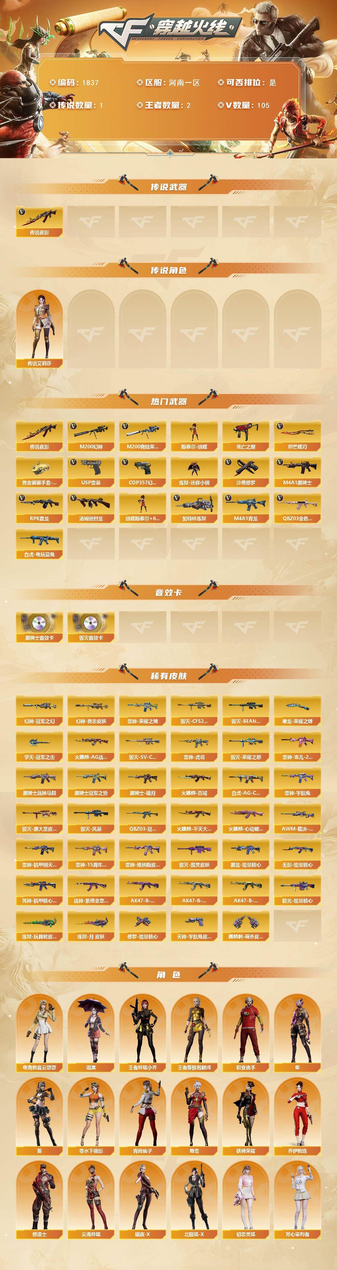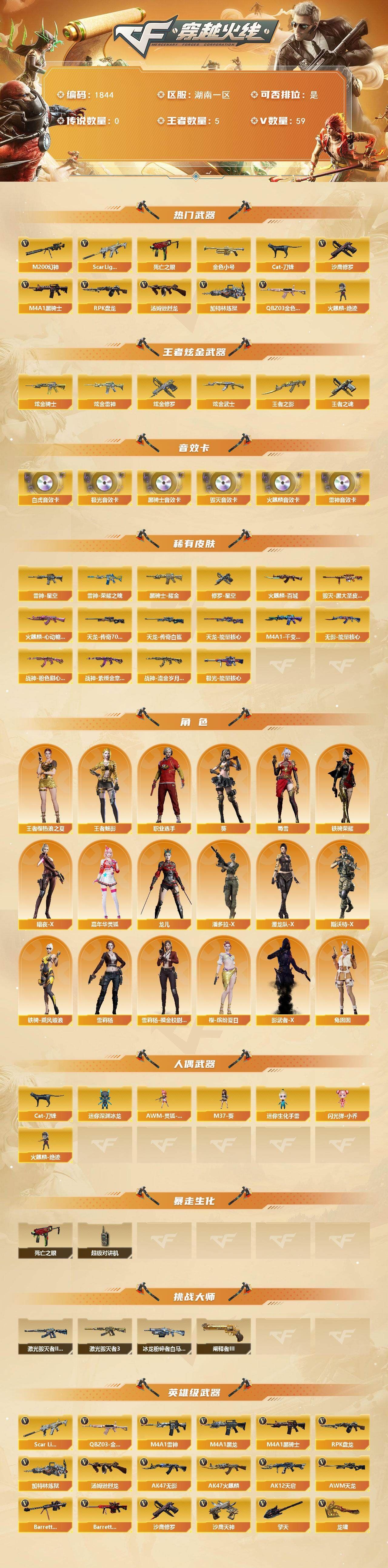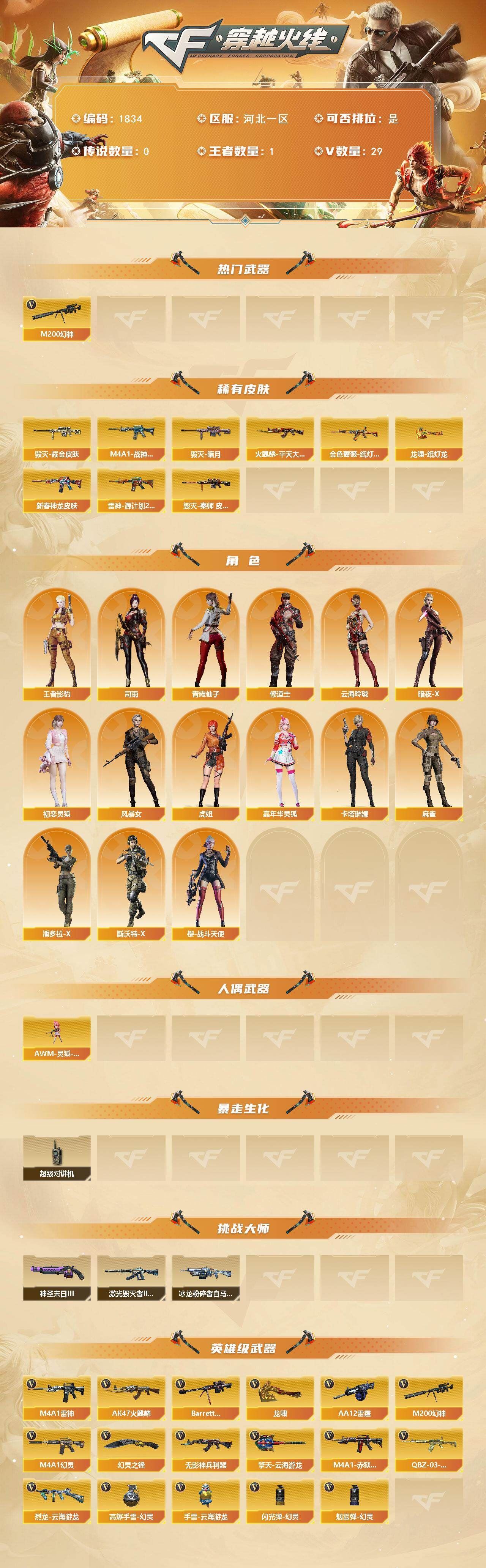可二次可排位四川一区-186V【传说武器】:传说辉光,传说圣谕【传说角色】:传说影煞四防【热门武器】:传说辉光,传说圣谕,G36C-幻影,QBZ03-金色蔷薇,M14EBR-玄武,Scar Light-白虎,HK417-朱雀,M200-幻神,八面凌龙,死亡之眼,白虎-电玩蓝兔,金色小号,Cat-刀锋,毒蜂,M4A1-黑骑士,汤姆逊-烈龙*5,RPK-盘龙*5,加特林-炼狱,金色蔷薇-空,斯泰尔-蝴蝶*2,炼狱-秦师,MAC-10-龙宝,USP-雷暴,沙鹰-修罗*9,炽芒蝶刃*3,荣耀世冠-龙啸,黄金猫猫手套-白鲨,金刚伞【王者炫金武器】:王者破空枪刃,炫金雷神,炫金武士,炫金毁灭,王者之魄高爆手雷,王者之魄闪光弹【音效卡】:屠龙-动感闪耀 音效卡,天神-动感闪耀 音效卡,M4A1-雷神音效卡,M4A1-黑骑士音效卡,白鲨语音包,N9语音包,宋雨琦语音包,QBZ03-天罚音效卡*2,M14EBR-玄武音效卡,Barrett-碧霄极光音效卡,死神-雪域霜狐-怀旧音效卡,AWM-昌龙-怀旧音效卡【皮肤】:幻神-降龙,幻神-电流骇客 皮肤,幻神-荣耀世冠EP 皮肤,Scar Light-白虎-暗星,金色蔷薇-枪娘阿敏 皮肤,烈龙-星空,雷神-暗月,雷神-能量核心,雷神-机甲刑天皮肤,雷神-神秘按键 皮肤,雷神-宋雨琦 皮肤,火麒麟-平天大圣,火麒麟-心动糖果,毁灭-荣耀之怒,黑龙-暗月,黑龙-墨子皮肤,黑骑士-战神马超,无影-能量核心*2,无影-霓裳皮肤,幻影-破浪逐光 皮肤,炽芒蝶刃-宋雨琦 皮肤*2【角色】:樱,炫,沙漠玫瑰,妮妮,战地猎狐,雪域霜狐,奇洋探员,乔伊教练,修道士,云海玲珑,宋雨琦,暗夜-X,初恋灵狐,飞虎队-X,嘉年华灵狐,葵-赛博朋克,职业选手【人偶武器】:炼狱-秦师,金色蔷薇-空,金蚀-机械姬,MAC-10-龙宝,斯泰尔-蝴蝶*2,萌兔-斯泰尔,Scar Light-马枪,MAC-10-千针棘鲨*2,跳跳鲨,AWM-灵狐-15周年嘉年华*2,M37-葵,COP-旗袍,Cat-刀锋,迷你深渊冰龙,黄金迷你裂空之翼,迷你波特博士,迷你牛牛,迷你生化手雷*8,生化手雷-机甲核心,深渊终结者手雷,迷你艾比,迷你超能女侍,迷你巨石泰坦-魔花研究所,灵狐娃娃手雷,烟雾弹-迷雾幽灵【暴走生化】:毒蜂,异变清道夫,KAC-狂怒咆哮,黑龙吞噬者,双面神,死亡之眼,超级对讲机【挑战大师】:VEPR-12-金魔,KAC-圣炎切割者III【英雄级武器】:M4A1-千变,AK47-火麒麟,M4A1-黑龙,M4A1-雷神,M4A1-黑骑士,AK47-无影,M4A1-死神,AK47-黑武士,AK12-天启,AN94-超新星,M4A1-武圣,AK47-机械迷城,AK47-黑鲨,M4A1-龙血,M4A1-雷霆*2,AK47-雷暴,HK417-朱雀,Scar Light-白虎,M4A1-幻灵,M14EBR-玄武,QBZ03-天罚,无影-神兵利器,G36C-幻影,黑武士-锦绣游龙,八面凌龙,死神-雪域霜狐,SCAR Light-玄豹,QBZ03-金色蔷薇,M4A1-猎神,烈火-动感闪耀,王者之戮-觉醒版,AK-47-猩红传说*2,白虎-电玩蓝兔,王者猎神-觉醒版,加利尔ACE-天袭,AWM-天龙,Barrett-毁灭,Barrett-极光,AWM-裁决,M200-幻神,Barrett-电竞装甲,VSK-94-金蚀,Barrett-金色蔷薇,RPK-盘龙*5,加特林-炼狱,汤姆逊-烈龙*5,烈龙-云海游龙,AA-12-雷霆,沙鹰-修罗*9,沙鹰-天神*7,USP-雷暴,COP-雷霆,柯尔特-电竞装甲*2,柯尔特-竞技荣光,Anaconda-玄豹,USP-神工天巧,USP-冥王*2,王者破空枪刃-觉醒版,Glock18-武圣,天神-动感闪耀,屠龙*5,龙啸,麒麟刺-堕天神,马来剑-夜魔,擎天*2,麒麟刺*2,幻灵之锋,擎天-竞技荣光,炽芒蝶刃*3,屠龙-动感闪耀,擎天-云海游龙,龙啸-热带奇洋,荣耀世冠-龙啸,尼泊尔-电竞装甲,斩神刀-雷暴,丛林匕首-玄豹*2,【道具】:哔哩哔哩名片,圣拳猎手-炽雪,女皇终结者-魔龙之吻,救世主-黑桃战神,黄金生化钩*2,绿色巨人,灵魂忍者*3,变异宝贝,迷雾幽灵*3,生化弹匣,夺命之镰*2,防化服*3,新白银C4,防弹头盔*6,防弹衣*6,C4工具钳*6,手雷包*4【特殊枪械】:蝴蝶斯泰尔+5烈龙,1白虎,1黑骑士,5烈龙,5盘龙,1炼狱,2蝴蝶斯泰尔【稀有套装】:雷暴套,各种道具详情看截图、低价出售找回包 赔、截图展示段位不代 表实际段位,如赛季更新等不可抗拒因素发生变化、时限道具不保证所剩时间、标题未写送点劵默认不送【卖号买号首选亿梦】