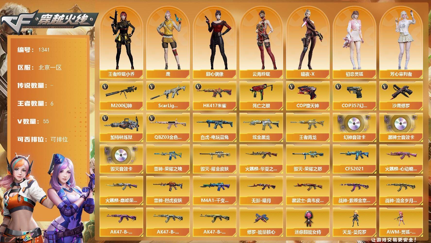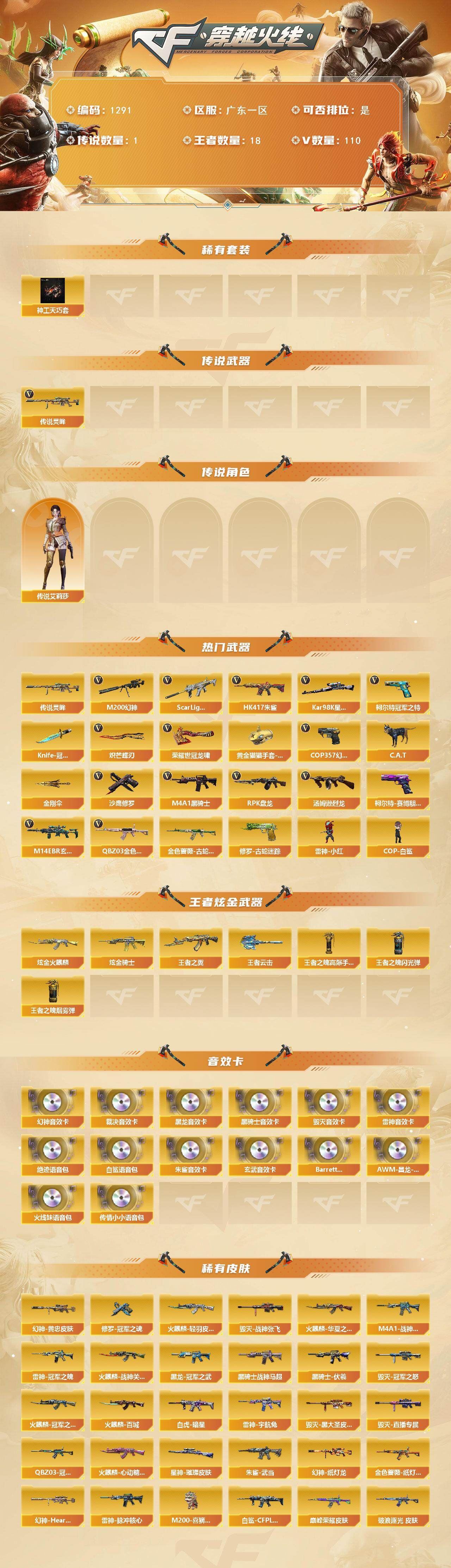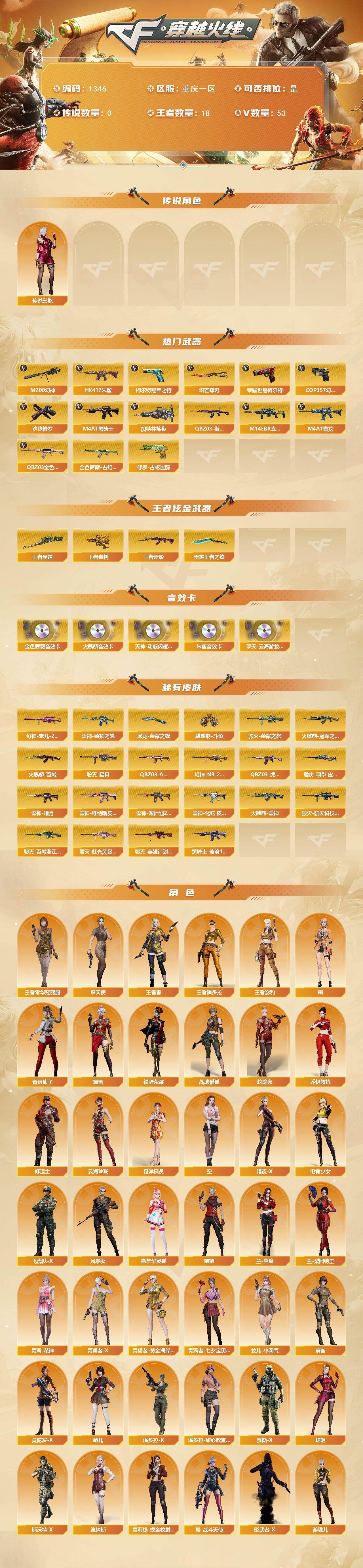 r50910 可二次 重庆一区 可排位【70V】【传说角色】:传说影煞【热门武器】:QBZ03-金色蔷薇,M14EBR-玄武,HK417-朱雀,M4A1-青龙,M200-幻神,金色蔷薇-古蛇迷踪,修罗-古蛇迷踪,QBZ03-街机,柯尔特-冠军之特,荣耀世冠-柯尔特,M4A1-黑骑士,加特林-炼狱,COP 357-幻灵,沙鹰-修罗,炽芒蝶刃【王者炫金武器】:王者雷影,王者星霆,雷霆王者之锋,王者岩刺【音效卡】:天神-动感闪耀 音效卡,擎天-云海游龙音效卡,AK47-火麒麟音效卡,QBZ03-金色蔷薇音效卡,HK417-朱雀音效卡【皮肤】:幻神-宠儿-2021MVP,M200-幻神-N9-2022MVP,QBZ03-AG-CFPLS19冠军,QBZ03-虎鱼 皮肤,裁决-羽掣 皮肤,雷神-暗月,雷神-荣耀之魄,雷神-维纳斯皮肤,雷神-源计划2.0专属 皮肤,雷神-化蛇 皮肤,火麒麟-雷神,火麒麟-冠军之心,火麒麟-百城,毁灭-暗月,毁灭-荣耀之怒,毁灭-航天科技皮肤,毁灭-百城浙江 皮肤,毁灭-虹光风暴 皮肤,毁灭-英雄计划 皮肤,黑骑士-破浪10年皮肤,屠龙-荣耀之锋*3,麒麟刺-斗鱼平台皮肤【角色】:战地猎狐,王者零-华冠丽服,王者春,王者影豹,王者潘多拉,蛇隐宗,奇洋探员,乔伊教练,修道士,云海玲珑,炽天使,空,暗夜-X,电竞少女,飞虎队-X,风暴女,嘉年华灵狐,娟娟,兰-空鹰,兰-梨园特工,灵狐-花神,灵狐者-X,灵狐者-黄金海岸,灵狐者-七夕宝贝,龙儿-小淘气,麻雀,曼陀罗-X,萌儿,潘多拉-X,潘多拉-甜心教官,青霞仙子,赛斯-X,蛇姬,斯沃特-X,蜀雪,铁骑荣耀,兔囡囡,维纳斯,雪莉杨-摸金校尉,夜玫瑰-宠粉,樱-战斗天使,影武者-X,幽,游珑儿【人偶武器】:迷你宝贝,AWM-灵狐-15周年嘉年华,迷你牛魔王,迷你波特博士,夺魂,迷你牛牛*2,迷你生化手雷*3,生化手雷-机甲核心,深渊终结者手雷【暴走生化】:超级对讲机【挑战大师】:激光毁灭者III-白马银枪*2,神圣爆裂者-末日III【英雄级武器】:AK47-火麒麟,M4A1-雷神*2,M4A1-黑骑士,AK12-天启,M4A1-青龙,HK417-朱雀,M14EBR-玄武,无影-神兵利器,黑武士-锦绣游龙,超新星-热带奇洋,金色蔷薇-古蛇迷踪,QBZ03-金色蔷薇,烈火-动感闪耀,王者之幻-觉醒版,黑骑士-海王,QBZ-03-王者蔷薇-觉醒版,王者芳薇-觉醒版,Barrett-毁灭,Barrett-极光,AWM-裁决,M200-幻神,加特林-炼狱,烈龙-云海游龙,沙鹰-修罗,沙鹰-天神,COP 357-雷霆王者-觉醒版,COP 357-幻灵,柯尔特-冠军之特,荣耀世冠-柯尔特,修罗-古蛇迷踪,屠龙*3,麒麟刺,擎天-竞技荣光,炽芒蝶刃,屠龙-动感闪耀,擎天-云海游龙,龙啸-热带奇洋,王者之锋-觉醒版,高爆手雷-幻灵,高爆手雷-竞技荣光*3,手雷-动感闪耀,高爆手雷-云龙,手雷-云海游龙,手雷-热带奇洋,高爆手雷-古蛇迷踪,闪光弹-竞技荣光*3,闪光弹-云龙*2,闪光弹-雷霆王者-觉醒版*3,烟雾弹-竞技荣光,烟雾弹-云龙,烟雾弹-古蛇迷踪,烟雾弹-雷霆王者-觉醒版,M4A1-赤狱骑士【道具】:云海游龙炫彩背包,亚洲杯纪念炫彩背包,全能枪王背包,冰冰企鹅背包,古蛇迷踪炫彩背包,奇洋探员-海龟背包,炫彩背包,热带奇洋炫彩背包,虎牙炫彩背包,超级背包,迷你冰龙背包,哔哩哔哩名片,女皇终结者-魔龙之吻,救世主-黑桃战神,绿色巨人,灵魂忍者*2,变异宝贝,迷雾幽灵*2,生化弹匣,夺命之镰,防化服*2,金色流光-枪王排位,巅峰赛先锋-金色流光,流光-鎏金之域,枪王排位28赛季金色流光,枪王排位29赛季金色流光,古蛇迷踪打击特效,蛇隐宗表情,热带奇洋表情,动感闪耀表情,云海游龙表情,EP战队击杀图标,防弹头盔*3,防弹衣*3,C4工具钳*2,手雷包*2【特殊枪械】:1黑骑士,1炼狱】各种道具详情看截图、低价出售找回包 赔、截图展示段位不代 表实际段位,如赛季更新等不可抗拒因素发生变化、时限道具不保证所剩时间、标题未写送点劵默认不送【卖号买号首选亿梦】