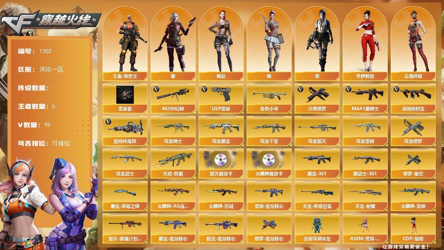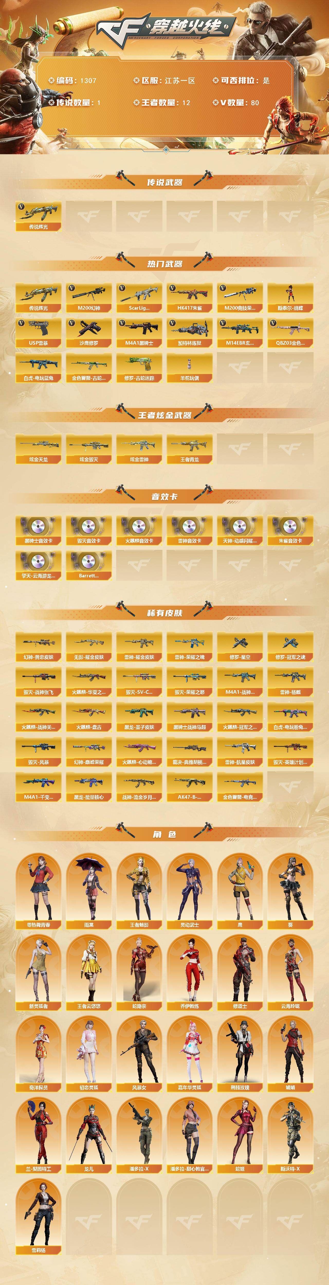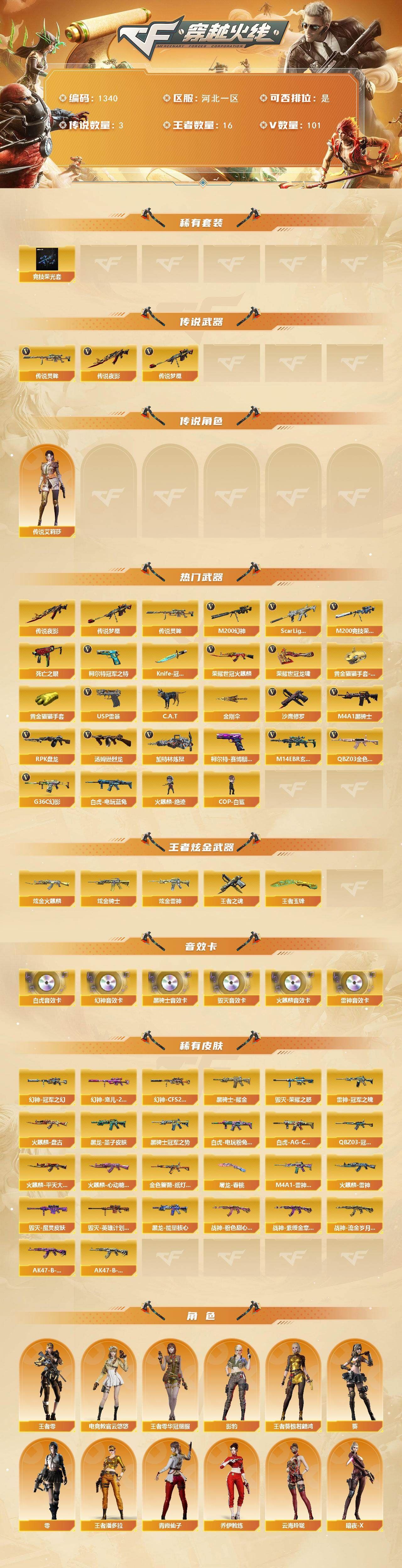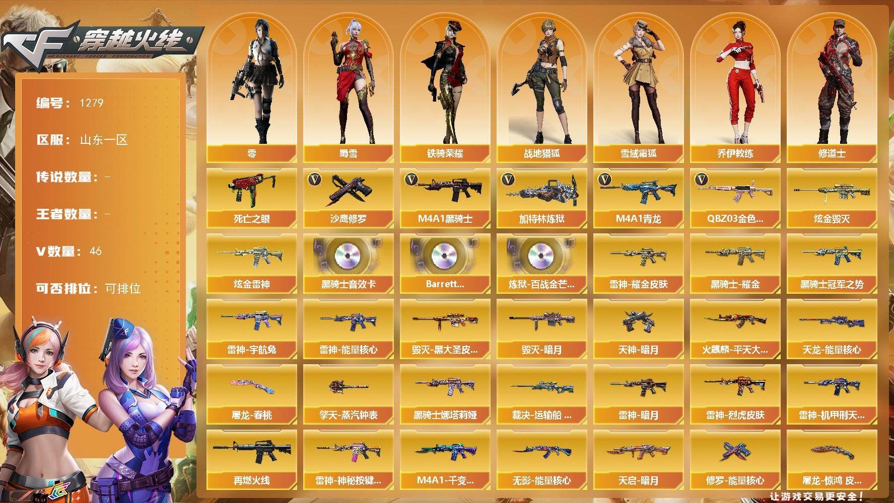 r50910 可二次 重庆一区 可排位【70V】【传说角色】:传说影煞【热门武器】:QBZ03-金色蔷薇,M14EBR-玄武,HK417-朱雀,M4A1-青龙,M200-幻神,金色蔷薇-古蛇迷踪,修罗-古蛇迷踪,QBZ03-街机,柯尔特-冠军之特,荣耀世冠-柯尔特,M4A1-黑骑士,加特林-炼狱,COP 357-幻灵,沙鹰-修罗,炽芒蝶刃【王者炫金武器】:王者雷影,王者星霆,雷霆王者之锋,王者岩刺【音效卡】:天神-动感闪耀 音效卡,擎天-云海游龙音效卡,AK47-火麒麟音效卡,QBZ03-金色蔷薇音效卡,HK417-朱雀音效卡【皮肤】:幻神-宠儿-2021MVP,M200-幻神-N9-2022MVP,QBZ03-AG-CFPLS19冠军,QBZ03-虎鱼 皮肤,裁决-羽掣 皮肤,雷神-暗月,雷神-荣耀之魄,雷神-维纳斯皮肤,雷神-源计划2.0专属 皮肤,雷神-化蛇 皮肤,火麒麟-雷神,火麒麟-冠军之心,火麒麟-百城,毁灭-暗月,毁灭-荣耀之怒,毁灭-航天科技皮肤,毁灭-百城浙江 皮肤,毁灭-虹光风暴 皮肤,毁灭-英雄计划 皮肤,黑骑士-破浪10年皮肤,屠龙-荣耀之锋*3,麒麟刺-斗鱼平台皮肤【角色】:战地猎狐,王者零-华冠丽服,王者春,王者影豹,王者潘多拉,蛇隐宗,奇洋探员,乔伊教练,修道士,云海玲珑,炽天使,空,暗夜-X,电竞少女,飞虎队-X,风暴女,嘉年华灵狐,娟娟,兰-空鹰,兰-梨园特工,灵狐-花神,灵狐者-X,灵狐者-黄金海岸,灵狐者-七夕宝贝,龙儿-小淘气,麻雀,曼陀罗-X,萌儿,潘多拉-X,潘多拉-甜心教官,青霞仙子,赛斯-X,蛇姬,斯沃特-X,蜀雪,铁骑荣耀,兔囡囡,维纳斯,雪莉杨-摸金校尉,夜玫瑰-宠粉,樱-战斗天使,影武者-X,幽,游珑儿【人偶武器】:迷你宝贝,AWM-灵狐-15周年嘉年华,迷你牛魔王,迷你波特博士,夺魂,迷你牛牛*2,迷你生化手雷*3,生化手雷-机甲核心,深渊终结者手雷【暴走生化】:超级对讲机【挑战大师】:激光毁灭者III-白马银枪*2,神圣爆裂者-末日III【英雄级武器】:AK47-火麒麟,M4A1-雷神*2,M4A1-黑骑士,AK12-天启,M4A1-青龙,HK417-朱雀,M14EBR-玄武,无影-神兵利器,黑武士-锦绣游龙,超新星-热带奇洋,金色蔷薇-古蛇迷踪,QBZ03-金色蔷薇,烈火-动感闪耀,王者之幻-觉醒版,黑骑士-海王,QBZ-03-王者蔷薇-觉醒版,王者芳薇-觉醒版,Barrett-毁灭,Barrett-极光,AWM-裁决,M200-幻神,加特林-炼狱,烈龙-云海游龙,沙鹰-修罗,沙鹰-天神,COP 357-雷霆王者-觉醒版,COP 357-幻灵,柯尔特-冠军之特,荣耀世冠-柯尔特,修罗-古蛇迷踪,屠龙*3,麒麟刺,擎天-竞技荣光,炽芒蝶刃,屠龙-动感闪耀,擎天-云海游龙,龙啸-热带奇洋,王者之锋-觉醒版,高爆手雷-幻灵,高爆手雷-竞技荣光*3,手雷-动感闪耀,高爆手雷-云龙,手雷-云海游龙,手雷-热带奇洋,高爆手雷-古蛇迷踪,闪光弹-竞技荣光*3,闪光弹-云龙*2,闪光弹-雷霆王者-觉醒版*3,烟雾弹-竞技荣光,烟雾弹-云龙,烟雾弹-古蛇迷踪,烟雾弹-雷霆王者-觉醒版,M4A1-赤狱骑士【道具】:云海游龙炫彩背包,亚洲杯纪念炫彩背包,全能枪王背包,冰冰企鹅背包,古蛇迷踪炫彩背包,奇洋探员-海龟背包,炫彩背包,热带奇洋炫彩背包,虎牙炫彩背包,超级背包,迷你冰龙背包,哔哩哔哩名片,女皇终结者-魔龙之吻,救世主-黑桃战神,绿色巨人,灵魂忍者*2,变异宝贝,迷雾幽灵*2,生化弹匣,夺命之镰,防化服*2,金色流光-枪王排位,巅峰赛先锋-金色流光,流光-鎏金之域,枪王排位28赛季金色流光,枪王排位29赛季金色流光,古蛇迷踪打击特效,蛇隐宗表情,热带奇洋表情,动感闪耀表情,云海游龙表情,EP战队击杀图标,防弹头盔*3,防弹衣*3,C4工具钳*2,手雷包*2【特殊枪械】:1黑骑士,1炼狱】各种道具详情看截图、低价出售找回包 赔、截图展示段位不代 表实际段位,如赛季更新等不可抗拒因素发生变化、时限道具不保证所剩时间、标题未写送点劵默认不送【卖号买号首选亿梦】