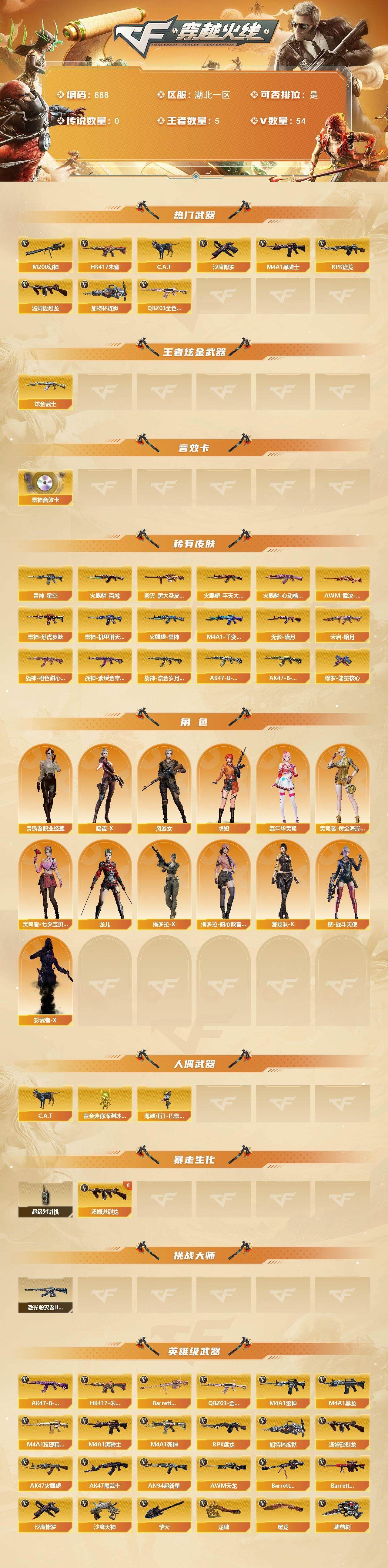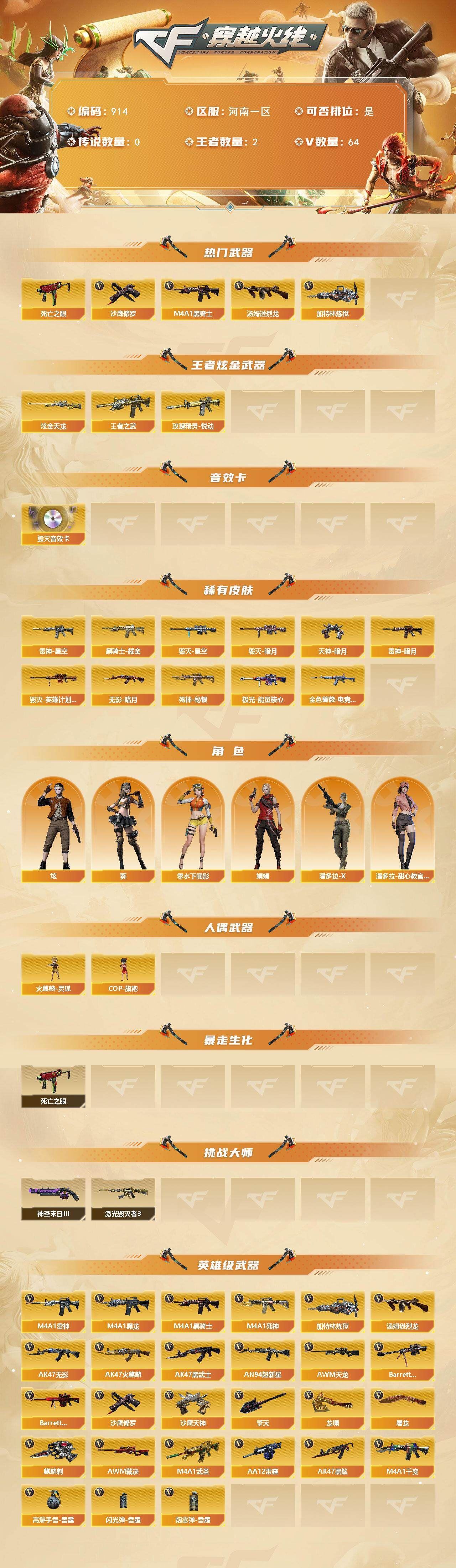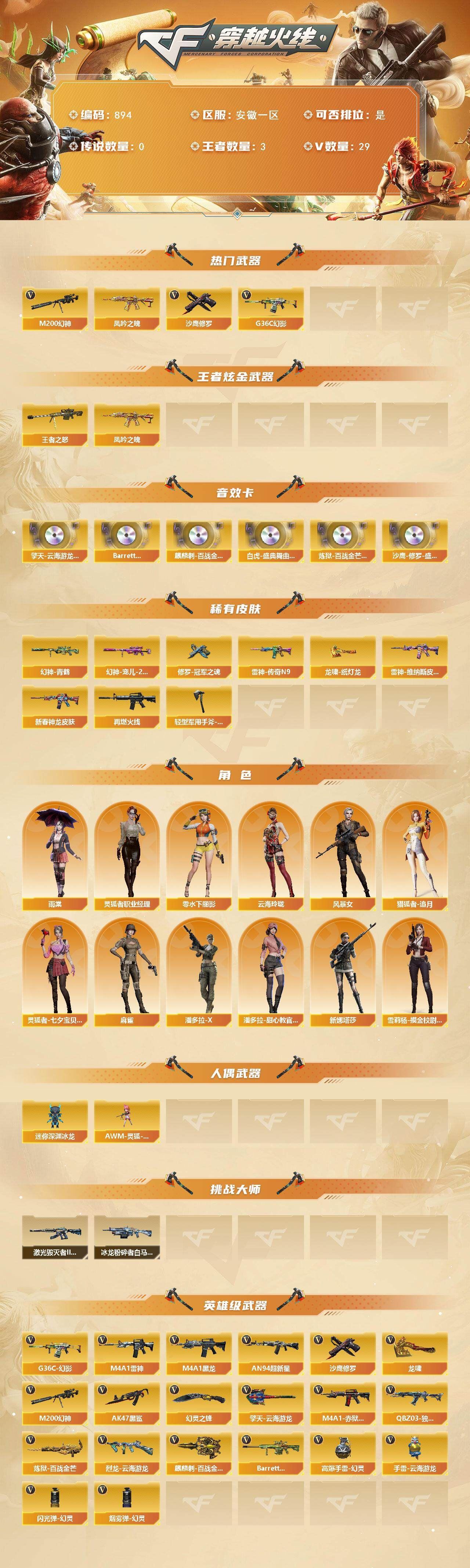 r49585 可二次山东一区-80V-9王者-1炫金【传说武器】:传说暗裔【传说角色】:传说星骇【热门武器】:传说暗裔,M200-幻神,死亡之眼,M4A1-黑骑士,加特林-炼狱*2,沙鹰-修罗*3【王者炫金武器】:王者凌虎,炫金火麒麟【音效卡】:M200-幻神音效卡,M4A1-雷神音效卡,Barrett-毁灭音效卡,AWM-裁决音效卡,炼狱-百战金芒-庆典舞曲音效卡【皮肤】:幻神-AG-CFPL S24冠军 皮肤,裁决-典雅胡桃 皮肤,雷神-暗月,雷神-星空,雷神-虎将,雷神-宇航兔皮肤,M4A1-再燃火线,火麒麟-巅峰荣耀,毁灭-暗月,毁灭耀金皮肤,M4A1-黑龙-361,AK47-黑武士-361,战神-粉色甜心皮肤,战神-紫绶金章皮肤*4,战神-流金岁月皮肤*3,天龙-能量核心,AWM-天龙-传奇白鲨,极光-能量核心,炼狱-星空,修罗-能量核心*3,天神-暗月,轻型军用手斧-再燃火线【角色】:零,魅影,电竞教官-云悠悠,王者-葵-貂蝉,云海玲珑,空,嘉年华灵狐,潘多拉-X,潜龙队-X,铁骑荣耀,新娜塔莎,影武者-X,职业选手【人偶武器】:王者COP-精英刀锋,AWM-灵狐-15周年嘉年华,迷你深渊冰龙*2,迷你裂空之翼*4,迷你牛牛*2,生化手雷-机甲核心,闪光弹-小乔【暴走生化】:死亡之眼【挑战大师】:神圣爆裂者III*2,冰龙粉碎者-白马银枪,VEPR-12-金魔,KAC-圣炎切割者III,阐释者III*2【英雄级武器】:AK47-火麒麟*3,M4A1-黑龙,M4A1-雷神*3,M4A1-黑骑士,AK47-黑武士,AK47-黑鲨,M4A1-龙血,M4A1-玫瑰精灵,王者之势-觉醒版,王者之幻-觉醒版,AK-47-猩红传说*5,AK47-B-战神,AWM-天龙,Barrett-毁灭,Barrett-极光,M200-幻神,Barrett-金色蔷薇,王者之怒-觉醒版,加特林-炼狱*2,炼狱-百战金芒,沙鹰-修罗*3,沙鹰-天神*3,柯尔特-电竞装甲,屠龙,龙啸*4,麒麟刺-堕天神,擎天*2,麒麟刺*3,擎天-竞技荣光*2,龙啸-堕天神,斩神刀-雷暴,麒麟刺-百战金芒,王者冰锋-觉醒版,高爆手雷-雷暴,高爆手雷-堕天神*2,高爆手雷-竞技荣光*2,高爆手雷-玄豹*2,闪光弹-雷暴,闪光弹-堕天神*2,闪光弹-竞技荣光*2,闪光弹-玄豹,烟雾弹-雷暴,烟雾弹-堕天神*2,烟雾弹-竞技荣光*2,M4A1-赤狱骑士【道具】:BS战队炫彩背包,战舰背包,炫彩背包,百战金芒炫彩背包,超级背包,绿色巨人,灵魂忍者*2,变异宝贝,妖姬,迷雾幽灵*2,夺命之镰,防化服*3,金色流光-枪王排位,语音特效-盛典烟火,萌萌小葵表情,CFPL选手表情-第1套,防弹头盔*6,防弹衣*6,C4工具钳*5,手雷包*4【特殊枪械】:1黑骑士,2炼狱各种道具详情看截图、低价出售找回包 赔、截图展示段位不代 表实际段位,如赛季更新等不可抗拒因素发生变化、时限道具不保证所剩时间、标题未写送点劵默认不送【卖号买号首选亿梦】