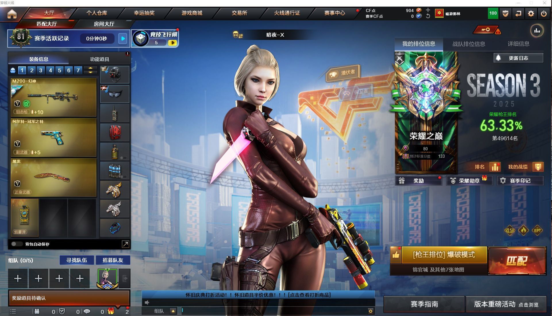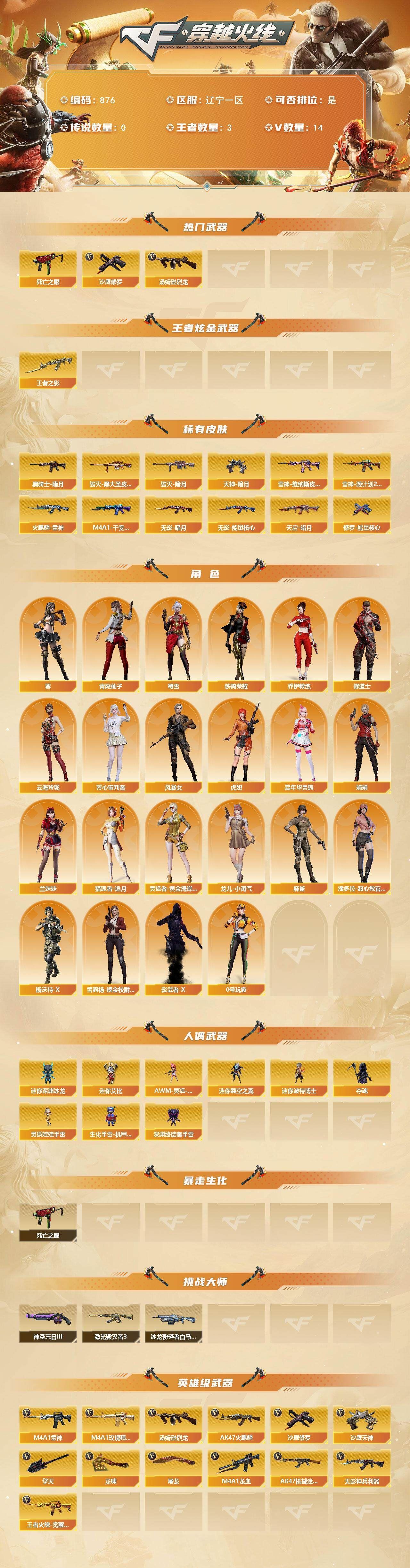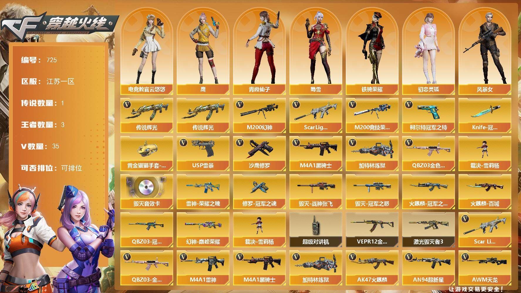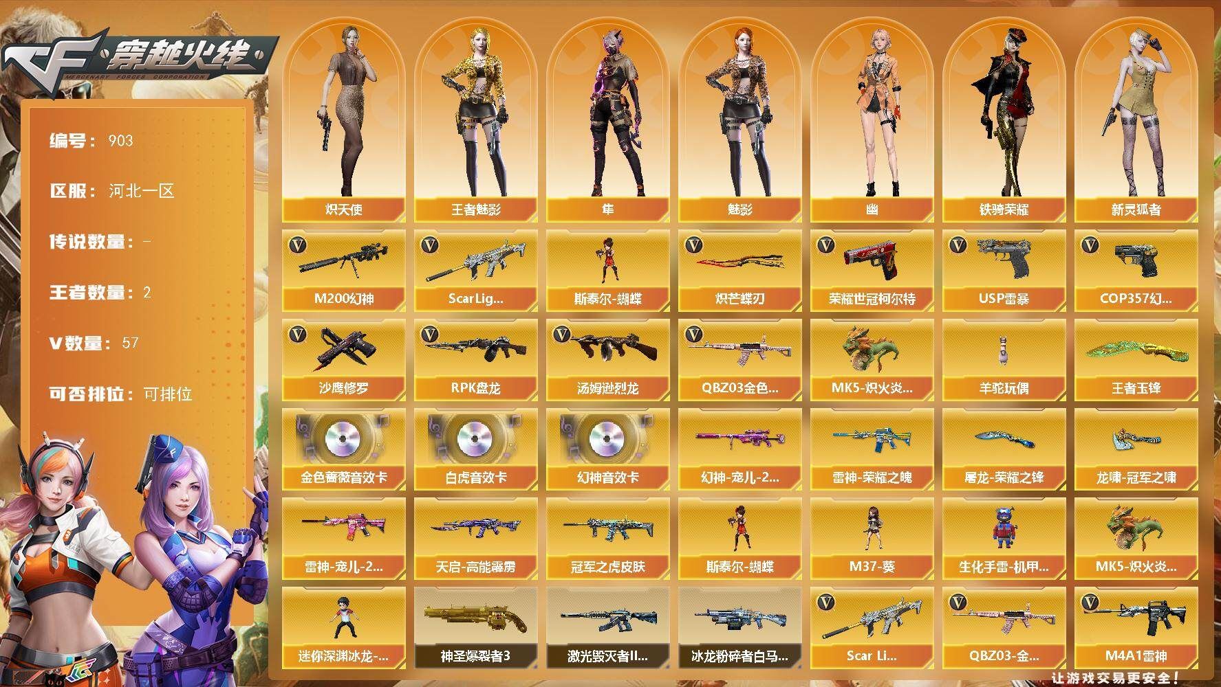 r49585 可二次山东一区-80V-9王者-1炫金【传说武器】:传说暗裔【传说角色】:传说星骇【热门武器】:传说暗裔,M200-幻神,死亡之眼,M4A1-黑骑士,加特林-炼狱*2,沙鹰-修罗*3【王者炫金武器】:王者凌虎,炫金火麒麟【音效卡】:M200-幻神音效卡,M4A1-雷神音效卡,Barrett-毁灭音效卡,AWM-裁决音效卡,炼狱-百战金芒-庆典舞曲音效卡【皮肤】:幻神-AG-CFPL S24冠军 皮肤,裁决-典雅胡桃 皮肤,雷神-暗月,雷神-星空,雷神-虎将,雷神-宇航兔皮肤,M4A1-再燃火线,火麒麟-巅峰荣耀,毁灭-暗月,毁灭耀金皮肤,M4A1-黑龙-361,AK47-黑武士-361,战神-粉色甜心皮肤,战神-紫绶金章皮肤*4,战神-流金岁月皮肤*3,天龙-能量核心,AWM-天龙-传奇白鲨,极光-能量核心,炼狱-星空,修罗-能量核心*3,天神-暗月,轻型军用手斧-再燃火线【角色】:零,魅影,电竞教官-云悠悠,王者-葵-貂蝉,云海玲珑,空,嘉年华灵狐,潘多拉-X,潜龙队-X,铁骑荣耀,新娜塔莎,影武者-X,职业选手【人偶武器】:王者COP-精英刀锋,AWM-灵狐-15周年嘉年华,迷你深渊冰龙*2,迷你裂空之翼*4,迷你牛牛*2,生化手雷-机甲核心,闪光弹-小乔【暴走生化】:死亡之眼【挑战大师】:神圣爆裂者III*2,冰龙粉碎者-白马银枪,VEPR-12-金魔,KAC-圣炎切割者III,阐释者III*2【英雄级武器】:AK47-火麒麟*3,M4A1-黑龙,M4A1-雷神*3,M4A1-黑骑士,AK47-黑武士,AK47-黑鲨,M4A1-龙血,M4A1-玫瑰精灵,王者之势-觉醒版,王者之幻-觉醒版,AK-47-猩红传说*5,AK47-B-战神,AWM-天龙,Barrett-毁灭,Barrett-极光,M200-幻神,Barrett-金色蔷薇,王者之怒-觉醒版,加特林-炼狱*2,炼狱-百战金芒,沙鹰-修罗*3,沙鹰-天神*3,柯尔特-电竞装甲,屠龙,龙啸*4,麒麟刺-堕天神,擎天*2,麒麟刺*3,擎天-竞技荣光*2,龙啸-堕天神,斩神刀-雷暴,麒麟刺-百战金芒,王者冰锋-觉醒版,高爆手雷-雷暴,高爆手雷-堕天神*2,高爆手雷-竞技荣光*2,高爆手雷-玄豹*2,闪光弹-雷暴,闪光弹-堕天神*2,闪光弹-竞技荣光*2,闪光弹-玄豹,烟雾弹-雷暴,烟雾弹-堕天神*2,烟雾弹-竞技荣光*2,M4A1-赤狱骑士【道具】:BS战队炫彩背包,战舰背包,炫彩背包,百战金芒炫彩背包,超级背包,绿色巨人,灵魂忍者*2,变异宝贝,妖姬,迷雾幽灵*2,夺命之镰,防化服*3,金色流光-枪王排位,语音特效-盛典烟火,萌萌小葵表情,CFPL选手表情-第1套,防弹头盔*6,防弹衣*6,C4工具钳*5,手雷包*4【特殊枪械】:1黑骑士,2炼狱各种道具详情看截图、低价出售找回包 赔、截图展示段位不代 表实际段位,如赛季更新等不可抗拒因素发生变化、时限道具不保证所剩时间、标题未写送点劵默认不送【卖号买号首选亿梦】