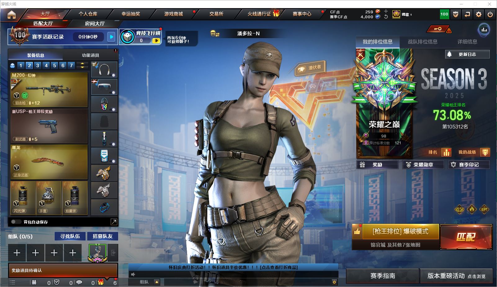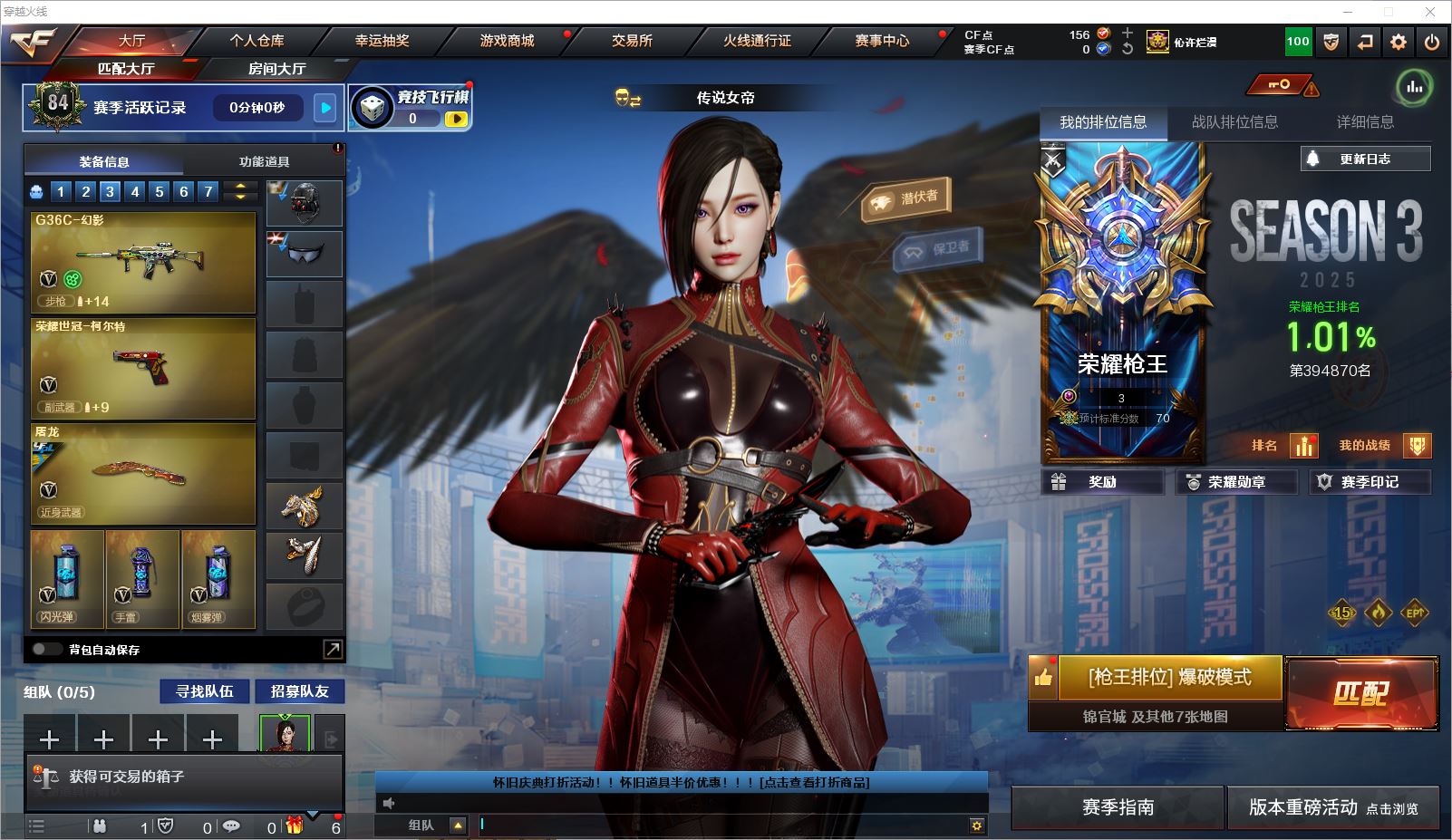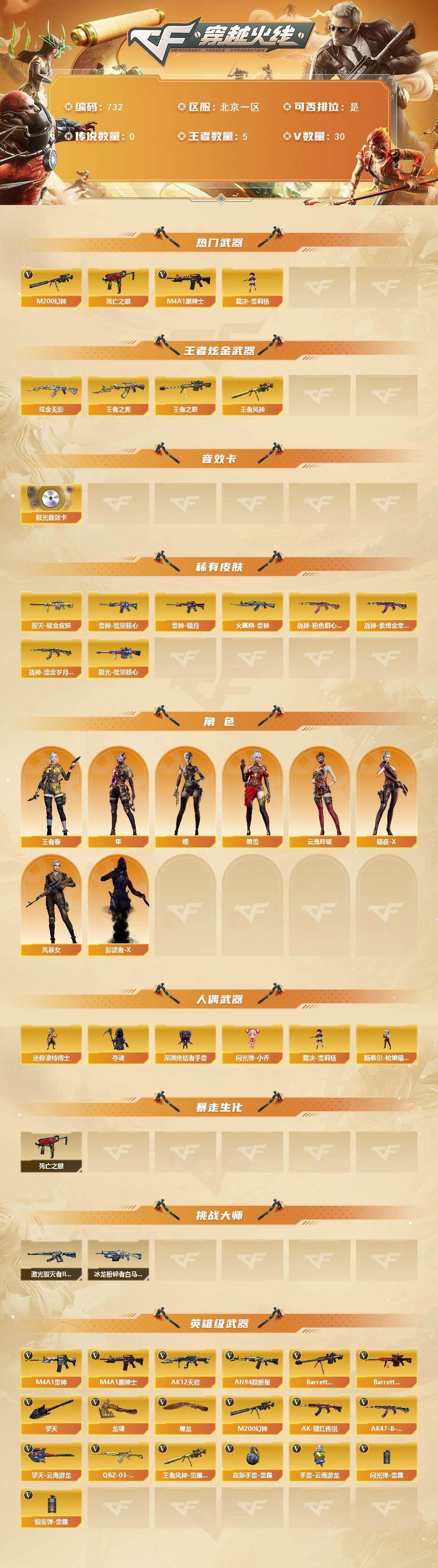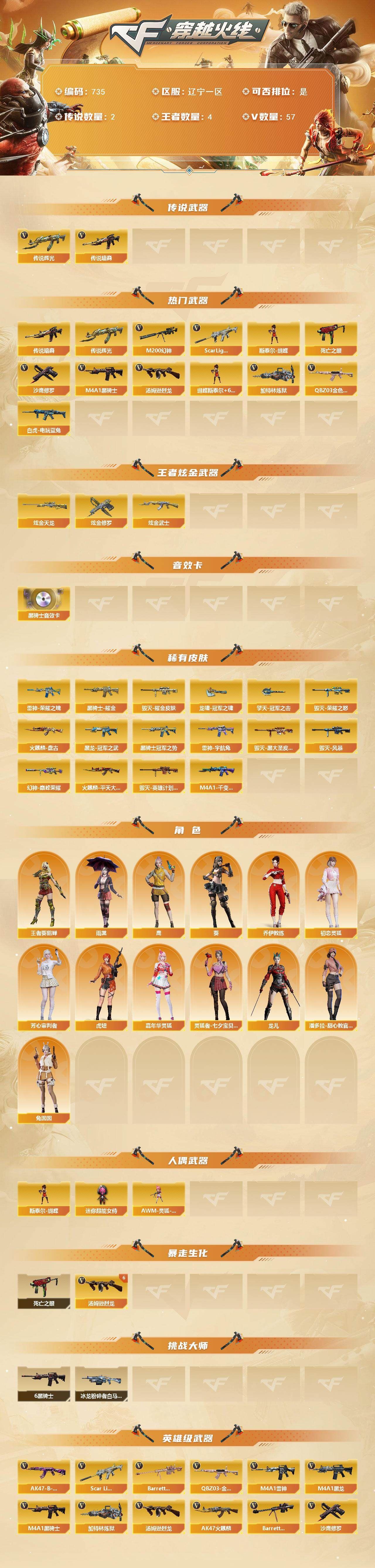 r49174 可二次辽宁一区-57V-4王者-3炫金【传说武器】:传说暗裔,传说辉光【热门武器】:传说暗裔,传说辉光,QBZ03-金色蔷薇,Scar Light-白虎,M200-幻神,死亡之眼,白虎-电玩蓝兔,M4A1-黑骑士*6,汤姆逊-烈龙*6,加特林-炼狱*3,斯泰尔-蝴蝶,沙鹰-修罗*6【王者炫金武器】:炫金武士,炫金天龙,炫金修罗【音效卡】:M4A1-黑骑士音效卡【皮肤】:幻神-巅峰荣耀,雷神-荣耀之魄,雷神-宇航兔皮肤,火麒麟-平天大圣,火麒麟-盘古,毁灭-荣耀之怒,毁灭耀金皮肤,毁灭-黑大圣皮肤,毁灭-风暴,毁灭-英雄计划 皮肤,M4A1-千变-孔明皮肤,黑龙-冠军之武,黑骑士耀金皮肤,黑骑士-冠军之势,龙啸-冠军之啸,擎天-冠军之击【角色】:葵,雨棠,鹰,王者-葵-貂蝉,乔伊教练,初恋灵狐,芳心审判者,虎妞,嘉年华灵狐,灵狐者-七夕宝贝,龙儿,潘多拉-甜心教官,兔囡囡【人偶武器】:斯泰尔-蝴蝶,AWM-灵狐-15周年嘉年华,迷你超能女侍【暴走生化】:死亡之眼【挑战大师】:冰龙粉碎者-白马银枪【英雄级武器】:AK47-火麒麟,M4A1-黑龙,M4A1-雷神,M4A1-黑骑士*6,Scar Light-白虎,QBZ03-金色蔷薇,王者之幻-觉醒版,AK-47-猩红传说*3,AK47-B-常胜将军,王者龙血-觉醒版,白虎-电玩蓝兔,Barrett-毁灭,M200-幻神,Barrett-朱雀,Barrett-金色蔷薇,王者星神-觉醒版,王者森决-觉醒版,加特林-炼狱*3,汤姆逊-烈龙*6,沙鹰-修罗*6,沙鹰-天神*2,柯尔特-电竞装甲,屠龙,龙啸*2,擎天*4,麒麟刺*3,M4A1-赤狱骑士【道具】:救世主-黑桃战神,绿色巨人,灵魂忍者,迷雾幽灵,夺命之镰,防化服*2,金色流光-枪王排位*2,星辰流光-枪王排位,枪王排位28赛季金色流光,枪王排位29赛季金色流光,电玩兔兔表情,防弹头盔*2,防弹衣*2,C4工具钳*2,手雷包*2【特殊枪械】:蝴蝶斯泰尔+6烈龙,1白虎,6黑骑士,6烈龙,3炼狱,1蝴蝶斯泰尔各种道具详情看截图、低价出售找回包 赔、截图展示段位不代 表实际段位,如赛季更新等不可抗拒因素发生变化、时限道具不保证所剩时间、标题未写送点劵默认不送【卖号买号首选亿梦】