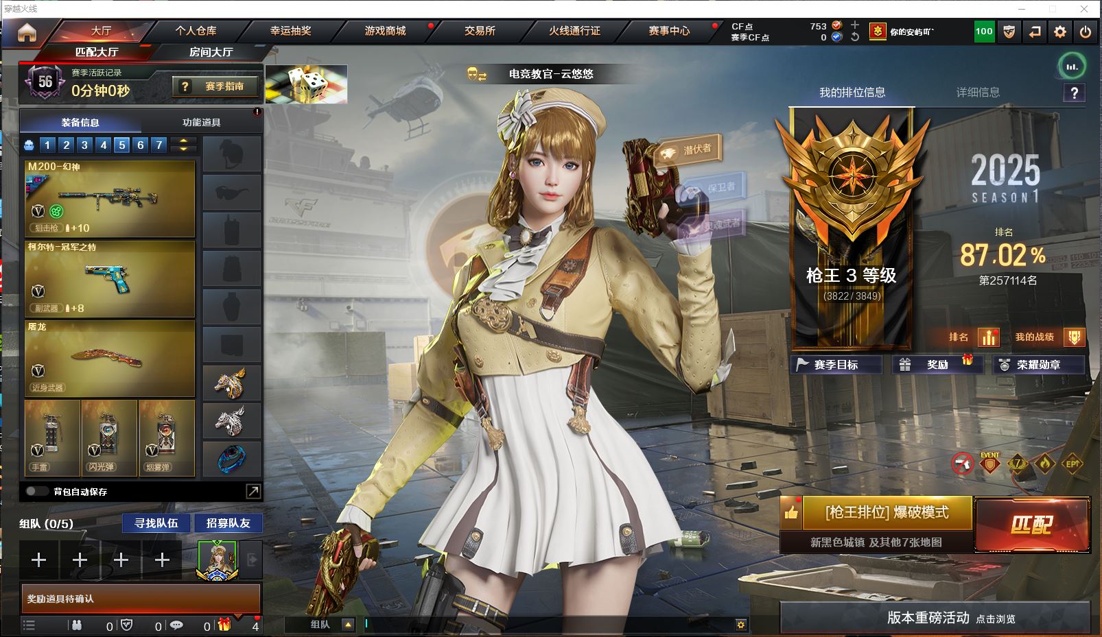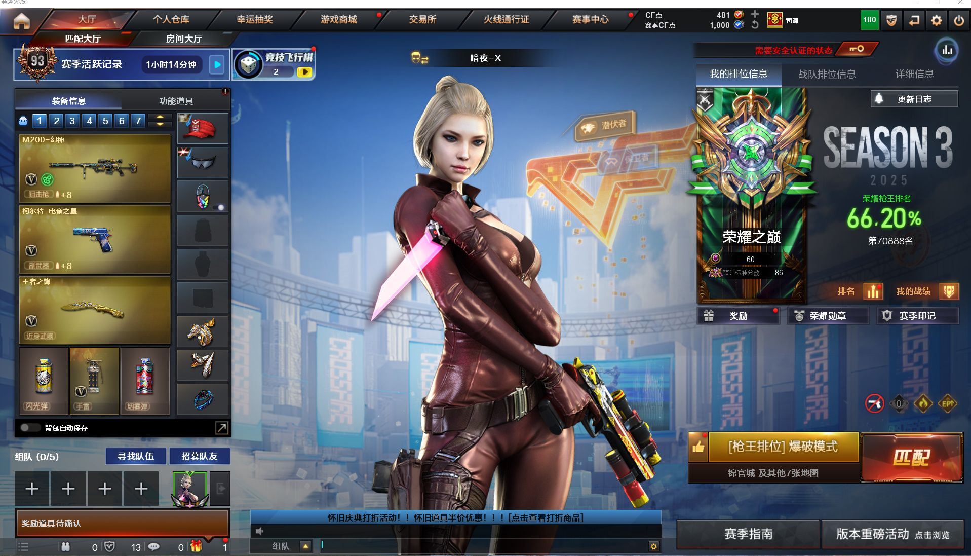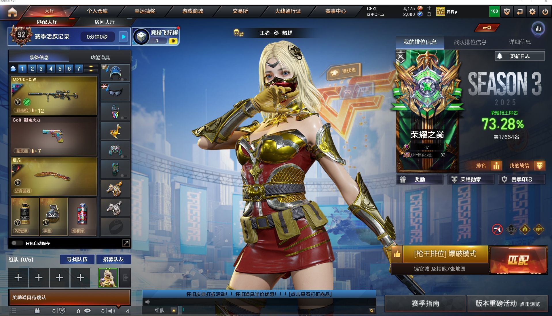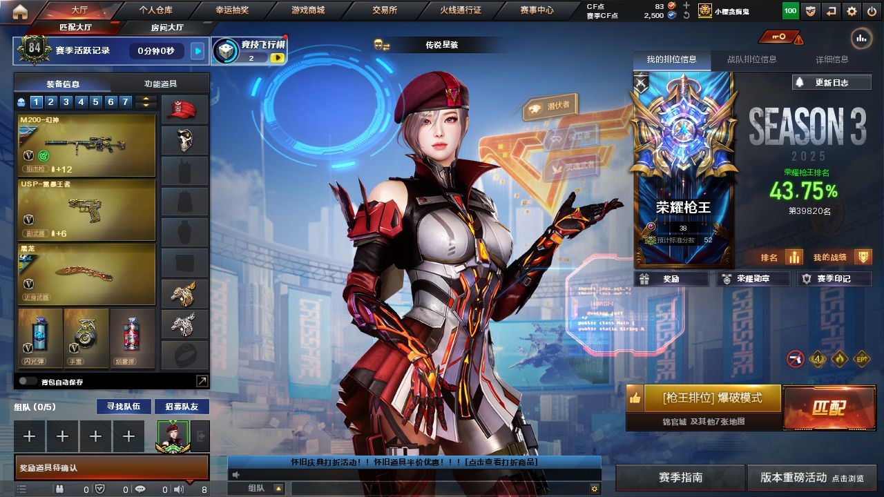 明哥152北部-山东一区-极品爆破号【可排位】【可二次实名】【64V/1传说】【传说暗裔】【鹰】【竞技荣光套/神工天巧套】【M200-幻神/M200-幻神音效卡/M200-幻神-荣耀世冠白鲨/幻神-CFS2022/幻神-丹凤/M200-幻神-黄忠皮肤/幻神-动感闪耀 皮肤】【M200-竞技荣光】【王者星神】【柯尔特-冠军之特/柯尔特-竞技荣光*2/USP-神工天巧*3】【Scar Light-白虎/Scar Light-白虎音效卡/白虎-大汉风骨】【QBZ03-金色蔷薇】【M4A1-雷神/雷神-机甲刑天皮肤/雷神-宇航兔皮肤/雷神-烈虎皮肤/雷神-暗月/雷神-虎将】【雷霆之契】【Barrett-毁灭/毁灭耀金皮肤】【AK47-火麒麟/火麒麟-巅峰荣耀/火麒麟-百城/火麒麟-大唐荣光/火麒麟-轻羽皮肤/火麒麟-华夏之心/火麒麟-战神关羽/火麒麟-平天大圣】【M4A1-黑骑士/M4A1-黑骑士音效卡/黑骑士-战神马超/黑骑士-地狱火】【HK417-朱雀】【无影-神兵利器】【Barrett-极光】【加特林-炼狱】【沙鹰-修罗*3】【沙鹰-天神/天神-动感闪耀】【擎天-竞技荣光*2】【屠龙*2/屠龙-动感闪耀/屠龙-秘银】【龙啸】【电竞教官-云悠悠/职业选手/王者凌霄/王者零-华冠丽服/魅影/龙儿/龙儿-小淘气/葵-赛博朋克/乔伊教练/修道士/麻雀/灵狐者-黄金海岸/蜀雪/娟娟/潘多拉-X/斯沃特-X/救世主-X/影武者-X/新娜塔莎/幻影/复仇者】【M4A1-神工天巧】【白虎-电玩蓝兔/AK-47-猩红传说】【超新星-悦享】【Colt 1911-大黄蜂/COP 357-青龙/新USP-枪王排位奖励*3】【金刚伞/金刚伞-电玩红兔/唐刀-神工天巧】【神圣爆裂者-末日III/冰龙粉碎者-白马银枪*3】【猫猫手套/M4A1-雷神-精英刀锋/COP-白鲨/夺魂】【王者云击/王者之心/王者之势/王者冰魄/王者火魄/王者之锋】【高爆手雷-竞技荣光*4/闪光弹-竞技荣光*7/烟雾弹-竞技荣光*5】【高爆手雷-神工天巧*3/闪光弹-神工天巧*3/烟雾弹-神工天巧*3】【炫金无影/炫金雷神/炫金天龙】【烟雾保护头盔/闪光护目镜/超级背包/炫彩背包/防弹头盔/防弹衣/C4工具钳/手雷包/防化服】多亮点详情请看图