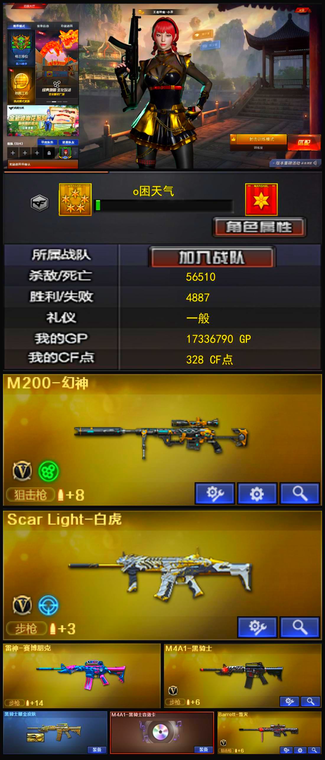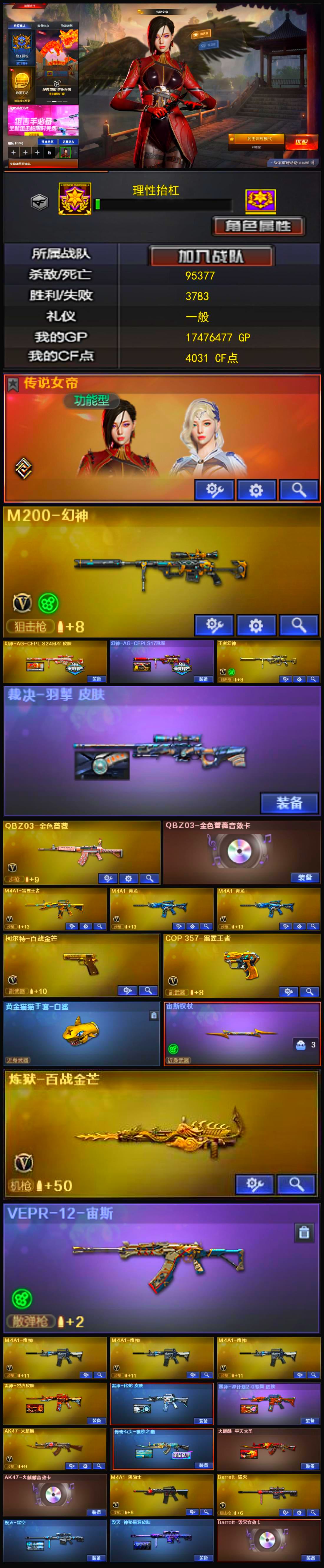 4防王者魅影4防王者小乔+幻神+白虎+耀金黑骑士音效卡+精品基础v+金色蔷薇吕布 【可否排位】可排位 【账号状态】无封号 【区服】福建一区 【VIP】 【游戏段位】大师1 【游戏等级】Lv.100 元帅 【段位排名】586717 【CF点】328 【VVIP数量】20 【重要套装】 【重要角色】王者-魅影/王者玲珑-小乔/修道士 【传说武器】 【英雄武器】_M200-幻神/Barrett-毁灭/Barrett-暗月传说/雷神-葫芦兄弟/M4A1-黑骑士/黑骑士-海王(2)/_Scar Light-白虎/无影-神兵利器/AK-47-猩红传说/AK47-B-身先士卒/AK47-B-常胜将军/AK47-B-战士/沙鹰-天神/龙啸/王者之击-觉醒版/王者之锋-觉醒版/高爆手雷-幻灵/M200-玄龙/屠龙-斗烈龙驹 【王者武器】玫瑰精灵-悦动 【小人枪】牛牛-AK47/迷你深渊冰龙/魔能飞环-曼陀罗 【其他重要武器】黑骑士-摸金校尉/冰龙粉碎者-白马银枪/激光毁灭者III/M4A1-秘银赤龙/M4A1-S-火种/M4A1-樱落/AK47-大帝林肯/AN94-青花瓷/M4A1枪王排位II(2)/AK-47-二次元(4)/AK47-朋克/AK-12-CFS2017纪念版/AK47-娜塔莎(2)/AK47-齐天大圣/M4A1-圣诞2021/QBZ03-吕布/M4A1-SS-枪王排位/AK47-QT/G3A3-SS-枪王排位/AK47-轮回/AK47-圣诞节[2019]/M14EBR-CFS 2020/AK-103-红色悦动/AK47-青龙/HK417-红龙/雷神-赛博朋克/黄金AK-47/M4A1-Guitar 炫彩/AK47-B-十周年/AWM-万圣节刀锋(2)/M200-落樱/百城AWM/AWM-A枪王排位II(2)/黄金AWM/FN弩炮-CFS2017纪念版/M200 CheyTac-大圣/98K-蓝色骑士(2)/M200-枪王排位/M200-大黄蜂/AWM-恶棍-枪王排位(2)/Barrett-牛魔王/AWM-红色悦动/暗金M200/AWM-枪娘/Barrett-耀龙/AWM-T/AWM-S/AWM-Pink/AWM-A/凤凰之力/P90-炫彩/斯泰尔-CFS2017纪念版/雷蛇冲锋枪/神圣爆裂者-末日III/神圣爆裂者III-蛇姬/SPAS-12-雷电核心(2)/沙鹰-枪王排位/Cop357-萌杀/新USP-枪王排位奖励/沙鹰-万圣节2018/COP-青帝/MAC-10-涂鸦(2)/柯尔特-百城/愤怒公牛左轮-枪王排位/COP357-朋克/COP 357-青龙/幻影沙鹰-枪王排位(2)/Anaconda-黑金神龙/USP-黑大圣/COP-金蝉子-枪王排位/新USP-怒火大圣/沙鹰-能量核心/修罗-摸金校尉/COP 357--绚樱/Anaconda-炽焰核心/Cop357-赤龙/雷神之怒-机甲核心/丛林匕首-枪王排位/幻影双斧-枪王排位(2)/虹光丛林匕首-枪王排位/斩魔刀-怒火大圣/鹰爪-枪王排位/军用铁锹-赤龙/斩神刀-御龙/尼泊尔军刀-9周年/闪光弹-枪王排位(8)/胜利奖杯闪光弹-枪王排位/胜利奖杯烟雾弹-枪王排位(3)/高爆手雷-大乔/闪光弹-貂蝉/惨叫鸡高爆手雷/强化版迅捷虫手雷(2)/手雷-能量核心/红色诅咒娃娃手雷(2)/胜利奖杯手雷-枪王排位 【重要武器皮肤】AK47-B-常胜将军-孙权/AK47-B-常胜将军-曹操/黑骑士耀金皮肤/战神-流金岁月皮肤/战神-紫绶金章皮肤/战神-粉色甜心皮肤 【重要光效】AK47-黑武士紫色光效/M4A1-黑骑士绿色光效/AN94-超新星蓝色光效/AWM-天龙蓝色光效/沙鹰-修罗蓝色光效/沙鹰-天神紫橙光效/龙啸蓝色光效 【重要音效卡】M4A1-黑骑士音效卡 【重要戒指】龙眼(死神)/龙眼(鹰)/17赛季纪念戒指-耀银/18赛季纪念戒指-耀银/20赛季纪念戒指-耀金/21赛季纪念戒指-耀银(拇指)/21赛季纪念戒指-耀银(食指)/22赛季纪念戒指-耀铜(食指)/22赛季纪念戒指-耀银(拇指)/23赛季纪念戒指-耀银(拇指)/24赛季纪念戒指-耀银(拇指)/25赛季纪念戒指-耀铜(拇指) 【拥有重要玩偶】