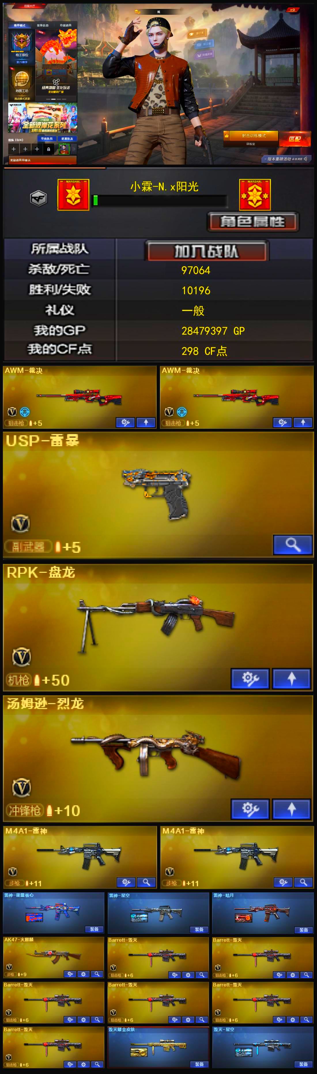 背摔角色炫+裁决+USP雷暴+烈龙+盘龙+精品基础v【67v】 【可否排位】可排位 【账号状态】无封号 【区服】安徽一区 【VIP】 【游戏等级】Lv.100 高阶大元帅 【段位排名】未上榜 【CF点】298 【VVIP数量】67 【重要套装】 【重要角色】_葵/_炫/灵狐者-黄金海岸 【传说武器】 【英雄武器】Barrett-毁灭(6)/barrett-金色蔷薇/王者之怒-觉醒版/AWM-天龙/AWM-裁决(2)/M4A1-雷神(2)/M4A1-死神/M4A1-千变/M4A1-武圣/M4A1-玫瑰精灵/AK47-火麒麟/AK47-无影/AK47-黑鲨/AK47-黑武士/AK-47-猩红传说(7)/AK47-B-战士/AN94-超新星/RPK-盘龙/汤姆逊-烈龙/沙鹰-天神/沙鹰-修罗(3)/USP-雷暴/麒麟刺/龙啸/擎天/屠龙(2)/雷霆之锋/斩神刀-雷暴/高爆手雷-雷暴(3)/高爆手雷-雷霆(4)/烟雾弹-雷暴(3)/烟雾弹-雷霆(4)/闪光弹-雷暴(3)/闪光弹-雷霆(4) 【王者武器】超新星-悦享 【小人枪】COP-旗袍/魔能飞环-曼陀罗 【其他重要武器】炫金武士/炫金黑龙/炫金天龙/炫金修罗/M4A1-英雄-能量核心/激光毁灭者III/M4A1-秘银赤龙(4)/M4A1-紫狱(2)/黄金AK-47(3)/AK47-绚樱/M4A1-PINK(2)/AK47-十年火线(2)/M4A1-情人节2019/QBZ03-烛龙/AK47-烛龙/M4A1C-死亡之翼/M4A1-十年火线/M4A1-破空冰刃/M4A1-战龙/M4A1-青龙./M4A1-樱落/M4A1-XS-翔龙(2)/M4A1-肯德基/AK47-SS-9周年/M4A1-XS-赤龙/M200-情人节2019/巨龙咆哮Ⅲ/KAC-小动物/KAC-赤烛/雷蛇冲锋枪(2)/斯泰尔-巧克力(2)/神圣爆裂者III/SPAS-12-雷电核心/阐释者III/COP 357-平天大圣(2)/新USP-枪王排位奖励(4)/沙鹰-枪王排位(3)/愤怒公牛左轮-枪王排位(2)/MAC-10-涂鸦(2)/COP 357--绚樱(2)/沙鹰-青龙(2)/Anaconda-黑金神龙/Anaconda-炽焰核心/Anaconda-雷电核心/沙鹰-雷蛇/凤凰之灵(2)/凤凰之火(2)/招财猫-枪王排位/蝴蝶刀-枪王排位/鹰爪-枪王排位/丛林匕首-卧龙(3)/军用铁锹-飞龙在天/军用铁锹-赤龙(2)/丛林匕首-枪王排位/闪光弹-枪王排位(4)/惨叫鸡高爆手雷(2)/强化版迅捷虫手雷/胜利奖杯闪光弹-枪王排位/迷你生化手雷/红色诅咒娃娃手雷 【重要武器皮肤】毁灭-星空/毁灭耀金皮肤/天龙-秘银/天龙-能量核心/无影-能量核心/雷神-暗月/雷神-能量核心/雷神-星空/死神-秘银/战神-流金岁月皮肤/战神-紫绶金章皮肤/战神-粉色甜心皮肤/修罗-能量核心 【重要光效】王者之怒金色光效/AK47-火麒麟蓝色光效/AK47-无影蓝粉色光效/AK47-黑武士蓝色光效/M4A1-雷神金色光效/M4A1-死神蓝粉色光效/M4A1-死神蓝色光效/M4A1-千变蓝粉色光效/巴雷特-毁灭蓝色光效/AWM-天龙蓝色光效/沙鹰-修罗蓝色光效/沙鹰-天神蓝粉色光效/RPK-盘龙蓝色光效/汤姆逊-烈龙红绿色光效/汤姆逊-烈龙蓝色光效/屠龙蓝色光效/擎天蓝色光效/麒麟刺蓝粉色光效/麒麟刺蓝色光效 【重要音效卡】 【重要戒指】8周年戒2/龙眼(死神)/龙眼(鹰)/金蛇戒/银蛇戒/16赛季纪念戒指-枪王耀银/17赛季纪念戒指-耀金/18赛季纪念戒指-耀金/22赛季纪念戒指-耀银(拇指)/23赛季纪念戒指-耀银(拇指)/24赛季纪念戒指-耀银(拇指)/25赛季纪念戒指-耀铜(拇指) 【拥有重要玩偶】黄金幸运猪猪玩偶