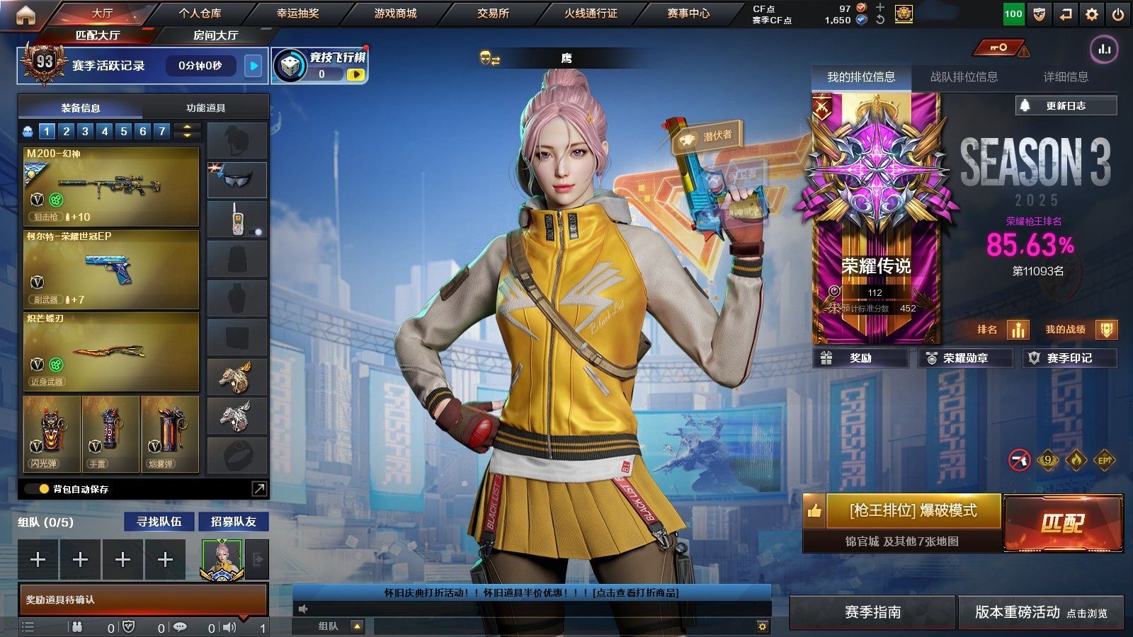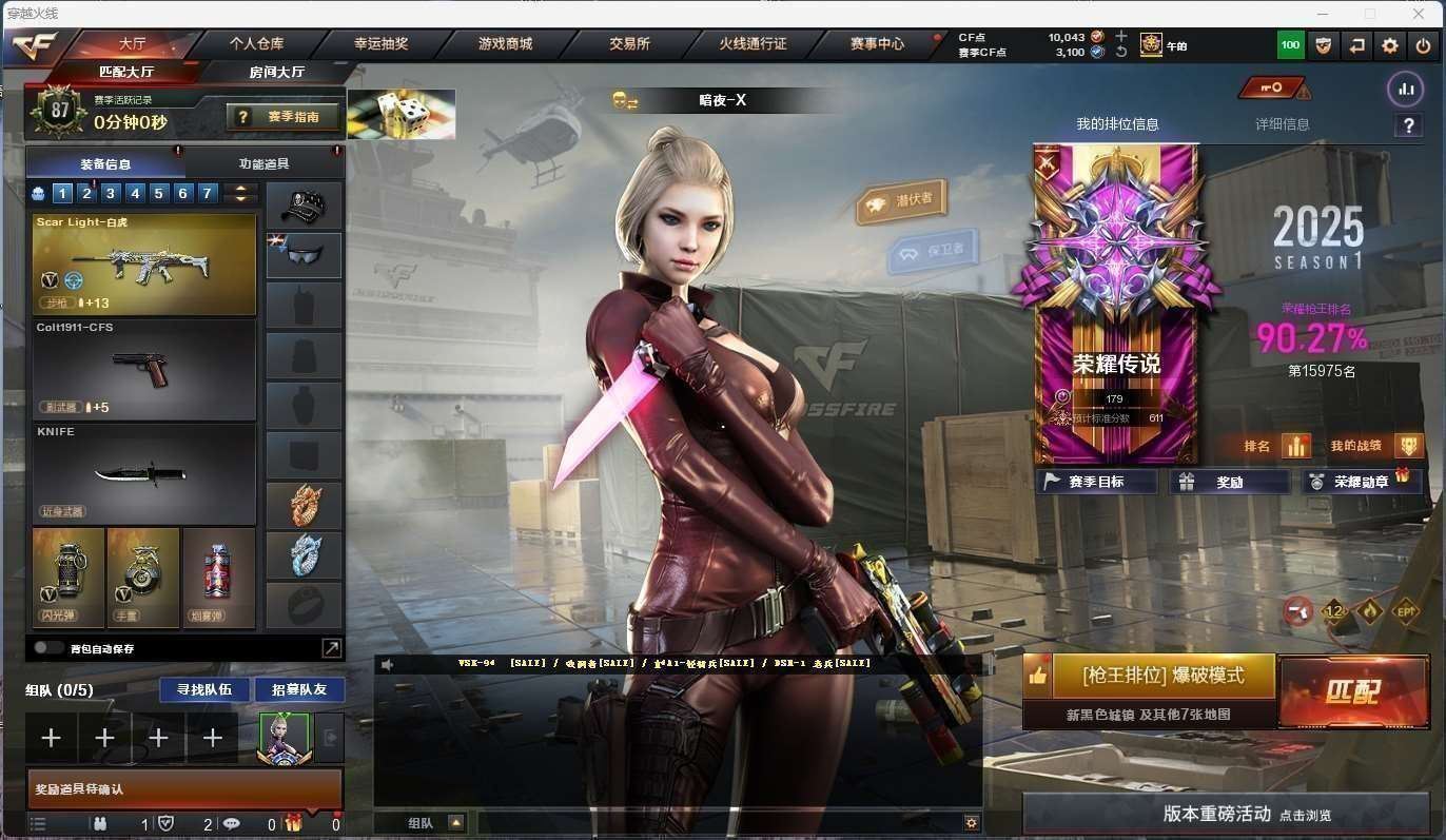 【英雄级武器】:AK47-火麒麟,M4A1-黑龙,M4A1-雷神,M4A1-黑骑士,M4A1-死神,M4A1-武圣,AK47-黑鲨,M4A1-青龙,HK417-朱雀,Scar Light-白虎,M14EBR-玄武,QBZ03-金色蔷薇,AK-47-猩红传说,AK47-B-战神,王者之鲨-觉醒版,王者炎心-觉醒版,AK47-B-常胜将军,白虎-电玩蓝兔,Barrett-毁灭,AWM-裁决,M200-幻神,M200-竞技荣光,汤姆逊-烈龙*6,Glock18-武圣,屠龙,龙啸,麒麟刺,擎天-竞技荣光,屠龙-斗烈龙驹,高爆手雷-竞技荣光,闪光弹-竞技荣光*2,闪光弹-雷霆王者-觉醒版,烟雾弹-竞技荣光