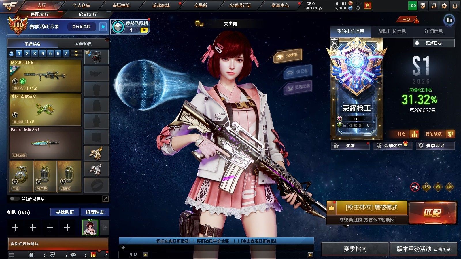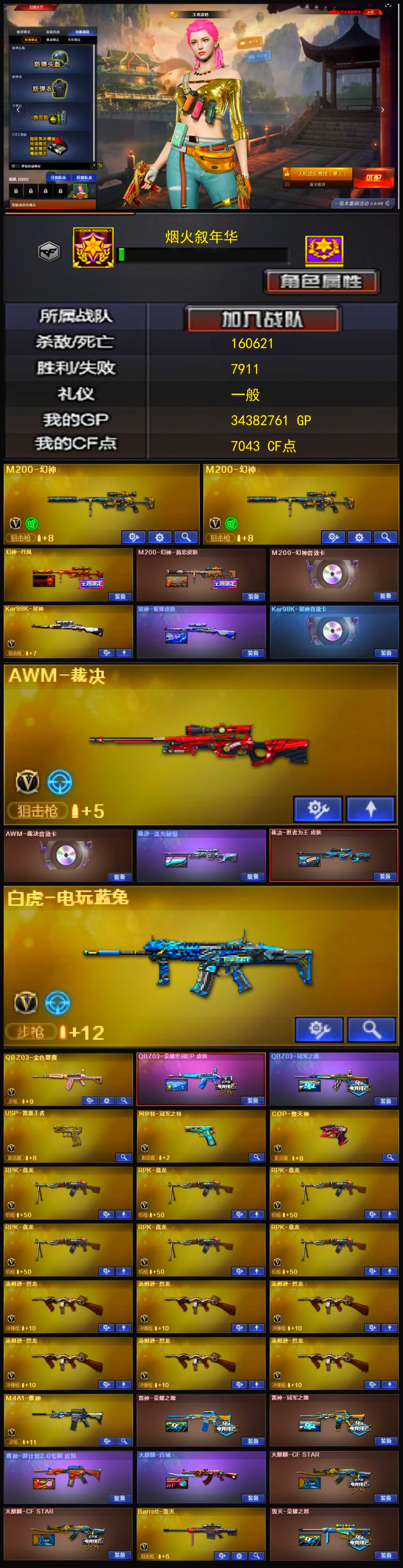 【其他武器】:源·火麒麟,御·黑龙-龙太子,源·雷神,魂·雷神-神秘按键,魂·雷神-新春神龙,源·机械迷城,M4A1-青龙-掌上穿越火线,源·天龙,魂·裁决-凤灵,魂·裁决-神秘按键,魂·Barrett-朱雀-锦鲤,魂·炼狱-蒸汽钟表,魂·修罗-迷彩,魂·天神-宇航兔兔,源·擎天-萌杀*2,魂·龙啸-秦师