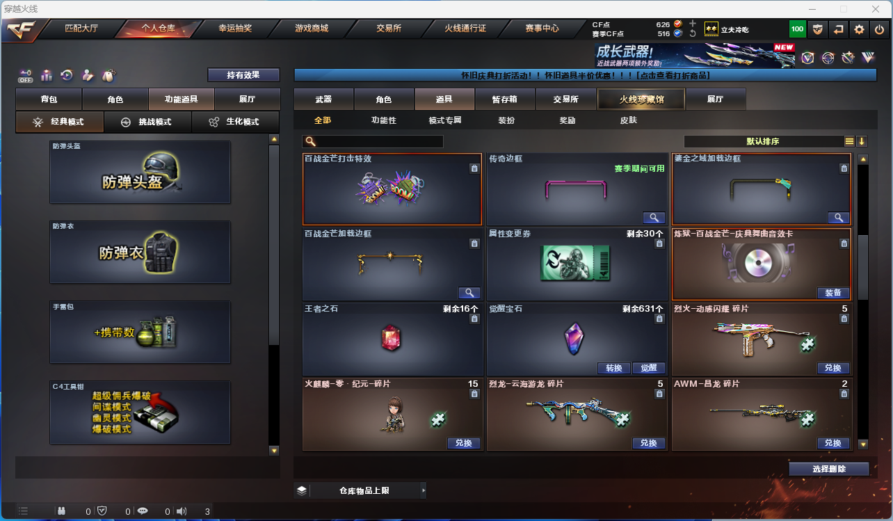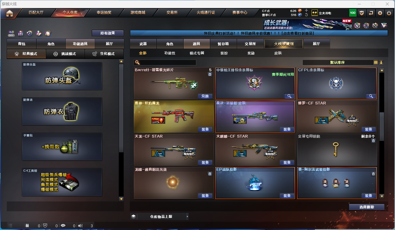 英雄武器数:18 | 王者武器数:1 | 炫金武器数:1 | 会员等级:2 | 排位赛:可排位赛 | cf04440vip2 18v,1王者,1炫金 【传说星骇】【3烈龙异变清道夫-蛇影双骄】【awm-裁决裁决-运输船 皮肤】【m4a1-雷神】【擎天丛林-玄豹】【炼狱-百战金芒炼狱音效卡】【麒麟刺-百战金芒】【玄豹雷套】【火麒麟-零·纪元/魔能飞环-曼陀罗】【炫金天龙】【葵-阿尔法武装/云海玲珑 】【天龙-cfstar/火麒麟-cfstar/雷神-炽焰魔龙/修罗-cfsta】/永久ac 工具钳 手雷包各道具详情截图、低价出售找回包赔【买号卖号首选三乐】