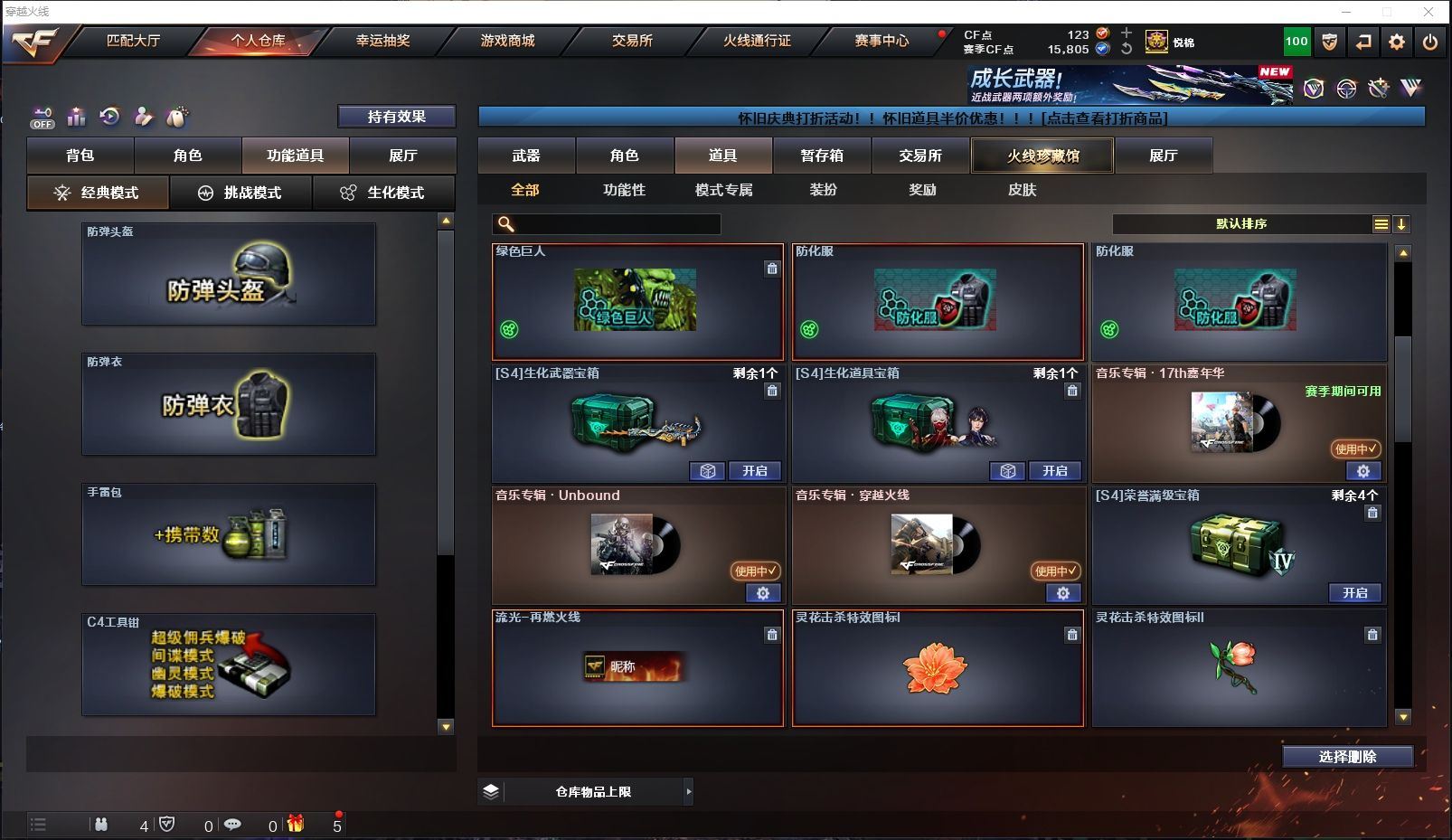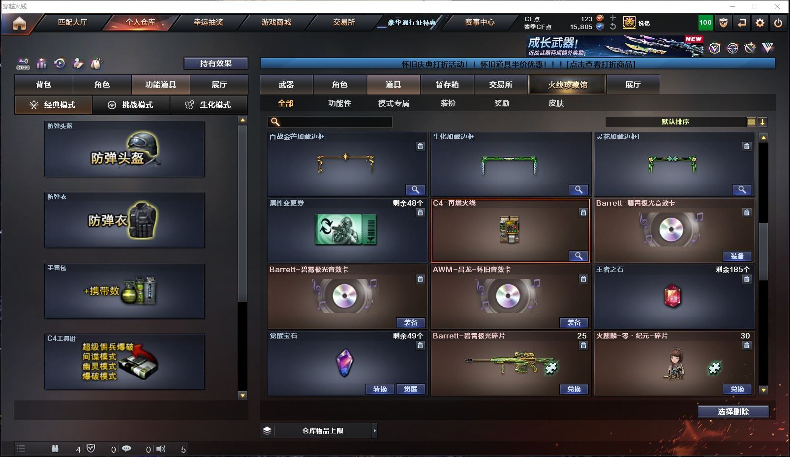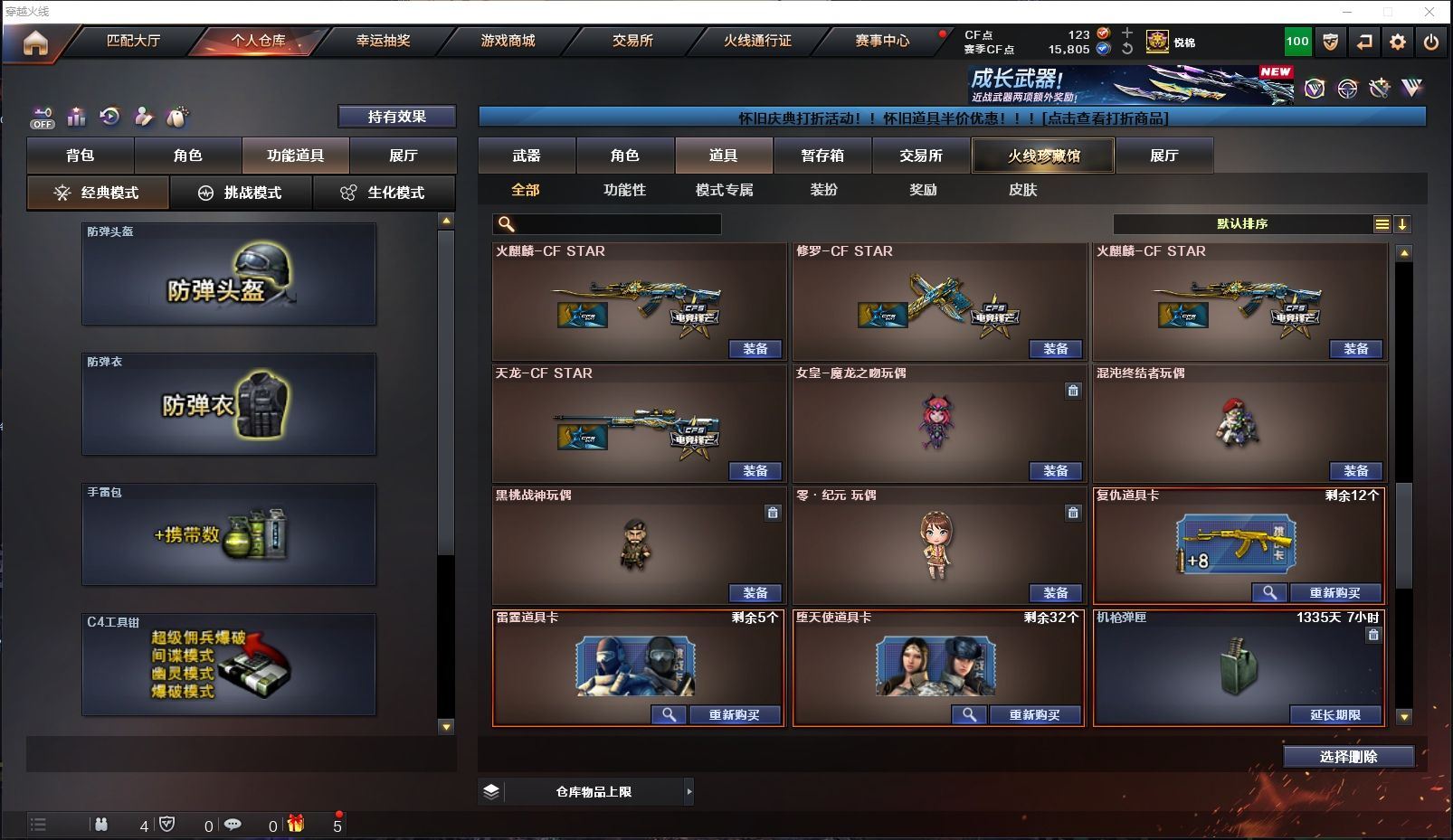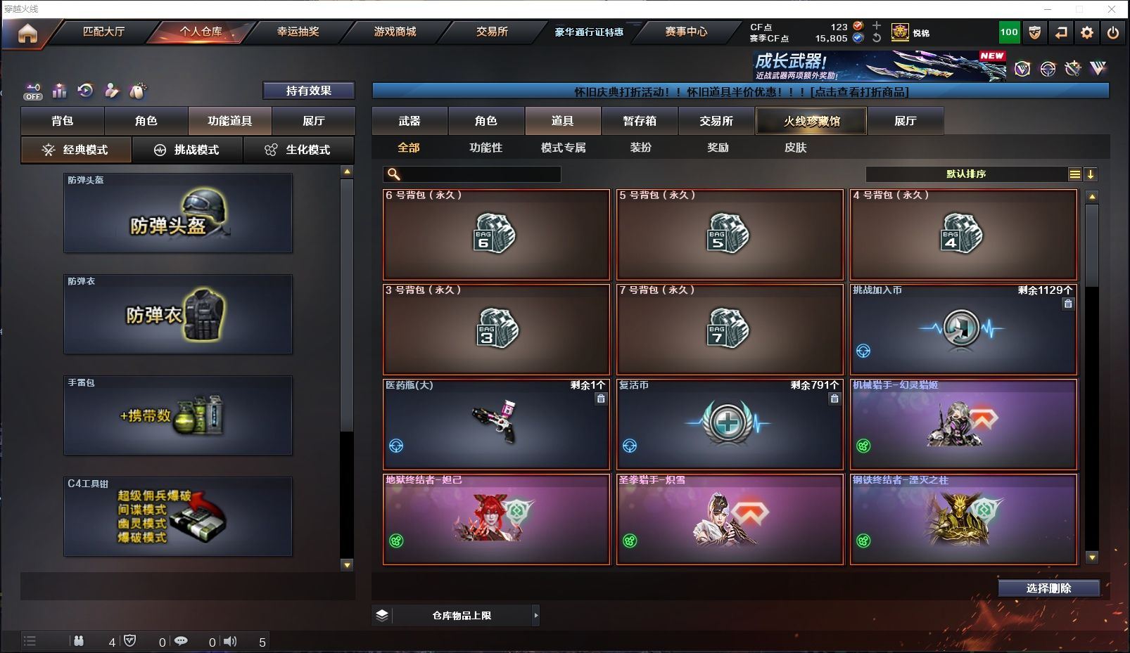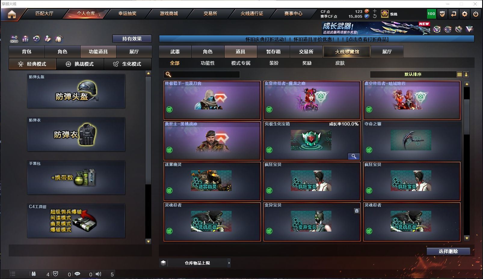 ✨极品生化✨传说影煞+炽芒蝶刃+炼狱泡泡象6盘+枪娘掣电+生化道具大满配+多猎手皮肤✨【山东一区/10V/vip1/1传说】【传说影煞】【6盘龙】【炽芒蝶刃】【火麒麟-CFSTAR*2】【黑武士-锦绣游龙】【天龙-CFSTAR】【RPK-盘龙*6】【迷你生化手雷*2】【修罗-CFSTAR】【王者沙漠玫瑰/暗夜-X/乔伊教练/修道士/铁骑荣耀/堕天使】【AA-12-雷霆】【Colt 1911-大黄蜂】【斯泰尔-巧克力】【炼狱-枪娘掣电/炼狱-泡泡象】【防弹头盔*2/防弹衣*2/C4工具钳*2/手雷包*2/防化服*2】【皮肤多多~玩偶多多~源武器多多~注意事项;各种道具详情看截图、低价出售、截图展示段位不代表实际段位,如赛季更新等不可抗拒因素发生变化时限道具不保证所剩时间】