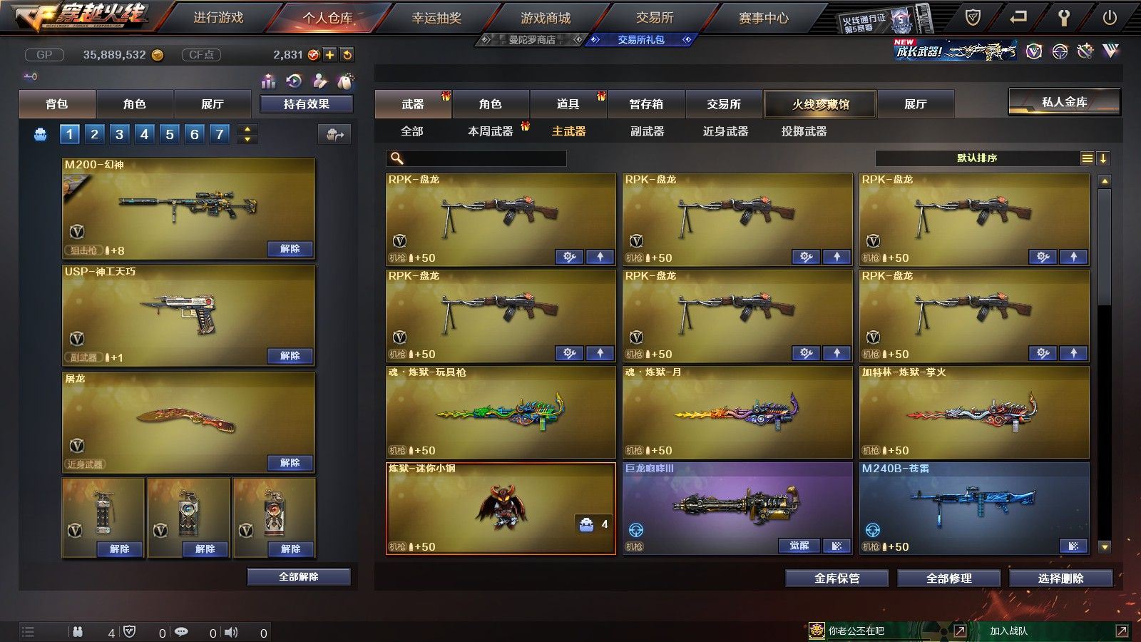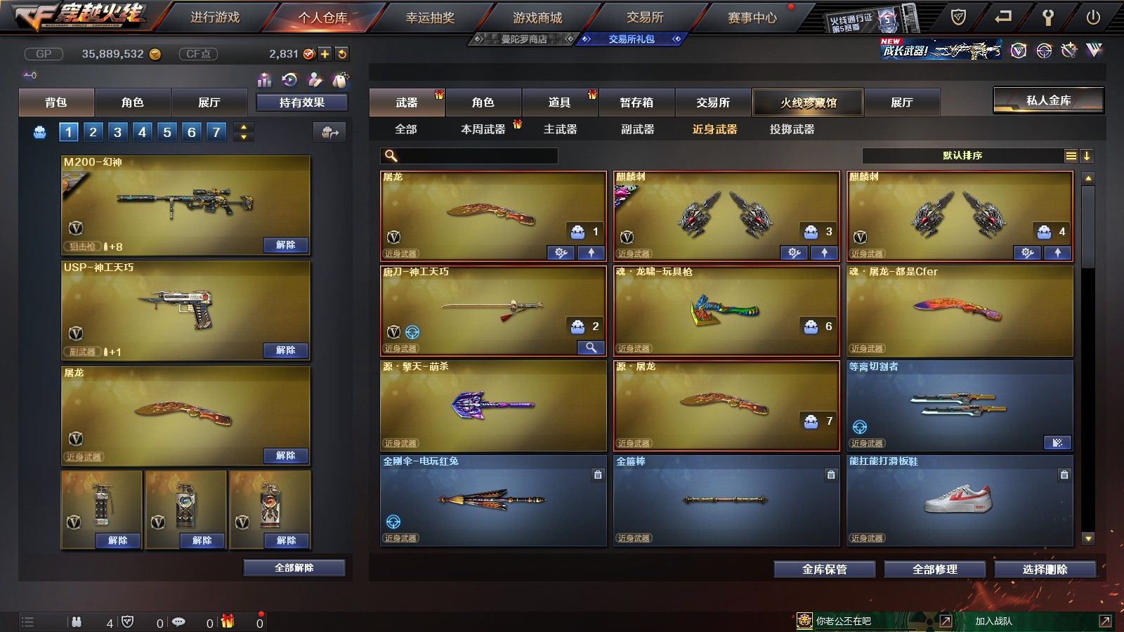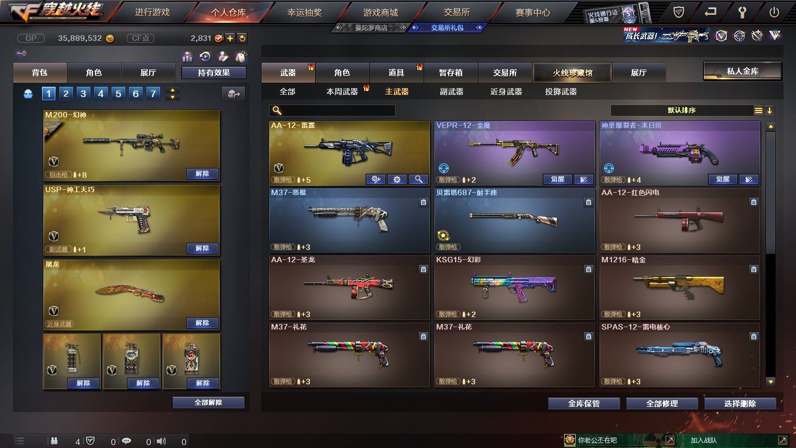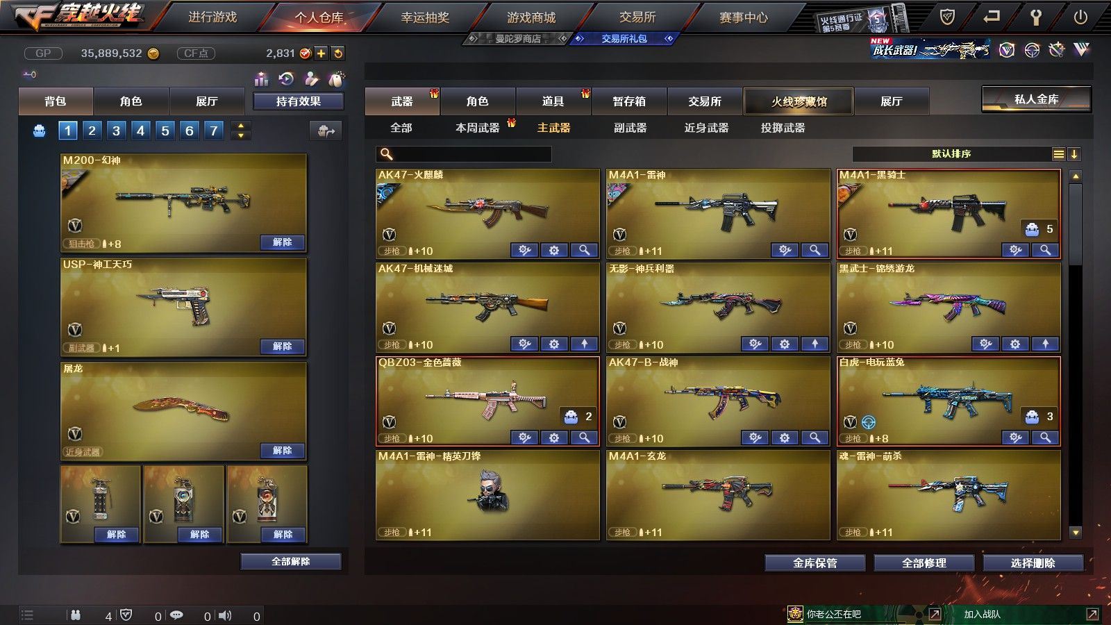 【黑龙江区/77V/vip1/1传说】【传说圣灵】【竞技荣光套/6烈龙】【5盘龙】【M200-幻神】【M200-竞技荣光】【八面凌龙】【柯尔特-竞技荣光】【Scar Light-白虎】【QBZ03-金色蔷薇】【M4A1-雷神/M4A1-雷神音效卡/雷神-暗月】【柯尔特-电竞装甲/COP 357-雷霆王者】【Barrett-毁灭/Barrett-毁灭音效卡/毁灭-星空/毁灭-风暴/毁灭耀金皮肤】【AK47-火麒麟/火麒麟-CFSTAR*2/火麒麟-心动糖果/火麒麟-平天大圣】【M4A1-黑骑士/M4A1-黑骑士音效卡/黑骑士-海王*2/黑骑士耀金皮肤】【M4A1-黑龙】【无影-神兵利器】【AK47-黑武士/黑武士-锦绣游龙】【天龙-CFSTAR】【AWM-裁决】【M4A1-死神/M4A1-千变-孔明皮肤*2】【汤姆逊-烈龙*6】【RPK-盘龙*5】【加特林-炼狱*2】【斯泰尔-蝴蝶/死亡之眼*2/迷你生化手雷*3】【沙鹰-修罗/修罗-CFSTAR*2】【沙鹰-天神】【云龙扇】【麒麟刺】【擎天*2/擎天-竞技荣光】【屠龙】【龙啸】【电竞教官-云悠悠/新海豹突击队/炫/魅影/龙儿/木兰/兔囡囡/麻雀/紫霞/青霞仙子/灵狐者-黄金海岸/妲己/娟娟/潘多拉-X/斯沃特-X/影武者-X/铁骑荣耀/新娜塔莎/幻影/堕天使/复仇者】【M4A1-玫瑰精灵/M4A1-龙血/M4A1-猎神/M4A1-武圣】【白虎-电玩/AK47-B-战士/AK47-B-战神*2/AK-47-猩红传说*4】【AA-12-雷霆/AK47-黑鲨】【AN94-超新星/超新星-悦享】【Barrett-暗月传说】【Colt1911-小故障/Colt 1911-大黄蜂/柯尔特-萌杀/COP 357-青龙】【斩神刀/金刚伞-电玩红兔/迷你深渊冰龙*2/马来剑-夜魔】【神圣爆裂者-末日III*3/激光毁灭者III-白马银枪*2/激光毁灭者III*3/AK47-冰龙粉碎者/冰龙粉碎者-白马银枪*2】【黑龙吞噬者/异变清道夫/异变清道夫/斯泰尔-巧克力/轻型军用手斧-镜】【猫猫手套/火麒麟-灵狐/天龙-曼陀罗/夺魂】【高爆手雷-竞技荣光/闪光弹-竞技荣光/烟雾弹-竞技荣光】【高爆手雷-云龙*2/闪光弹-云龙/烟雾弹-云龙】【高爆手雷-雷霆】【高爆手雷-夜魔】【炫金无影】【N9语音包】【超级护目镜/透明头盔/透明护目镜/超级对讲机/超级背包/防弹头盔*6/防弹衣*6/C4工具钳*6/手雷包*4/防化服*4】