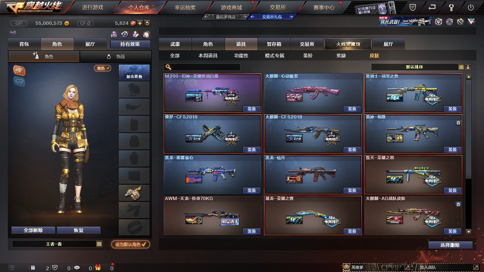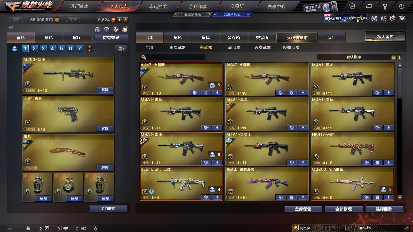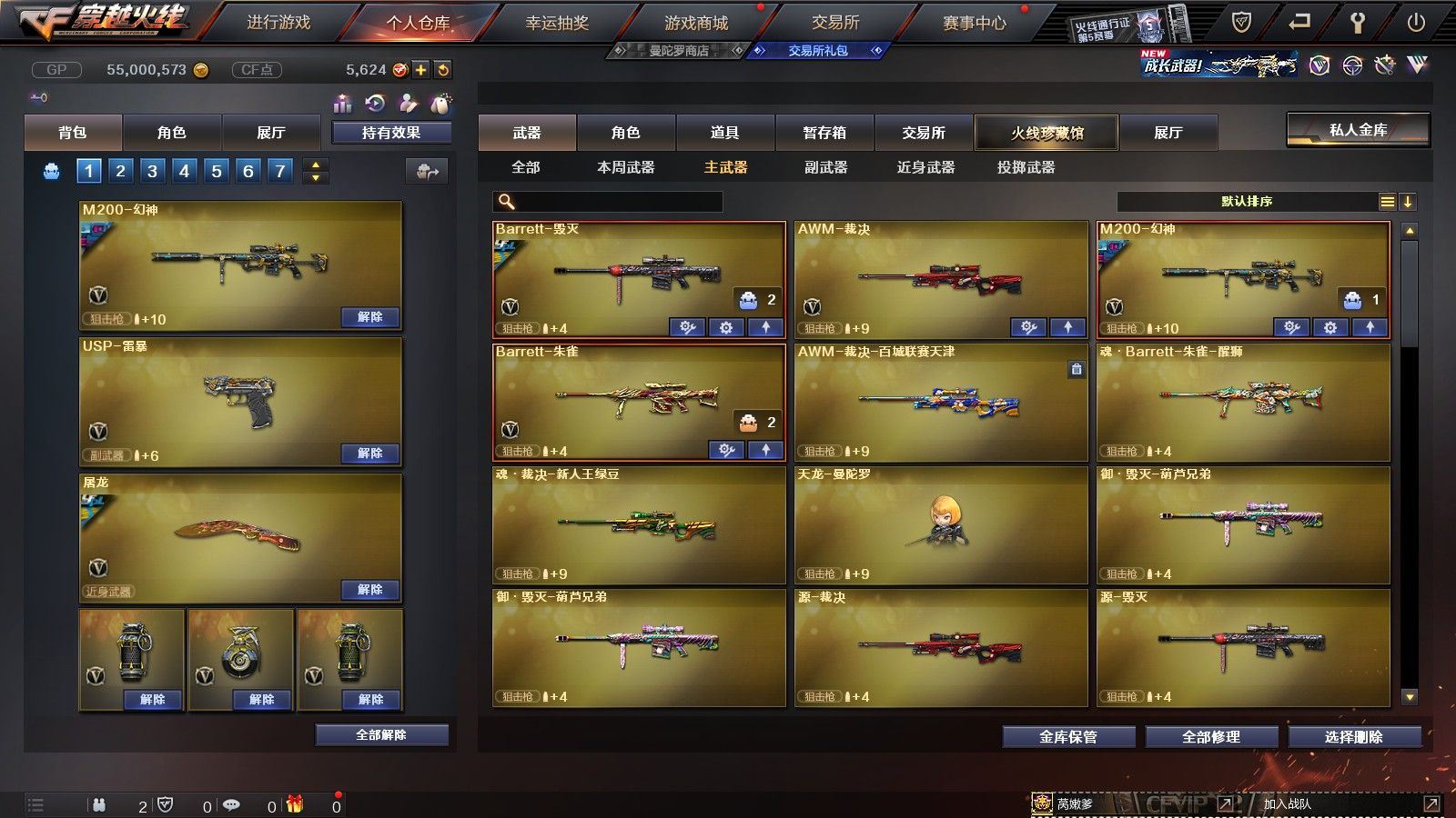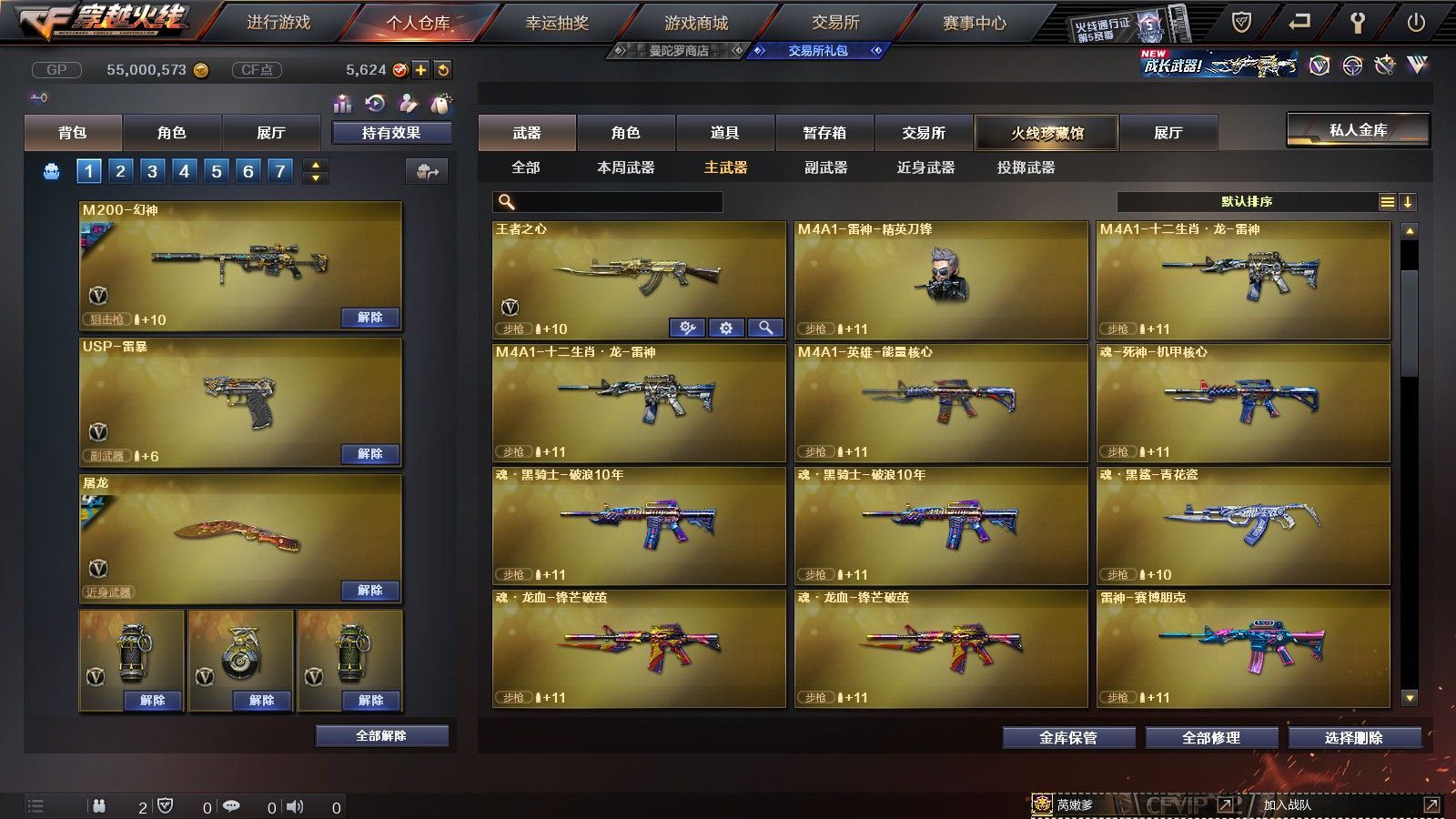 【陕西一区/55V/vip1】【6烈龙】【M200-幻神/M200-幻神音效卡/M200-幻神-荣耀世冠白鲨】【八面凌龙】【USP-雷暴】【Scar Light-白虎】【QBZ03-金色蔷薇】【M4A1-雷神*2/雷神-杨戬/雷神-虎将】【Barrett-毁灭/Barrett-毁灭音效卡/毁灭-荣耀之怒】【AK47-火麒麟*2/火麒麟-心动糖果】【M4A1-黑骑士/M4A1-黑骑士音效卡/黑骑士-冠军之势】【M4A1-黑龙*3/黑龙-能量核心】【HK417-朱雀】【黑武士-锦绣游龙】【AWM-天龙-传奇70KG/AWM-天龙-传奇白鲨】【AWM-裁决】【M4A1-千变-孔明皮肤*2】【汤姆逊-烈龙*6】【RPK-盘龙】【加特林-炼狱】【斯泰尔-蝴蝶】【沙鹰-修罗*4/修罗-CFSTAR*2】【沙鹰-天神】【麒麟刺】【屠龙/屠龙-荣耀之锋】【龙啸-烈火龙威】【王者春/炫/龙儿-小淘气/暗夜-X/兰-海滩派对/乔伊教练/兔囡囡/零-水下丽影/潘多拉-X/斯沃特-X/铁骑荣耀/新娜塔莎/幻影/复仇者】【Barrett-朱雀】【Colt1911-小故障/Colt 1911-大黄蜂/柯尔特-萌杀/COP 357-青龙/新USP-枪王排位奖励*2】【神圣爆裂者III/KAC-圣炎切割者III/激光毁灭者III】【M4A1-雷神-精英刀锋/天龙-曼陀罗】【王者之心/王者之魂】【高爆手雷-雷暴*4/闪光弹-雷暴*4/烟雾弹-雷暴*4】【高爆手雷-雷霆/闪光弹-雷霆/烟雾弹-雷霆】【高爆手雷-幻灵】【烟雾保护头盔/闪光护目镜/超级背包/炫彩背包/防弹头盔*4/防弹衣*3/C4工具钳*3/手雷包*4/防化服*2】
