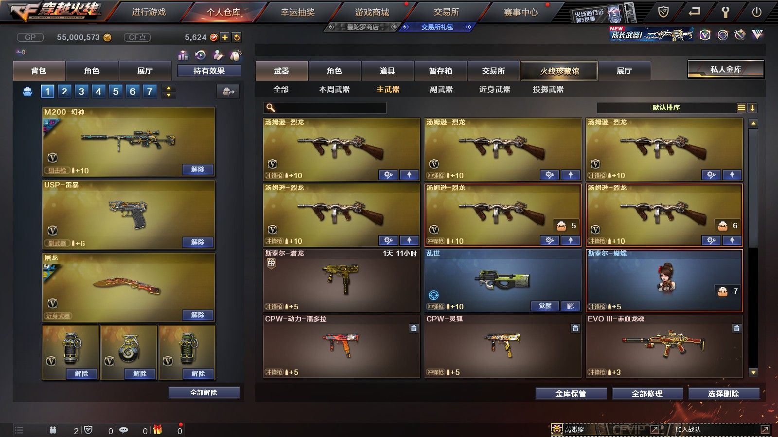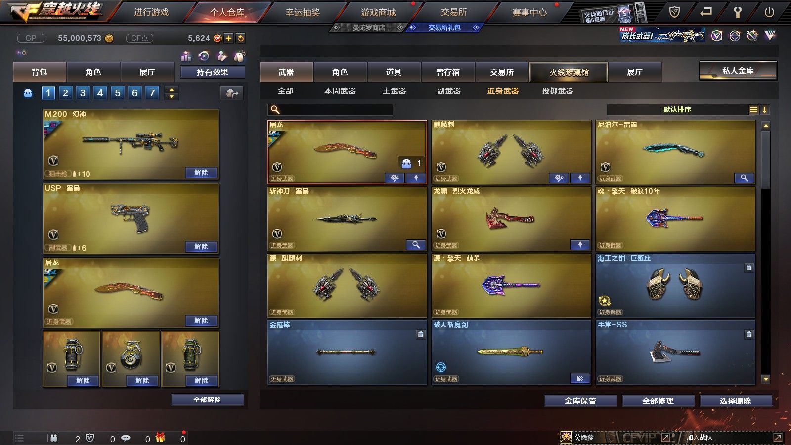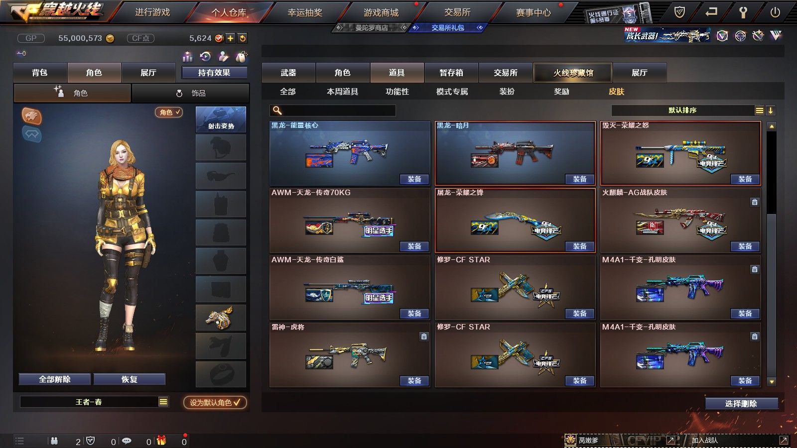 【陕西一区/55V/vip1】【6烈龙】【M200-幻神/M200-幻神音效卡/M200-幻神-荣耀世冠白鲨】【八面凌龙】【USP-雷暴】【Scar Light-白虎】【QBZ03-金色蔷薇】【M4A1-雷神*2/雷神-杨戬/雷神-虎将】【Barrett-毁灭/Barrett-毁灭音效卡/毁灭-荣耀之怒】【AK47-火麒麟*2/火麒麟-心动糖果】【M4A1-黑骑士/M4A1-黑骑士音效卡/黑骑士-冠军之势】【M4A1-黑龙*3/黑龙-能量核心】【HK417-朱雀】【黑武士-锦绣游龙】【AWM-天龙-传奇70KG/AWM-天龙-传奇白鲨】【AWM-裁决】【M4A1-千变-孔明皮肤*2】【汤姆逊-烈龙*6】【RPK-盘龙】【加特林-炼狱】【斯泰尔-蝴蝶】【沙鹰-修罗*4/修罗-CFSTAR*2】【沙鹰-天神】【麒麟刺】【屠龙/屠龙-荣耀之锋】【龙啸-烈火龙威】【王者春/炫/龙儿-小淘气/暗夜-X/兰-海滩派对/乔伊教练/兔囡囡/零-水下丽影/潘多拉-X/斯沃特-X/铁骑荣耀/新娜塔莎/幻影/复仇者】【Barrett-朱雀】【Colt1911-小故障/Colt 1911-大黄蜂/柯尔特-萌杀/COP 357-青龙/新USP-枪王排位奖励*2】【神圣爆裂者III/KAC-圣炎切割者III/激光毁灭者III】【M4A1-雷神-精英刀锋/天龙-曼陀罗】【王者之心/王者之魂】【高爆手雷-雷暴*4/闪光弹-雷暴*4/烟雾弹-雷暴*4】【高爆手雷-雷霆/闪光弹-雷霆/烟雾弹-雷霆】【高爆手雷-幻灵】【烟雾保护头盔/闪光护目镜/超级背包/炫彩背包/防弹头盔*4/防弹衣*3/C4工具钳*3/手雷包*4/防化服*2】