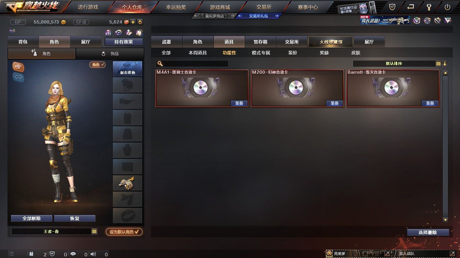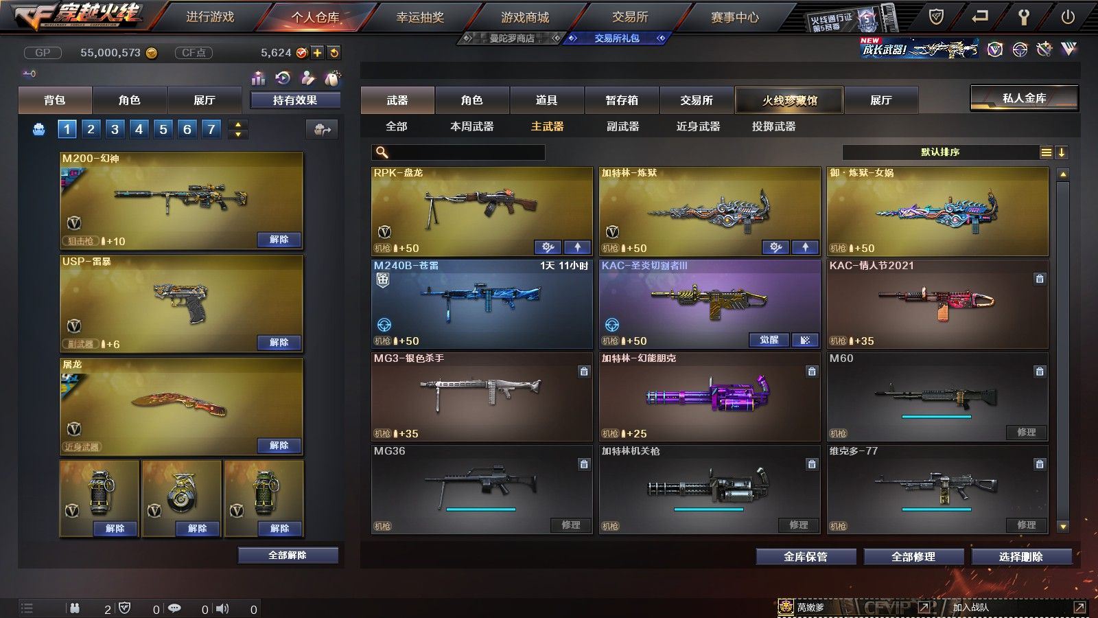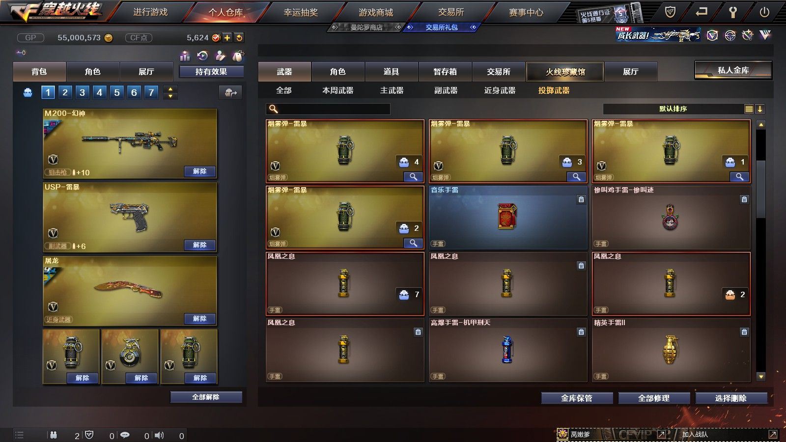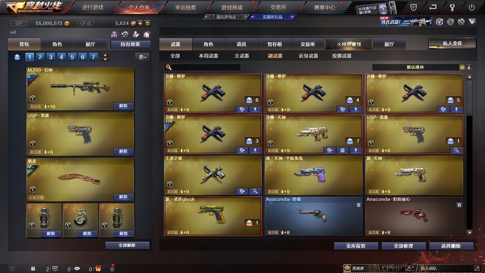 【陕西一区/55V/vip1】【6烈龙】【M200-幻神/M200-幻神音效卡/M200-幻神-荣耀世冠白鲨】【八面凌龙】【USP-雷暴】【Scar Light-白虎】【QBZ03-金色蔷薇】【M4A1-雷神*2/雷神-杨戬/雷神-虎将】【Barrett-毁灭/Barrett-毁灭音效卡/毁灭-荣耀之怒】【AK47-火麒麟*2/火麒麟-心动糖果】【M4A1-黑骑士/M4A1-黑骑士音效卡/黑骑士-冠军之势】【M4A1-黑龙*3/黑龙-能量核心】【HK417-朱雀】【黑武士-锦绣游龙】【AWM-天龙-传奇70KG/AWM-天龙-传奇白鲨】【AWM-裁决】【M4A1-千变-孔明皮肤*2】【汤姆逊-烈龙*6】【RPK-盘龙】【加特林-炼狱】【斯泰尔-蝴蝶】【沙鹰-修罗*4/修罗-CFSTAR*2】【沙鹰-天神】【麒麟刺】【屠龙/屠龙-荣耀之锋】【龙啸-烈火龙威】【王者春/炫/龙儿-小淘气/暗夜-X/兰-海滩派对/乔伊教练/兔囡囡/零-水下丽影/潘多拉-X/斯沃特-X/铁骑荣耀/新娜塔莎/幻影/复仇者】【Barrett-朱雀】【Colt1911-小故障/Colt 1911-大黄蜂/柯尔特-萌杀/COP 357-青龙/新USP-枪王排位奖励*2】【神圣爆裂者III/KAC-圣炎切割者III/激光毁灭者III】【M4A1-雷神-精英刀锋/天龙-曼陀罗】【王者之心/王者之魂】【高爆手雷-雷暴*4/闪光弹-雷暴*4/烟雾弹-雷暴*4】【高爆手雷-雷霆/闪光弹-雷霆/烟雾弹-雷霆】【高爆手雷-幻灵】【烟雾保护头盔/闪光护目镜/超级背包/炫彩背包/防弹头盔*4/防弹衣*3/C4工具钳*3/手雷包*4/防化服*2】
