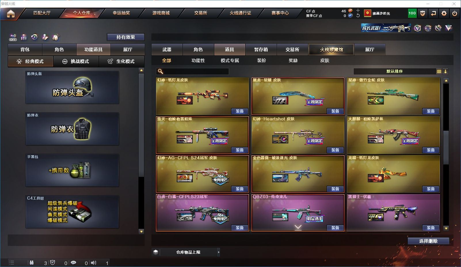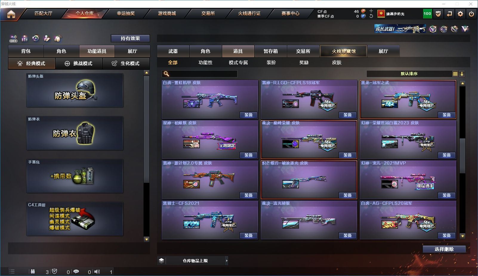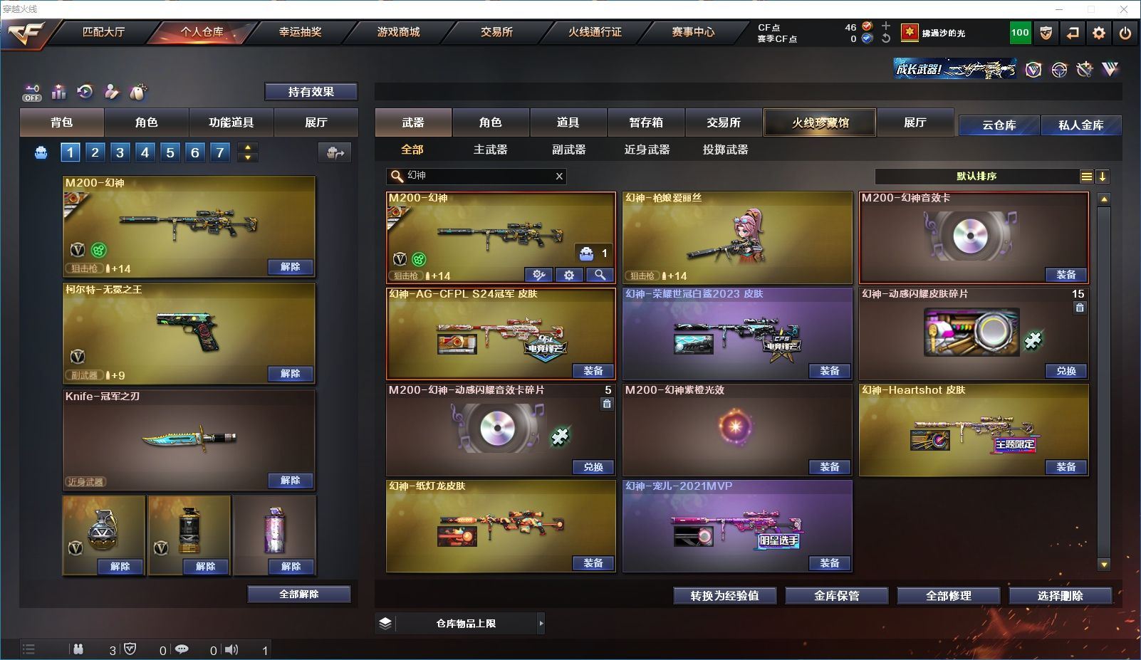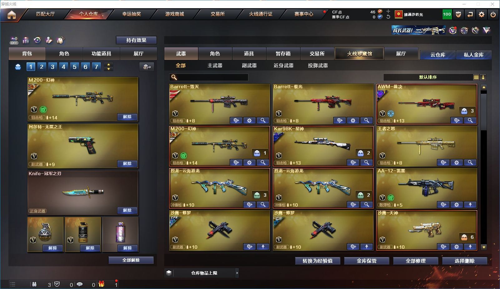 【上海一区/82V/vip1】【M200-幻神/M200-幻神音效卡/幻神-宠儿-2021MVP/幻神-纸灯龙皮肤/幻神-Heartshot 皮肤/幻神-荣耀世冠白鲨2023 皮肤】【Kar98K-星神/Kar98K-星神音效卡/星神-璀璨皮肤/星神-枪娘默 皮肤】【炽芒蝶刃/炽芒蝶刃-荣耀世冠白鲨2023 皮肤/炽芒蝶刃-破浪逐光 皮肤】【Knife-冠军之刃】【柯尔特-无冕之王/荣耀世冠-柯尔特/柯尔特-赛博朋克/USP-雷暴】【Scar Light-白虎/Scar Light-白虎音效卡/白虎-AG-CFPLS20冠军/白虎-霓虹机甲 皮肤】【QBZ03-金色蔷薇*2/QBZ03-传奇宠儿/金色蔷薇-破浪逐光 皮肤】【M4A1-雷神*2/M4A1-雷神音效卡/雷神-宠儿-2019MVP/雷神-冠军之魄/雷神-传奇N9/雷神-R.LGD-CFPLS18冠军/雷神-耀金皮肤/雷神-维纳斯皮肤】【COP 357-雷霆王者/COP 357-幻灵/COP 357-云龙】【Barrett-毁灭*2/Barrett-毁灭音效卡/巴雷特-毁灭-CFPL冠军/毁灭-云海游龙皮肤】【AK47-火麒麟*2/火麒麟-CFSTAR/火麒麟-心动糖果/火麒麟-华夏之心】【M4A1-黑骑士/M4A1-黑骑士音效卡/黑骑士-冠军之势/黑骑士-CFS2021/黑骑士-伏羲】【M4A1-黑龙/黑龙-冠军之武/黑龙-墨子皮肤/黑龙-能量核心】【AK47-无影/无影-神兵利器】【黑武士-锦绣游龙】【Barrett-极光】【AWM-裁决】【M4A1-千变-孔明皮肤】【烈龙-云海游龙*2】【沙鹰-修罗*2/修罗-CFSTAR/修罗-星空】【沙鹰-天神*2/天神-动感闪耀】【云龙扇】【擎天-云海游龙/擎天-竞技荣光】【屠龙/屠龙-动感闪耀】【荣耀世冠-龙啸/龙啸/龙啸-冠军之啸/龙啸-纸灯龙皮肤/龙啸-烈火龙威】【电竞教官-云悠悠/关小雨/王者-瞳-闭月羞花/暗夜-X/木兰/奇洋探员/云海玲珑/乔伊教练/兔囡囡/麻雀/雪莉杨/潘多拉-X/斯沃特-X/救世主-X/幻影/堕天使/复仇者】【白虎-九尾白狐】【AA-12-雷霆/AK12-天启】【AN94-超新星*2/超新星-热带奇洋】【Barrett-雷霆王者】【Colt1911-小故障*2/Colt 1911-大黄蜂*2/新USP-枪王排位奖励*4】【龙啸-热带奇洋/雷霆王者之锋/斩神刀/迷你深渊冰龙】【神圣爆裂者-末日III/机甲撕裂者III/激光毁灭者III*3】【轻型军用手斧-镜】【猫猫手套/白虎-枪娘安妮/雷神-小红/M4A1-小黄鸡/COP-旗袍/火麒麟-灵狐/M37-葵/毁灭-孙三炮*2/迷你裂空之翼/夺魂】【王者龙血】【高爆手雷-竞技荣光/闪光弹-竞技荣光/烟雾弹-竞技荣光】【高爆手雷-云龙*3/闪光弹-云龙*5/烟雾弹-云龙*4/手雷-云海游龙】【高爆手雷-雷霆王者/闪光弹-雷霆王者/烟雾弹-雷霆王者】【高爆手雷-幻灵*3/闪光弹-幻灵*2/烟雾弹-幻灵*3】【手雷-热带奇洋】【炫金毁灭/炫金天龙】【语音特效-云海游龙】【透明头盔/透明护目镜/烟雾保护头盔/闪光护目镜/运动护目镜/超级对讲机/超级背包/防弹头盔*3/防弹衣*3/C4工具钳*3/手雷包*3/防化服*2】