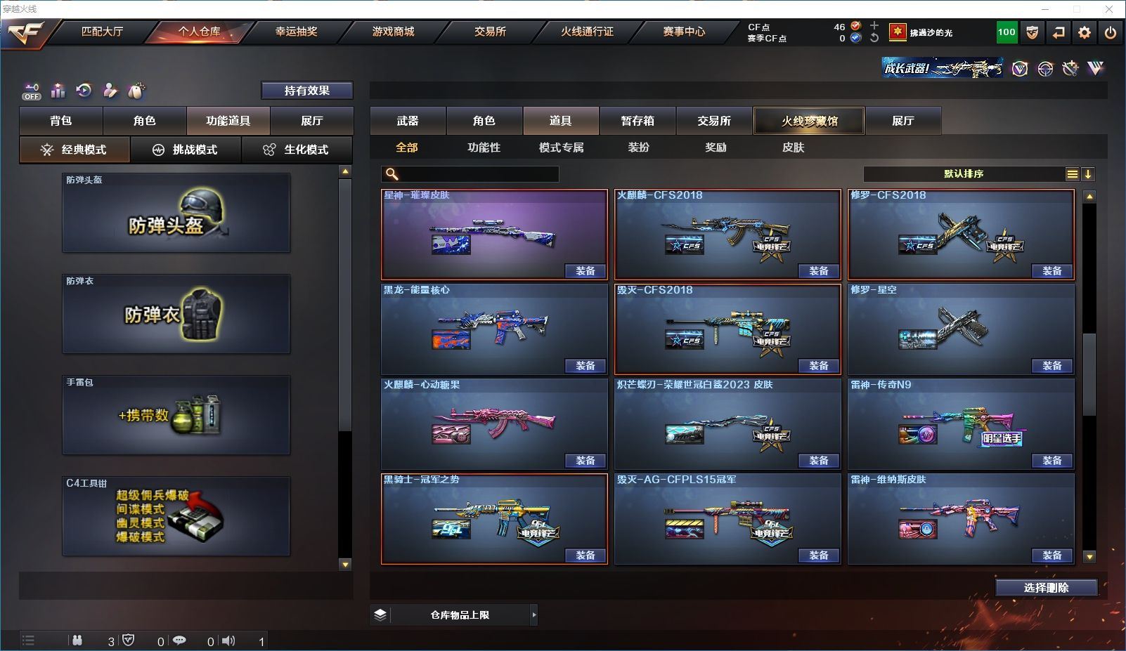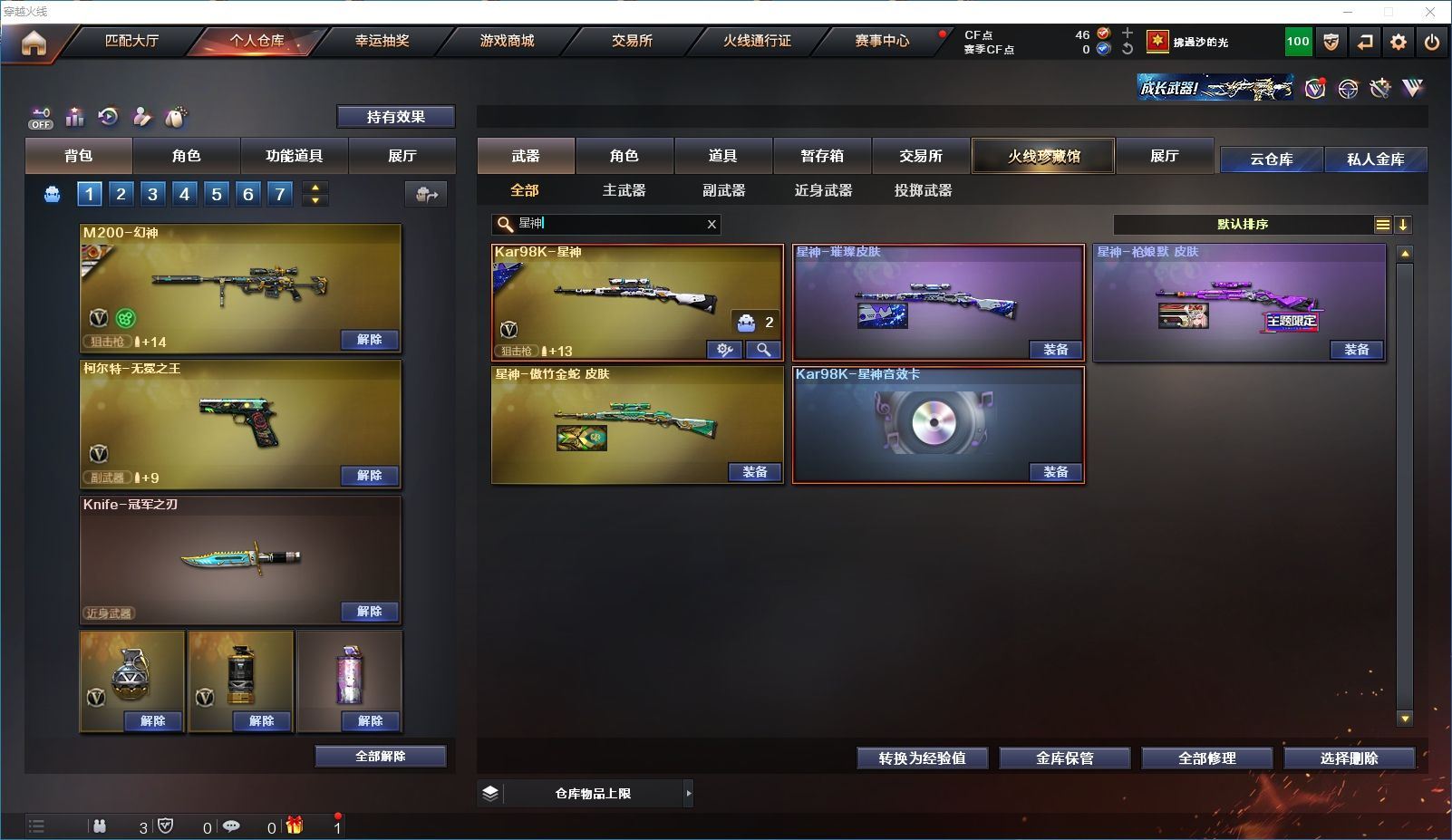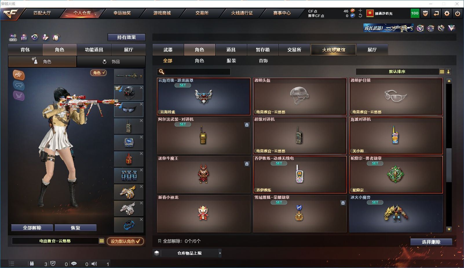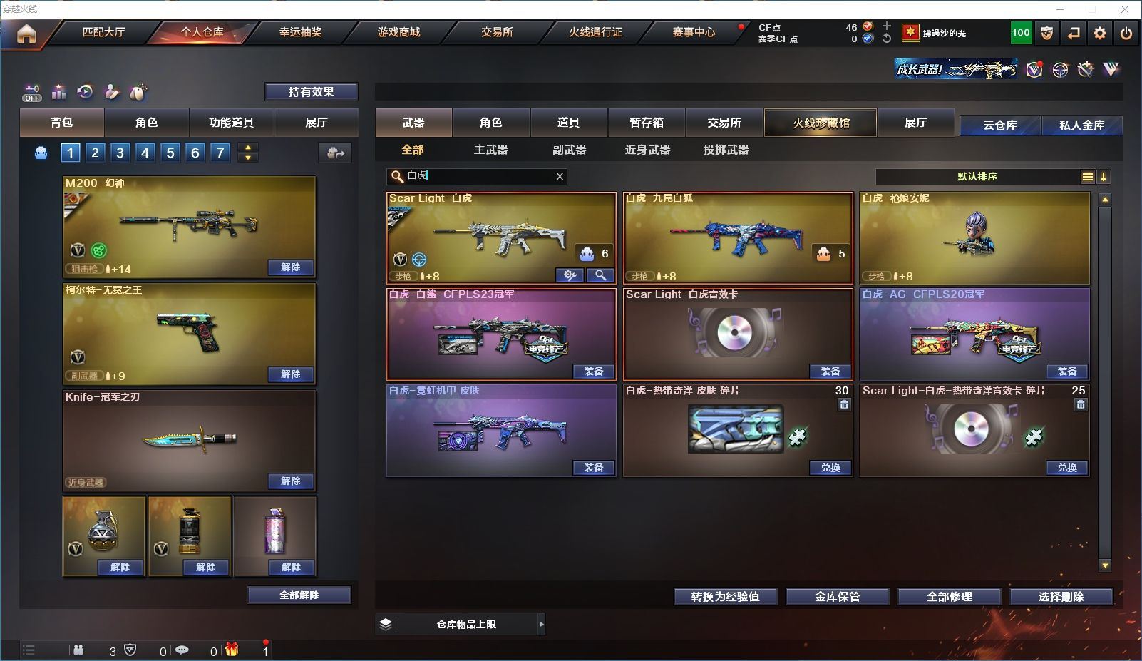 【上海一区/82V/vip1】【M200-幻神/M200-幻神音效卡/幻神-宠儿-2021MVP/幻神-纸灯龙皮肤/幻神-Heartshot 皮肤/幻神-荣耀世冠白鲨2023 皮肤】【Kar98K-星神/Kar98K-星神音效卡/星神-璀璨皮肤/星神-枪娘默 皮肤】【炽芒蝶刃/炽芒蝶刃-荣耀世冠白鲨2023 皮肤/炽芒蝶刃-破浪逐光 皮肤】【Knife-冠军之刃】【柯尔特-无冕之王/荣耀世冠-柯尔特/柯尔特-赛博朋克/USP-雷暴】【Scar Light-白虎/Scar Light-白虎音效卡/白虎-AG-CFPLS20冠军/白虎-霓虹机甲 皮肤】【QBZ03-金色蔷薇*2/QBZ03-传奇宠儿/金色蔷薇-破浪逐光 皮肤】【M4A1-雷神*2/M4A1-雷神音效卡/雷神-宠儿-2019MVP/雷神-冠军之魄/雷神-传奇N9/雷神-R.LGD-CFPLS18冠军/雷神-耀金皮肤/雷神-维纳斯皮肤】【COP 357-雷霆王者/COP 357-幻灵/COP 357-云龙】【Barrett-毁灭*2/Barrett-毁灭音效卡/巴雷特-毁灭-CFPL冠军/毁灭-云海游龙皮肤】【AK47-火麒麟*2/火麒麟-CFSTAR/火麒麟-心动糖果/火麒麟-华夏之心】【M4A1-黑骑士/M4A1-黑骑士音效卡/黑骑士-冠军之势/黑骑士-CFS2021/黑骑士-伏羲】【M4A1-黑龙/黑龙-冠军之武/黑龙-墨子皮肤/黑龙-能量核心】【AK47-无影/无影-神兵利器】【黑武士-锦绣游龙】【Barrett-极光】【AWM-裁决】【M4A1-千变-孔明皮肤】【烈龙-云海游龙*2】【沙鹰-修罗*2/修罗-CFSTAR/修罗-星空】【沙鹰-天神*2/天神-动感闪耀】【云龙扇】【擎天-云海游龙/擎天-竞技荣光】【屠龙/屠龙-动感闪耀】【荣耀世冠-龙啸/龙啸/龙啸-冠军之啸/龙啸-纸灯龙皮肤/龙啸-烈火龙威】【电竞教官-云悠悠/关小雨/王者-瞳-闭月羞花/暗夜-X/木兰/奇洋探员/云海玲珑/乔伊教练/兔囡囡/麻雀/雪莉杨/潘多拉-X/斯沃特-X/救世主-X/幻影/堕天使/复仇者】【白虎-九尾白狐】【AA-12-雷霆/AK12-天启】【AN94-超新星*2/超新星-热带奇洋】【Barrett-雷霆王者】【Colt1911-小故障*2/Colt 1911-大黄蜂*2/新USP-枪王排位奖励*4】【龙啸-热带奇洋/雷霆王者之锋/斩神刀/迷你深渊冰龙】【神圣爆裂者-末日III/机甲撕裂者III/激光毁灭者III*3】【轻型军用手斧-镜】【猫猫手套/白虎-枪娘安妮/雷神-小红/M4A1-小黄鸡/COP-旗袍/火麒麟-灵狐/M37-葵/毁灭-孙三炮*2/迷你裂空之翼/夺魂】【王者龙血】【高爆手雷-竞技荣光/闪光弹-竞技荣光/烟雾弹-竞技荣光】【高爆手雷-云龙*3/闪光弹-云龙*5/烟雾弹-云龙*4/手雷-云海游龙】【高爆手雷-雷霆王者/闪光弹-雷霆王者/烟雾弹-雷霆王者】【高爆手雷-幻灵*3/闪光弹-幻灵*2/烟雾弹-幻灵*3】【手雷-热带奇洋】【炫金毁灭/炫金天龙】【语音特效-云海游龙】【透明头盔/透明护目镜/烟雾保护头盔/闪光护目镜/运动护目镜/超级对讲机/超级背包/防弹头盔*3/防弹衣*3/C4工具钳*3/手雷包*3/防化服*2】