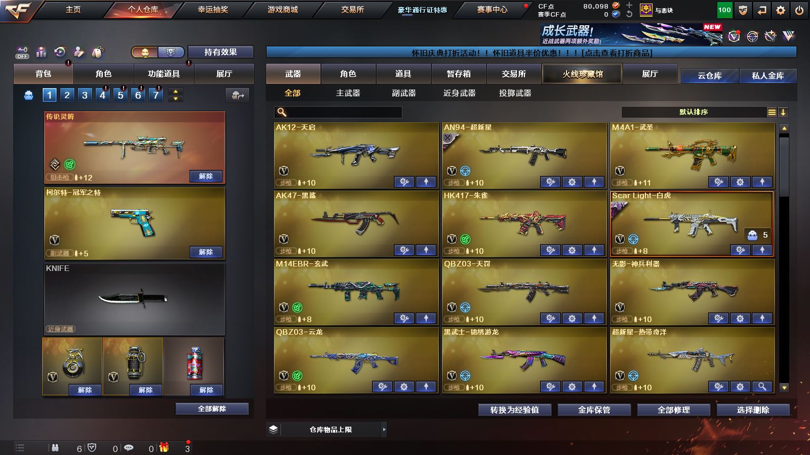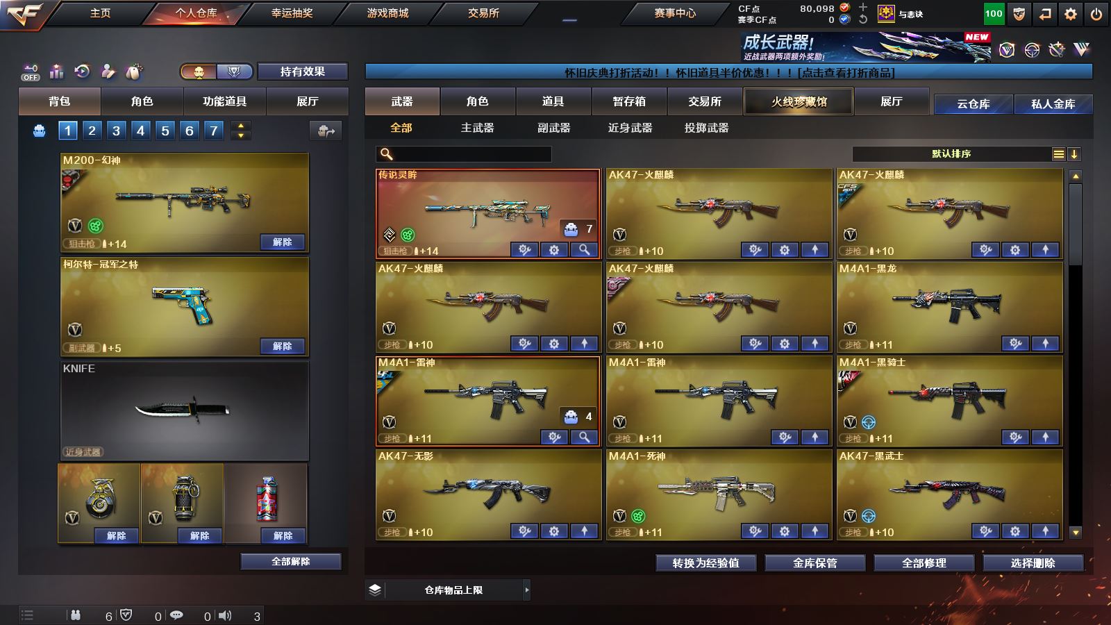 Lv.101段位新锐1,VIP6,113V,1传说,13王者,3炫金,80098CF点,游戏年龄16.3年;【传说武器1】:传说灵眸;【重要角色8】:鹰/葵/零/王者-葵-貂蝉/王者潘多拉/奇洋探员/超能女侍/空;【武器皮肤58】:幻神-荣耀世冠白鲨2023/M200-幻神-N9-2022MVP/幻神-电流骇客/幻神-冠军之幻/M200-幻神-荣耀世冠白鲨/幻神-CFS2022/星神-璀璨/毁灭-黑曼巴/毁灭-冠军之怒/毁灭耀金/天龙-CFSTAR/AWM-天龙-传奇70KG*2/ScarLight-白虎-暗星/白虎-AG-CFPLS20冠军/QBZ03-冠军之薇/QBZ03-CFS2024/QBZ03-巅峰荣耀/QBZ03-AG-CFPLS19冠军/雷神-CFS十周年纪念版/雷神-荣耀之魄/雷神-宠儿-2019MVP/雷神-航星/黑骑士-AG-S4冠军典藏/M4A1-千变-孔明/黑骑士耀金/黑龙-能量核心/雷神-星空/雷神-暗月/火麒麟-CFSTAR/火麒麟-心动糖果/AK47-B-常胜将军-孙权*2/AK47-B-常胜将军-刘备/战神-粉色甜心/战神-流金岁月*7/战神-紫绶金章*7/修罗-CFSTAR/修罗耀金/屠龙-荣耀之锋/屠龙-春桃/龙啸-纸灯龙*2/麒麟刺-荣耀世冠白鲨/裁决-叶芒苍灵/金色蔷薇-纸灯龙;【英雄武器105】:M200-幻神*2/Kar98K-星神/Barrett-朱雀/barrett-金色蔷薇/Barrett-毁灭*2/AWM-裁决/AWM-天龙/ScarLight-白虎/白虎-电玩/QBZ03-天罚/QBZ03-金色蔷薇*3/QBZ03-云龙/M4A1-玫瑰精灵/M4A1-黑龙/M4A1-雷神*2/M4A1-死神/M4A1-黑骑士/M4A1-武圣/黑武士-锦绣游龙/无影-神兵利器/AK47-火麒麟*4/AK47-B-常胜将军/AK-47-猩红传说*20/AK47-黑武士/AK47-B-战神/AK47-B-战士/AK47-黑鲨/AK47-无影/HK417-朱雀/M14EBR-玄武/AN94-超新星/AK12-天启/加特林-炼狱/RPK-盘龙*3/汤姆逊-烈龙*3/AA-12-雷霆/柯尔特-荣耀世冠白鲨2023/柯尔特-冠军之特/COP357-云龙/COP357-幻灵*3/USP-冥王/沙鹰-修罗*4/沙鹰-天神*2/Glock18-武圣/屠龙*2/龙啸*2/擎天/麒麟刺/斩神刀-雷暴/高爆手雷-云龙*2/高爆手雷-幻灵/高爆手雷-雷暴*2/闪光弹-云龙/闪光弹-幻灵/闪光弹-雷暴*2/烟雾弹-玄豹/烟雾弹-幻灵/烟雾弹-雷暴*2/丛林匕首-玄豹/机械迷城-穹宇/FAMASG2-天戎/9A91-烈火;【热门武器13】:黄金猫猫手套-白鲨/3烈龙/3盘龙/4修罗/1黑骑士/1炼狱;【音效卡7】:M200-幻神音效卡/HK417-朱雀音效卡/M4A1-黑骑士音效卡/M4A1-雷神音效卡/Barrett-毁灭音效卡*2/AK47-火麒麟音效卡;【王者武器11】:王者风神-觉醒版/王者之怒-觉醒版/王者之光-觉醒版/王者之力/王者芳薇-觉醒版/王者之魄-觉醒版/王者之势-觉醒版/王者之魄*2/王者之幻/超新星-悦享;【炫金武器3】:炫金千变/炫金骑士/炫金天龙;【小人枪9】:天龙-曼陀罗/火麒麟-绝迹/M4A1-雷神-精英刀锋/生化手雷-机甲核心/魔能飞环-曼陀罗*2/AWM-灵狐-15周年嘉年华/COP-白鲨/C.A.T;【挑战大师7】:金刚伞-电玩红兔/黄金虚空之锤/KAC-圣炎切割者III/唐刀-戎马一生*3/巡航者;【官方截图】【所有武器的数量可能含有时效性,具体请以游戏内仓库实际拥有为准】【上海二区】【可二次实名】