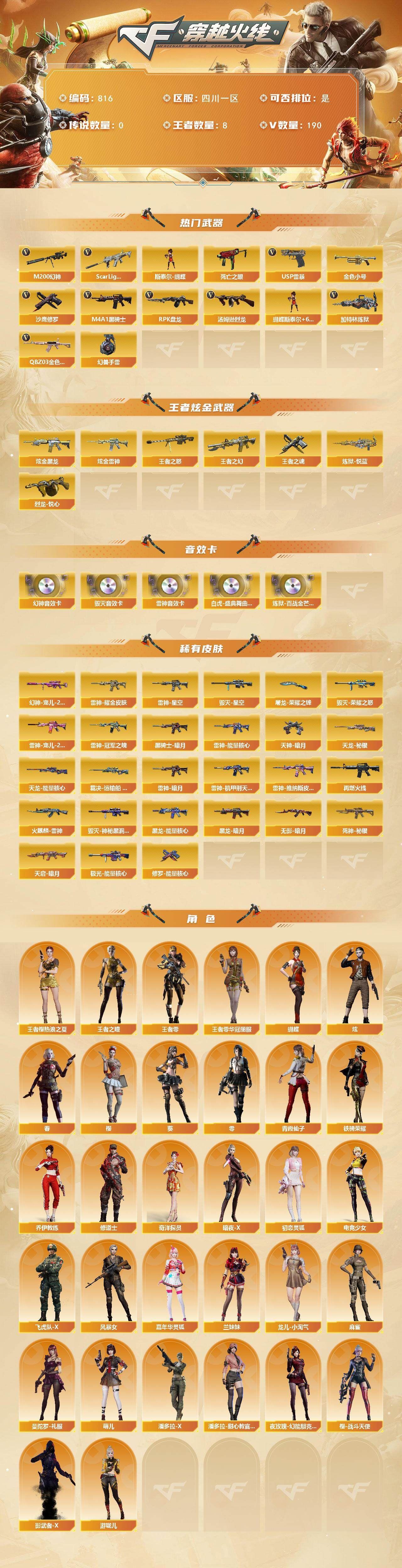 r49299 可二次 QQ四川一区-190V-10王者-3炫金【热门武器】:QBZ03-金色蔷薇,Scar Light-白虎,M200-幻神,死亡之眼*2,金色小号,M4A1-黑骑士,汤姆逊-烈龙*8,RPK-盘龙*7,加特林-炼狱,斯泰尔-蝴蝶*2,USP-雷暴*2,沙鹰-修罗*6,高爆手雷-幻兽*5【王者炫金武器】:王者之幻,王者之怒,炼狱-悦蓝,烈龙-悦心,王者之魂,炫金黑龙*2,炫金雷神【音效卡】:M200-幻神音效卡,M4A1-雷神音效卡,Barrett-毁灭音效卡,白虎-盛典舞曲音效卡,炼狱-百战金芒-庆典舞曲音效卡【皮肤】:幻神-宠儿-2021MVP,裁决-运输船 皮肤,雷神-暗月,雷神-能量核心*2,雷神-星空,雷神-耀金皮肤,雷神-冠军之魄,雷神-宠儿-2019MVP,雷神-机甲刑天皮肤,雷神-维纳斯皮肤,M4A1-再燃火线,火麒麟-雷神,毁灭-荣耀之怒,毁灭-星空,毁灭-神秘黑洞皮肤,黑龙-能量核心*2,黑龙-暗月*3,黑骑士-暗月*2,无影-暗月*3,死神-秘银*4,天启-暗月*6,天龙-秘银,天龙-能量核心*2,极光-能量核心,修罗-能量核心*3,天神-暗月*8,屠龙-荣耀之锋*2【角色】:零,葵,樱,蝴蝶,炫,春,王者零-华冠丽服,王者樱-热浪之夏,王者-零,王者之瞳,奇洋探员,乔伊教练,修道士,暗夜-X,初恋灵狐,电竞少女,飞虎队-X,风暴女,嘉年华灵狐,兰妹妹,龙儿-小淘气,麻雀,曼陀罗-礼服,萌儿,潘多拉-X,潘多拉-甜心教官,青霞仙子,铁骑荣耀,夜玫瑰-幻能朋克,樱-战斗天使,影武者-X,游珑儿【人偶武器】:斯泰尔-蝴蝶*2,AWM-灵狐-15周年嘉年华,M37-葵,COP-旗袍,M4A1-刀锋,生化手雷-机甲核心*3,深渊终结者手雷【暴走生化】:死亡之眼*2,超级对讲机【挑战大师】:神圣爆裂者III*2,AK47-冰龙粉碎者,激光毁灭者III,神圣爆裂者-末日III,阐释者III【英雄级武器】:M4A1-千变,AK47-火麒麟,M4A1-黑龙*3,M4A1-雷神*7,M4A1-黑骑士,AK47-无影,M4A1-死神,AK47-黑武士,AK12-天启,AN94-超新星,M4A1-武圣,AK47-机械迷城*2,M4A1-雷霆,AK47-雷暴*2,Scar Light-白虎,无影-神兵利器,黑武士-锦绣游龙,超新星-热带奇洋,M4A1-玫瑰精灵,QBZ95-幻兽,QBZ03-金色蔷薇,烈火-动感闪耀,王者之心-觉醒版,王者之魄-觉醒版,王者之势-觉醒版,AK-47-猩红传说,AWM-天龙*3,Barrett-毁灭*5,Barrett-极光*2,AWM-裁决,M200-幻神,Barrett-金色蔷薇,王者之怒-觉醒版,王者之力-觉醒版,RPK-盘龙*7,加特林-炼狱,炼狱-百战金芒,汤姆逊-烈龙*8,AA-12-雷霆,沙鹰-修罗*6,沙鹰-天神,USP-雷暴*2,COP-雷霆*2,破空枪刃,沙鹰-幻兽*5,USP-冥王,天神-动感闪耀,屠龙*5,龙啸*2,擎天*2,麒麟刺,擎天-竞技荣光,屠龙-动感闪耀,龙啸-热带奇洋,斩神刀-雷暴*2,女皇利刃-幻兽,麒麟刺-百战金芒,高爆手雷-雷霆*7,高爆手雷-幻兽*5,高爆手雷-雷暴*12,高爆手雷-竞技荣光,手雷-动感闪耀,手雷-热带奇洋,闪光弹-雷霆*7,闪光弹-幻兽*5,闪光弹-雷暴*12,闪光弹-竞技荣光,烟雾弹-雷霆*7,烟雾弹-幻兽*5,烟雾弹-雷暴*11,烟雾弹-竞技荣光,M4A1-赤狱骑士【道具】:全能枪王背包,奇洋探员-海龟背包,女皇终结者-背包,战舰背包,炫彩背包,热带奇洋炫彩背包,百战金芒炫彩背包,超级背包*2,女皇终结者-魔龙之吻,救世主-黑桃战神,绿色巨人,灵魂忍者,变异宝贝,迷雾幽灵,生化弹匣,夺命之镰,防化服*3,金色流光-枪王排位*2,星辰流光-枪王排位,巅峰赛先锋-金色流光,枪王排位28赛季金色流光,枪王排位29赛季金色流光,语音特效-盛典烟火,萌萌小葵表情,电玩兔兔表情,热带奇洋表情,动感闪耀表情,防弹头盔*4,防弹衣*4,C4工具钳*4,手雷包*3【特殊枪械】:蝴蝶斯泰尔+6烈龙,1白虎,1黑骑士,6烈龙,6盘龙,1炼狱,2蝴蝶斯泰尔 各种道具详情看截图、低价出售找回包 赔、截图展示段位不代 表实际段位,如赛季更新等不可抗拒因素发生变化、时限道具不保证所剩时间、标题未写送点劵默认不送【卖号买号首选亿梦】
