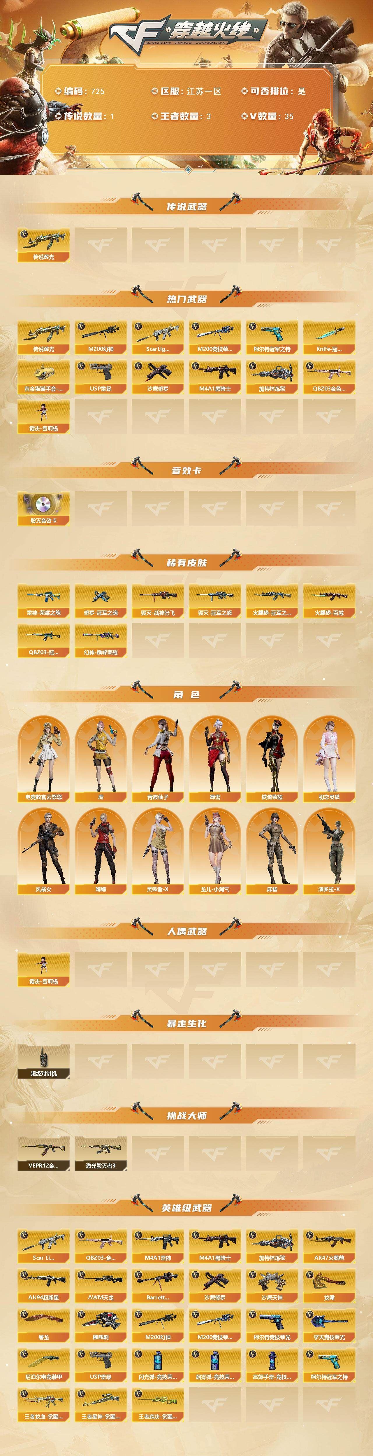 R49105 可二次江苏一区-35V-3王者-【传说武器】:传说辉光【热门武器】:传说辉光,QBZ03-金色蔷薇,Scar Light-白虎,M200-幻神,M200-竞技荣光,柯尔特-冠军之特*3,M4A1-黑骑士,加特林-炼狱,裁决-雪莉杨,USP-雷暴,沙鹰-修罗,Knife-冠军之刃,黄金猫猫手套-白鲨【音效卡】:Barrett-毁灭音效卡【皮肤】:幻神-巅峰荣耀,QBZ03-冠军之薇,雷神-荣耀之魄,火麒麟-冠军之心,火麒麟-百城,毁灭-冠军之怒,毁灭-战神张飞,修罗-冠军之魂【角色】:四防电竞教官-云悠悠,四防鹰,初恋灵狐,风暴女,娟娟,灵狐者-X,龙儿-小淘气,麻雀,潘多拉-X,青霞仙子,蜀雪,铁骑荣耀【人偶武器】:裁决-雪莉杨【暴走生化】:超级对讲机【挑战大师】:VEPR-12-金魔,激光毁灭者III【英雄级武器】:AK47-火麒麟,M4A1-雷神,M4A1-黑骑士,AN94-超新星,Scar Light-白虎,QBZ03-金色蔷薇,王者龙血-觉醒版,AWM-天龙,Barrett-毁灭,M200-幻神,M200-竞技荣光,王者星神-觉醒版,王者森决-觉醒版,加特林-炼狱,沙鹰-修罗,沙鹰-天神,USP-雷暴,柯尔特-冠军之特*3,柯尔特-竞技荣光,屠龙,龙啸,麒麟刺,擎天-竞技荣光,尼泊尔-电竞装甲,高爆手雷-竞技荣光*3,闪光弹-竞技荣光*4,烟雾弹-竞技荣光*2【道具】:BS战队炫彩背包,老虎背包,绿色巨人,灵魂忍者,迷雾幽灵,夺命之镰,防化服*2,防弹头盔*3,防弹衣*3,C4工具钳*3,手雷包*3,各种道具详情看截图、低价出售找回包 赔、截图展示段位不代 表实际段位,如赛季更新等不可抗拒因素发生变化、时限道具不保证所剩时间、标题未写送点劵默认不送【卖号买号首选亿梦】
