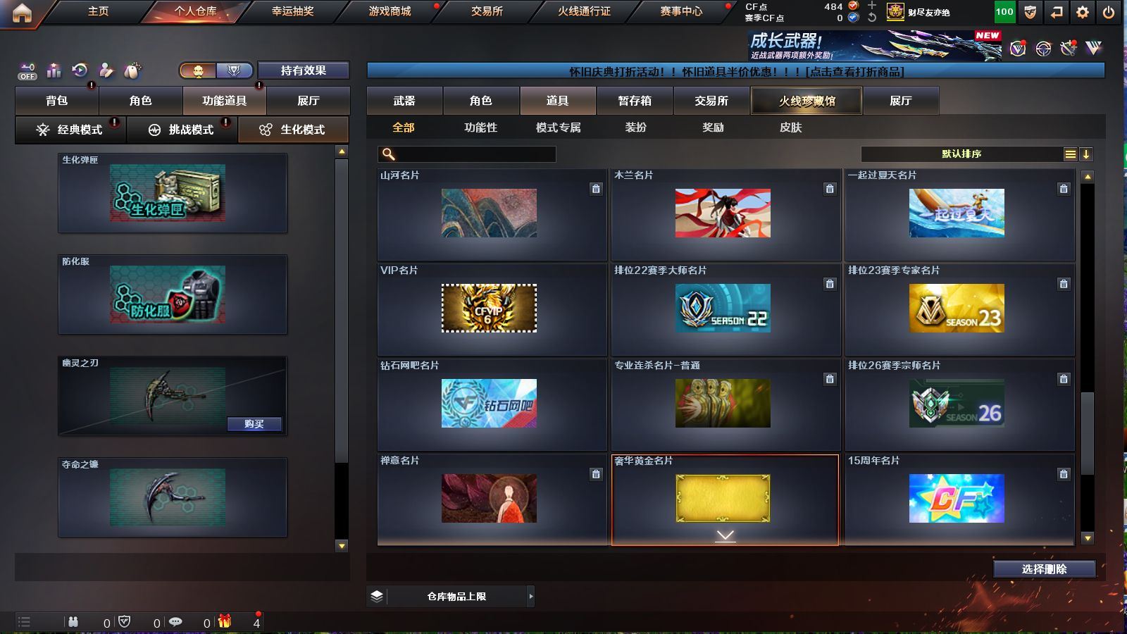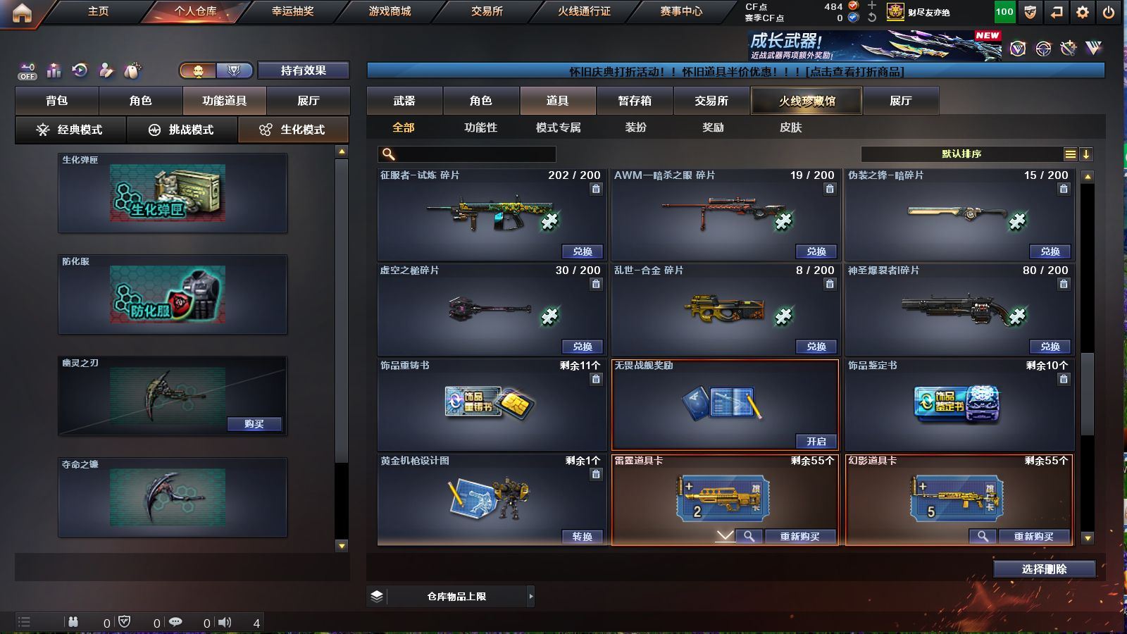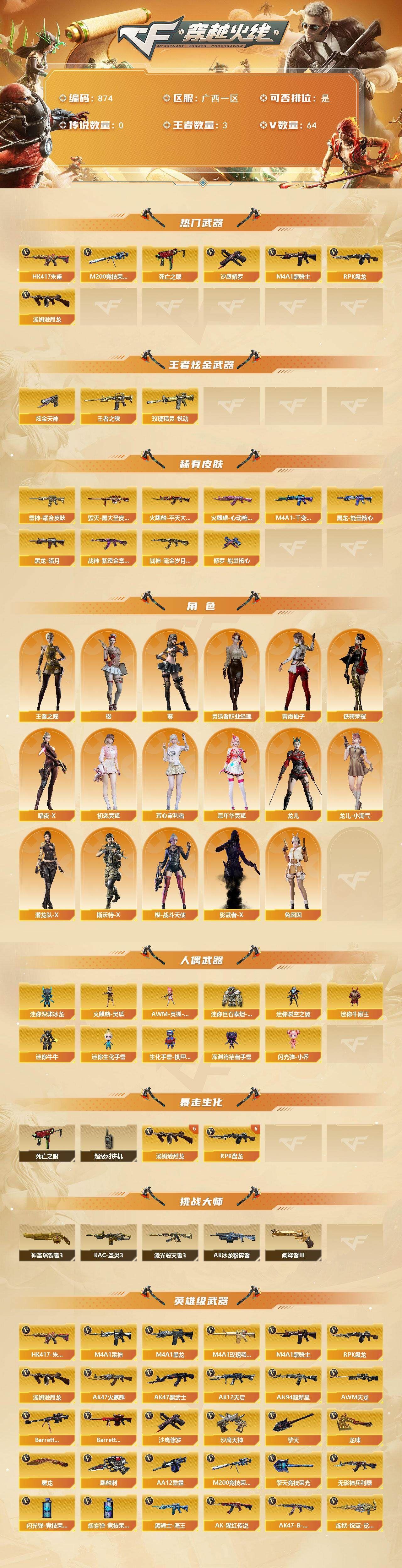 r49442 可二次广西一区-64V-3王者-1炫金【热门武器】:HK417-朱雀,M200-竞技荣光,死亡之眼*2,M4A1-黑骑士*3,汤姆逊-烈龙*6,RPK-盘龙*6,沙鹰-修罗*5【王者炫金武器】:玫瑰精灵-悦动,王者之魄,炫金天神【皮肤】:雷神-耀金皮肤,火麒麟-平天大圣,火麒麟-心动糖果,毁灭-黑大圣皮肤,M4A1-千变-孔明皮肤,黑龙-能量核心,黑龙-暗月*2,战神-紫绶金章皮肤,战神-流金岁月皮肤,修罗-能量核心【角色】:葵,樱,王者之瞳,暗夜-X,初恋灵狐,芳心审判者,嘉年华灵狐,灵狐者-职业经理,龙儿,龙儿-小淘气,潜龙队-X,青霞仙子,斯沃特-X,铁骑荣耀,兔囡囡,樱-战斗天使,影武者-X【人偶武器】:火麒麟-灵狐,AWM-灵狐-15周年嘉年华,迷你深渊冰龙*2,迷你裂空之翼*2,迷你牛魔王,迷你牛牛*2,迷你生化手雷,生化手雷-机甲核心,深渊终结者手雷*2,闪光弹-小乔*2,迷你巨石泰坦-魔花研究所【暴走生化】:死亡之眼*2,超级对讲机【挑战大师】:神圣爆裂者III,AK47-冰龙粉碎者,激光毁灭者III*2,KAC-圣炎切割者III,阐释者III【英雄级武器】:AK47-火麒麟*2,M4A1-黑龙,M4A1-雷神*2,M4A1-黑骑士*3,AK47-黑武士,AK12-天启,AN94-超新星,HK417-朱雀,无影-神兵利器,M4A1-玫瑰精灵,AK-47-猩红传说,AK47-B-战神,黑骑士-海王*3,AWM-天龙*3,Barrett-毁灭*2,Barrett-极光,M200-竞技荣光,RPK-盘龙*6,炼狱-悦蓝-觉醒版,汤姆逊-烈龙*6,AA-12-雷霆,沙鹰-修罗*5,沙鹰-天神,屠龙,龙啸,擎天,麒麟刺,擎天-竞技荣光,高爆手雷-雷霆,高爆手雷-夜魔,高爆手雷-幻灵,闪光弹-雷霆,闪光弹-夜魔,闪光弹-竞技荣光,烟雾弹-雷霆,烟雾弹-夜魔,烟雾弹-竞技荣光【道具】:XROCK炫彩背包,冰冰企鹅背包-猛男专用,战舰背包,炫彩背包,虎牙炫彩背包,超级背包,黄金魔花研究所背包,灵魂忍者,变异宝贝,妖姬,生化弹匣,夺命之镰*2,防化服,星辰流光-枪王排位,炽雪表情,防弹头盔*8,防弹衣*6,C4工具钳*3,手雷包*3【特殊枪械】:3黑骑士,6烈龙,6盘龙各种道具详情看截图、低价出售找回包 赔、截图展示段位不代 表实际段位,如赛季更新等不可抗拒因素发生变化、时限道具不保证所剩时间、标题未写送点劵默认不送【卖号买号首选亿梦】