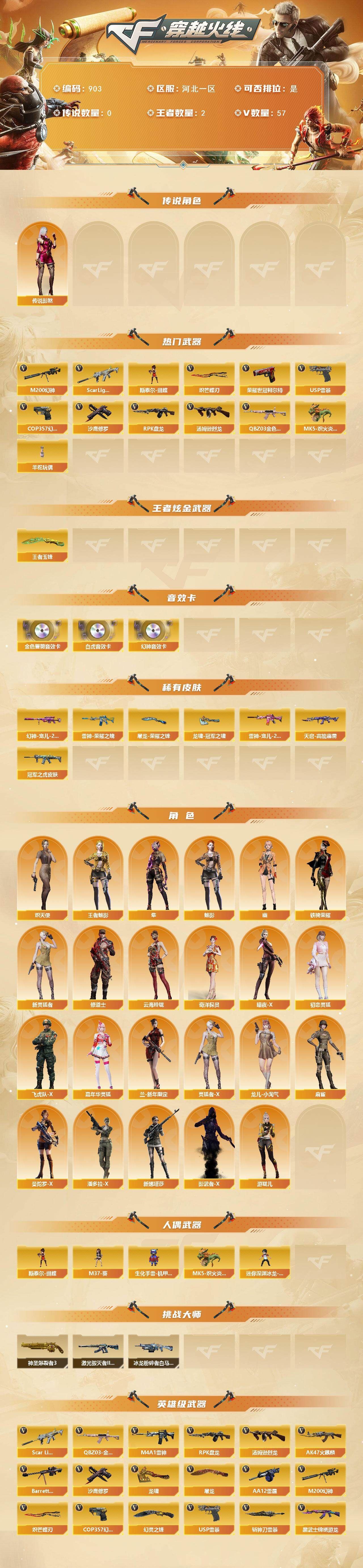 r49610 可二次 QQ 河北一区-57V-2王者【传说角色】:传说影煞【热门武器】:QBZ03-金色蔷薇,Scar Light-白虎,M200-幻神,荣耀世冠-柯尔特*2,汤姆逊-烈龙,RPK-盘龙,斯泰尔-蝴蝶,MK5-炽火炎龙,羊驼玩偶,USP-雷暴,COP 357-幻灵,沙鹰-修罗,炽芒蝶刃【王者炫金武器】:王者玉锋【音效卡】:M200-幻神音效卡,QBZ03-金色蔷薇音效卡,Scar Light-白虎音效卡【皮肤】:幻神-宠儿-2021MVP,ScarLight-白虎-冠军之虎皮肤,雷神-荣耀之魄,雷神-宠儿-2019MVP,天启-高能霹雳 皮肤,屠龙-荣耀之锋,龙啸-冠军之啸【角色】:魅影,隼,王者-魅影,奇洋探员,修道士,云海玲珑,炽天使,暗夜-X,初恋灵狐,飞虎队-X,嘉年华灵狐,兰-新年限定,灵狐者-X,龙儿-小淘气,麻雀,曼陀罗-X,潘多拉-X,铁骑荣耀,新灵狐者,新娜塔莎,影武者-X,幽,游珑儿【人偶武器】:MK5-炽火炎龙,斯泰尔-蝴蝶,M37-葵,生化手雷-机甲核心,迷你深渊冰龙-王绿豆【挑战大师】:神圣爆裂者III,冰龙粉碎者-白马银枪,激光毁灭者III-白马银枪*2【英雄级武器】:AK47-火麒麟,M4A1-雷神,Scar Light-白虎,黑武士-锦绣游龙,超新星-热带奇洋,QBZ03-金色蔷薇,Barrett-毁灭,M200-幻神,RPK-盘龙,汤姆逊-烈龙,烈龙-云海游龙,AA-12-雷霆,沙鹰-修罗,USP-雷暴,COP 357-幻灵,荣耀世冠-柯尔特*2,修罗-云海游龙,屠龙,龙啸,幻灵之锋,炽芒蝶刃,擎天-云海游龙,龙啸-热带奇洋,斩神刀-雷暴,高爆手雷-雷暴*4,高爆手雷-幻灵*3,手雷-云海游龙,手雷-热带奇洋,闪光弹-雷暴*4,闪光弹-幻灵*2,闪光弹-云龙,烟雾弹-雷暴*4,烟雾弹-幻灵*3,烟雾弹-雷霆王者-觉醒版【道具】:BS战队炫彩背包,CFPL炫彩背包,云山科技背包,云海游龙炫彩背包,奇洋探员-海龟背包,女皇终结者-背包,炫彩背包-诺拉,炫彩背包,热带奇洋炫彩背包,女皇终结者-魔龙之吻,绿色巨人,灵魂忍者*2,变异宝贝,迷雾幽灵,生化弹匣,夺命之镰,防化服*3,金色流光-枪王排位,星辰流光-枪王排位,巅峰赛先锋-金色流光,流光-鎏金之域,枪王排位28赛季金色流光,枪王排位29赛季金色流光,热带奇洋表情,云海游龙表情,EP战队名片,EP战队喷图,EP战队击杀图标,防弹头盔*3,防弹衣*3,C4工具钳*3,手雷包*3【特殊枪械】:蝴蝶斯泰尔+1烈龙,1白虎,1烈龙,1盘龙,1蝴蝶斯泰尔 《永久ac 永久工具钳 永久手雷包》各种道具详情看截图、低价出售找回包 赔、截图展示段位不带表实际段位,如赛季更新等不可抗拒因素发生变化、时限道具不保证所剩时间、标题未写送点券默认不送【卖号买号首选亿梦】