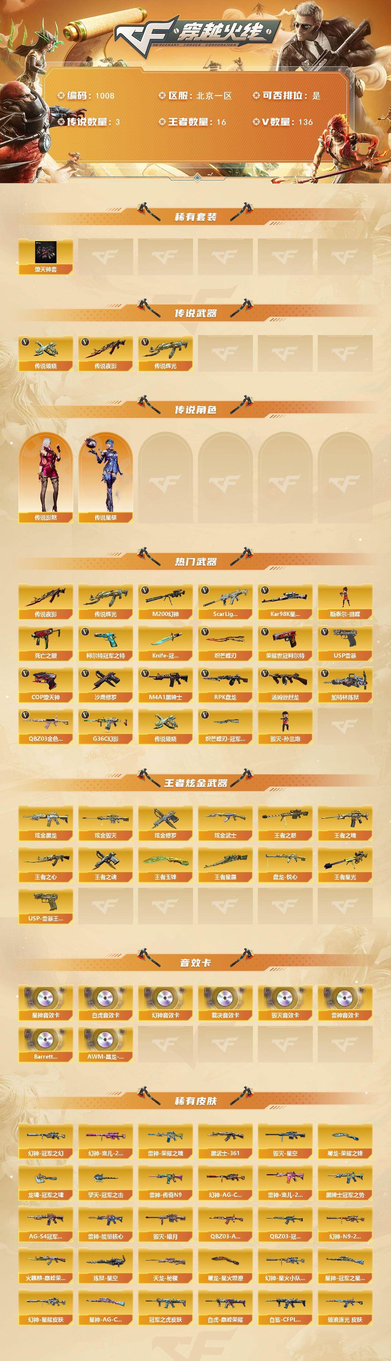 R49873 可二次北京一区可排位-141V-14王者-4炫金【传说武器】:传说辉光,传说夜影,传说破晓【传说角色】:传说星骇,四防传说影煞【热门武器】:传说夜影,传说辉光,传说破晓,M200-幻神+幻神-冠军之幻+幻神-AG-CFPLS17冠军+幻神-宠儿-2021MVP+M200-幻神-N9-2022MVP+幻神-星耀皮肤+幻神-星火小队签名臻藏版 皮肤+幻神-荣耀世冠EP皮肤,G36C-幻影,QBZ03-金色蔷薇*2,Scar Light-白虎+白虎-冠军之虎皮肤+白虎-巅峰荣耀皮肤+白虎-白鲨-CFPLS23冠军,死亡之眼,柯尔特-冠军之特*2,荣耀世冠-柯尔特,Kar98K-星神,M4A1-黑骑士,汤姆逊-烈龙,RPK-盘龙,加特林-炼狱*3,斯泰尔-蝴蝶,毁灭-孙三炮*2,USP-雷暴,COP-堕天神*2,沙鹰-修罗*3,Knife-冠军之刃,炽芒蝶刃*3,炽芒蝶刃-冠军炽芒皮肤【稀有套装】:堕天神套【王者炫金武器】:王者之魄,王者之心*2,王者之怒*2,王者星霆,王者星光,盘龙-悦心*2,王者之魂,USP-雷暴王者,王者玉锋,炫金黑龙,炫金武士,炫金毁灭,炫金修罗【音效卡】:M200-幻神音效卡,M4A1-雷神音效卡,Barrett-毁灭音效卡,AWM-裁决音效卡,Scar Light-白虎音效卡,Kar98K-星神音效卡,Barrett-碧霄极光音效卡,AWM-昌龙-怀旧音效卡【皮肤】:QBZ03-冠军之薇,QBZ03-AG-CFPLS19冠军,金色蔷薇-破浪逐光 皮肤,QBZ03-荣耀世冠EP 皮肤,裁决-流光秘银,裁决-巅峰荣耀 皮肤,裁决-叶芒苍灵 皮肤,裁决-过载 皮肤,Kar98K-星神-AG-CFPLS21冠军皮肤,Kar98K-星神-冠军之星皮肤,雷神-暗月,雷神-能量核心,雷神-荣耀之魄,雷神-传奇N9,雷神-宠儿-2019MVP,M4A1-雷神-巅峰荣耀皮肤,M4A1-再燃火线,火麒麟-雷神,火麒麟-巅峰荣耀,毁灭-暗月*2,毁灭-星空,毁灭-英雄计划 皮肤,M4A1-千变-孔明皮肤,黑龙-能量核心,黑骑士-冠军之势,黑骑士-AG-S4冠军典藏,无影-暗月,无影-能量核心*2,AK47-黑武士-361,幻影-破浪逐光 皮肤,天龙-秘银*2,极光-能量核心*2,炼狱-星空,修罗-能量核心*2,屠龙-荣耀之锋,屠龙-星火燎原,屠龙-破浪逐光 皮肤,龙啸-冠军之啸,龙啸-巅峰荣耀 皮肤,轻型军用手斧-再燃火线,擎天-秘银,擎天-冠军之击,炽芒蝶刃-冠军炽芒皮肤,炽芒蝶刃-巅峰荣耀 皮肤【角色】:零,炫,迷迭香,电竞教官-云悠悠,关小雨,隼,四防妮妮,战地猎狐,四防王者春,王者-迷迭香,四防王者沙漠玫瑰,四防王者雨墨,奇洋探员,乔伊教练,修道士,云海玲珑,暗夜-X,初恋灵狐,芳心审判者,飞虎队-X,风暴女,零-水下丽影,潘多拉-X,铁骑荣耀,影武者-X,游珑儿,海豹突击队【人偶武器】:毁灭-孙三炮*2,斯泰尔-蝴蝶,巴雷特-零-水下丽影,M37-葵,COP-旗袍,迷你牛牛,生化手雷-机甲核心,灵狐娃娃手雷【暴走生化】:死亡之眼,超级对讲机【挑战大师】:神圣爆裂者III*3,激光毁灭者III【英雄级武器】:M4A1-千变,AK47-火麒麟,M4A1-黑龙,M4A1-雷神*3,M4A1-黑骑士,AK47-无影,AK47-黑武士,AK12-天启,M4A1-武圣,AK47-黑鲨,M4A1-堕天神,Scar Light-白虎,G36C-幻影,黑武士-锦绣游龙,超新星-热带奇洋,QBZ03-金色蔷薇*2,王者玄武-觉醒版,AWM-天龙,Barrett-毁灭,Barrett-极光,AWM-裁决,M200-幻神,Kar98K-星神,王者之怒-觉醒版,RPK-盘龙,加特林-炼狱*3,汤姆逊-烈龙,沙鹰-修罗*3,沙鹰-天神*2,USP-雷暴,COP-雷霆,COP-堕天神*2,柯尔特-冠军之特*2,柯尔特-无冕之王,荣耀世冠-柯尔特,柯尔特-荣耀世冠EP,Glock18-武圣,屠龙*2,龙啸,麒麟刺-堕天神【道具】:BS战队炫彩背包,CFPL炫彩背包,CFS限定背包,EP战队炫彩背包,奇洋探员-海龟背包,战舰背包,炫彩背包-诺拉,炫彩背包,热带奇洋炫彩背包,百战金芒炫彩背包,老虎背包,背包-洛丽塔,超级背包,女皇终结者-魔龙之吻,绿色巨人,灵魂忍者*2,变异宝贝,迷雾幽灵*2,夺命之镰,防化服*3,防弹头盔*4,防弹衣*4,C4工具钳*3,手雷包*3,各种道具详情看截图、低价出售找回包 赔、截图展示段位不代 表实际段位,如赛季更新等不可抗拒因素发生变化、时限道具不保证所剩时间、标题未写送点劵默认不送【卖号买号首选亿梦】