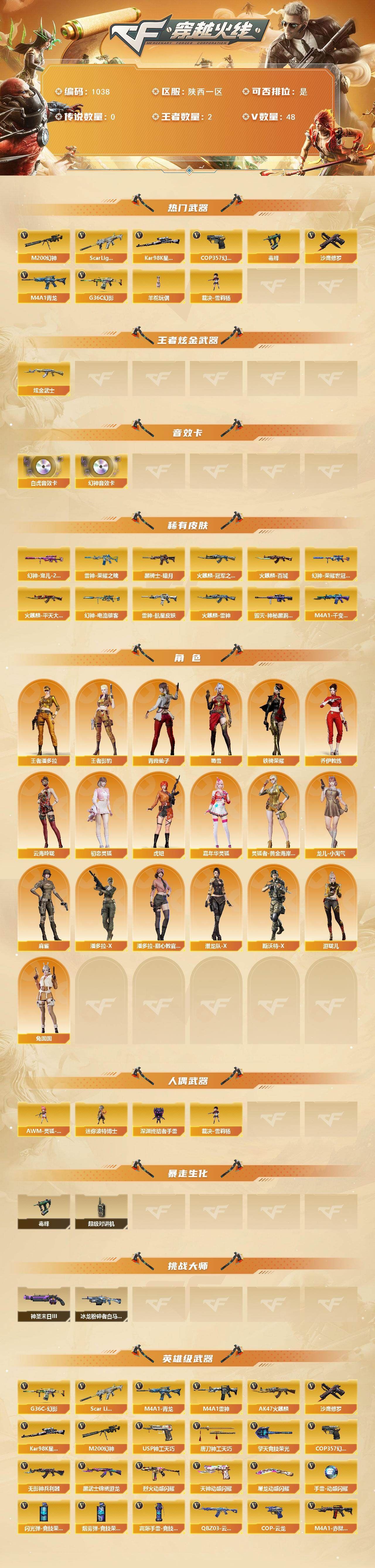 R49966 可二次陕西一区可排位-49V-2王者-1炫金【热门武器】:M200-幻神,Kar98K-星神,G36C-幻影,Scar Light-白虎,M4A1-青龙,毒蜂,羊驼玩偶,裁决-雪莉杨,COP 357-幻灵,沙鹰-修罗*3【王者炫金武器】:炫金武士【音效卡】:M200-幻神音效卡,Scar Light-白虎音效卡【皮肤】:幻神-宠儿-2021MVP,M200-幻神-荣耀世冠白鲨,幻神-电流骇客 皮肤,雷神-荣耀之魄,雷神-航星皮肤,火麒麟-雷神,火麒麟-冠军之心,火麒麟-平天大圣,火麒麟-百城,毁灭-神秘黑洞皮肤,M4A1-千变-孔明皮肤,黑骑士-暗月【角色】:王者影豹,王者潘多拉,乔伊教练,云海玲珑,初恋灵狐,虎妞,嘉年华灵狐,灵狐者-黄金海岸,龙儿-小淘气,麻雀,潘多拉-X,潘多拉-甜心教官,潜龙队-X,青霞仙子,斯沃特-X,蜀雪,铁骑荣耀,兔囡囡,游珑儿【人偶武器】:裁决-雪莉杨,AWM-灵狐-15周年嘉年华,迷你波特博士,深渊终结者手雷【暴走生化】:毒蜂,超级对讲机【挑战大师】:冰龙粉碎者-白马银枪*2,神圣爆裂者-末日III【英雄级武器】:AK47-火麒麟,M4A1-雷神,M4A1-青龙,Scar Light-白虎,无影-神兵利器,G36C-幻影,QBZ03-云龙,黑武士-锦绣游龙,烈火-动感闪耀,王者之势-觉醒版,王者芳薇-觉醒版,M200-幻神,Kar98K-星神,沙鹰-修罗*3,COP 357-幻灵,COP 357-云龙,USP-神工天巧,天神-动感闪耀,擎天-竞技荣光,唐刀-神工天巧*3,屠龙-动感闪耀,高爆手雷-幻灵,高爆手雷-竞技荣光*4,高爆手雷-神工天巧*2,手雷-动感闪耀,手雷-云海游龙,闪光弹-幻灵,闪光弹-竞技荣光*3,闪光弹-神工天巧*3,闪光弹-云龙,烟雾弹-幻灵,烟雾弹-竞技荣光*3,烟雾弹-神工天巧*2,烟雾弹-云龙,M4A1-赤狱骑士【道具】:全能枪王背包,救世主-黑桃战神,绿色巨人,灵魂忍者,迷雾幽灵,夺命之镰,防化服*2,金色流光-枪王排位*2,星辰流光-枪王排位,枪王排位28赛季金色流光,动感闪耀表情,防弹头盔*6,防弹衣*6,C4工具钳*6,手雷包*6,各种道具详情看截图、低价出售找回包 赔、截图展示段位不代 表实际段位,如赛季更新等不可抗拒因素发生变化、时限道具不保证所剩时间、标题未写送点劵默认不送【卖号买号首选亿梦】