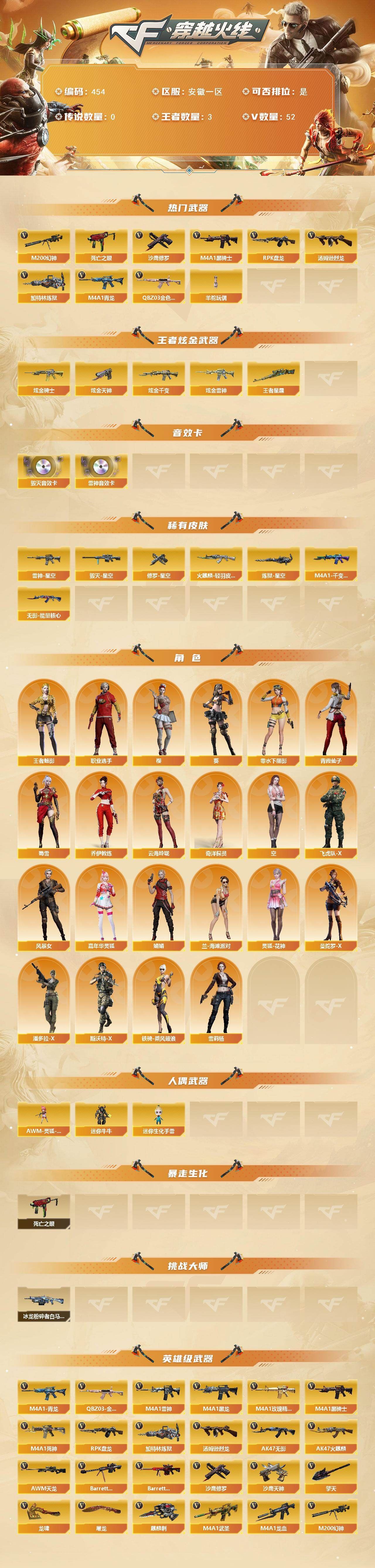 R48346 可二次安徽一区可排位-55V-2王者-4炫金【热门武器】:QBZ03-金色蔷薇,M4A1-青龙,M200-幻神,死亡之眼,M4A1-黑骑士,汤姆逊-烈龙,RPK-盘龙*3,加特林-炼狱*3,羊驼玩偶,沙鹰-修罗【王者炫金武器】:王者星霆,炫金骑士,炫金千变,炫金雷神,炫金天神【音效卡】:M4A1-雷神音效卡,Barrett-毁灭音效卡【皮肤】:雷神-星空,火麒麟-轻羽皮肤,毁灭-星空,M4A1-千变-孔明皮肤,无影-能量核心,炼狱-星空,修罗-星空【角色】:葵,樱,王者-魅影,奇洋探员,乔伊教练,云海玲珑,空,飞虎队-X,风暴女,嘉年华灵狐,娟娟,兰-海滩派对,零-水下丽影,灵狐-花神,曼陀罗-X,潘多拉-X,青霞仙子,斯沃特-X,蜀雪,铁骑-乘风破浪,雪莉杨,职业选手【人偶武器】:AWM-灵狐-15周年嘉年华,迷你牛牛,迷你生化手雷【暴走生化】:死亡之眼【挑战大师】:冰龙粉碎者-白马银枪【英雄级武器】:AK47-火麒麟,M4A1-黑龙,M4A1-雷神,M4A1-黑骑士,AK47-无影*2,M4A1-死神,M4A1-武圣,AK47-黑鲨,M4A1-龙血*3,M4A1-青龙,无影-神兵利器,黑武士-锦绣游龙,超新星-热带奇洋,M4A1-玫瑰精灵,QBZ03-金色蔷薇,王者之心-觉醒版,黑骑士-海王,AWM-天龙,Barrett-毁灭,Barrett-极光,M200-幻神,RPK-盘龙*3,加特林-炼狱*3,汤姆逊-烈龙,烈龙-云海游龙,沙鹰-修罗,沙鹰-天神*3,屠龙*8,龙啸,擎天,麒麟刺*2,擎天-云海游龙,龙啸-热带奇洋,屠龙-云海游龙,手雷-云海游龙,手雷-热带奇洋,M4A1-赤狱骑士【道具】:BS战队炫彩背包,云海游龙炫彩背包,亚洲杯纪念炫彩背包,全能枪王背包,奇洋探员-海龟背包,炫彩背包,热带奇洋炫彩背包,哔哩哔哩名片,女皇终结者-魔龙之吻,救世主-黑桃战神,绿色巨人,灵魂忍者*2,变异宝贝,迷雾幽灵*3,生化弹匣,夺命之镰,防化服*2,金色流光-枪王排位*2,星辰流光-枪王排位,枪王排位28赛季金色流光,枪王排位29赛季金色流光,热带奇洋表情,云海游龙表情,C4-红龙,防弹头盔*5,防弹衣*6,C4工具钳*5,手雷包*6【特殊枪械】:1黑骑士,1烈龙,3盘龙,3炼狱,各种道具详情看截图、低价出售找回包 赔、截图展示段位不代 表实际段位,如赛季更新等不可抗拒因素发生变化、时限道具不保证所剩时间、标题未写送点劵默认不送【卖号买号首选亿梦】
