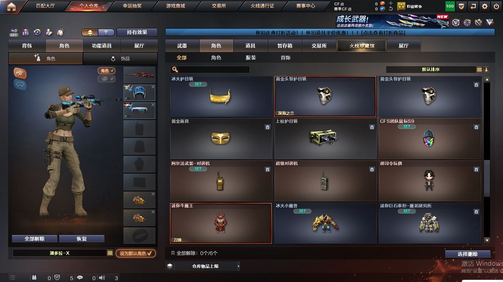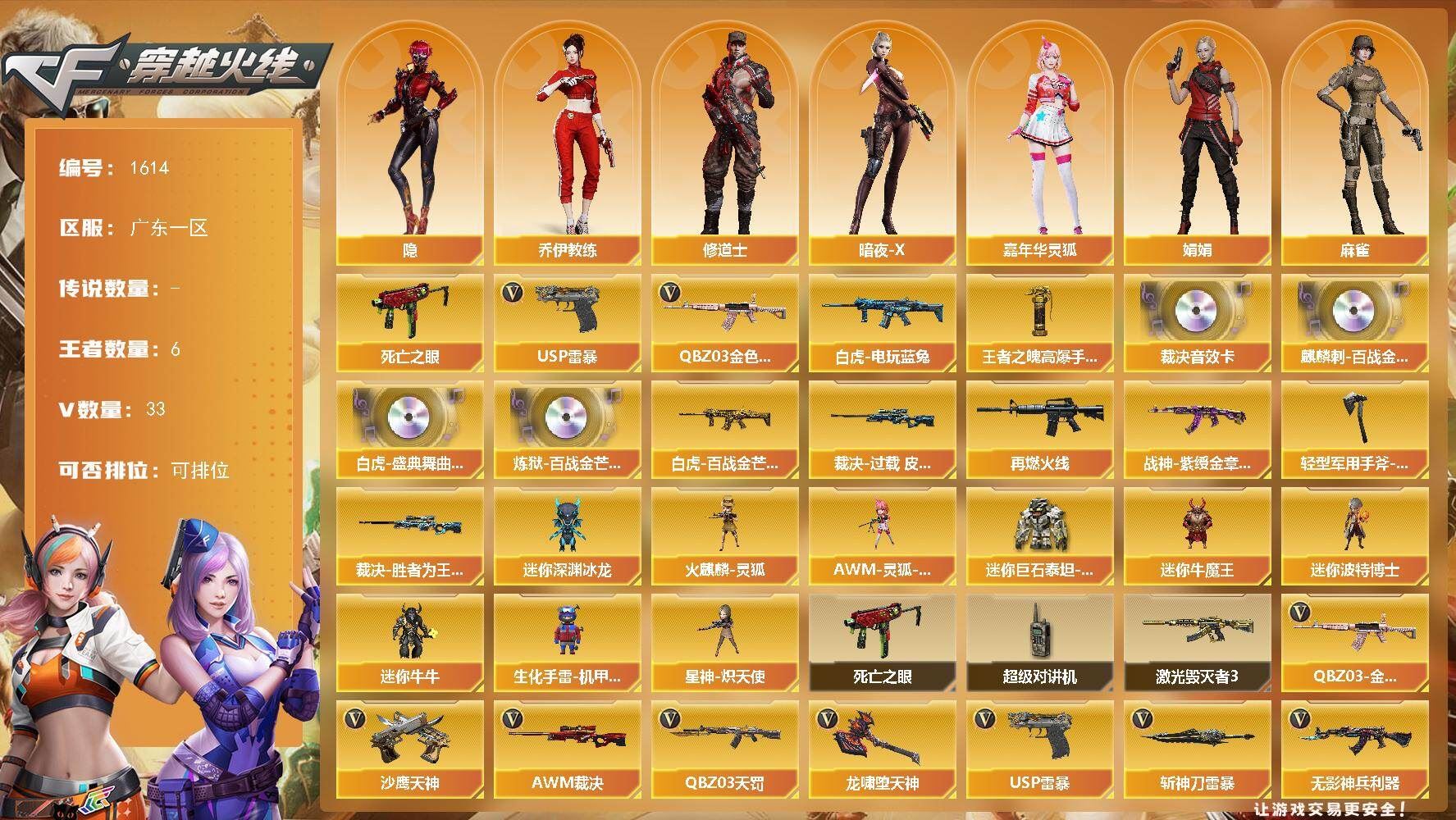 r51844 可二次可排位广东一区-33V【热门武器】:QBZ03-金色蔷薇,死亡之眼,白虎-电玩蓝兔,USP-雷暴【王者炫金武器】:王者之魄高爆手雷【音效卡】:AWM-裁决音效卡,麒麟刺-百战金芒-盛典舞曲音效卡,白虎-盛典舞曲音效卡,炼狱-百战金芒-庆典舞曲音效卡【皮肤】:白虎-百战金芒 皮肤,裁决-过载 皮肤,裁决-胜者为王 皮肤,M4A1-再燃火线,战神-紫绶金章皮肤*2,轻型军用手斧-再燃火线【角色】:隐,乔伊教练,修道士,暗夜-X,嘉年华灵狐,娟娟,麻雀,曼陀罗-X,潘多拉-X,潘多拉-甜心教官,潜龙队-X,智影【人偶武器】:星神-炽天使,火麒麟-灵狐*2,AWM-灵狐-15周年嘉年华,迷你深渊冰龙,迷你牛魔王,迷你波特博士,迷你牛牛,生化手雷-机甲核心,迷你巨石泰坦-魔花研究所【暴走生化】:死亡之眼,超级对讲机【挑战大师】:激光毁灭者III【英雄级武器】:QBZ03-天罚,无影-神兵利器,FAMAS G2-天戎,QBZ03-金色蔷薇,AK-47-猩红传说*4,QBZ-03-王者蔷薇-觉醒版,白虎-电玩蓝兔,王者猎神-觉醒版,AWM-裁决,王者之怒-觉醒版,王者星神-觉醒版,炼狱-百战金芒,沙鹰-天神,USP-雷暴,龙啸-堕天神,斩神刀-雷暴,麒麟刺-百战金芒,高爆手雷-雷暴,高爆手雷-堕天神,闪光弹-雷暴,闪光弹-堕天神,闪光弹-玄豹,烟雾弹-雷暴,烟雾弹-堕天神,烟雾弹-荣耀世冠EP,M4A1-苍鸣雷神【道具】:云山科技背包,亚洲杯纪念炫彩背包,全能枪王背包,百战金芒炫彩背包,超级背包,女皇终结者-魔龙之吻,绿色巨人,灵魂忍者*3,变异宝贝,妖姬,迷雾幽灵,夺命之镰,防化服*3,金色流光-枪王排位*2,枪王排位29赛季金色流光,语音特效-盛典烟火,萌萌小葵表情,防弹头盔*10,防弹衣*10,C4工具钳*9,手雷包*8,各种道具详情看截图、低价出售找回包 赔、截图展示段位不代 表实际段位,如赛季更新等不可抗拒因素发生变化、时限道具不保证所剩时间、标题未写送点劵默认不送【卖号买号首选亿梦】