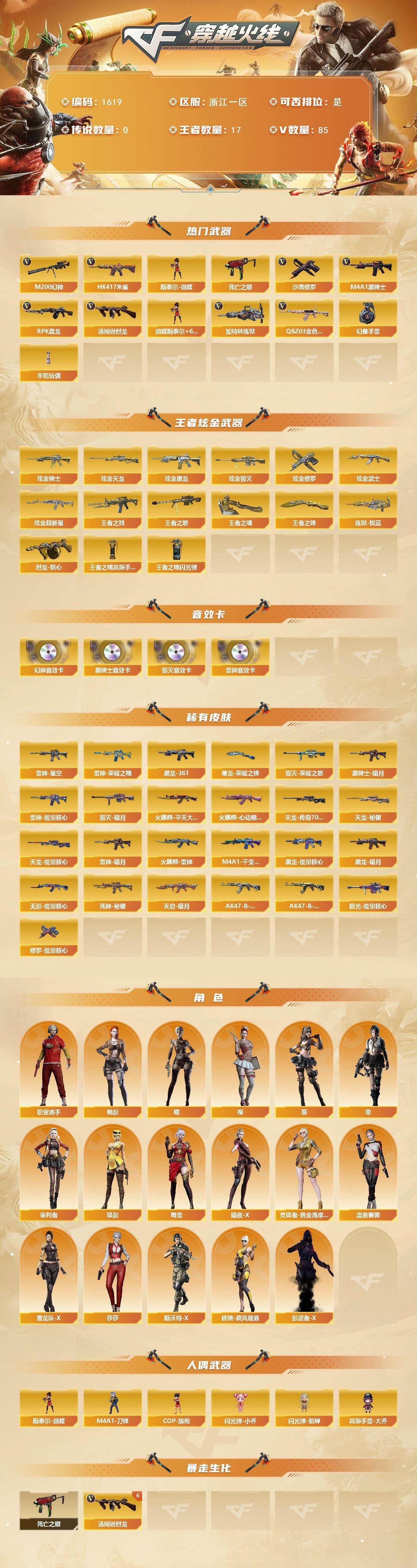 R51874 可二次浙江一区可排位-85V-17王者-7炫金【热门武器】:QBZ03-金色蔷薇,HK417-朱雀,M200-幻神,死亡之眼,M4A1-黑骑士*2,汤姆逊-烈龙*6,RPK-盘龙*4,加特林-炼狱*2,斯泰尔-蝴蝶,羊驼玩偶,沙鹰-修罗,高爆手雷-幻兽*4【王者炫金武器】:王者之戮,王者之怒,炼狱-悦蓝*3,烈龙-悦心,王者之啸,王者之锋*2,炫金骑士,炫金黑龙,炫金武士,炫金超新星,炫金毁灭,炫金天龙,炫金修罗,王者之魄高爆手雷,王者之魄闪光弹【音效卡】:M200-幻神音效卡,M4A1-雷神音效卡,M4A1-黑骑士音效卡,Barrett-毁灭音效卡【皮肤】:雷神-暗月,雷神-能量核心,雷神-荣耀之魄,雷神-星空,火麒麟-雷神,火麒麟-平天大圣,火麒麟-心动糖果,毁灭-暗月*5,毁灭-荣耀之怒,M4A1-千变-孔明皮肤,黑龙-能量核心,黑龙-暗月*2,M4A1-黑龙-361,黑骑士-暗月,无影-能量核心,死神-秘银,天启-暗月,AK47-B-常胜将军-刘备,AK47-B-常胜将军-孙权*2,天龙-秘银*2,天龙-能量核心,AWM-天龙-传奇70KG,极光-能量核心,修罗-能量核心,屠龙-荣耀之锋【角色】:零,葵,樱,瞳,魅影,审判者,狐影,暗夜-X,灵狐者-黄金海岸,流浪蔷薇,潜龙队-X,莎莎,斯沃特-X,蜀雪,铁骑-乘风破浪,影武者-X,职业选手【人偶武器】:斯泰尔-蝴蝶,COP-旗袍,M4A1-刀锋,闪光弹-小乔,闪光弹-貂蝉,高爆手雷-大乔【暴走生化】:死亡之眼【挑战大师】:神圣爆裂者III,冰龙粉碎者-白马银枪,激光毁灭者III,神圣爆裂者-末日III【英雄级武器】:M4A1-千变,AK47-火麒麟*2,M4A1-黑龙,M4A1-雷神,M4A1-黑骑士*2,AK47-无影,M4A1-死神,AK47-黑武士,M4A1-武圣,M4A1-龙血,HK417-朱雀,M4A1-玫瑰精灵,QBZ95-幻兽,QBZ03-金色蔷薇,M4A1-猎神,王者之心-觉醒版,王者之影-觉醒版,王者之武-觉醒版,王者之魄-觉醒版,AK47-B-战神,AK47-B-常胜将军,AWM-天龙,Barrett-毁灭,Barrett-极光*3,AWM-裁决,M200-幻神,Barrett-金色蔷薇,王者之怒-觉醒版,RPK-盘龙*4,加特林-炼狱*2,汤姆逊-烈龙*6,沙鹰-修罗,沙鹰-天神,破空枪刃,沙鹰-幻兽*4,王者之魂-觉醒版,Glock18-武圣,屠龙*2,龙啸*2,擎天*2,麒麟刺,女皇利刃-幻兽,高爆手雷-幻兽*4,高爆手雷-幻灵,闪光弹-幻兽*4,烟雾弹-幻兽*4【道具】:R.LGD炫彩背包,战舰背包,炫彩背包,老虎背包,背包-葫芦兄弟,超级背包*2,妩媚妖姬,变异宝贝,夺命之镰,防化服,语音特效-生化,CFPL选手表情-第1套,防弹头盔*4,防弹衣*4,C4工具钳*3,手雷包*2【特殊枪械】:蝴蝶斯泰尔+6烈龙,2黑骑士,6烈龙,4盘龙,2炼狱,1蝴蝶斯泰尔,各种道具详情看截图、低价出售找回包 赔、截图展示段位不代 表实际段位,如赛季更新等不可抗拒因素发生变化、时限道具不保证所剩时间、标题未写送点劵默认不送【卖号买号首选亿梦】