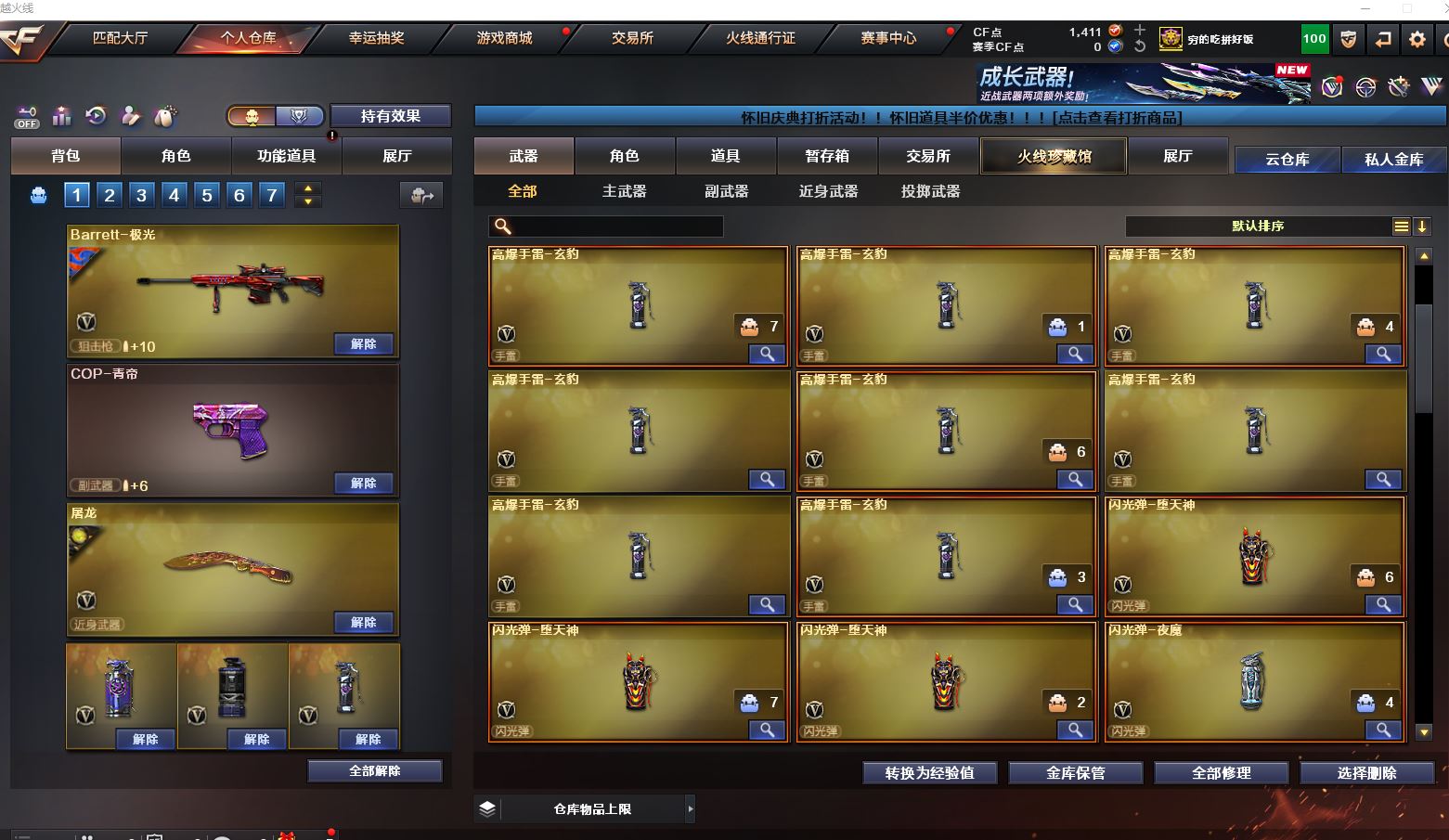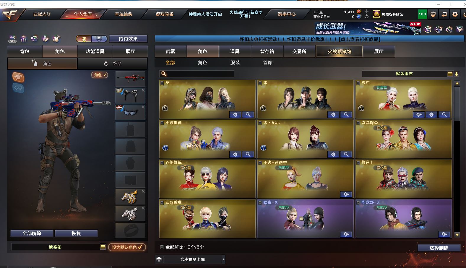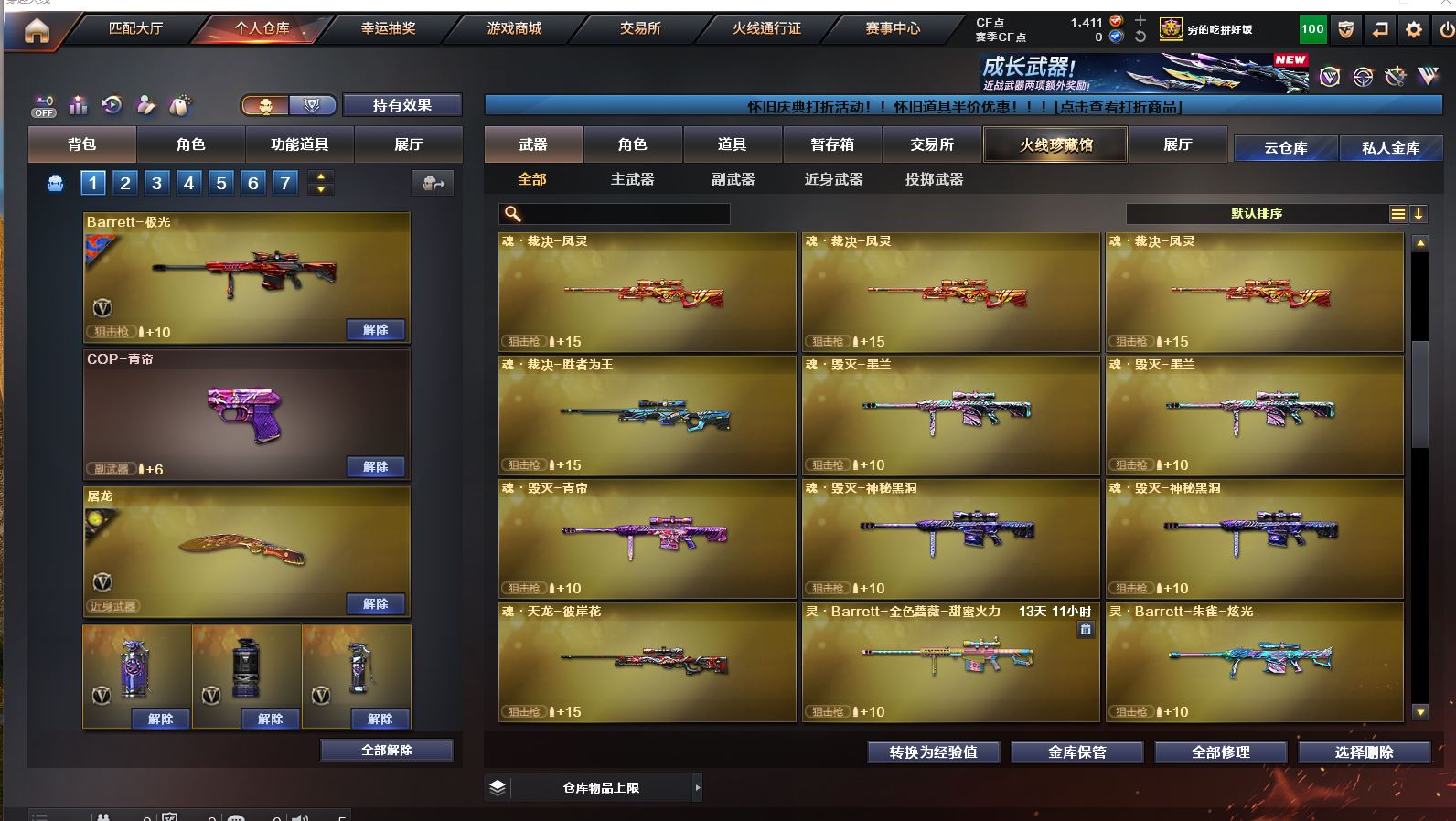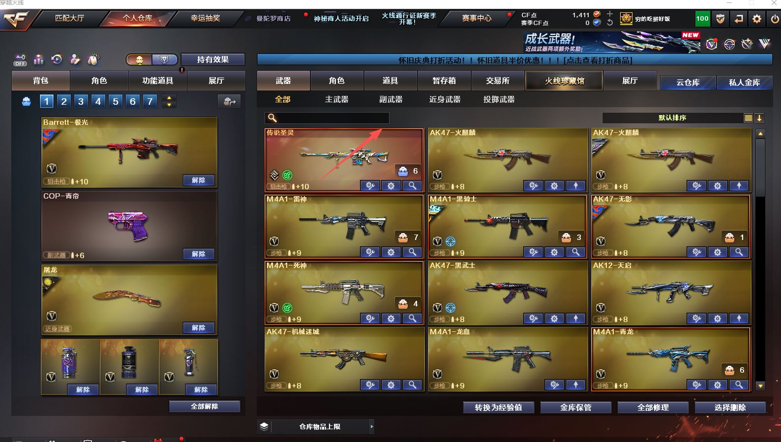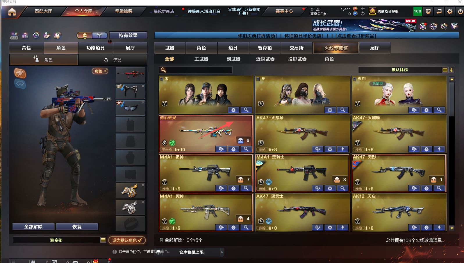 Lv.102段位传奇3,VIP6,100V,1传说,11王者,3炫金,1411CF点,游戏年龄9.3年;【传说武器1】:传说圣灵;【稀有套装1】:玄豹套装;【重要角色12】:玄豹/葵/零/不败狙神/王者-迷迭香/奇洋探员/云海玲珑/乔伊教练/超能女侍/修道士/铁骑荣耀/兰-限定版;【武器皮肤18】:毁灭-百城浙江/毁灭-墨兰/毁灭-风暴/毁灭-黑大圣*2/极光-能量核心/裁决-流光秘银/火麒麟-白虎/黑骑士-冠军之势/雷神-虎将/M4A1-千变-孔明/雷神-星空/火麒麟-轻羽/无影-能量核心/烈龙-星空/修罗-能量核心/屠龙-破浪逐光/屠龙-星火燎原;
