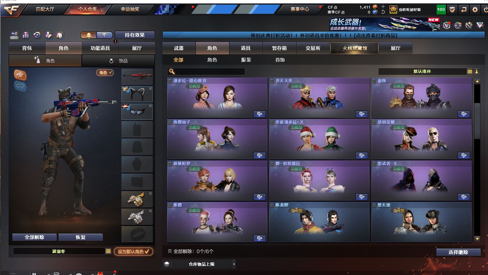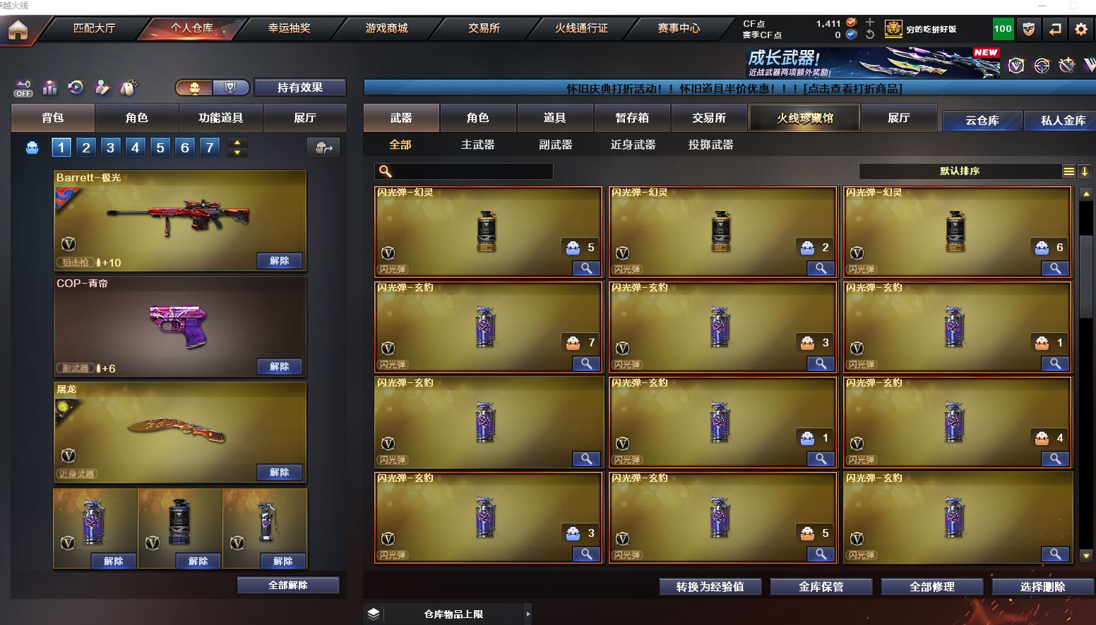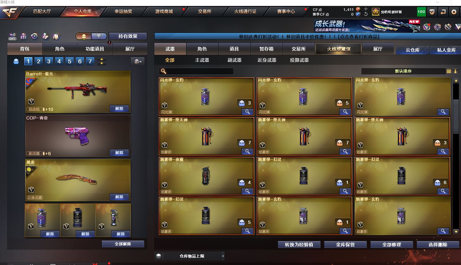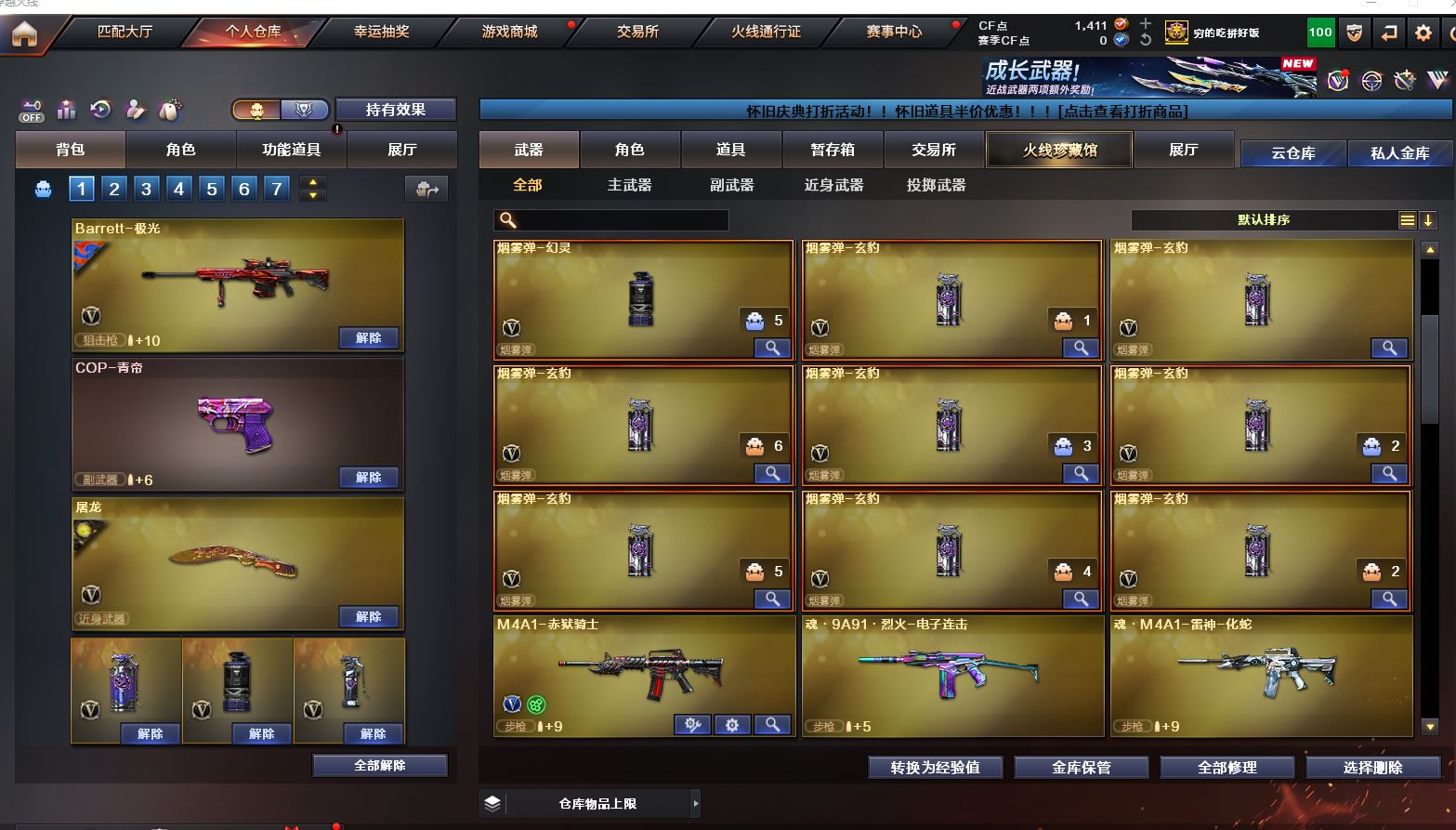 Lv.102段位传奇3,VIP6,100V,1传说,11王者,3炫金,1411CF点,游戏年龄9.3年;【传说武器1】:传说圣灵;【稀有套装1】:玄豹套装;【重要角色12】:玄豹/葵/零/不败狙神/王者-迷迭香/奇洋探员/云海玲珑/乔伊教练/超能女侍/修道士/铁骑荣耀/兰-限定版;【武器皮肤18】:毁灭-百城浙江/毁灭-墨兰/毁灭-风暴/毁灭-黑大圣*2/极光-能量核心/裁决-流光秘银/火麒麟-白虎/黑骑士-冠军之势/雷神-虎将/M4A1-千变-孔明/雷神-星空/火麒麟-轻羽/无影-能量核心/烈龙-星空/修罗-能量核心/屠龙-破浪逐光/屠龙-星火燎原;
