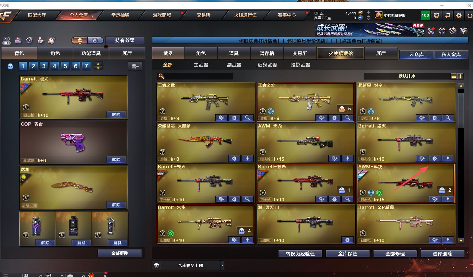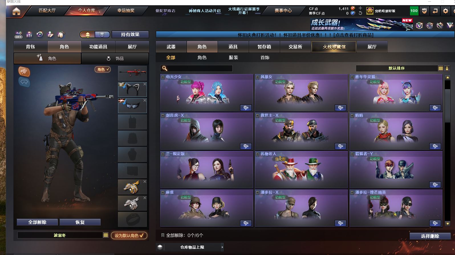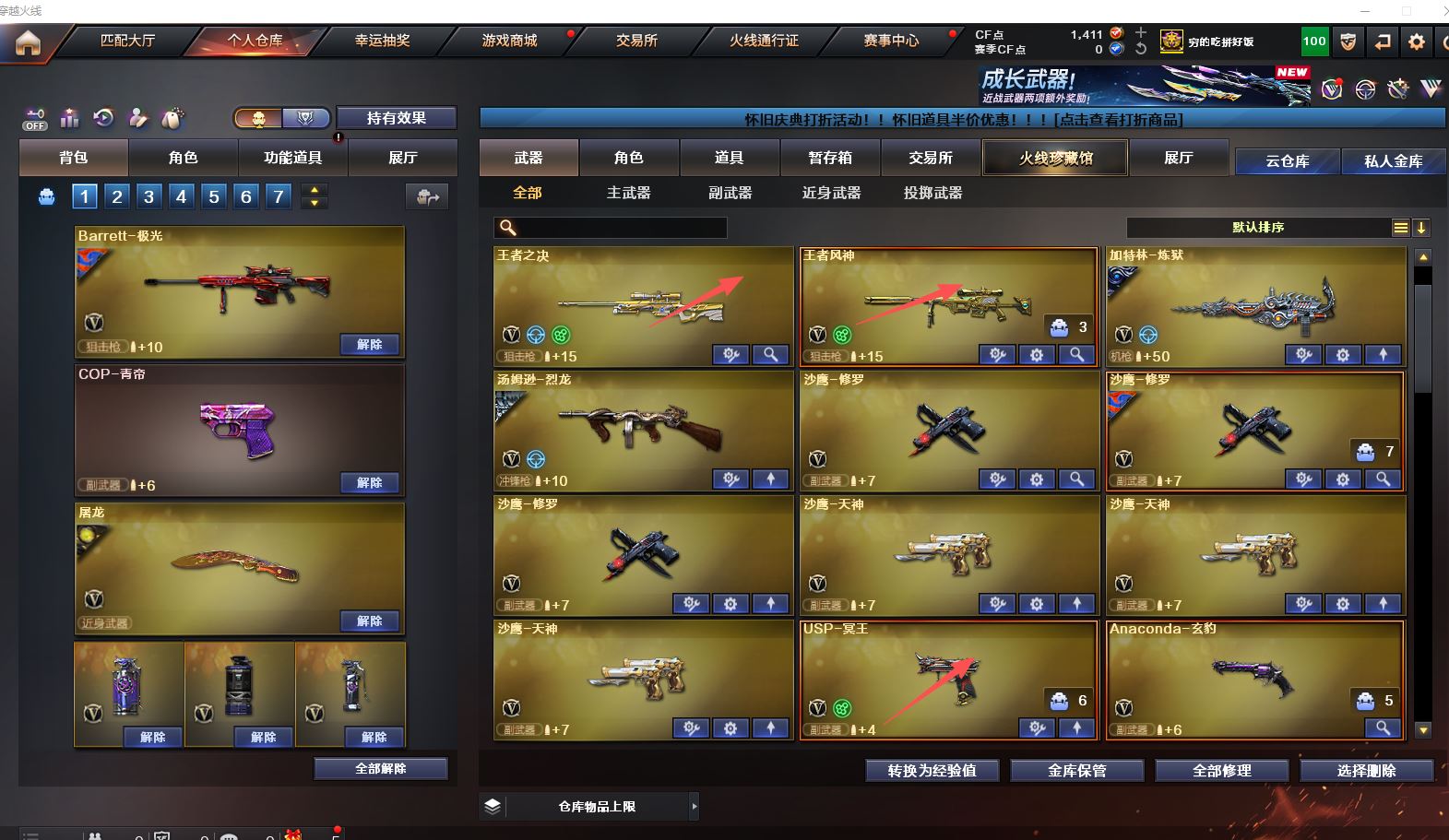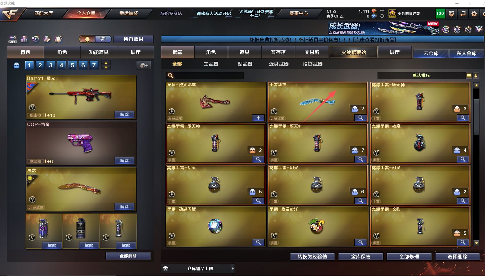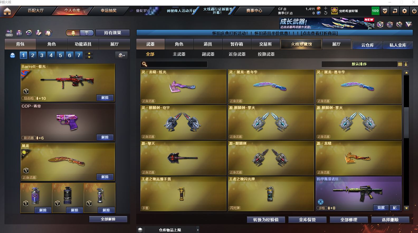 Lv.102段位传奇3,VIP6,100V,1传说,11王者,3炫金,1411CF点,游戏年龄9.3年;【传说武器1】:传说圣灵;【稀有套装1】:玄豹套装;【重要角色12】:玄豹/葵/零/不败狙神/王者-迷迭香/奇洋探员/云海玲珑/乔伊教练/超能女侍/修道士/铁骑荣耀/兰-限定版;【武器皮肤18】:毁灭-百城浙江/毁灭-墨兰/毁灭-风暴/毁灭-黑大圣*2/极光-能量核心/裁决-流光秘银/火麒麟-白虎/黑骑士-冠军之势/雷神-虎将/M4A1-千变-孔明/雷神-星空/火麒麟-轻羽/无影-能量核心/烈龙-星空/修罗-能量核心/屠龙-破浪逐光/屠龙-星火燎原;