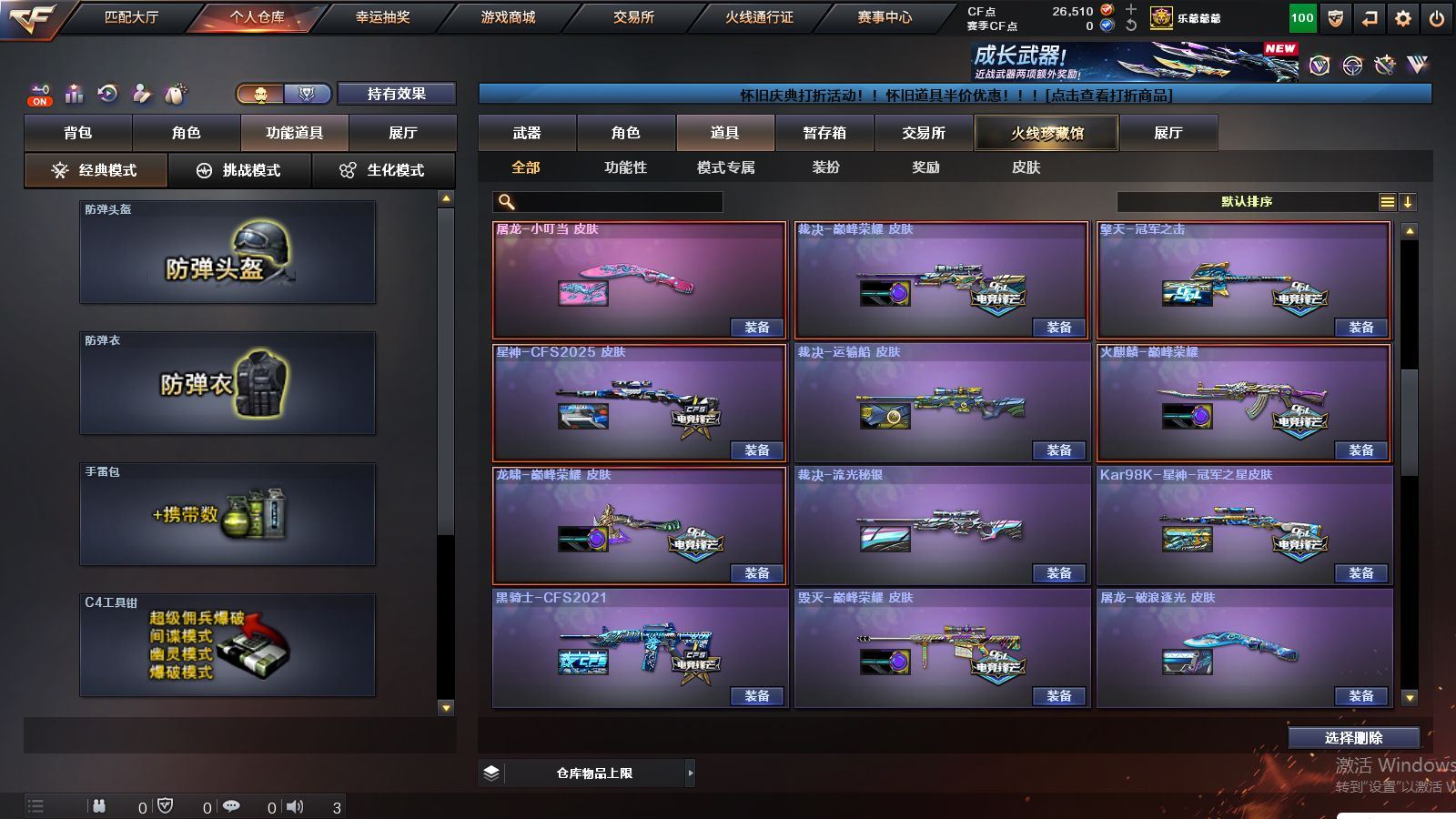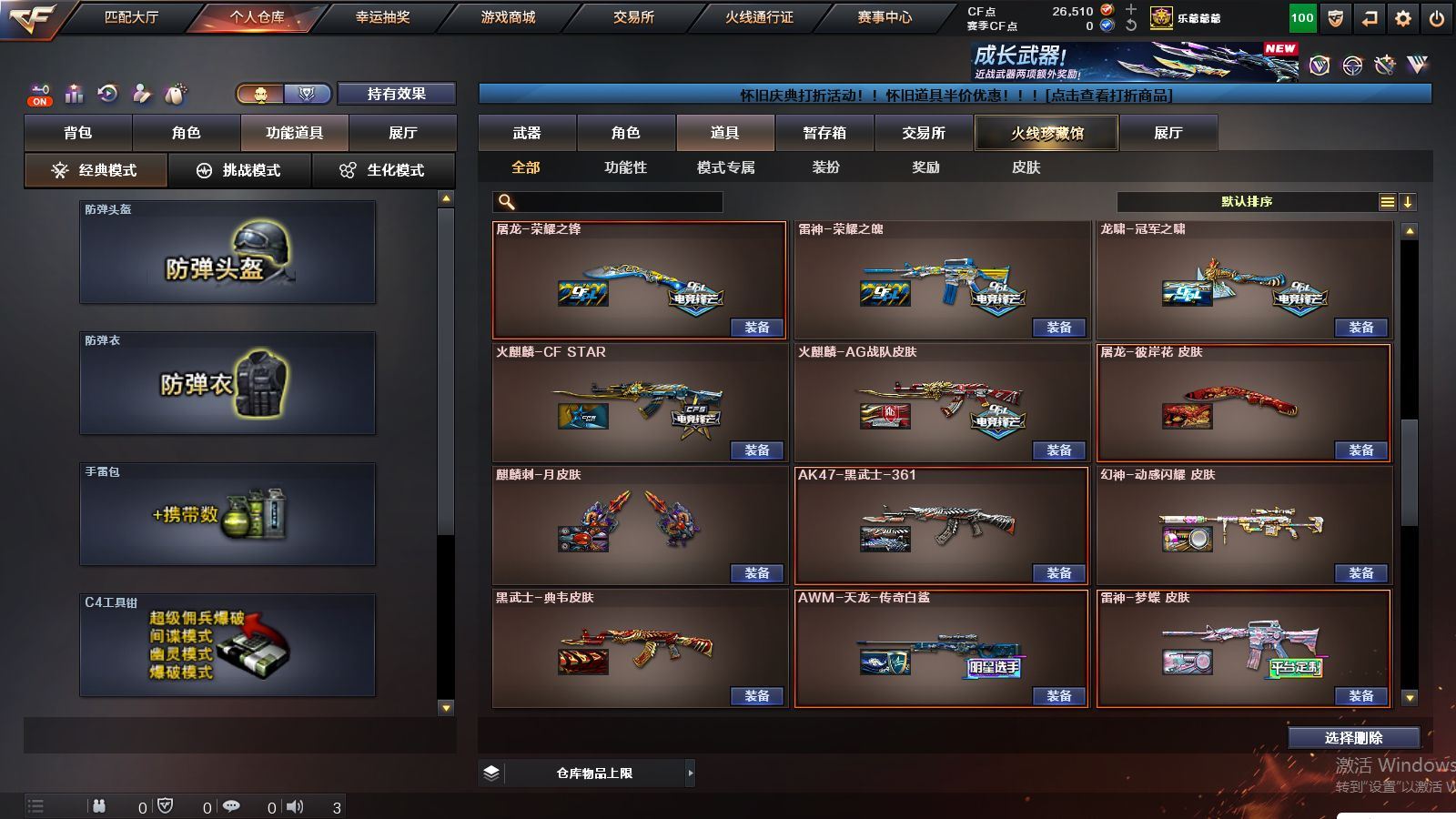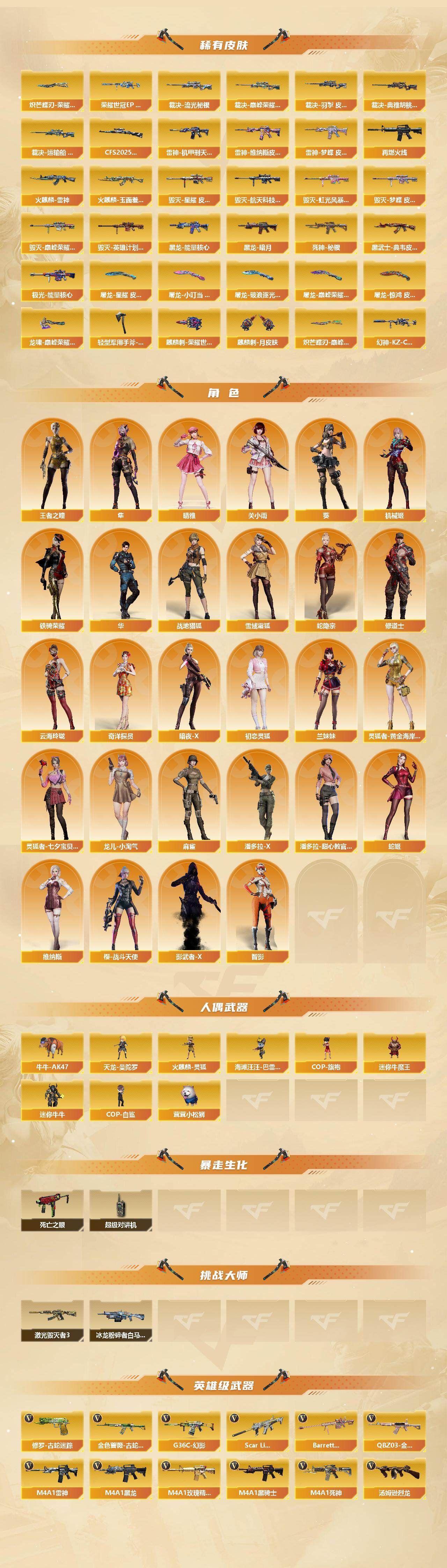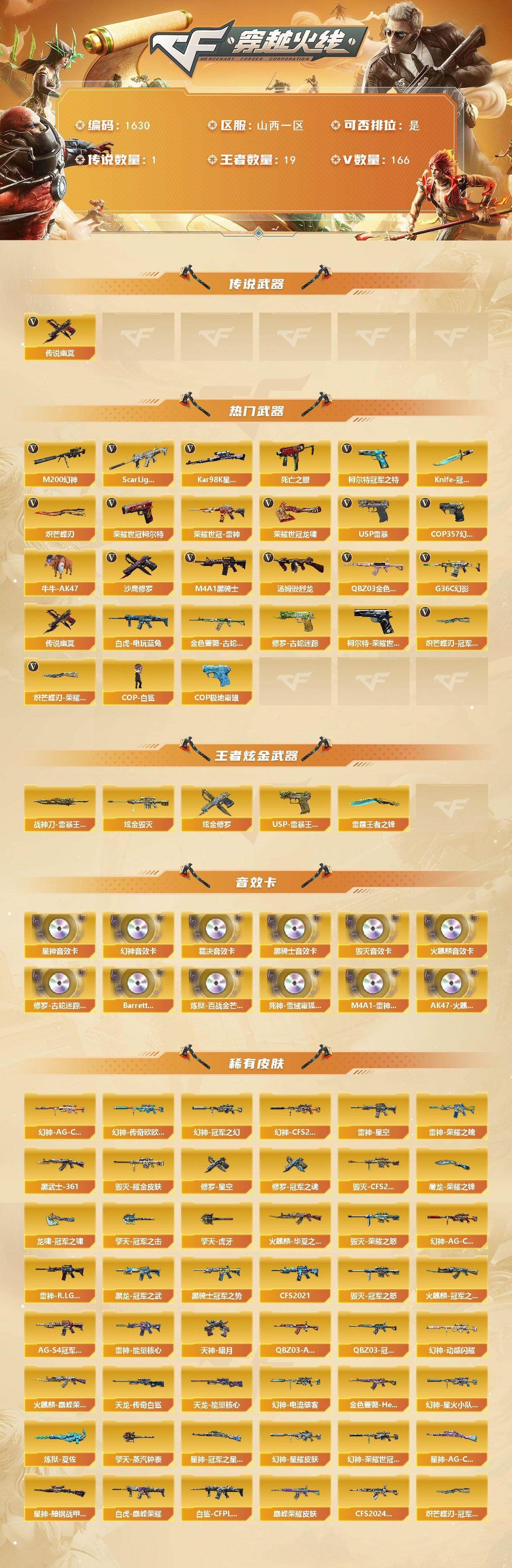 r51928 可二次可排位山西一区-166V【传说武器】:传说幽冥【热门武器】:传说幽冥,G36C-幻影,QBZ03-金色蔷薇*2,Scar Light-白虎,M200-幻神*2,柯尔特-荣耀世冠白鲨2023*2,金色蔷薇-古蛇迷踪,修罗-古蛇迷踪,死亡之眼*3,荣耀世冠-雷神,白虎-电玩蓝兔,柯尔特-冠军之特*2,荣耀世冠-柯尔特,Kar98K-星神*2,牛牛-AK47,M4A1-黑骑士*2,汤姆逊-烈龙*4,COP-白鲨*2,USP-雷暴,COP 357-幻灵,沙鹰-修罗*3,Knife-冠军之刃,炽芒蝶刃,炽芒蝶刃-冠军炽芒皮肤,炽芒蝶刃-荣耀世冠白鲨2023 皮肤,荣耀世冠-龙啸,COP 357-极地霜雄【王者炫金武器】:USP-雷暴王者,雷霆王者之锋,斩神刀-雷暴王者,炫金毁灭,炫金修罗【音效卡】:修罗-古蛇迷踪音效卡,M200-幻神音效卡,AK47-火麒麟音效卡,M4A1-黑骑士音效卡,Barrett-毁灭音效卡,AWM-裁决音效卡,Kar98K-星神音效卡,Barrett-碧霄极光音效卡,炼狱-百战金芒-庆典舞曲音效卡,死神-雪域霜狐-怀旧音效卡,M4A1-雷神-怀旧音效卡,AK47-火麒麟-怀旧音效卡【皮肤】:幻神-冠军之幻,幻神-AG-CFPLS17冠军,幻神-CFS2022,幻神-星耀 皮肤,幻神-动感闪耀 皮肤,幻神-电流骇客 皮肤,幻神-星火小队签名臻藏版 皮肤,幻神-荣耀世冠白鲨2023 皮肤,幻神-传奇欧欧 皮肤,幻神-AG-CFPL S24冠军 皮肤,幻神-荣耀世冠EP 皮肤,幻神-KZ-CFPLS25冠军 皮肤,白虎-巅峰荣耀 皮肤,白虎-白鲨-CFPLS23冠军,QBZ03-冠军之薇,QBZ03-AG-CFPLS19冠军,QBZ03-巅峰荣耀皮肤,金色蔷薇-Heartshot皮肤,QBZ03-CFS2024 皮肤,裁决-流光秘银,裁决-巅峰荣耀 皮肤,裁决-羽掣 皮肤,裁决-典雅胡桃 皮肤,裁决-运输船 皮肤,Kar98K-星神-AG-CFPLS21冠军皮肤,Kar98K-星神-冠军之星皮肤,星神-黯钢战甲 皮肤,星神-CFS2025 皮肤,雷神-能量核心*2,雷神-荣耀之魄,雷神-星空,雷神-R.LGD-CFPLS18冠军,雷神-机甲刑天皮肤,雷神-维纳斯皮肤,雷神-梦蝶 皮肤,M4A1-再燃火线,火麒麟-雷神,火麒麟-冠军之心,火麒麟-华夏之心,火麒麟-巅峰荣耀,火麒麟-玉面羞花 皮肤,毁灭-荣耀之怒,毁灭耀金皮肤,毁灭-冠军之怒,毁灭-CFS2020,毁灭-星耀 皮肤,毁灭-梦蝶 皮肤,毁灭-巅峰荣耀 皮肤,毁灭-英雄计划 皮肤,黑龙-能量核心,黑龙-冠军之武,黑骑士-冠军之势,黑骑士-CFS2021,黑骑士-AG-S4冠军典藏,死神-秘银,AK47-黑武士-361,黑武士-典韦皮肤,修罗-冠军之魂,天神-暗月,屠龙-荣耀之锋*3,屠龙-星耀 皮肤,屠龙-小叮当 皮肤,屠龙-破浪逐光 皮肤,屠龙-巅峰荣耀 皮肤*2,屠龙-惊鸿 皮肤,龙啸-冠军之啸,炽芒蝶刃-冠军炽芒皮肤,炽芒蝶刃-荣耀世冠白鲨2023 皮肤,炽芒蝶刃-巅峰荣耀 皮肤【角色】:葵,关小雨,晴雅,隼,机械姬,华,战地猎狐,王者之瞳,雪域霜狐,蛇隐宗,奇洋探员,修道士,云海玲珑,暗夜-X,初恋灵狐,兰妹妹,灵狐者-黄金海岸,灵狐者-七夕宝贝,龙儿-小淘气,麻雀,潘多拉-X,潘多拉-甜心教官,蛇姬,铁骑荣耀,维纳斯,樱-战斗天使,影武者-X,智影【人偶武器】:COP-白鲨*2,天龙-曼陀罗,火麒麟-灵狐,茸茸小松狮,海滩汪汪-巴雷特,COP-旗袍,牛牛-AK47,迷你牛魔王,迷你牛牛【暴走生化】:死亡之眼*3,超级对讲机【挑战大师】:冰龙粉碎者-白马银枪,激光毁灭者III【英雄级武器】:QBZ03-金色蔷薇*2,M4A1-猎神,王者之魄-觉醒版,AK-47-猩红传说*2,白虎-电玩蓝兔,荣耀世冠-雷神,M200-幻神*2,Kar98K-星神*2,Barrett-金色蔷薇,王者之怒-觉醒版,王者之光-觉醒版,炼狱-百战金芒,炼狱-悦蓝-觉醒版,汤姆逊-烈龙*4,AA-12-雷霆*3,沙鹰-修罗*3,沙鹰-天神*7,USP-雷暴,COP 357-雷霆王者-觉醒版,COP 357-幻灵,柯尔特-冠军之特*2,柯尔特-荣耀世冠白鲨2023*2,柯尔特-无冕之王,荣耀世冠-柯尔特,柯尔特-荣耀世冠EP,COP 357-云龙*5,丛林匕首-玄豹【道具】:泡泡象背包,防弹头盔*5,防弹衣*5,C4工具钳*4,手雷包*3【特殊枪械】:1白虎,2黑骑士,4烈龙,各种道具详情看截图、低价出售找回包 赔、截图展示段位不代 表实际段位,如赛季更新等不可抗拒因素发生变化、时限道具不保证所剩时间、标题未写送点劵默认不送【卖号买号首选亿梦】