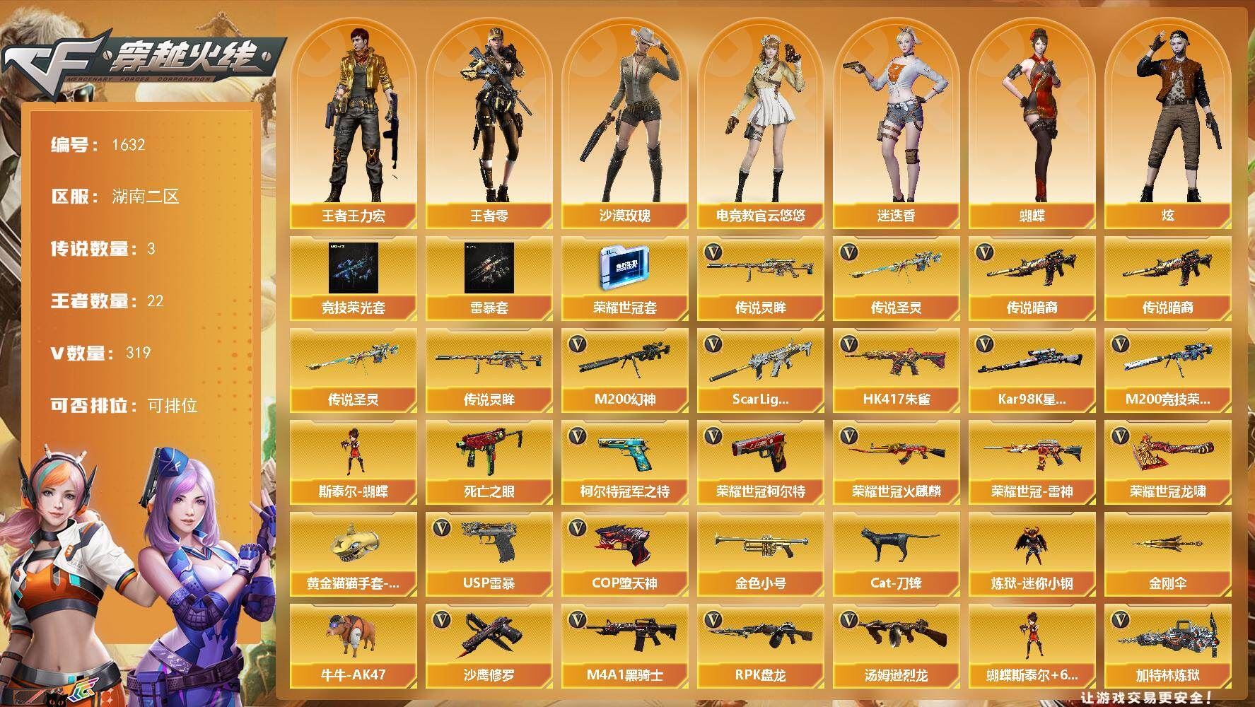 r51932 可二次可排位湖南二区-319V【传说武器】:传说暗裔,传说圣灵,传说灵眸【传说角色】:传说艾莉莎【热门武器】:传说暗裔,传说圣灵,传说灵眸,G36C-幻影,QBZ03-金色蔷薇*2,M14EBR-玄武,Scar Light-白虎,HK417-朱雀,M4A1-青龙,M200-幻神,M200-竞技荣光,死亡之眼,荣耀世冠-火麒麟,荣耀世冠-雷神*2,柯尔特-冠军之特,荣耀世冠-柯尔特*2,Kar98K-星神,金色小号,Cat-刀锋,炼狱-迷你小钢,牛牛-AK47,M4A1-黑骑士*4,汤姆逊-烈龙*6,RPK-盘龙*6,加特林-炼狱*12,斯泰尔-蝴蝶*2,裁决-雪莉杨,火麒麟-绝迹,COP-白鲨*2,USP-雷暴*2,COP-堕天神*2,沙鹰-修罗*8,炽芒蝶刃-荣耀世冠白鲨2023 皮肤,荣耀世冠-龙啸,黄金猫猫手套-白鲨,金刚伞,高爆手雷-幻兽*5【特殊枪械】:蝴蝶斯泰尔+6烈龙,1白虎,4黑骑士,6烈龙,6盘龙,6炼狱,2蝴蝶斯泰尔【稀有套装】:雷暴套,荣耀世冠套,竞技荣光套【王者炫金武器】:王者之翼*2,王者之武,王者之光*2,王者之怒,王者之魂,炫金骑士,炫金黑龙,炫金千变,炫金雷神,炫金武士,炫金超新星*2,炫金毁灭,炫金天神,炫金修罗【音效卡】:M200-幻神音效卡,AK47-火麒麟音效卡,M4A1-雷神音效卡,M4A1-黑龙音效卡,M4A1-黑骑士音效卡,Barrett-毁灭音效卡,Barrett-极光音效卡,Scar Light-白虎音效卡,白鲨语音包,N9语音包,死神-雪域霜狐-怀旧音效卡【皮肤】:幻神-冠军之幻,幻神-巅峰荣耀,M200-幻神-荣耀世冠白鲨,幻神-荣耀世冠白鲨2023 皮肤,幻神-AG-CFPL S24冠军 皮肤,Scar Light-白虎-暗星,白虎-电玩粉兔皮肤,白虎-白鲨-CFPLS23冠军,裁决-巅峰荣耀 皮肤,星神-璀璨皮肤,雷神-暗月,雷神-能量核心,雷神-荣耀之魄,雷神-冠军之魄,雷神-R.LGD-CFPLS18冠军,雷神-荣耀世冠AG,火麒麟-雷神,火麒麟-冠军之心*2,AK47-火麒麟-传奇EVEN,火麒麟-百城,毁灭-荣耀之怒,毁灭耀金皮肤,毁灭-冠军之怒,M4A1-千变-孔明皮肤*2,黑龙-能量核心,黑龙-暗月*2,黑骑士耀金皮肤,黑骑士-冠军之势,【角色】:零,葵,樱,瞳,蝴蝶,炫,春,迷迭香,沙漠玫瑰,雨棠,电竞教官-云悠悠四防,王者葵-惊若翩鸿四防,王者-零,王者玲珑,王者-魅影四防,灵狐者-职业经理,职业选手【人偶武器】:火麒麟-绝迹,COP-白鲨*2,裁决-雪莉杨,白虎-迷你小艾,天龙-曼陀罗,炼狱-迷你小钢,迷你宝贝,斯泰尔-蝴蝶*2,巴雷特-零-水下丽影*2,AWM-灵狐-15周年嘉年华,M37-葵,COP-旗袍,Cat-刀锋,牛牛-AK47,迷你深渊冰龙*2,夺魂,迷你生化手雷,闪光弹-小乔,闪光弹-貂蝉,高爆手雷-大乔,Barrett-夜玫瑰,QBZ03-斯沃特【暴走生化】:异变清道夫,黑龙吞噬者,双面神,死亡之眼,超级对讲机【挑战大师】:神圣爆裂者III*3,VEPR-12-金魔*2,激光毁灭者III*2,KAC-圣炎切割者III【英雄级武器】:G36C-幻影,死神-雪域霜狐,M4A1-玫瑰精灵*5,QBZ95-幻兽,QBZ03-金色蔷薇*2,王者之心-觉醒版,王者之魄-觉醒版,王者之势-觉醒版,王者之幻-觉醒版,AK-47-猩红传说*8,AK47-B-战神,王者炎心-觉醒版,王者火魄-觉醒版,荣耀世冠-火麒麟,荣耀世冠-雷神*2,AWM-天龙*3,Barrett-毁灭*3,Barrett-极光,AWM-裁决*2,M200-幻神,Kar98K-星神,Barrett-电竞装甲,M200-竞技荣光,Barrett-金色蔷薇,王者之怒-觉醒版,王者幻神-觉醒版,王者星神-觉醒版,王者风神-觉醒版,RPK-盘龙*6,加特林-炼狱*12,炼狱-悦蓝-觉醒版,汤姆逊-烈龙*6,AA-12-雷霆,沙鹰-修罗*8,沙鹰-天神*2,USP-雷暴*2,COP-雷霆,COP-堕天神*2,COP 357-雷霆王者-觉醒版,柯尔特-冠军之特,柯尔特-电竞装甲,荣耀世冠-柯尔特*2,柯尔特-竞技荣光,破空枪刃,沙鹰-幻兽*5,,高爆手雷-幻兽*5,,闪光弹-幻兽*5,烟雾弹-幻兽*5【道具】:神秘礼盒背包,C4-沙漠,防弹头盔*4,防弹衣*4,C4工具钳*2,手雷包*3,各种道具详情看截图、低价出售找回包 赔、截图展示段位不代 表实际段位,如赛季更新等不可抗拒因素发生变化、时限道具不保证所剩时间、标题未写送点劵默认不送【卖号买号首选亿梦】