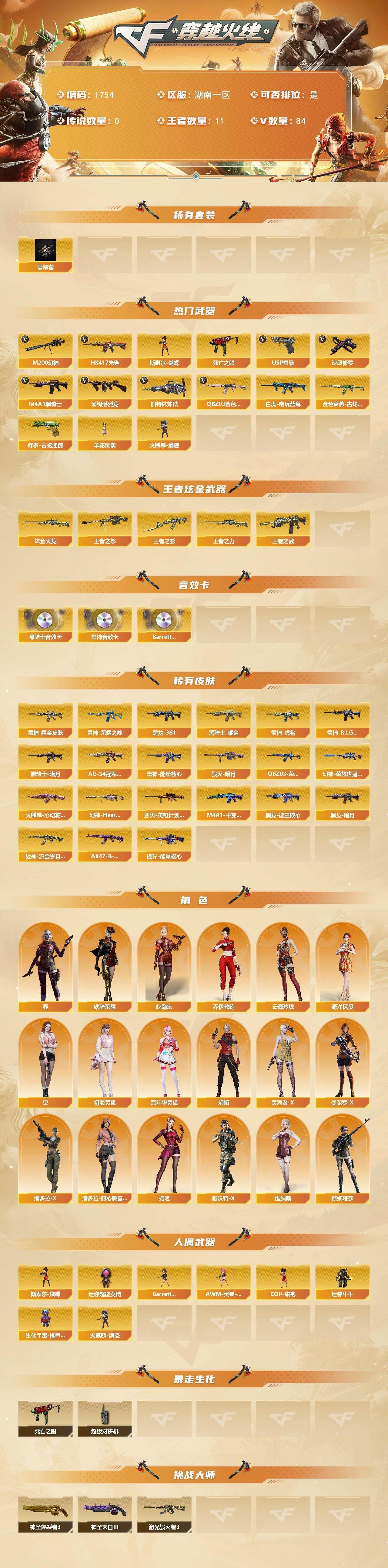 可二次湖南一区可排位-84V-11王者武器数-1炫金武器数【热门武器】:QBZ03-金色蔷薇,HK417-朱雀,M200-幻神,金色蔷薇-古蛇迷踪,修罗-古蛇迷踪,死亡之眼,白虎-电玩蓝兔,M4A1-黑骑士,汤姆逊-烈龙*4,加特林-炼狱,斯泰尔-蝴蝶,羊驼玩偶,火麒麟-绝迹,USP-雷暴,沙鹰-修罗*4【稀有套装】:雷暴套【王者炫金武器】:王者之武,王者之影,王者之怒,王者之力,炫金天龙【音效卡】:M4A1-雷神音效卡,M4A1-黑骑士音效卡,Barrett-碧霄极光音效卡【皮肤】:M200-幻神-荣耀世冠白鲨,幻神-Heartshot 皮肤,QBZ03-荣耀世冠白鲨,雷神-能量核心,雷神-荣耀之魄,雷神-虎将,雷神-耀金皮肤,雷神-R.LGD-CFPLS18冠军,火麒麟-心动糖果,毁灭-暗月,毁灭-英雄计划 皮肤,M4A1-千变-孔明皮肤,黑龙-能量核心,黑龙-暗月,M4A1-黑龙-361,黑骑士-暗月,黑骑士耀金皮肤,黑骑士-AG-S4冠军典藏,战神-流金岁月皮肤,AK47-B-常胜将军-曹操,极光-能量核心【角色】:春,蛇隐宗,奇洋探员,乔伊教练,云海玲珑,空,初恋灵狐,嘉年华灵狐,娟娟,灵狐者-X,曼陀罗-X,潘多拉-X,潘多拉-甜心教官,蛇姬,斯沃特-X,铁骑荣耀,维纳斯,新娜塔莎【人偶武器】:火麒麟-绝迹,斯泰尔-蝴蝶,AWM-灵狐-15周年嘉年华,COP-旗袍,迷你牛牛,生化手雷-机甲核心,Barrett-夜玫瑰,迷你超能女侍【暴走生化】:死亡之眼,超级对讲机【挑战大师】:神圣爆裂者III,激光毁灭者III,神圣爆裂者-末日III【英雄级武器】:M4A1-千变,AK47-火麒麟,M4A1-黑龙,M4A1-雷神,M4A1-黑骑士,AK47-无影,M4A1-死神,AK12-天启,AK47-机械迷城,M4A1-龙血,AK47-雷暴,HK417-朱雀,超新星-热带奇洋,金色蔷薇-古蛇迷踪,QBZ03-金色蔷薇,王者之心-觉醒版,王者之魄-觉醒版,王者之戮-觉醒版,AK-47-猩红传说,AK47-B-战神,QBZ-03-王者蔷薇-觉醒版,白虎-电玩蓝兔,AWM-天龙,Barrett-毁灭*2,Barrett-极光,M200-幻神,王者之决-觉醒版,加特林-炼狱,汤姆逊-烈龙*4,烈龙-云海游龙,AA-12-雷霆,沙鹰-修罗*4,沙鹰-天神,USP-雷暴,COP 357-雷霆王者-觉醒版,COP 357-云龙,修罗-古蛇迷踪,屠龙*3,擎天,擎天-竞技荣光,擎天-云海游龙,龙啸-热带奇洋,斩神刀-雷暴,雷霆王者之锋-觉醒版,高爆手雷-雷暴*7,手雷-云海游龙,手雷-热带奇洋,高爆手雷-古蛇迷踪,闪光弹-雷暴*7,烟雾弹-雷暴*7,烟雾弹-古蛇迷踪【道具】:AG战队炫彩背包,BS战队炫彩背包,CFS限定背包,EP战队炫彩背包,KZ战队炫彩背包,Q9战队炫彩背包,云海游龙炫彩背包,古蛇迷踪炫彩背包,奇洋探员-海龟背包,炫彩背包,热带奇洋炫彩背包,背包-洛丽塔,超级背包*2,迷你冰龙背包,女皇终结者-魔龙之吻,救世主-黑桃战神,妩媚妖姬,绿色巨人,灵魂忍者*2,变异宝贝,迷雾幽灵*2,生化弹匣,夺命之镰,防化服*2,金色流光-枪王排位*2,星辰流光-枪王排位,巅峰赛先锋-金色流光,枪王排位28赛季金色流光,枪王排位29赛季金色流光,语音特效-机器人,语音特效-生化,古蛇迷踪打击特效,蛇隐宗表情,电玩兔兔表情,热带奇洋表情,云海游龙表情,EP战队名片,EP战队喷图,EP战队击杀图标,C4-沙漠,防弹头盔*2,防弹衣*2,C4工具钳*2,手雷包*2,各种道具详情看截图、低价出售找回包 赔、截图展示段位不代 表实际段位,如赛季更新等不可抗拒因素发生变化、时限道具不保证所剩时间、标题未写送点劵默认不送【卖号买号首选亿梦】