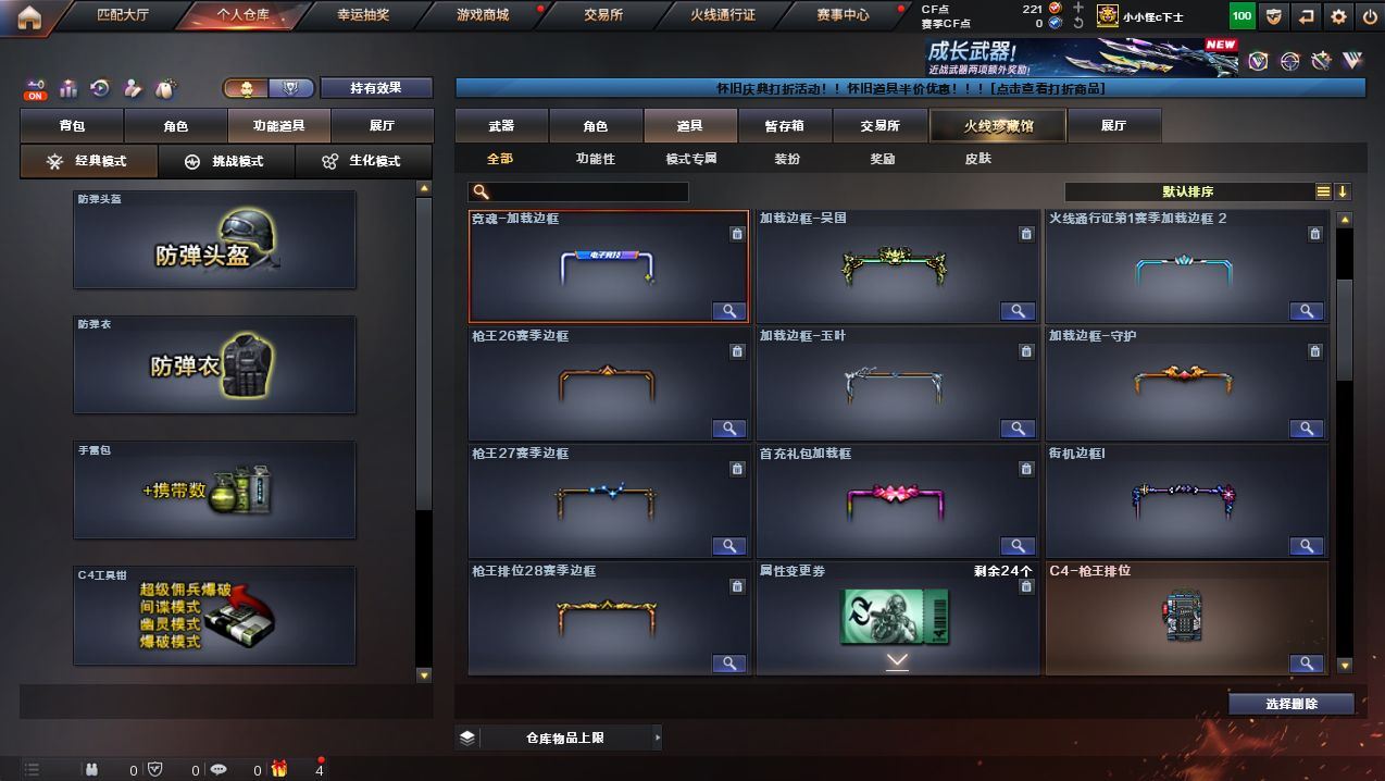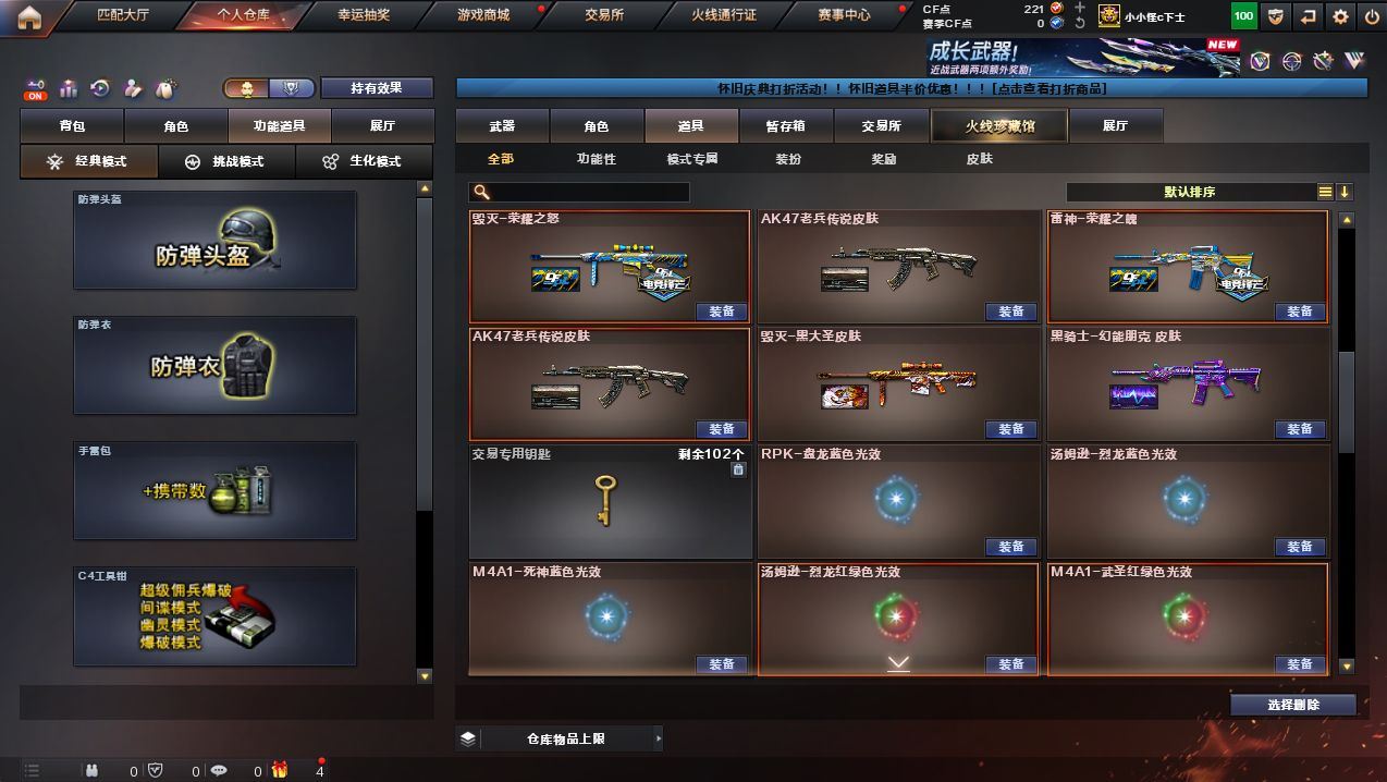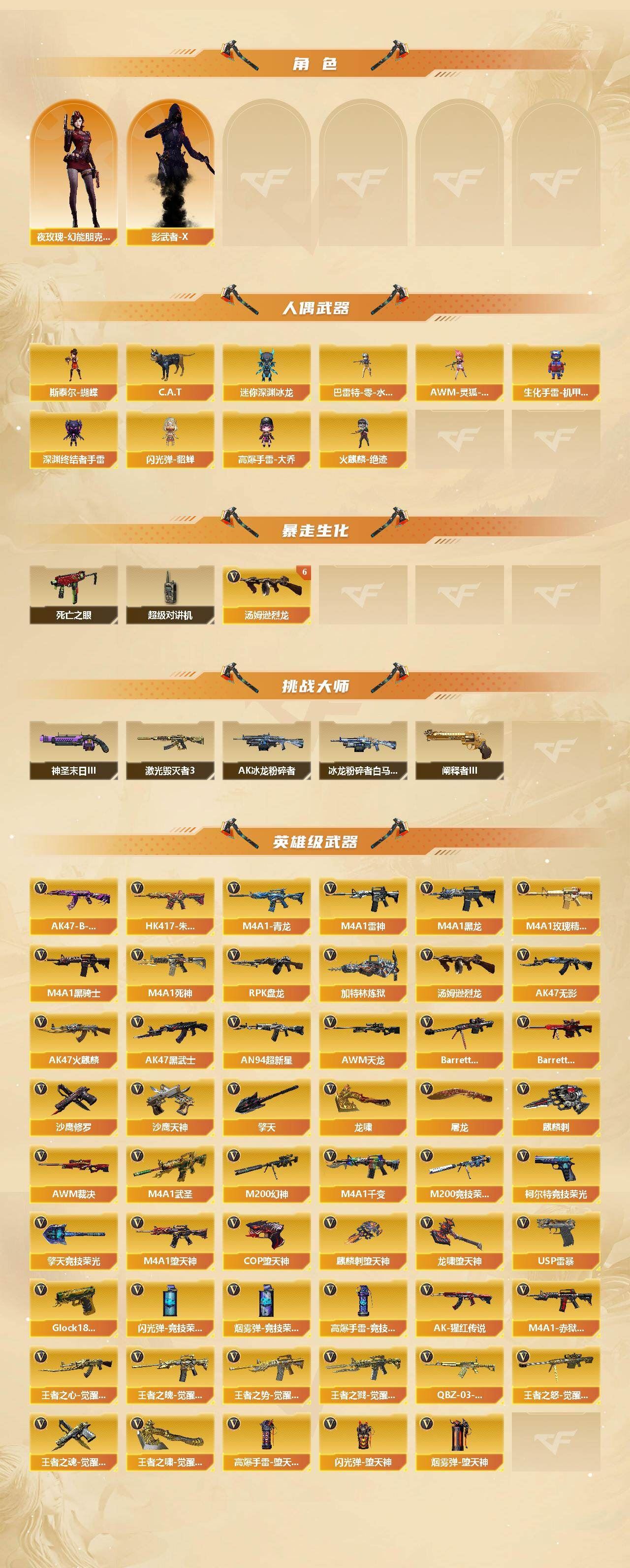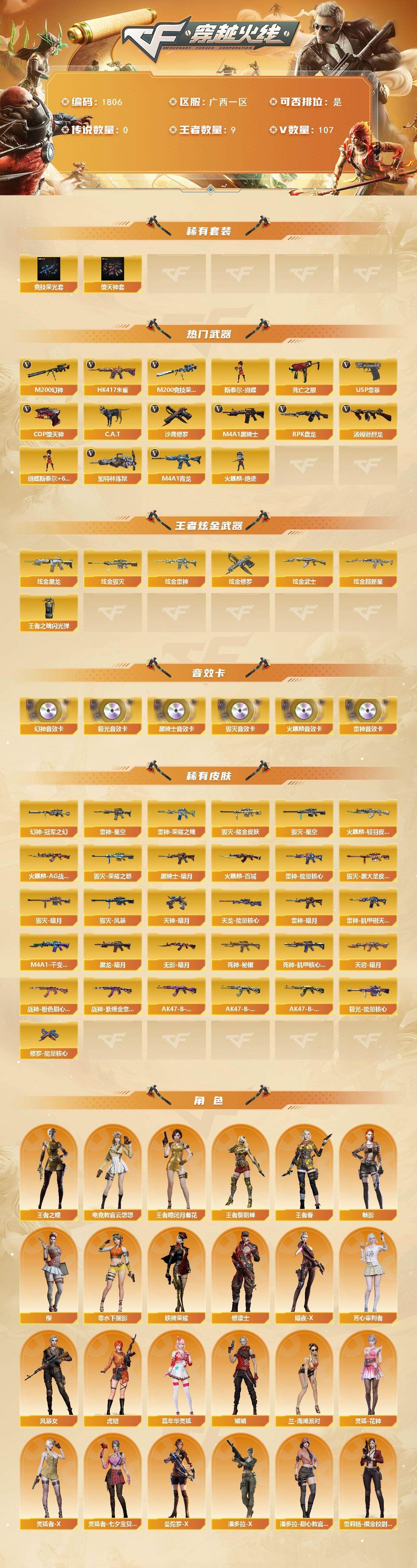 可二次广西一区可排位-107V-9王者武器数-7炫金武器数【热门武器】:HK417-朱雀,M4A1-青龙,M200-幻神,M200-竞技荣光,死亡之眼,C.A.T,M4A1-黑骑士*3,汤姆逊-烈龙*7,RPK-盘龙,加特林-炼狱,斯泰尔-蝴蝶,火麒麟-绝迹,USP-雷暴,COP-堕天神,沙鹰-修罗*6【稀有套装】:堕天神套,竞技荣光套【王者炫金武器】:炫金黑龙*2,炫金雷神,炫金武士,炫金超新星,炫金毁灭,炫金修罗,王者之魄闪光弹【音效卡】:M200-幻神音效卡,AK47-火麒麟音效卡,M4A1-雷神音效卡,M4A1-黑骑士音效卡,Barrett-毁灭音效卡,Barrett-极光音效卡【皮肤】:幻神-冠军之幻,雷神-暗月,雷神-能量核心,雷神-荣耀之魄,雷神-星空,雷神-机甲刑天皮肤,火麒麟-AG战队皮肤,火麒麟-轻羽皮肤,火麒麟-百城,毁灭-暗月*2,毁灭-荣耀之怒,毁灭耀金皮肤,毁灭-星空,毁灭-黑大圣皮肤,毁灭-风暴,M4A1-千变-孔明皮肤,【角色】:樱,魅影,电竞教官-云悠悠,王者-瞳-闭月羞花,四防王者-葵-貂蝉,王者之瞳,四防王者春,修道士,暗夜-X,芳心审判者,风暴女,虎妞,嘉年华灵狐,娟娟,兰-海滩派对,零-水下丽影,灵狐-花神,灵狐者-X,灵狐者-七夕宝贝,曼陀罗-X,潘多拉-X,潘多拉-甜心教官,铁骑荣耀,雪莉杨-摸金校尉,夜玫瑰-幻能朋克,影武者-X【人偶武器】:火麒麟-绝迹,斯泰尔-蝴蝶,巴雷特-零-水下丽影,AWM-灵狐-15周年嘉年华,C.A.T,迷你深渊冰龙,生化手雷-机甲核心*2,深渊终结者手雷,闪光弹-貂蝉,高爆手雷-大乔【暴走生化】:死亡之眼,超级对讲机,6烈龙【挑战大师】:AK47-冰龙粉碎者,冰龙粉碎者-白马银枪,激光毁灭者III,神圣爆裂者-末日III,阐释者III【英雄级武器】:M4A1-千变,AK47-火麒麟*2,M4A1-黑龙,M4A1-雷神*2,M4A1-黑骑士*3,AK47-无影,M4A1-死神,AK47-黑武士,AN94-超新星*2,M4A1-武圣,M4A1-青龙,M4A1-堕天神,HK417-朱雀,M4A1-玫瑰精灵,王者之心-觉醒版,王者之魄-觉醒版,王者之势-觉醒版,王者之戮-觉醒版,AK-47-猩红传说,AK47-B-常胜将军,QBZ-03-王者蔷薇-觉醒版,AWM-天龙,Barrett-毁灭*6,Barrett-极光,AWM-裁决,M200-幻神,M200-竞技荣光,王者之怒-觉醒版,RPK-盘龙,加特林-炼狱,汤姆逊-烈龙*7,沙鹰-修罗*6,沙鹰-天神,USP-雷暴,COP-堕天神,柯尔特-竞技荣光,王者之魂-觉醒版,Glock18-武圣,屠龙*4,龙啸,麒麟刺-堕天神*3,擎天,M4A1-赤狱骑士【道具】:冰冰企鹅背包-猛男专用,战舰背包,炫彩背包,虎牙炫彩背包,超级背包,绿色巨人,灵魂忍者,变异宝贝,迷雾幽灵,生化弹匣,夺命之镰*2,防化服*4,金色流光-枪王排位*2,星辰流光-枪王排位,枪王排位28赛季金色流光,枪王排位29赛季金色流光,防弹头盔*8,防弹衣*6,C4工具钳*6,手雷包*4【特殊枪械】:蝴蝶斯泰尔+6烈龙,3黑骑士,6烈龙,1盘龙,1炼狱,1蝴蝶斯泰尔,各种道具详情看截图、低价出售找回包 赔、截图展示段位不代 表实际段位,如赛季更新等不可抗拒因素发生变化、时限道具不保证所剩时间、标题未写送点劵默认不送【卖号买号首选亿梦】