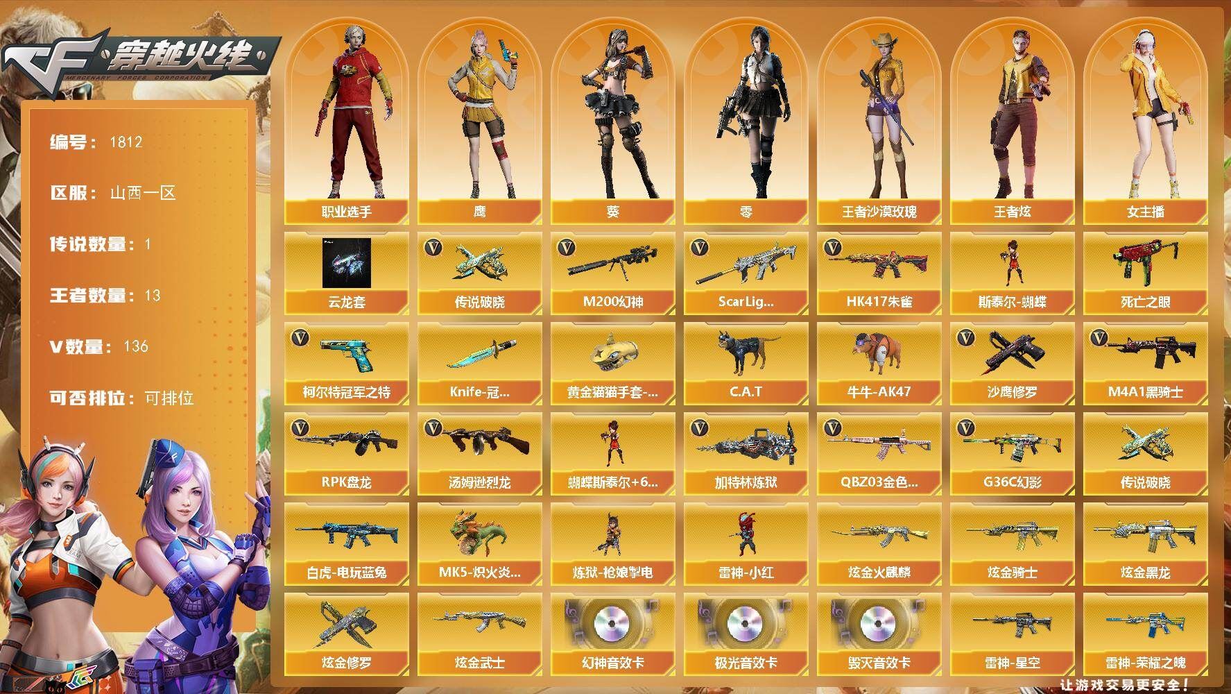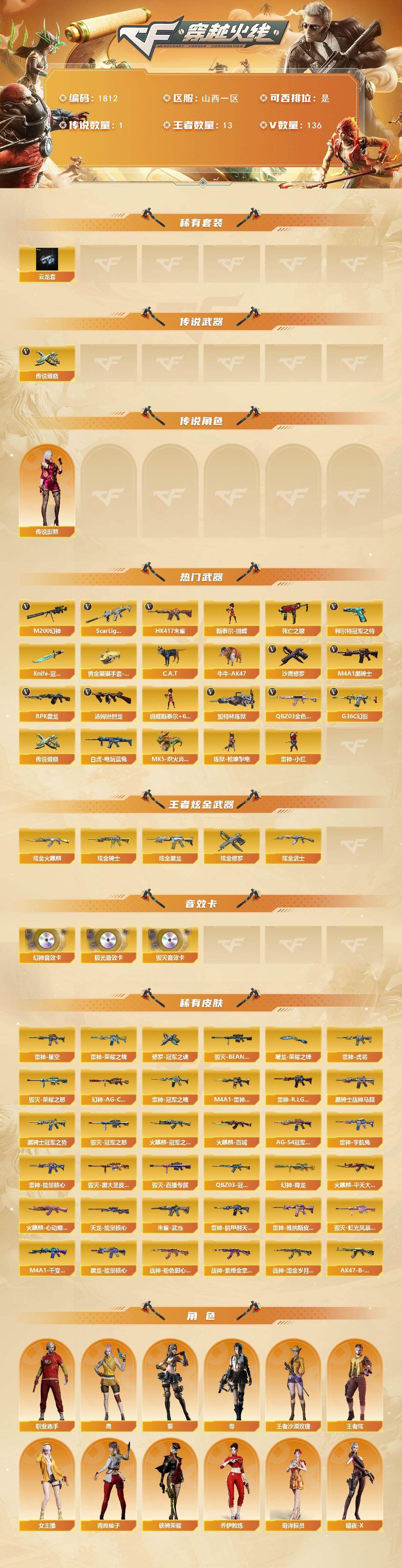 可二次可排位山西一区-136V【传说武器】:传说破晓【传说角色】:传说影煞四防【热门武器】:传说破晓,G36C-幻影,QBZ03-金色蔷薇*2,Scar Light-白虎,HK417-朱雀,M200-幻神,死亡之眼,白虎-电玩蓝兔,柯尔特-冠军之特*2,C.A.T,牛牛-AK47,M4A1-黑骑士*6,汤姆逊-烈龙*6,RPK-盘龙*4,加特林-炼狱*2,斯泰尔-蝴蝶,MK5-炽火炎龙,炼狱-枪娘掣电,雷神-小红,沙鹰-修罗*2,Knife-冠军之刃,黄金猫猫手套-白鲨*2【王者炫金武器】:炫金火麒麟,炫金骑士,炫金黑龙,炫金武士,炫金修罗*2【音效卡】:M200-幻神音效卡,Barrett-毁灭音效卡,Barrett-极光音效卡【皮肤】:幻神-AG-CFPLS17冠军,幻神-降龙,QBZ03-冠军之薇,雷神-能量核心,雷神-荣耀之魄,M4A1-雷神-CFS 2019,雷神-虎将,雷神-冠军之魄,雷神-R.LGD-CFPLS18冠军*2,雷神-机甲刑天皮肤,雷神-宇航兔皮肤,雷神-维纳斯皮肤,火麒麟-冠军之心,火麒麟-平天大圣*2,火麒麟-百城,火麒麟-心动糖果,毁灭-荣耀之怒,毁灭-冠军之怒,毁灭-BEAN-2020MVP,黑骑士-冠军之势,黑骑士-战神马超,黑骑士-AG-S4冠军典藏,HK417-朱雀-武当【角色】:零,葵,鹰四防,王者炫四防,王者沙漠玫瑰四防,奇洋探员,乔伊教练,暗夜-X,初恋灵狐,芳心审判者,飞虎队-X,风暴女,嘉年华灵狐,娟娟,灵狐者-X,灵狐者-七夕宝贝,龙儿,龙儿-小淘气,曼陀罗-X,女主播,潘多拉-X,潘多拉-甜心教官,潜龙队-X,青霞仙子,斯沃特-X,铁骑荣耀,兔囡囡,雪莉杨-摸金校尉,夜玫瑰-幻能朋克,樱-战斗天使,游珑儿,职业选手【人偶武器】:雷神-小红,星神-炽天使,天龙-曼陀罗,火麒麟-灵狐,炼狱-枪娘掣电,天龙-乔伊教练,迷你宝贝,MK5-炽火炎龙,斯泰尔-蝴蝶,AWM-灵狐-15周年嘉年华,C.A.T,牛牛-AK47,迷你深渊冰龙,迷你裂空之翼,迷你波特博士*3,迷你曼提柯尔,夺魂,迷你火种*4,迷你生化手雷,深渊终结者手雷,闪光弹-小乔,迷你超能女侍【暴走生化】:死亡之眼,超级对讲机【挑战大师】:神圣爆裂者III,冰龙粉碎者-白马银枪,激光毁灭者III-白马银枪*2,VEPR-12-金魔,激光毁灭者III*2,机甲撕裂者III,试炼破坏者III,神圣爆裂者-末日III,阐释者III【英雄级武器】:M4A1-黑骑士*6,AK47-无影*3,M4A1-死神,AK47-黑武士,AK12-天启*2,HK417-朱雀,Scar Light-白虎,QBZ03-天罚,G36C-幻影,QBZ03-云龙,QBZ03-金色蔷薇*2,王者之烈-觉醒版,M4A1-雷霆王者-觉醒版,白虎-电玩蓝兔,AWM-天龙,Barrett-毁灭*3,Barrett-极光,M200-幻神,VSK-94-金蚀,王者之怒-觉醒版,王者星神-觉醒版,RPK-盘龙*4,加特林-炼狱*2,炼狱-悦蓝-觉醒版,汤姆逊-烈龙*6【道具】:虎牙炫彩背包,超级背包,绿色巨人,灵魂忍者,变异宝贝,迷雾幽灵,生化弹匣,夺命之镰*2,防化服*3,,C4-红龙,防弹头盔*4,防弹衣*5,C4工具钳*2,手雷包*2【特殊枪械】:蝴蝶斯泰尔+6烈龙,1白虎,6黑骑士,6烈龙,4盘龙,2炼狱,1蝴蝶斯泰尔【稀有套装】:云龙套,各种道具详情看截图、低价出售找回包 赔、截图展示段位不代 表实际段位,如赛季更新等不可抗拒因素发生变化、时限道具不保证所剩时间、标题未写送点劵默认不送【卖号买号首选亿梦】