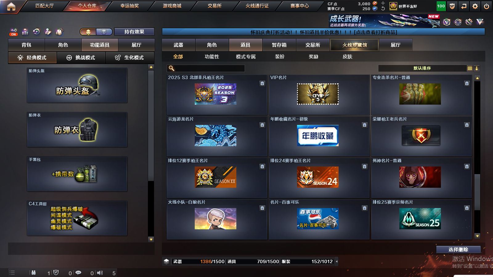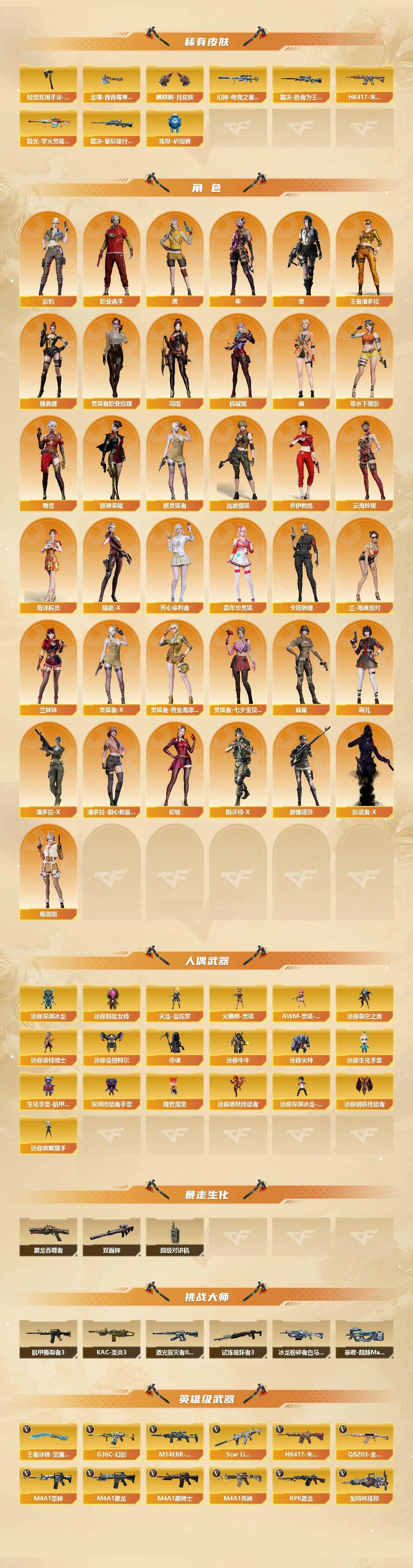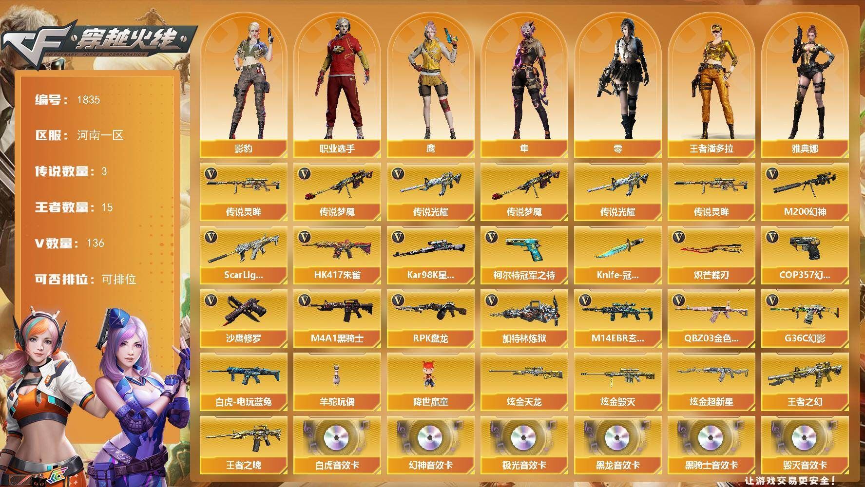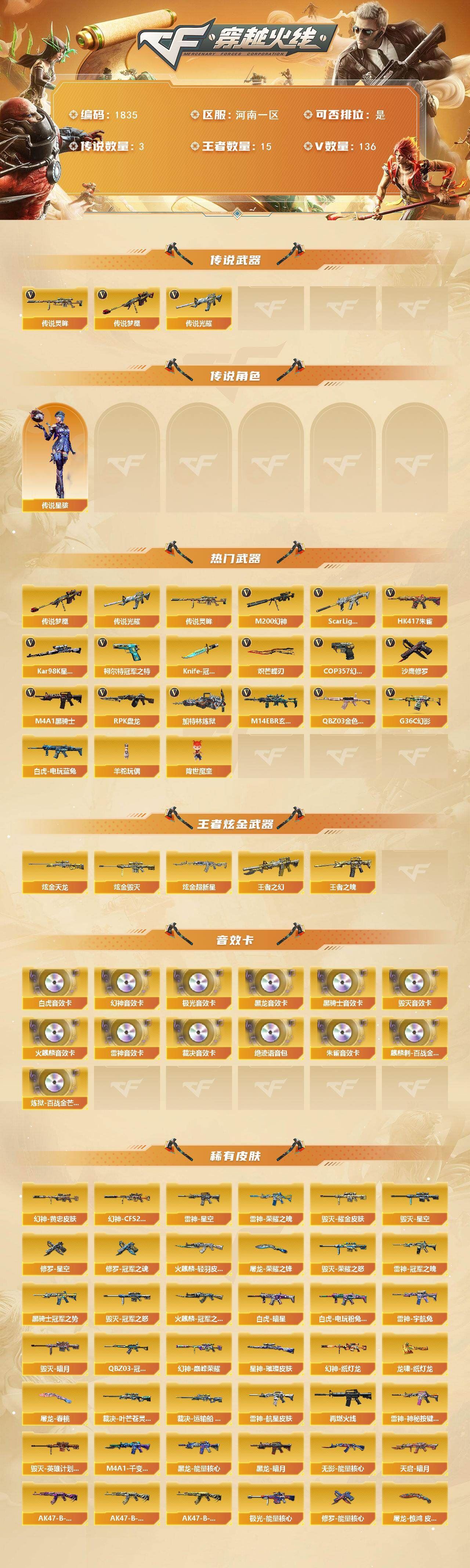 可二次可排位河南一区-137V【传说武器】:传说光耀,传说梦魇,传说灵眸【传说角色】:传说星骇【热门武器】:传说光耀,传说梦魇,传说灵眸,G36C-幻影,QBZ03-金色蔷薇,M14EBR-玄武,Scar Light-白虎*2,HK417-朱雀,M200-幻神*2,白虎-电玩蓝兔,柯尔特-冠军之特,Kar98K-星神,M4A1-黑骑士*4,RPK-盘龙*4,加特林-炼狱,羊驼玩偶,降世魔童,COP 357-幻灵*2,沙鹰-修罗*13,Knife-冠军之刃,炽芒蝶刃*2【王者炫金武器】:王者之幻*2,王者之魄,炫金超新星,炫金毁灭,炫金天龙*2【音效卡】:M200-幻神音效卡,AK47-火麒麟音效卡,M4A1-雷神音效卡,M4A1-黑龙音效卡,M4A1-黑骑士音效卡,Barrett-毁灭音效卡,Barrett-极光音效卡,AWM-裁决音效卡,Scar Light-白虎音效卡,绝迹语音包,HK417-朱雀音效卡,麒麟刺-百战金芒-盛典舞曲音效卡,炼狱-百战金芒-庆典舞曲音效卡【皮肤】:M200-幻神-黄忠皮肤,幻神-巅峰荣耀,幻神-CFS2022,幻神-纸灯龙皮肤,幻神-电竞之星 皮肤,Scar Light-白虎-暗星,白虎-电玩粉兔皮肤,QBZ03-冠军之薇,裁决-叶芒苍灵 皮肤,裁决-运输船 皮肤,裁决-胜者为王 皮肤,裁决-星际旅行 皮肤,星神-璀璨皮肤,雷神-荣耀之魄,雷神-星空,雷神-冠军之魄,雷神-宇航兔皮肤,雷神-航星皮肤,M4A1-再燃火线,雷神-神秘按键 皮肤,火麒麟-冠军之心,火麒麟-轻羽皮肤,毁灭-暗月,毁灭-荣耀之怒,毁灭-冠军之怒【角色】:零,影豹,鹰,隼,机械姬,司雨,战地猎狐,王者潘多拉,奇洋探员,乔伊教练,云海玲珑,卡塔琳娜,兰-海滩派对,灵狐者-职业经理,麻雀,萌儿,潘多拉-X,潘多拉-甜心教官,职业选手,雅典娜【人偶武器】:天龙-曼陀罗,火麒麟-灵狐,迷你钢铁终结者,迷你救赎猎手,迷你地狱终结者,AWM-灵狐-15周年嘉年华*2,迷你深渊冰龙*3,迷你裂空之翼*2,迷你波特博士*4,迷你曼提柯尔,夺魂*5,迷你牛牛,迷你火种*4,迷你生化手雷*5,生化手雷-机甲核心,深渊终结者手雷*2,迷你深渊冰龙-王绿豆,迷你超能女侍,降世魔童【暴走生化】:黑龙吞噬者,双面神,超级对讲机【挑战大师】:暴君乱世-超越Max,冰龙粉碎者-白马银枪*2,激光毁灭者III-白马银枪,机甲撕裂者III,试炼破坏者III,KAC-圣炎切割者III【英雄级武器】:AK47-火麒麟,M4A1-黑龙*2,M4A1-雷神*6,M4A1-黑骑士*4,AK47-无影,M4A1-死神,AK12-天启,AN94-超新星,AK47-黑鲨,M4A1-龙血*2,HK417-朱雀,Scar Light-白虎*2,M14EBR-玄武,G36C-幻影,QBZ03-金色蔷薇,M4A1-猎神,王者之翼-觉醒版,王者之武-觉醒版,王者之魄-觉醒版,AK-47-猩红传说,AK47-B-战神,王者炎心-觉醒版,白虎-电玩蓝兔,王者芳薇-觉醒版,AWM-天龙,Barrett-毁灭*3,Barrett-极光*2,AWM-裁决,M200-幻神*2,Kar98K-星神,王者之光-觉醒版,王者星神-觉醒版,王者风神-觉醒版,RPK-盘龙*4,加特林-炼狱,炼狱-百战金芒,炼狱-悦蓝-觉醒版,【道具】:圣拳猎手-炽雪,终极猎手-荒漠刀客,女皇终结者-魔龙之吻,救世主-黑桃战神,黄金生化钩,绿色巨人,灵魂忍者,变异宝贝,迷雾幽灵,夺命之镰*2,防化服*3,C4-红龙,C4-再燃火线,防弹头盔*4,防弹衣*4,C4工具钳*4,手雷包*3【特殊枪械】:2白虎,4黑骑士,4盘龙,1炼狱,各种道具详情看截图、低价出售找回包 赔、截图展示段位不代 表实际段位,如赛季更新等不可抗拒因素发生变化、时限道具不保证所剩时间、标题未写送点劵默认不送【卖号买号首选亿梦】